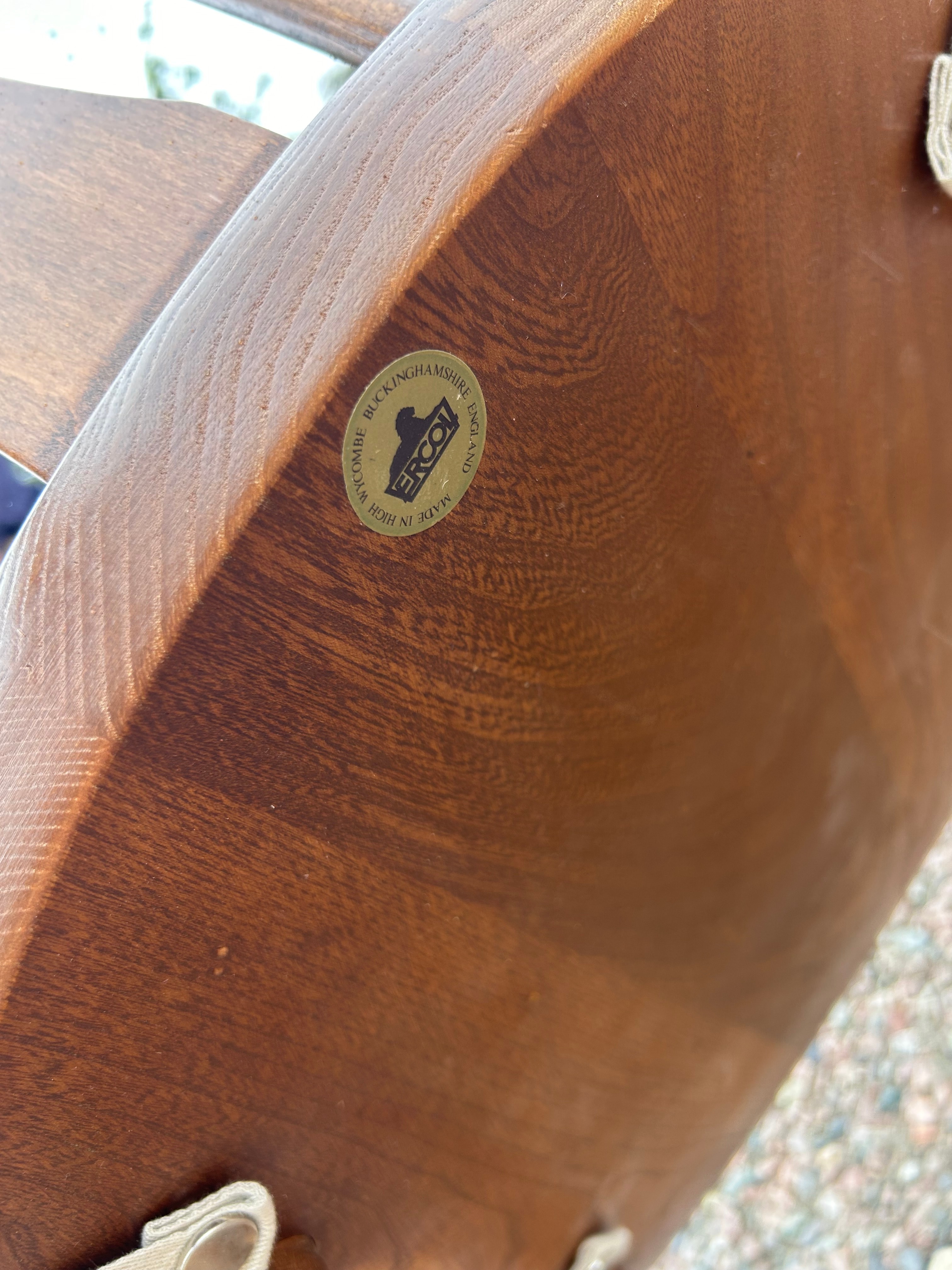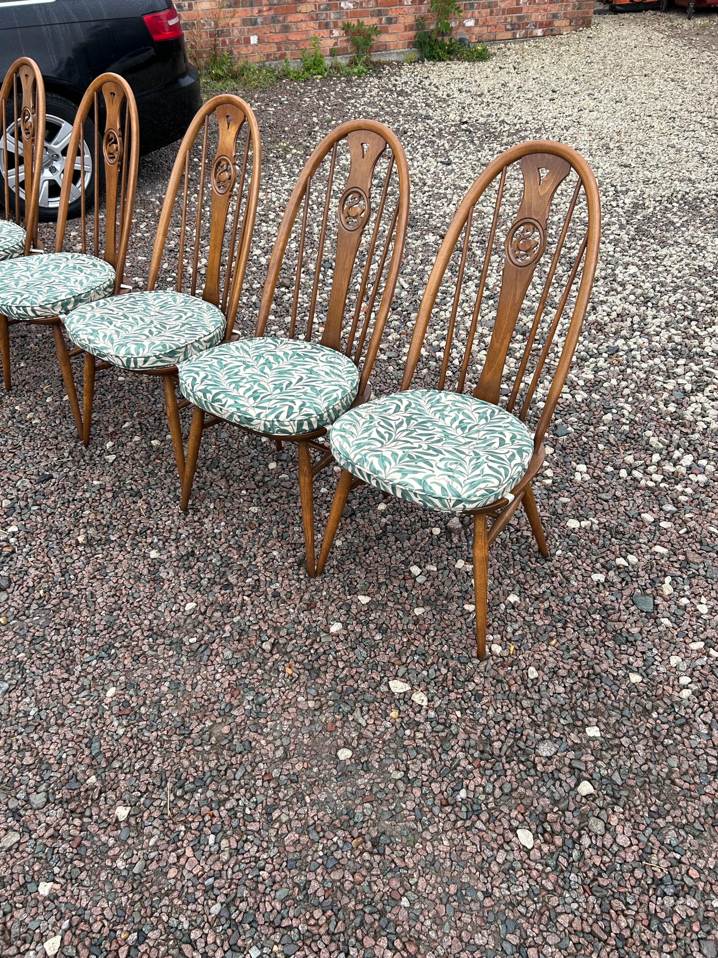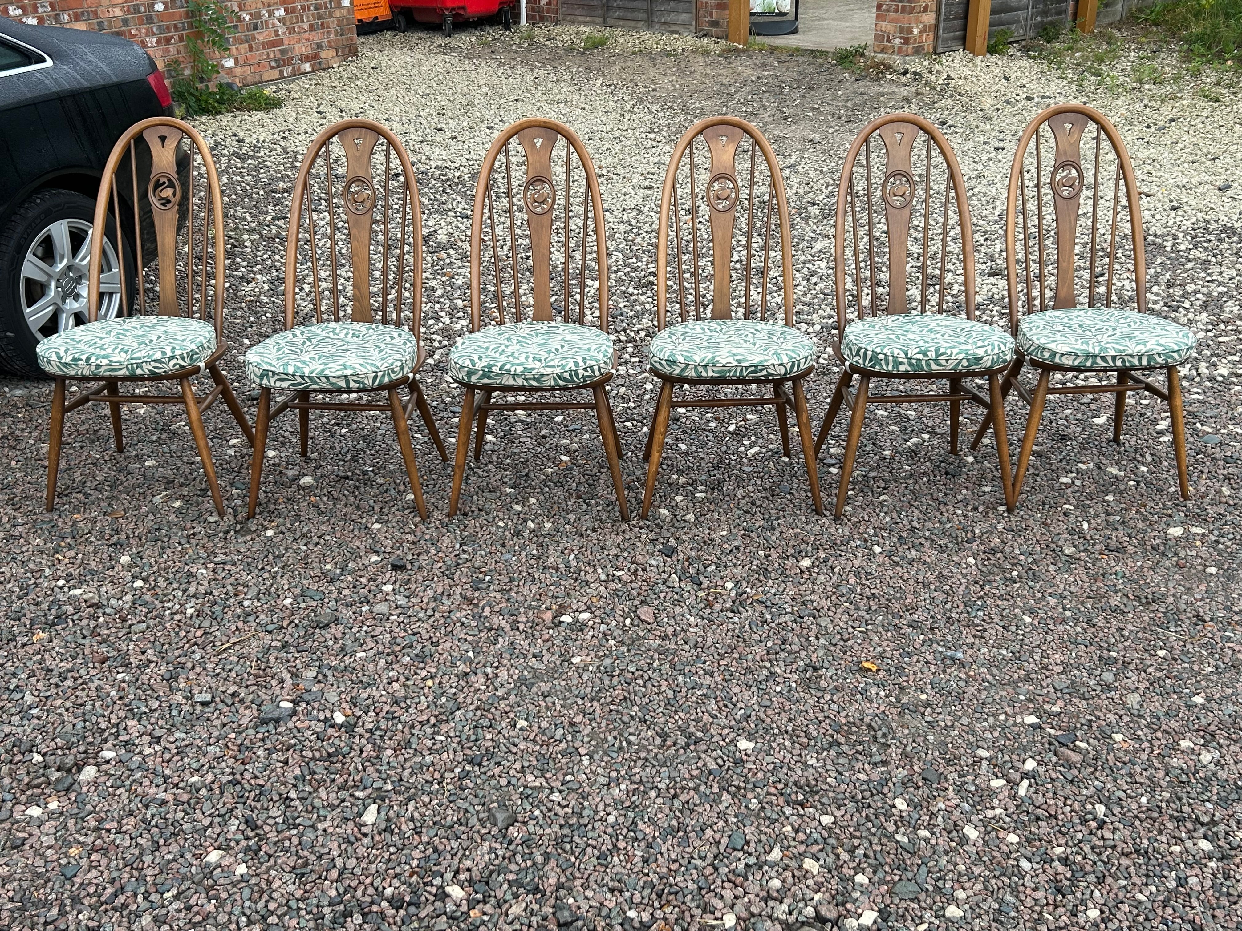 A set of six Ercol Windsor dining chairs, exhibiting a Mid-Century Modern interpretation of a spindle-back or Windsor style. Each chair is constructed from a light to medium-stained hardwood, featuring an arched crest rail with a distinctive carved circular motif in the center of the backrest, and saddled seats fitted with removable cushions upholstered in a green and white botanical leaf pattern. Each chair bears the circular gold ‘ERCOL MADE IN HIGH WYCOMBE BUCKINGHAMSHIRE ENGLAND’ sticker on the underside.