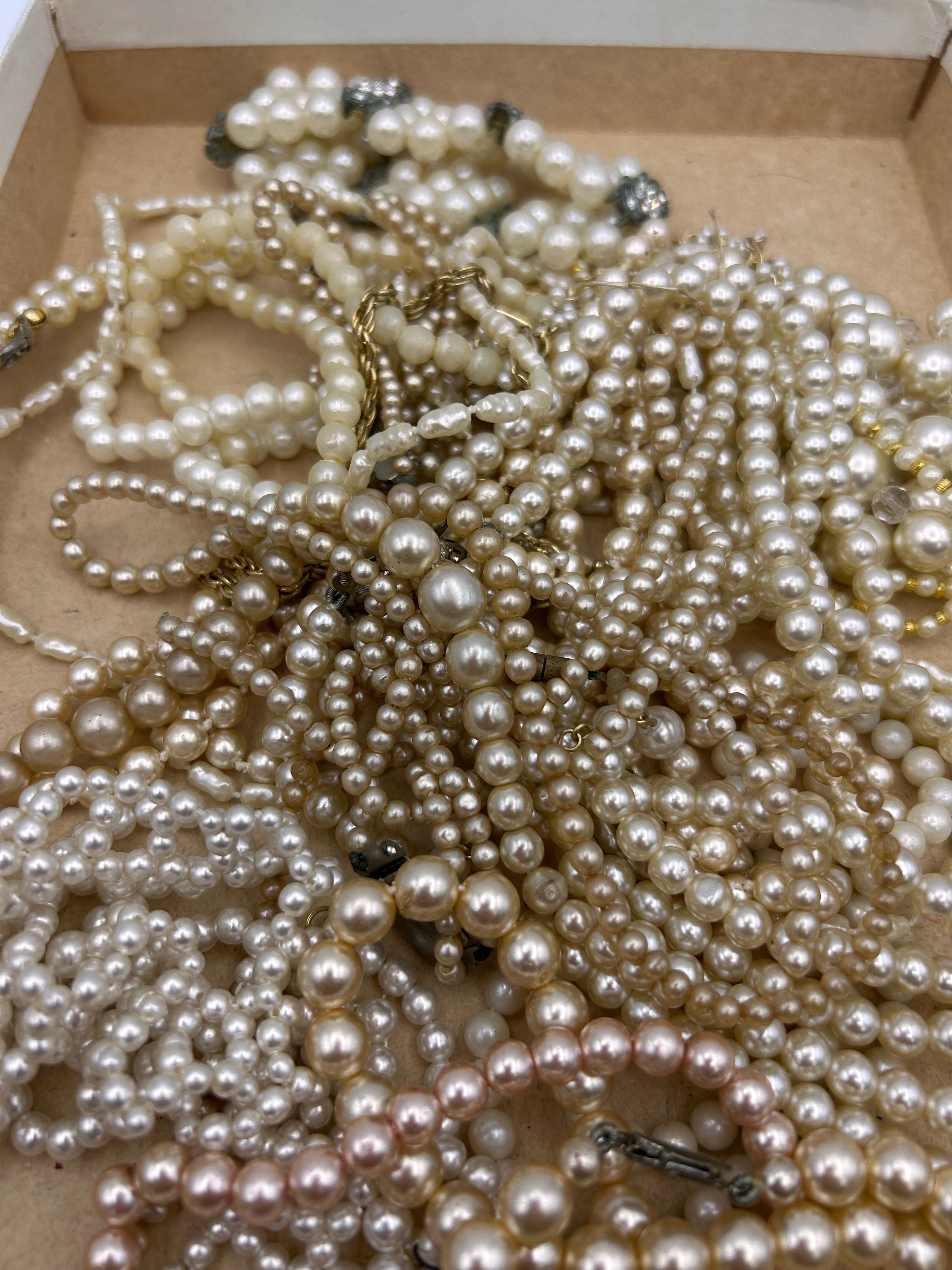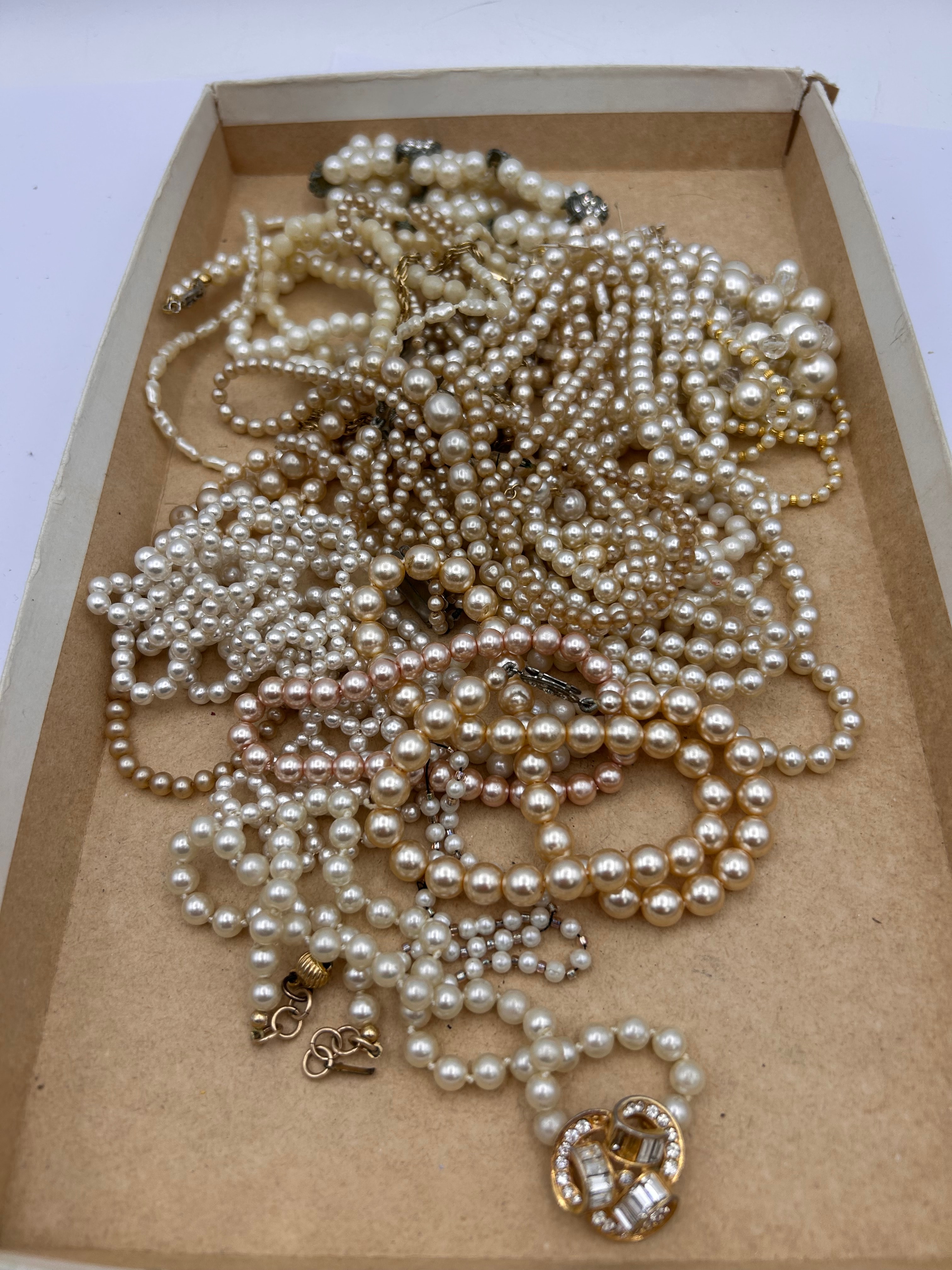 A substantial collection of costume jewelry, primarily consisting of numerous strands of simulated pearls in various sizes, colors including white, cream, champagne, and pale pink, and assorted lengths. Some strands feature interspersed clear beads. The style is classic, indicative of a mid-to-late 20th-century aesthetic. Materials comprise faux pearls, likely glass or plastic, and base metal findings, featuring both gold-toned and silver-toned clasps. Notable details include a prominent gold-toned clasp adorned with clear rhinestones, and several dark-toned, possibly gunmetal, floral-motif clasps also set with clear stones. No specific manufacturer’s marks or textual engravings are discernible. The items are presented tangled together within a plain cardboard box.