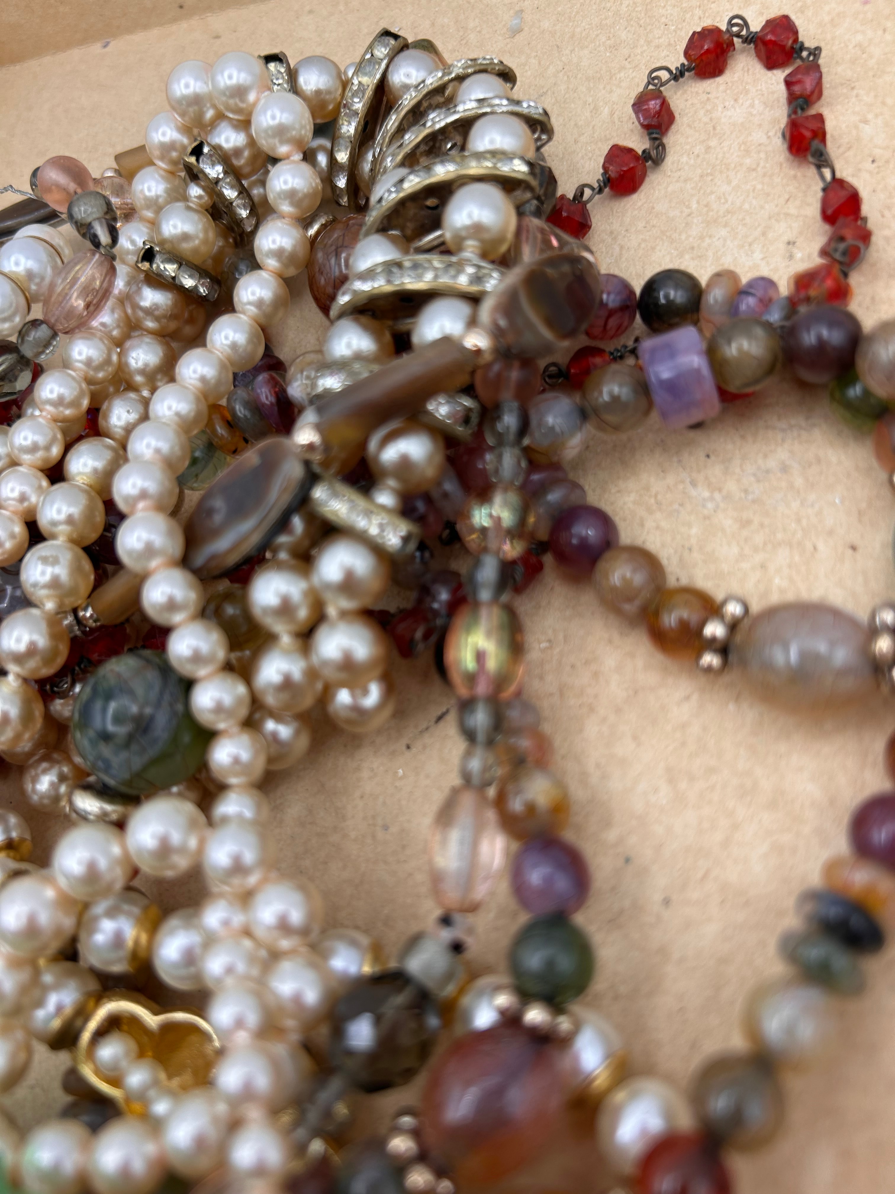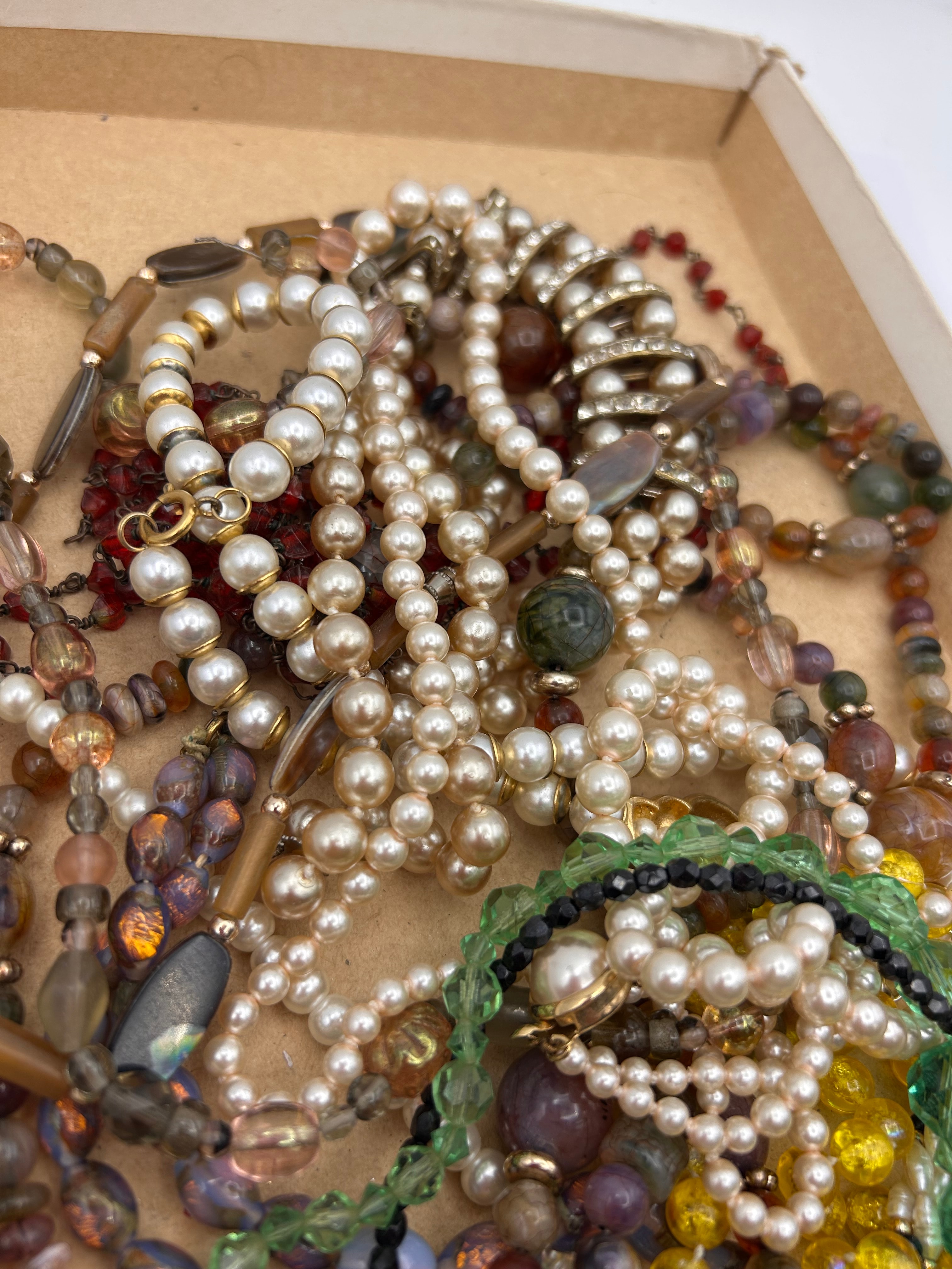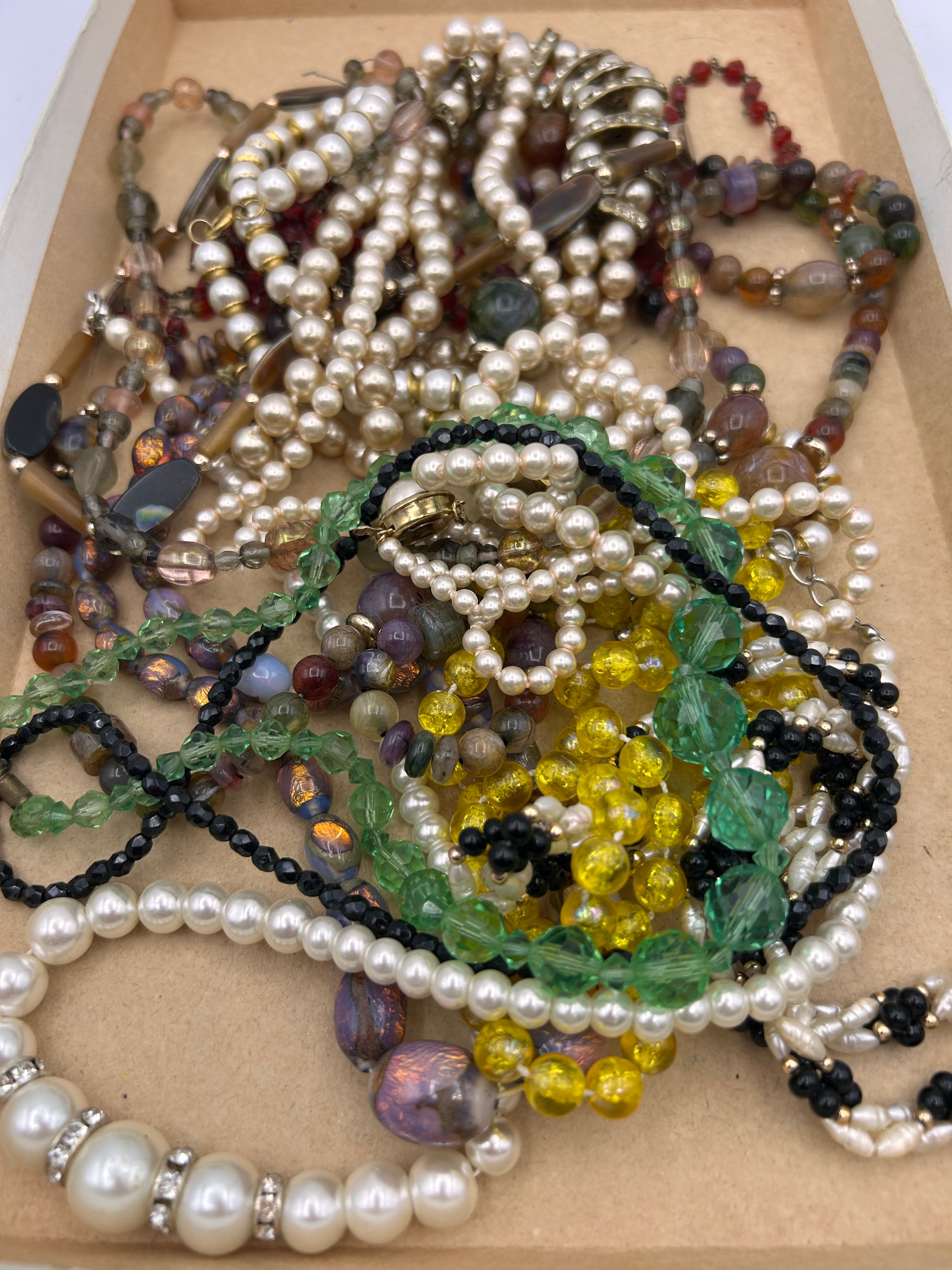 A collection of mixed costume jewelry, primarily comprising numerous necklaces and some bracelets, suitable for crafting, repair, or scrap. The lot features a wide array of materials including faux pearls (predominantly white and cream), various glass beads (faceted, round, irregular shapes in shades of green, yellow, red, purple, brown, black, and iridescent finishes), and natural stone beads (such as agate or jade-like examples). Metal components are visible as gold-tone and silver-tone base metals. The styles suggest a mid-to-late 20th-century period. No discernible text or maker’s marks are visible.