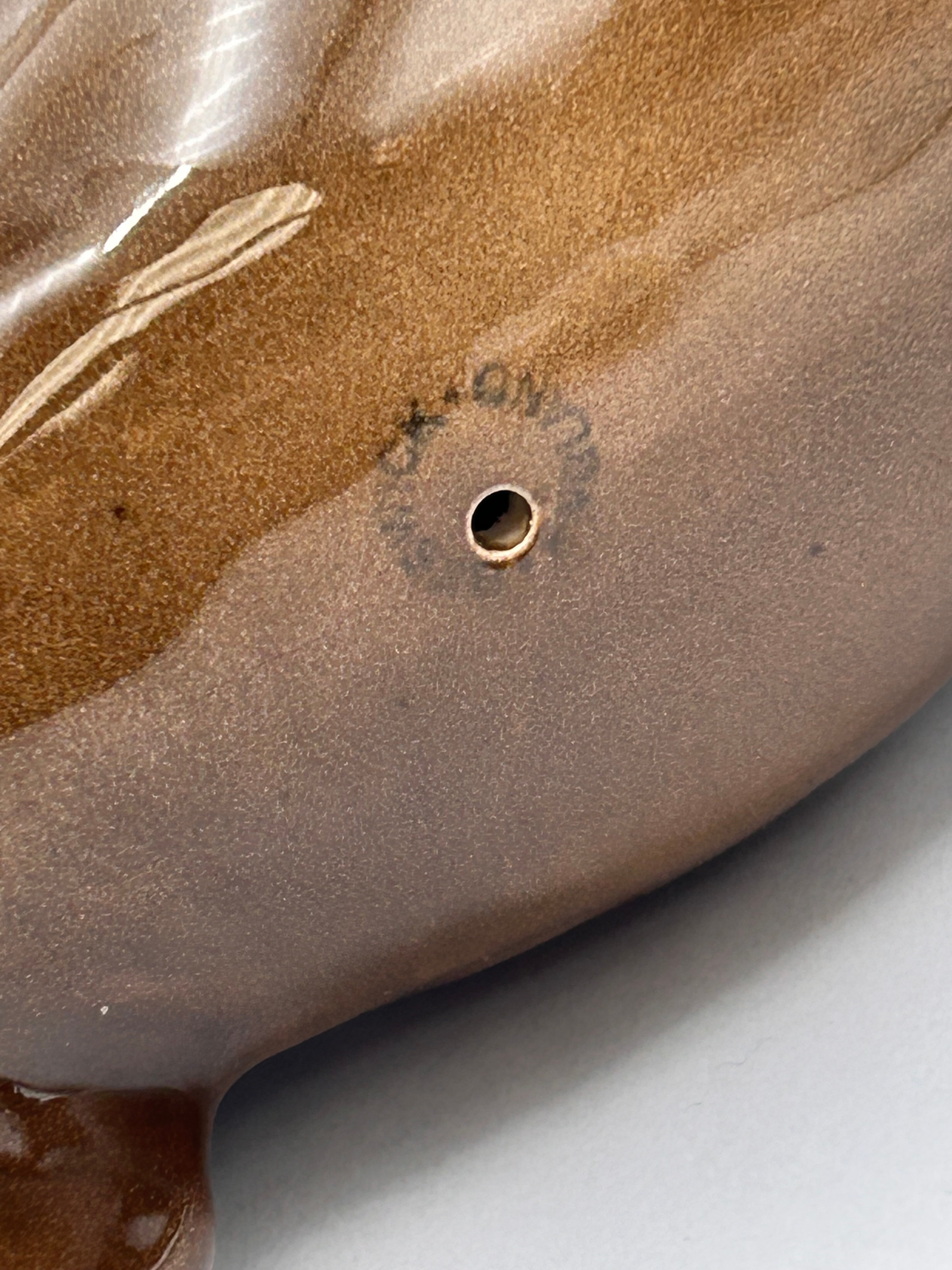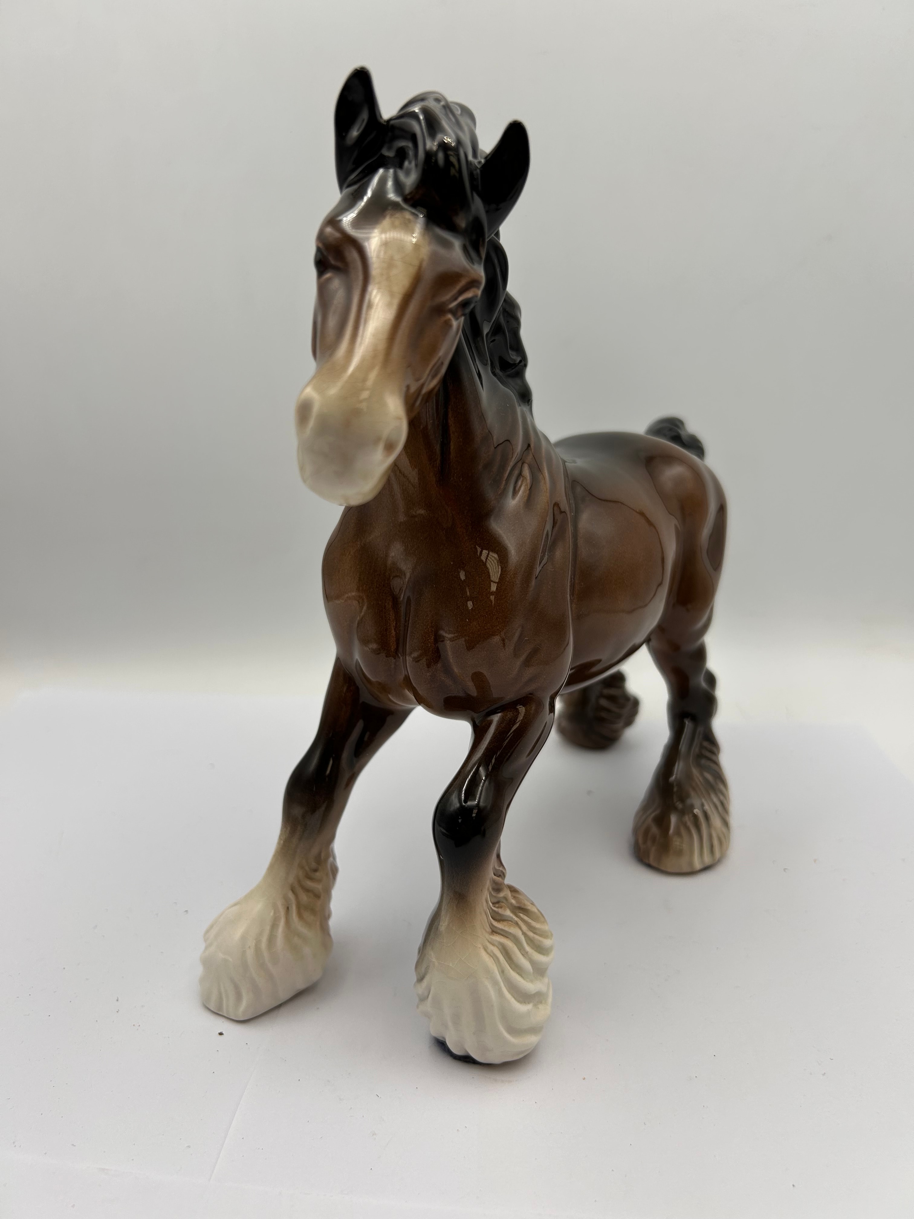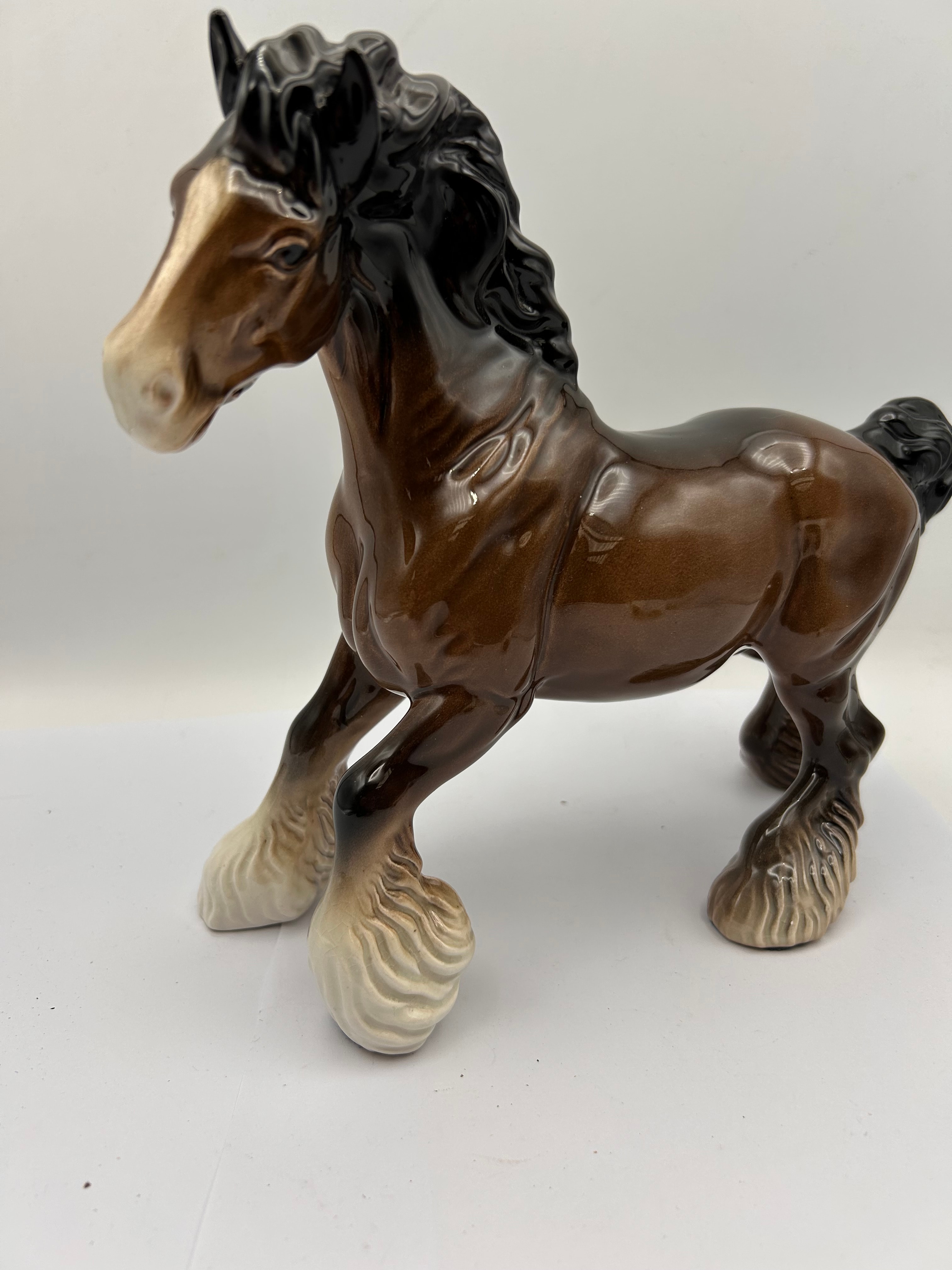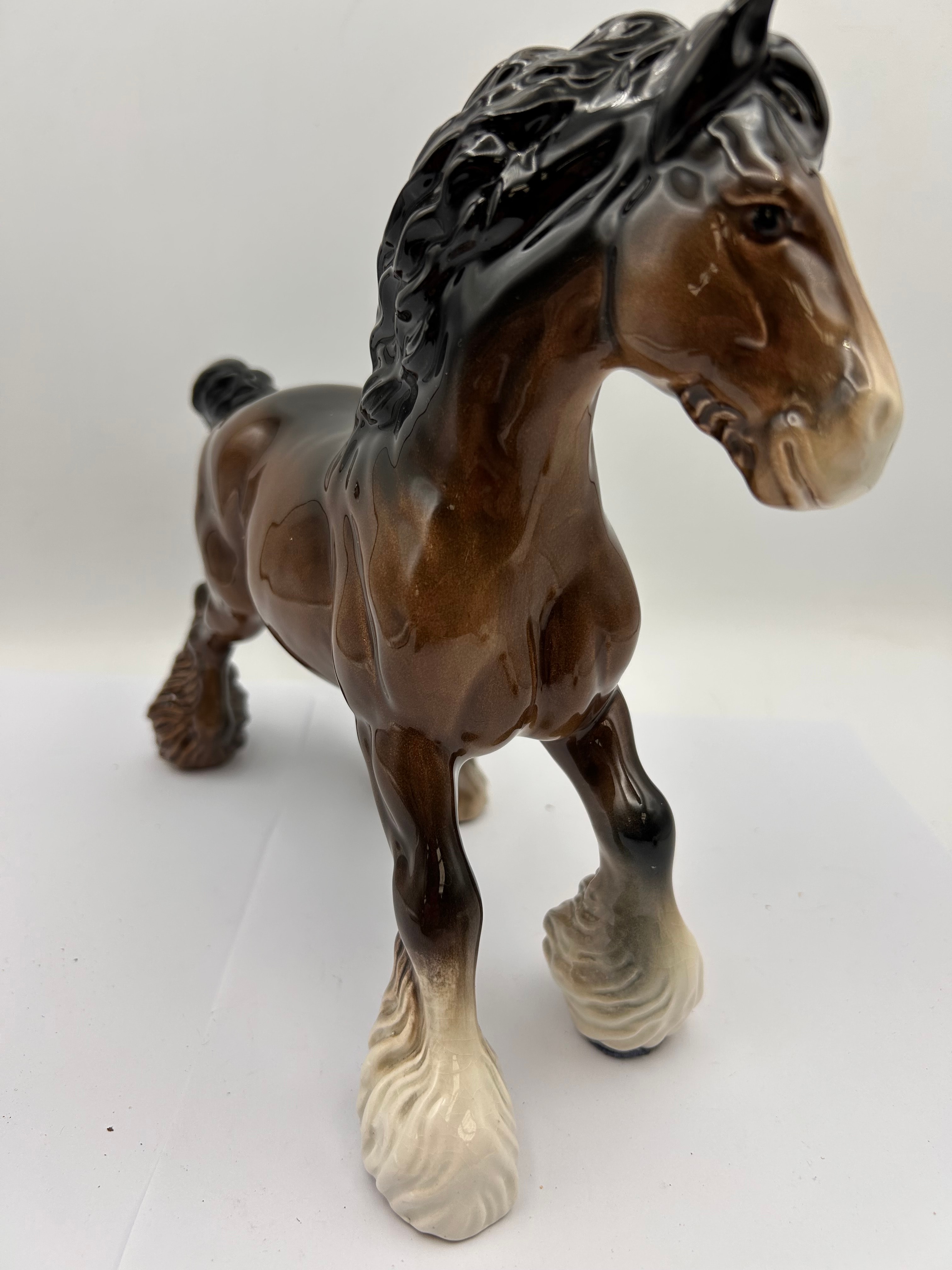 A Beswick Brown Glossy Cantering Shire Horse Figurine. This ceramic figurine depicts a draft horse breed in a dynamic, semi-rearing pose, rendered in a glossy brown glaze with a black mane and tail, distinctive white feathering on its legs, and a white blaze on its face. The underside features a circular vent hole and an impressed manufacturer’s mark, with the letters ‘COON’ clearly legible.