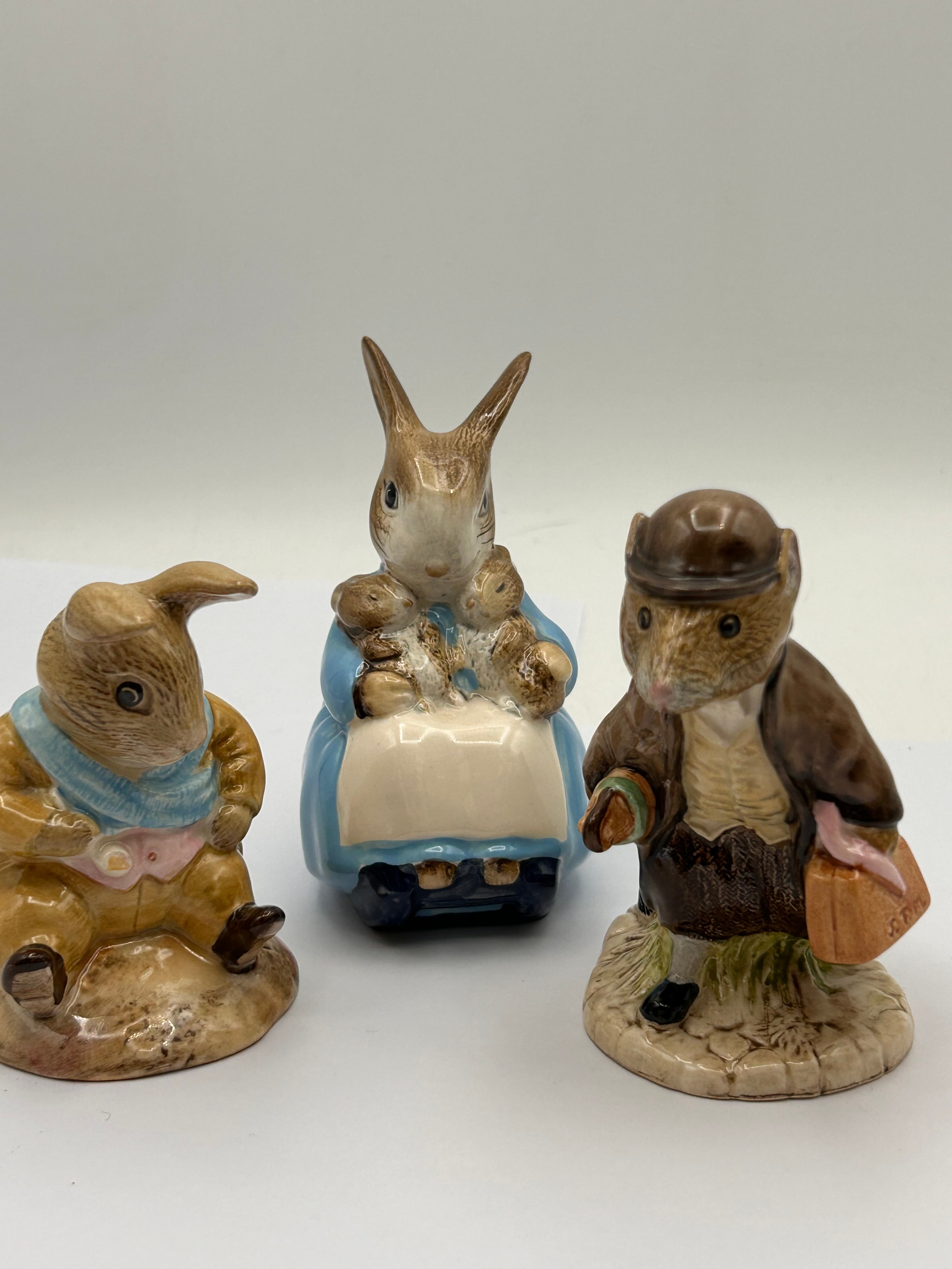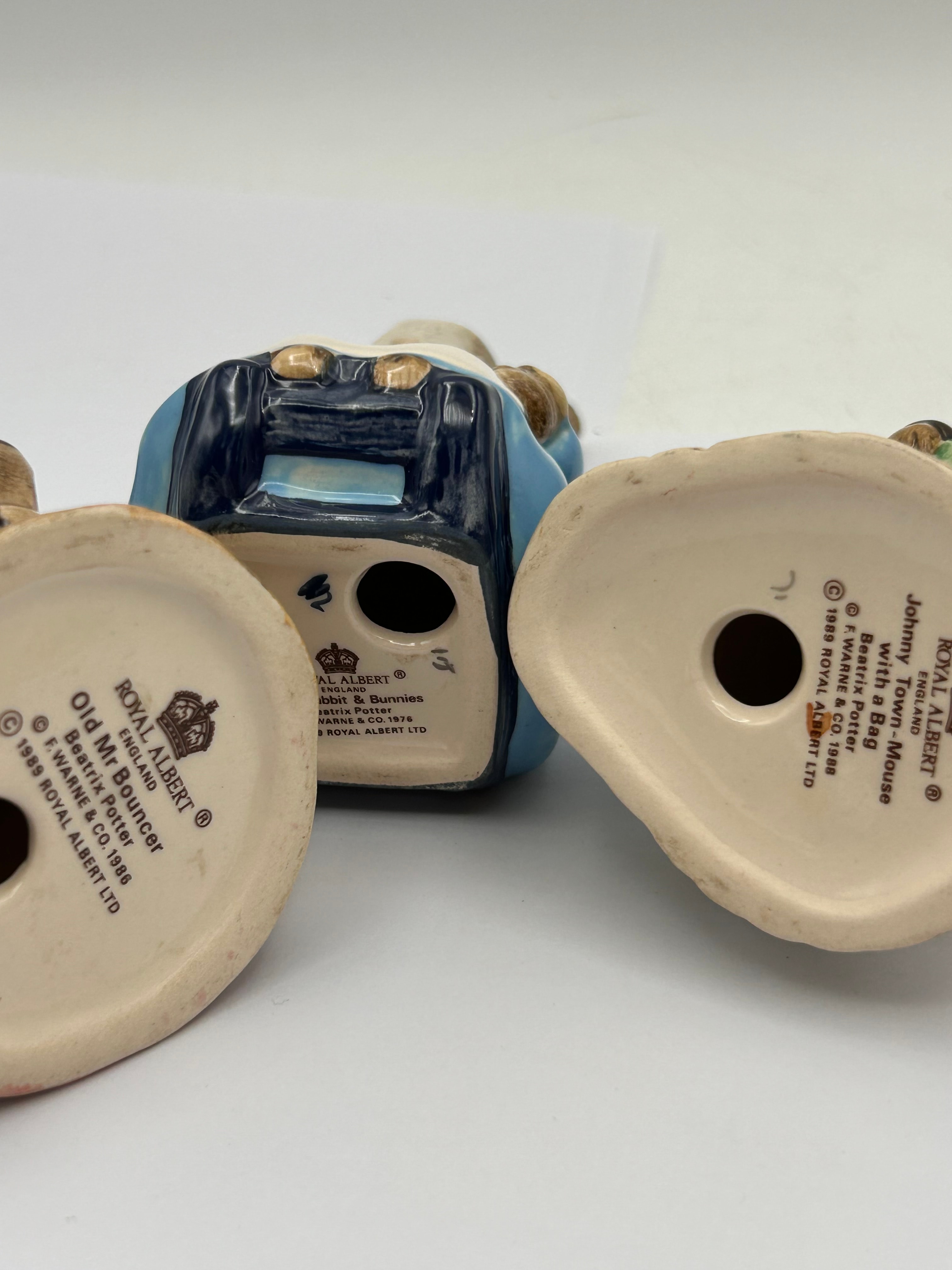 A group of three glazed ceramic figurines by Royal Albert, depicting anthropomorphic characters from the Beatrix Potter series. The central figure, identified as ‘Flopsy, Mopsy & Cottontail and Peter Rabbit & Bunnies’ (dated 1978), features a mother rabbit in a blue dress holding multiple offspring. The left figure is ‘Old Mr. Bouncer’ (dated 1986), a seated brown rabbit in a blue scarf. The right figure is ‘Johnny Town-Mouse With a Bag’ (dated 1980), a mouse in a brown suit and hat carrying a small orange bag. All bases are marked ‘ROYAL ALBERT ENGLAND’ with a crown logo and bear copyright to F. Beatrix Potter or F. Warne & Co.