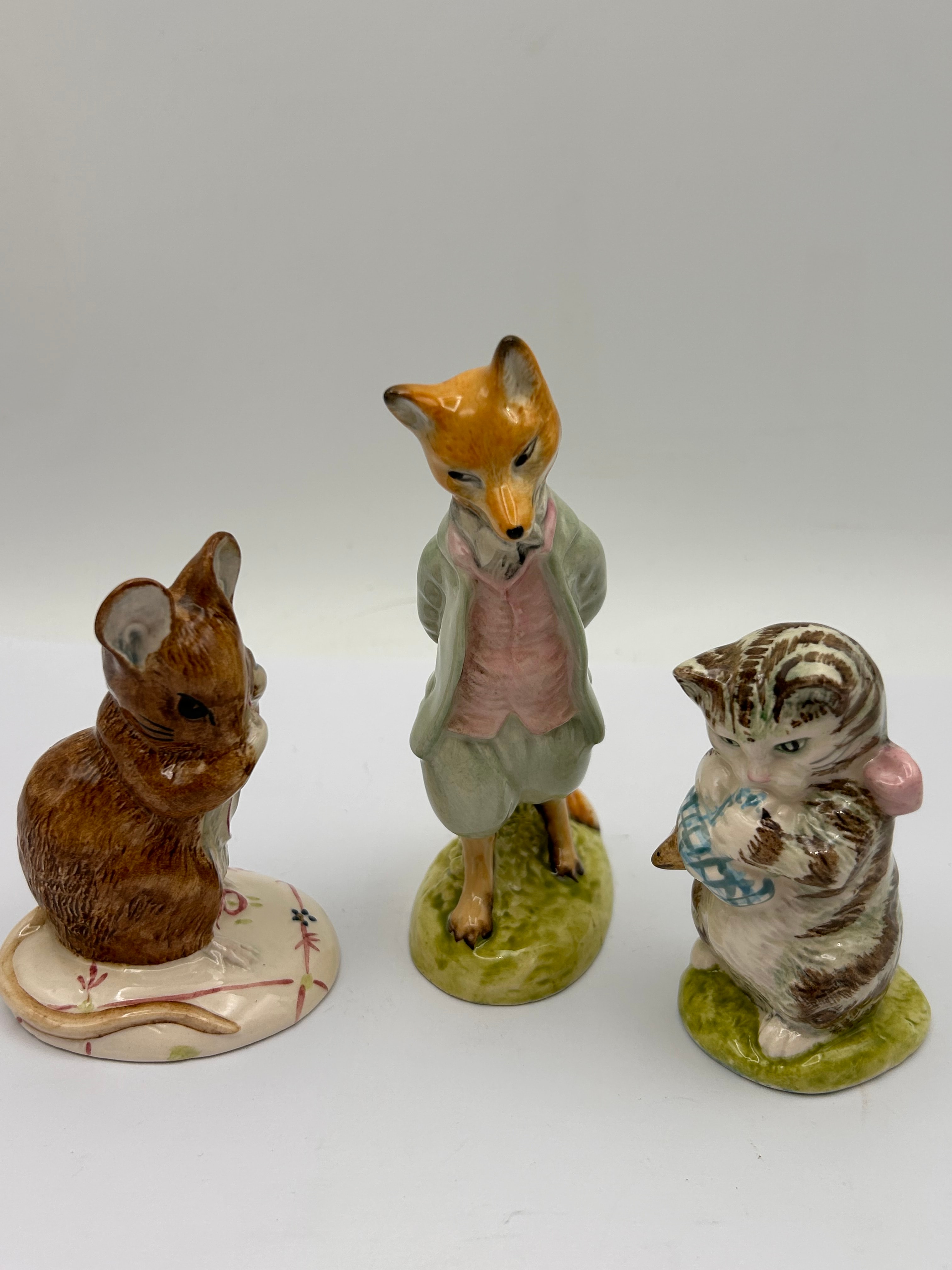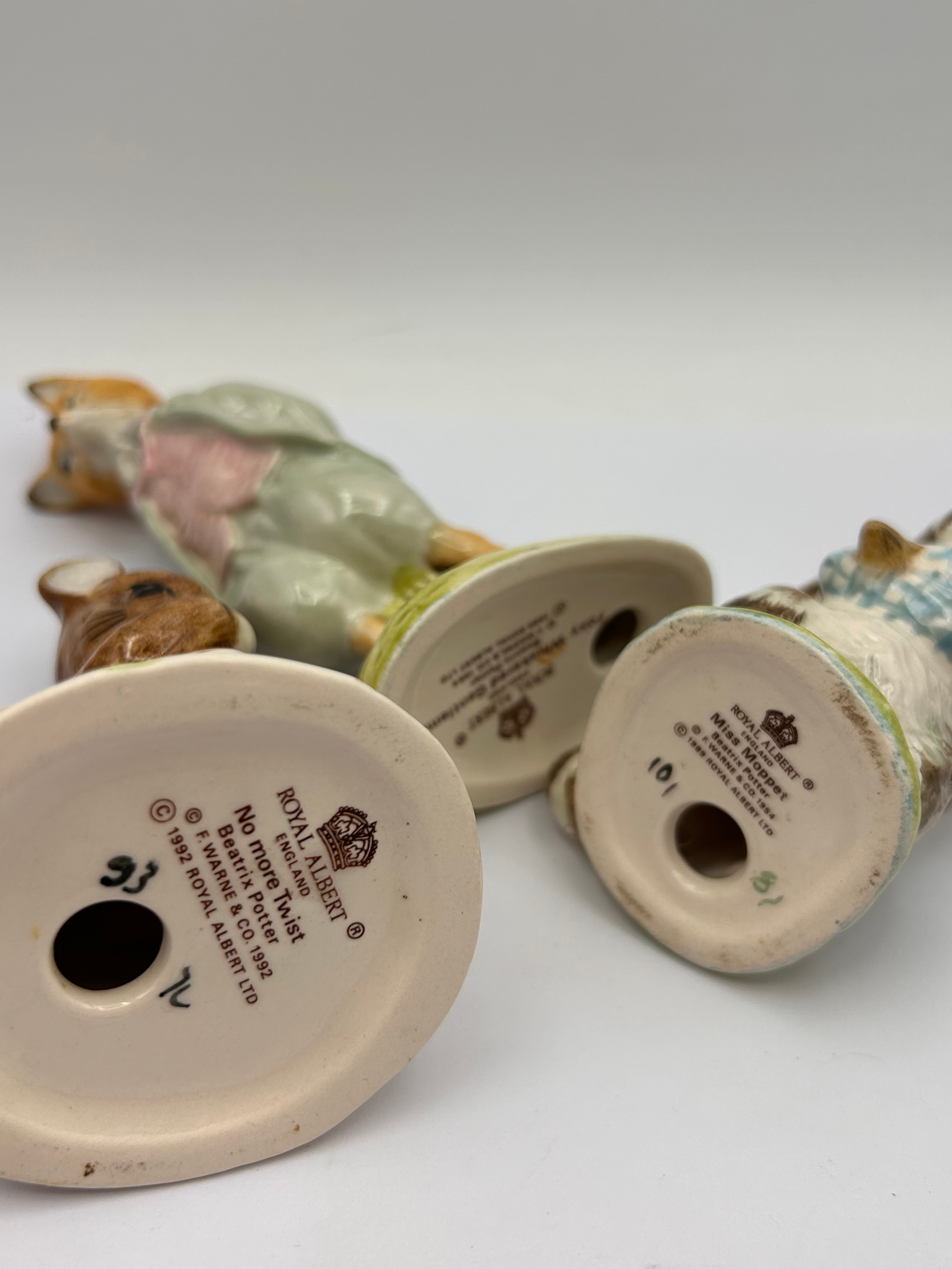 A group of three glazed ceramic figurines by Royal Albert, England, depicting anthropomorphic animal characters from the Beatrix Potter series. The first figurine, identified as ‘Foxy Whiskered Gentleman’, portrays a fox dressed in a green jacket and pink waistcoat. The second, ‘Mrs. Tittlemouse’, is a brown mouse sitting on a patterned cushion. The third, ‘Miss Moppet’, is a striped cat holding a blue and white patterned object. All figurines bear “ROYAL ALBERT ENGLAND” marks on their bases, along with specific character names and copyright dates for F. Warne & Co and Royal Albert Ltd. ‘Mrs. Tittlemouse’ is copyrighted 1992, and ‘Miss Moppet’ is copyrighted 1989. Incised or handwritten numbers and letters (“93”, “IL”, “101”, “B”) are also visible on the bases. The items indicate a late 20th-century production period.