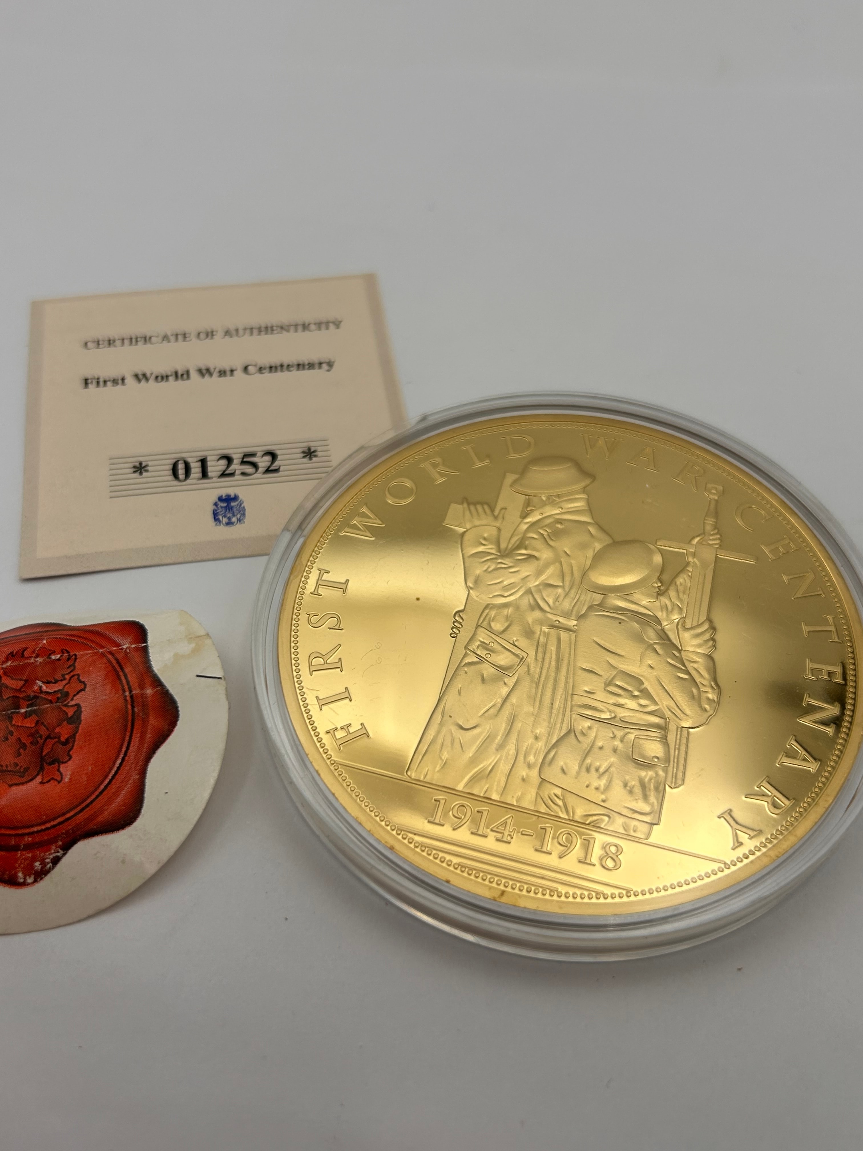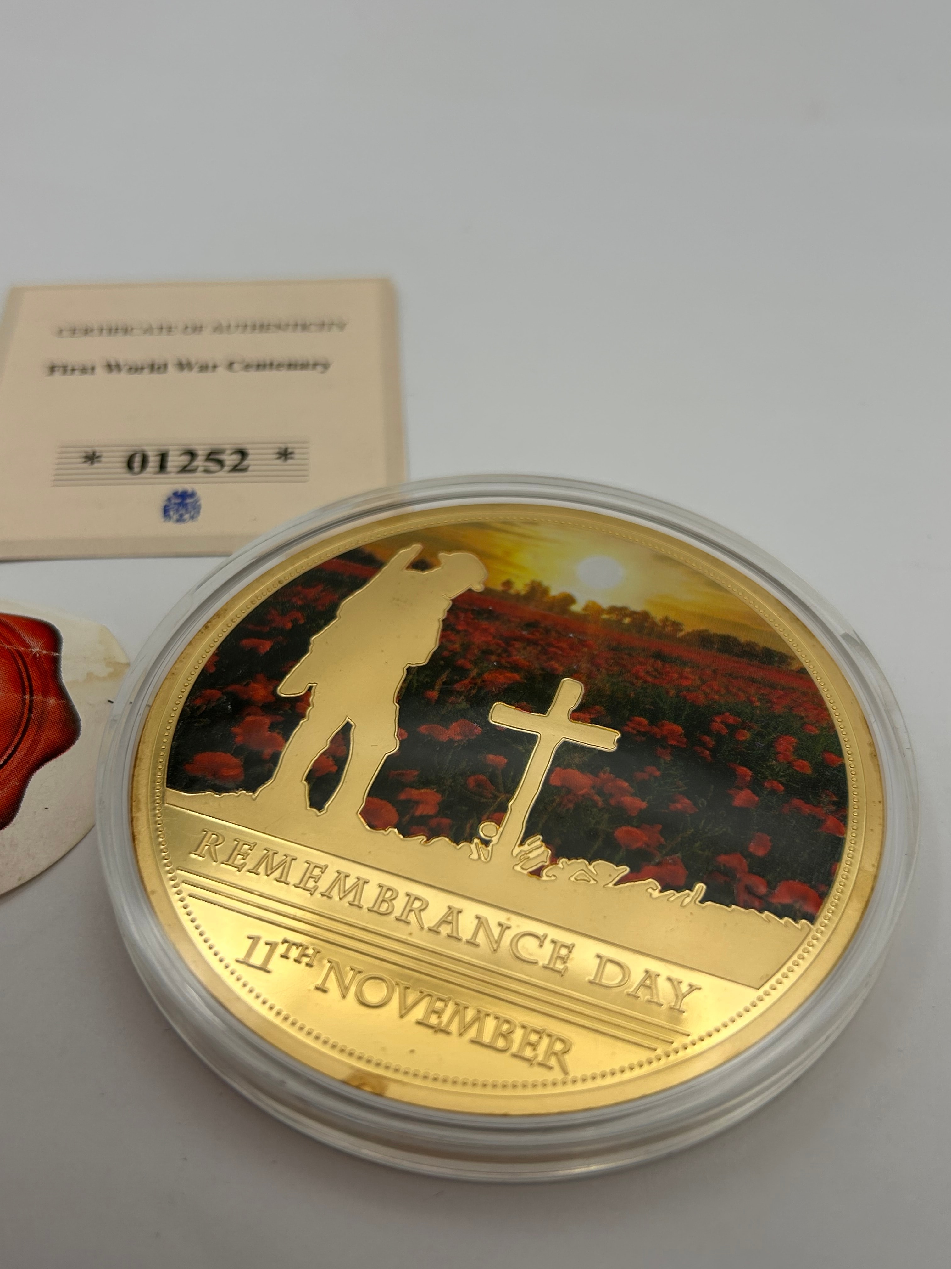 A Windsor Mint First World War Centenary Commemorative Coin/Medallion, presented in a clear protective plastic capsule. The gold-toned coin features two distinct sides: one displays two stylized World War I soldiers and is inscribed “FIRST WORLD WAR CENTENARY” along with the dates “1914-1918”; the other side depicts a silhouette of a soldier and a cross against a vibrant, colored background of a poppy field at sunset, inscribed “REMEMBRANCE DAY” and “11TH NOVEMBER”. The coin is accompanied by a cream-colored certificate of authenticity, marked with the serial number “01252” and a small blue crest, also stating “First World War Centenary”. A partially visible red wax seal is also present.