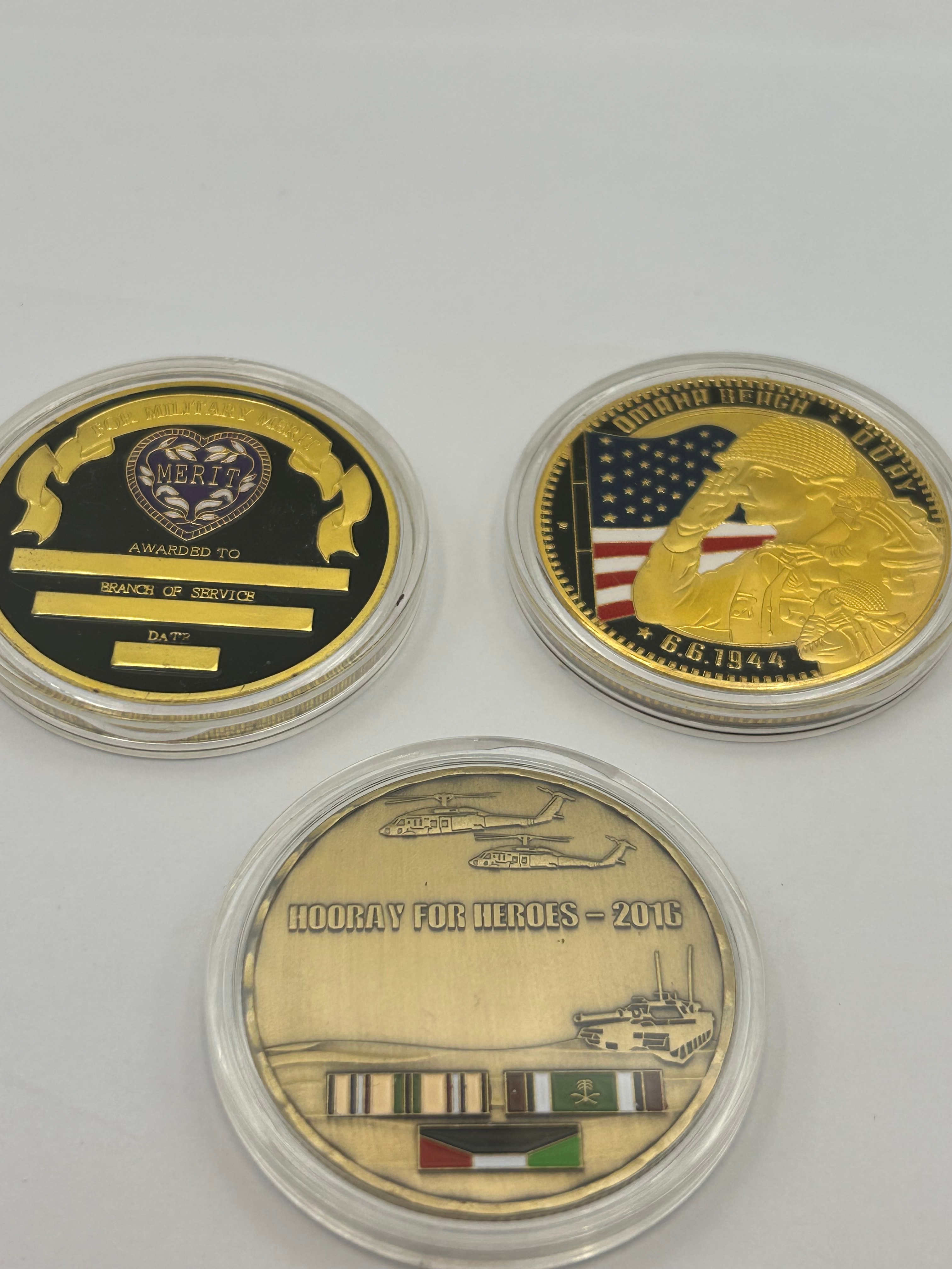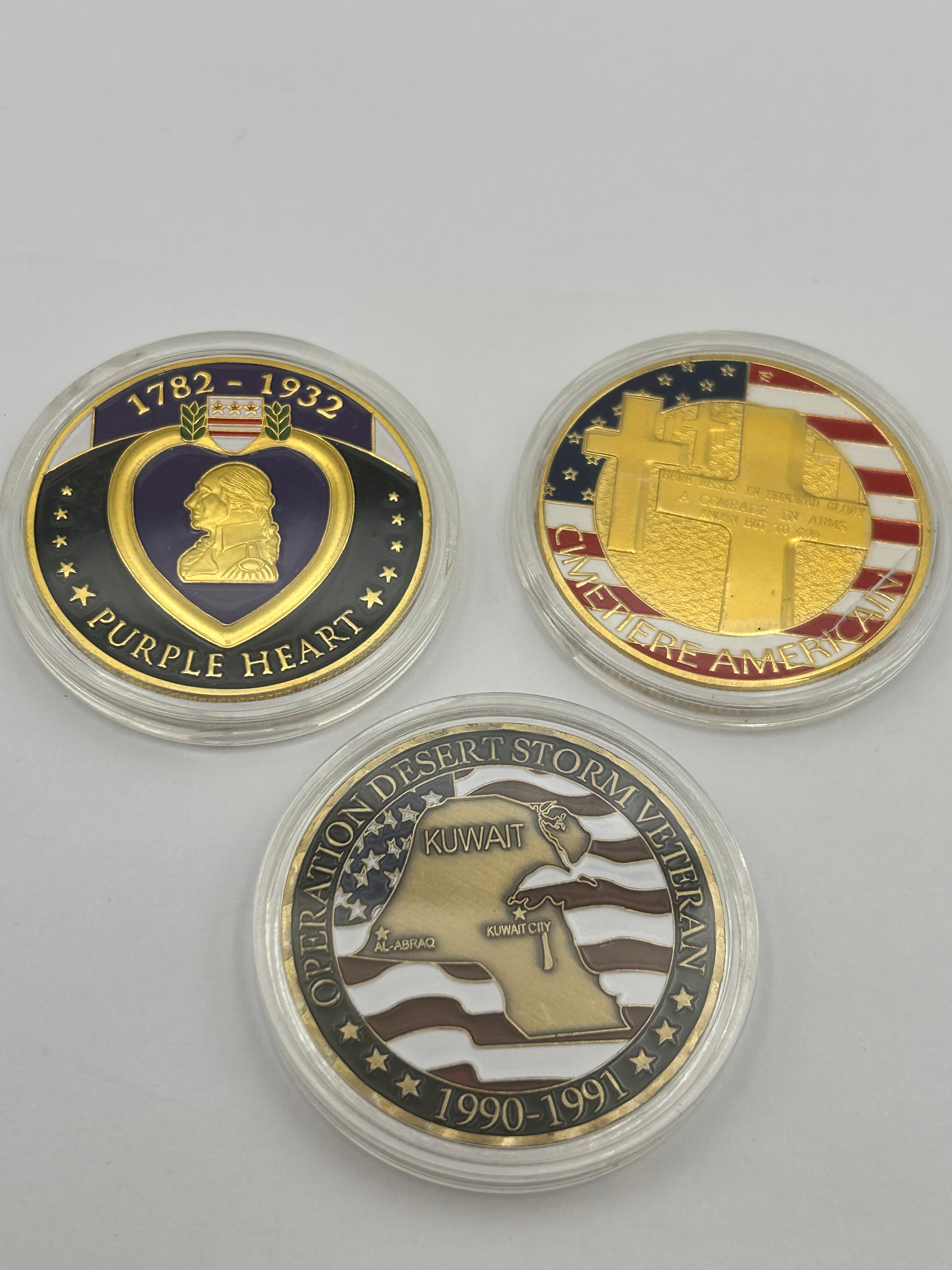A group of three gold-toned commemorative medallions, each enclosed in a clear plastic protective capsule. One medallion features a purple enamel heart with a profile bust and the text “PURPLE HEART 1782-1932.” Its reverse side is designed for engraving, marked “MERIT,” “AWARDED TO,” “BRANCH OF SERVICE,” and “DATE.” A second medallion displays a prominent gold cross over an American flag motif, inscribed “CIMETIÈRE AMÉRICAIN” (American Cemetery), with further text on the cross reading “EN HUI REPOSE 9387 SOLDATS EN ARMEE ET DU GUERRE (1917-1918 / 1941-1945).” Its reverse depicts a soldier saluting an American flag with the text “GOD BLESS OUR HEROES” and “6.6.1944.” The third medallion, identified as an Operation Desert Storm Veteran Challenge Coin, showcases a map of Kuwait with text “OPERATION DESERT STORM VETERAN” and “1990-1991.” Its reverse is inscribed “HOORAY FOR HEROES – 2016” and illustrates military aircraft, a tank, and a series of ribbons including the flags of Kuwait, Saudi Arabia, and a Palestinian-like flag.