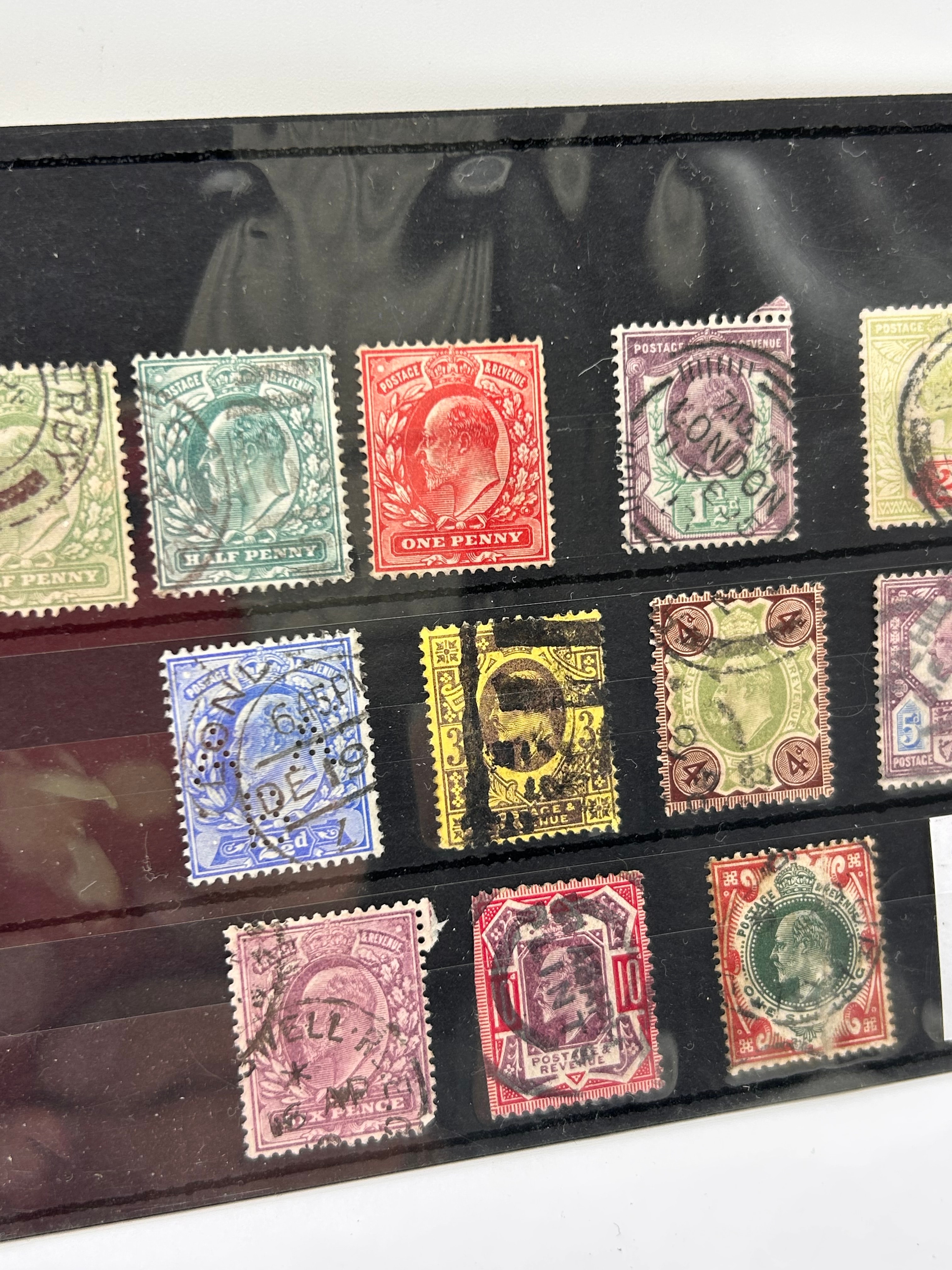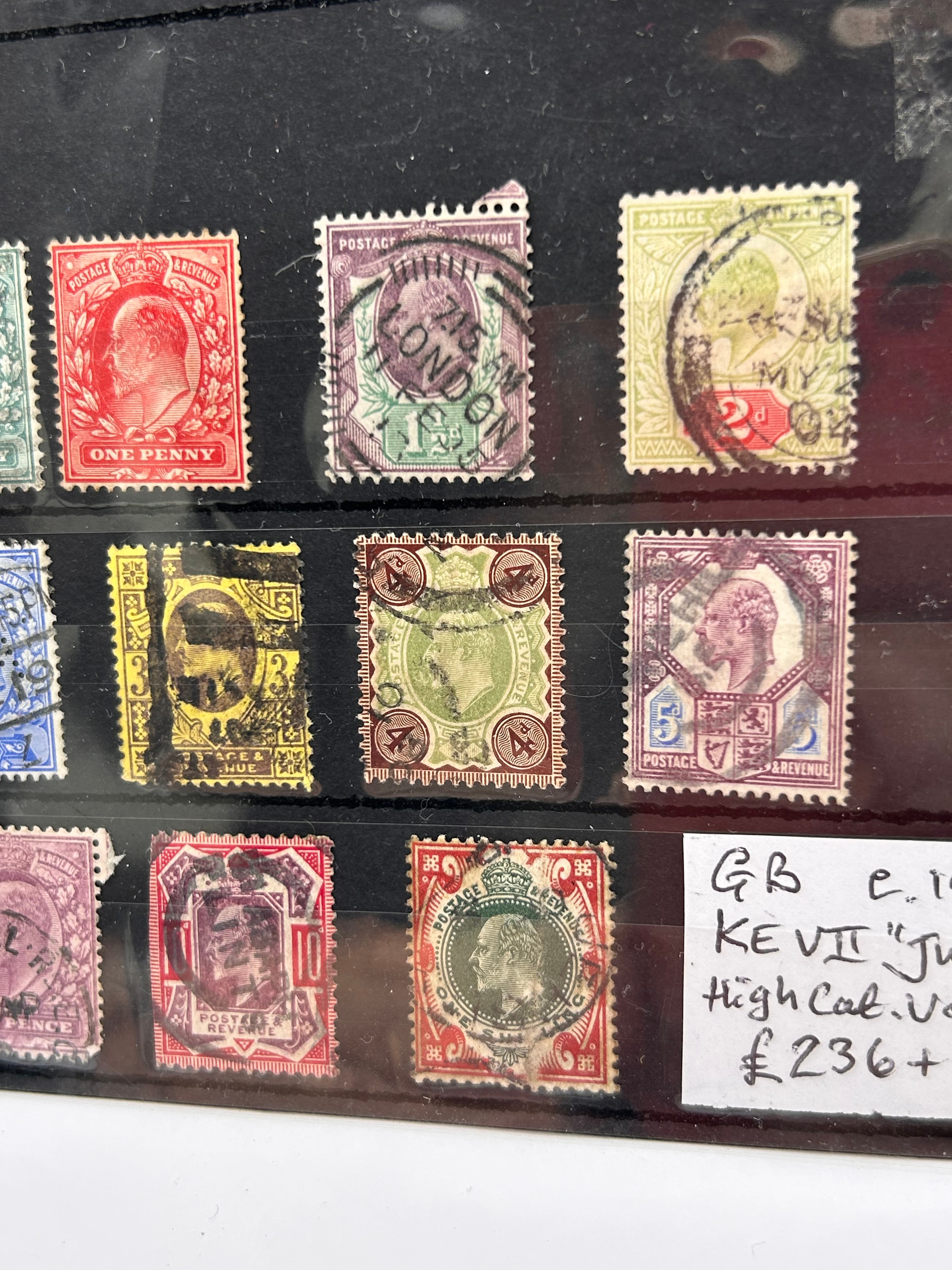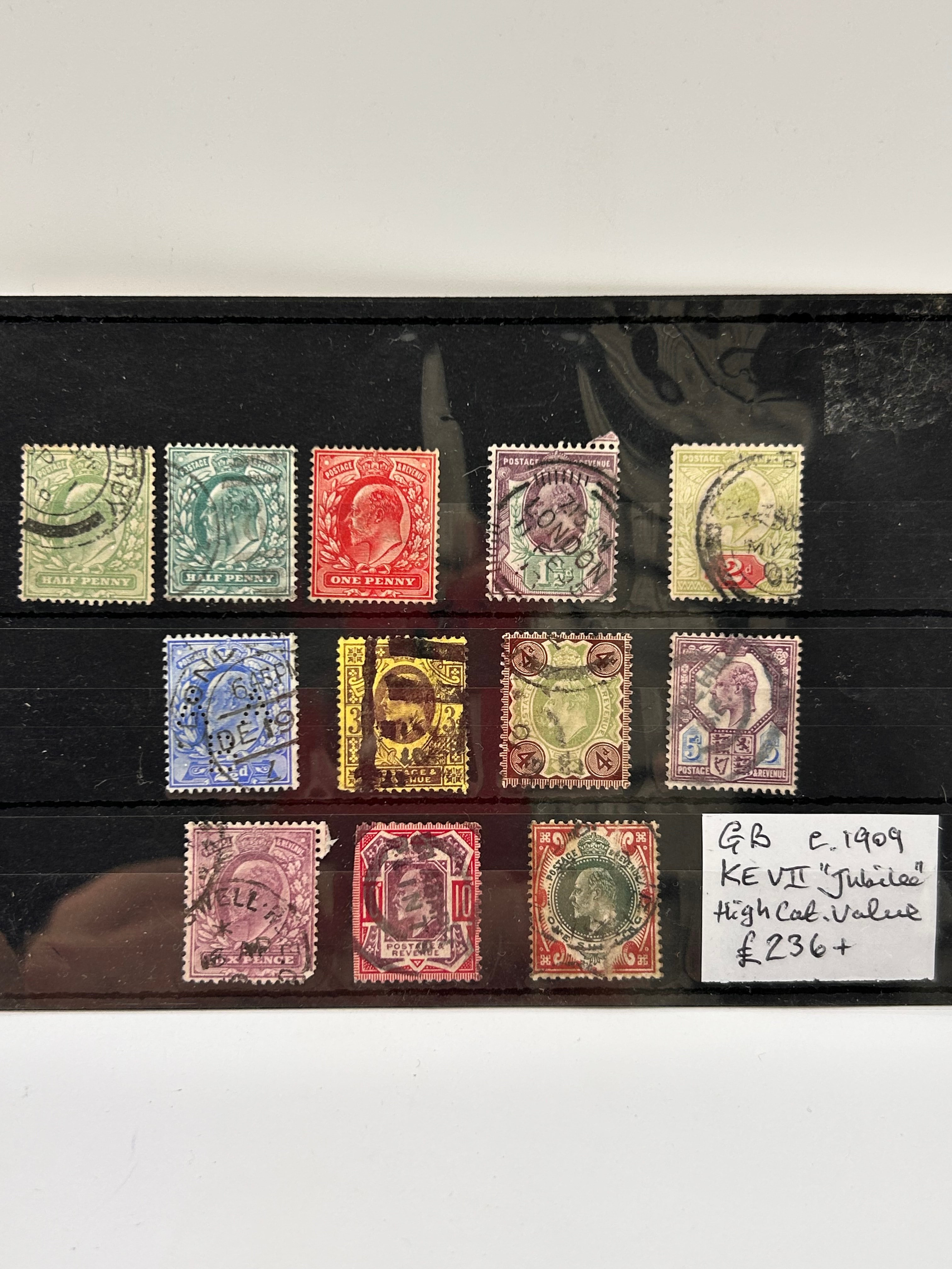 A collection of Great Britain Edward VII used postage stamps, dating from circa 1902-1910. Comprising fourteen individual stamps, housed within a black plastic stock page with clear viewing strips. Many stamps feature a profile portrait of King Edward VII and bear inscriptions such as “POSTAGE & REVENUE” and various denominations including “HALF PENNY,” “ONE PENNY,” “2d,” and “5.” Several stamps exhibit circular postmarks, with one clearly visible as “LONDON.” The stamps appear to be used, showing cancellations. An accompanying handwritten note identifies the collection as “KE VII “Jubilee”.”