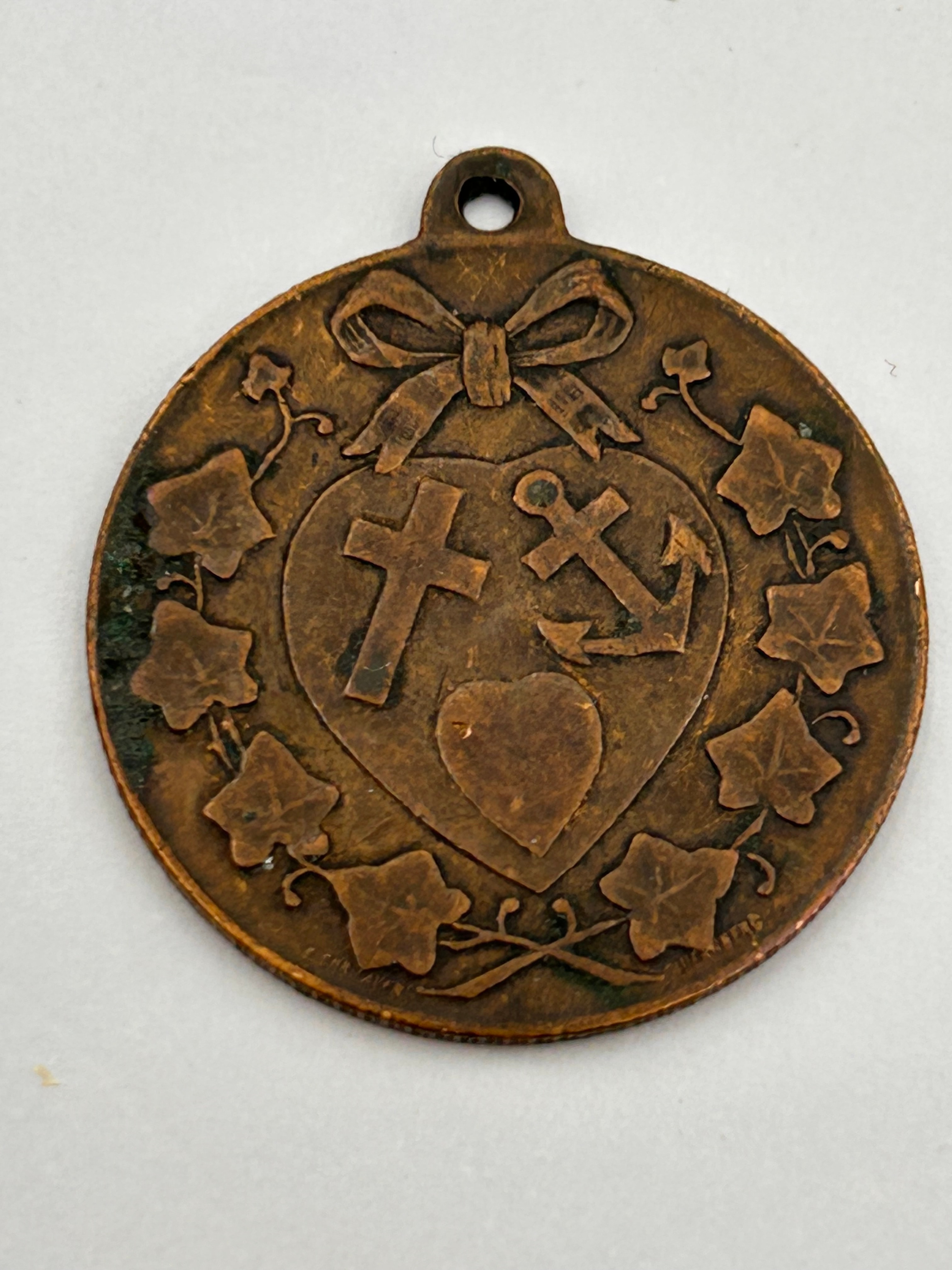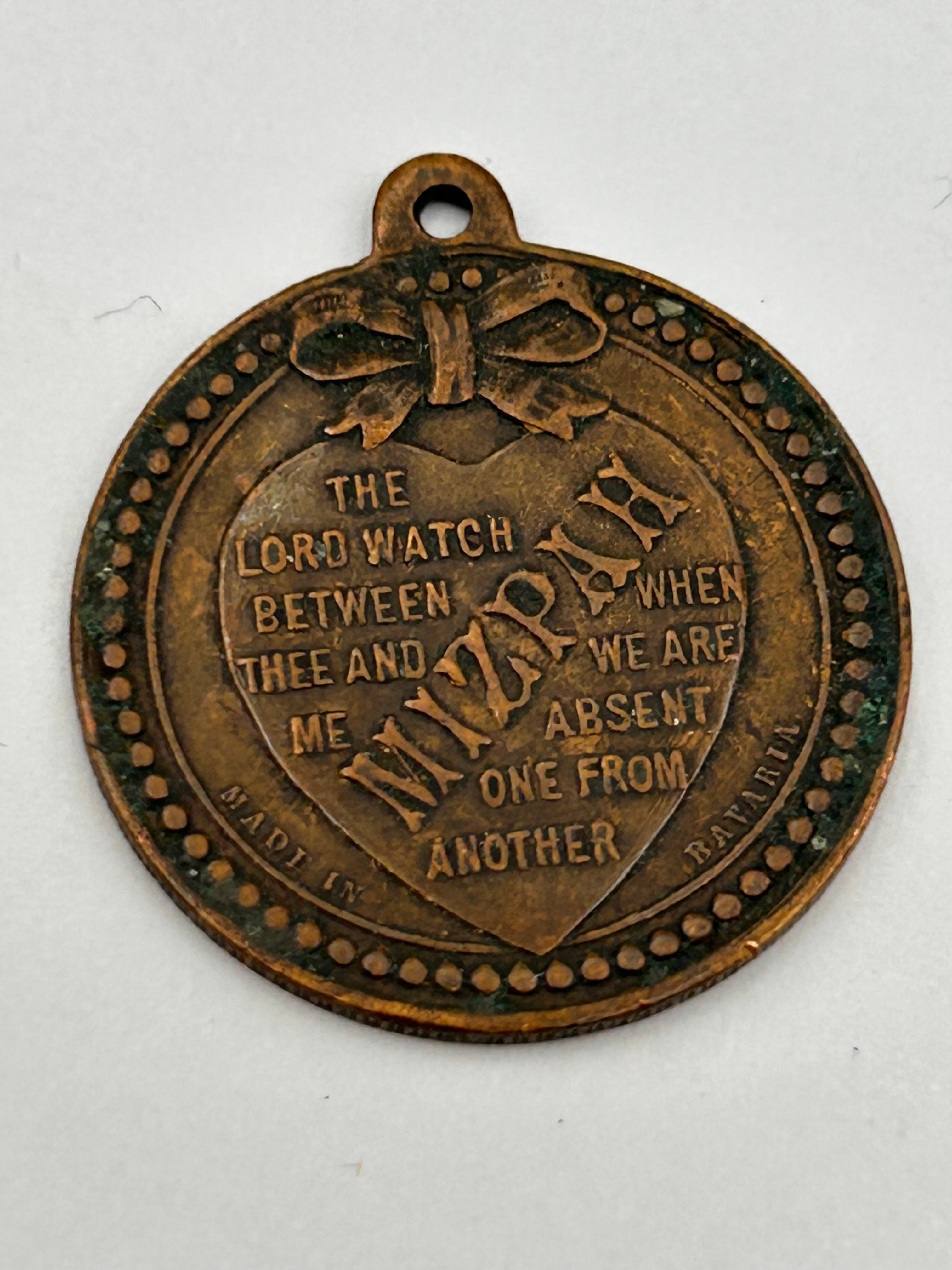 A WW1 Period Mizpah Love Token Pendant, crafted from a copper or copper alloy. The circular medallion features a suspension loop at the top. The obverse displays a central heart motif topped by a bow, inscribed with the English text "THE LORD WATCH BETWEEN THEE AND ME WHEN WE ARE ABSENT ONE FROM ANOTHER" and prominently "MIZPAH." The border includes dots and the text "MADE IN BAVARIA." The reverse similarly displays a heart motif topped by a bow, surrounded by ivy leaves, containing a Latin cross, an anchor, and a smaller plain heart. "MIZPAH" is a Hebrew word meaning "watchtower" or "watch, " often associated with tokens exchanged between loved ones during separation.