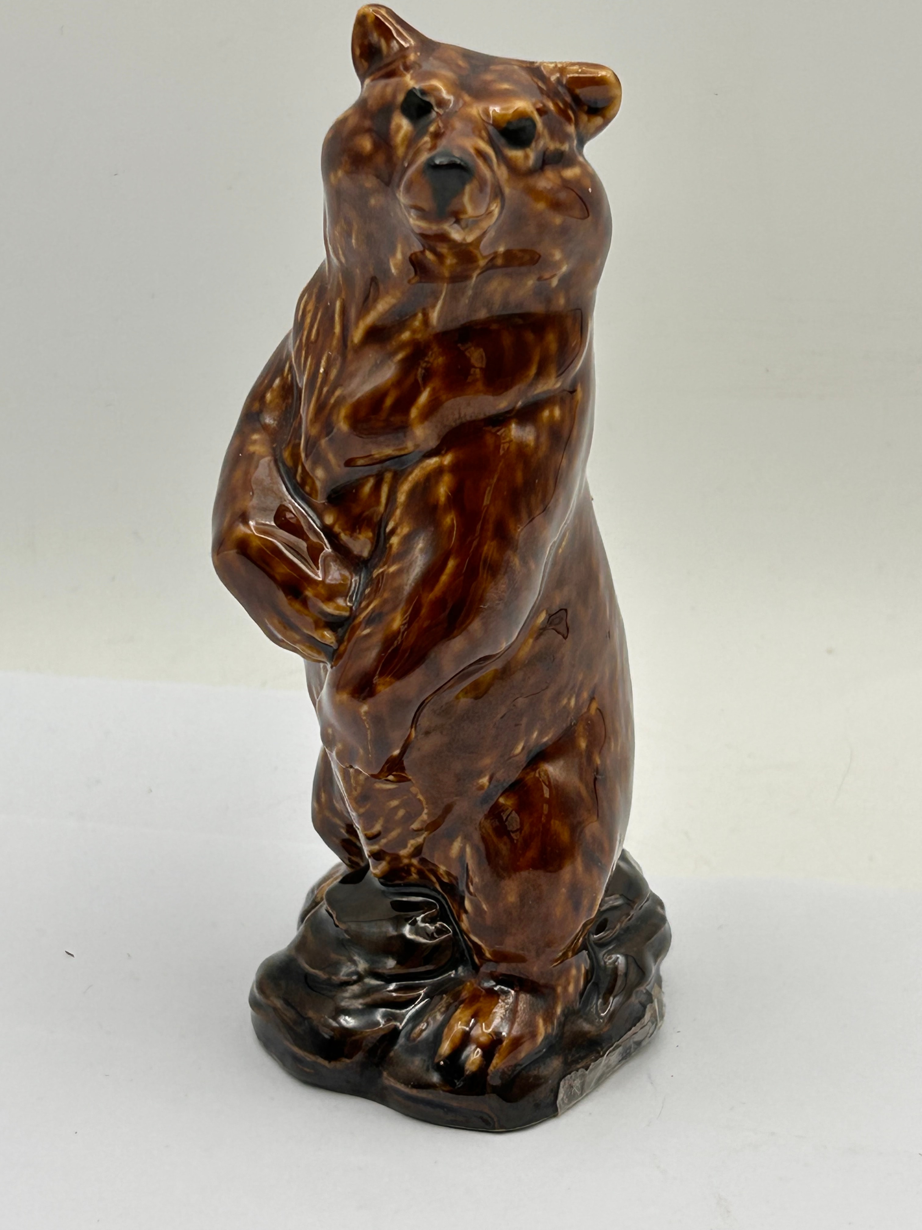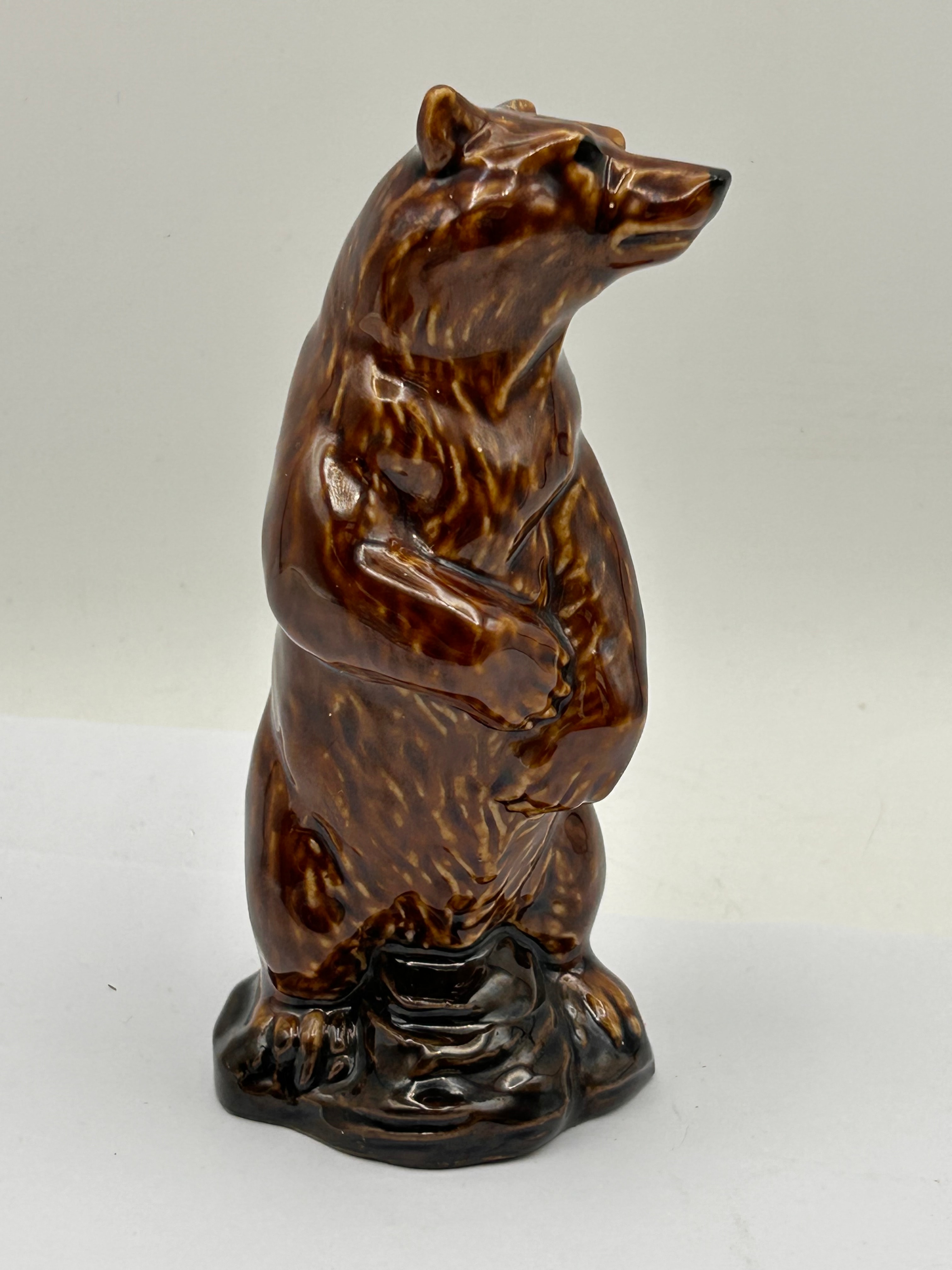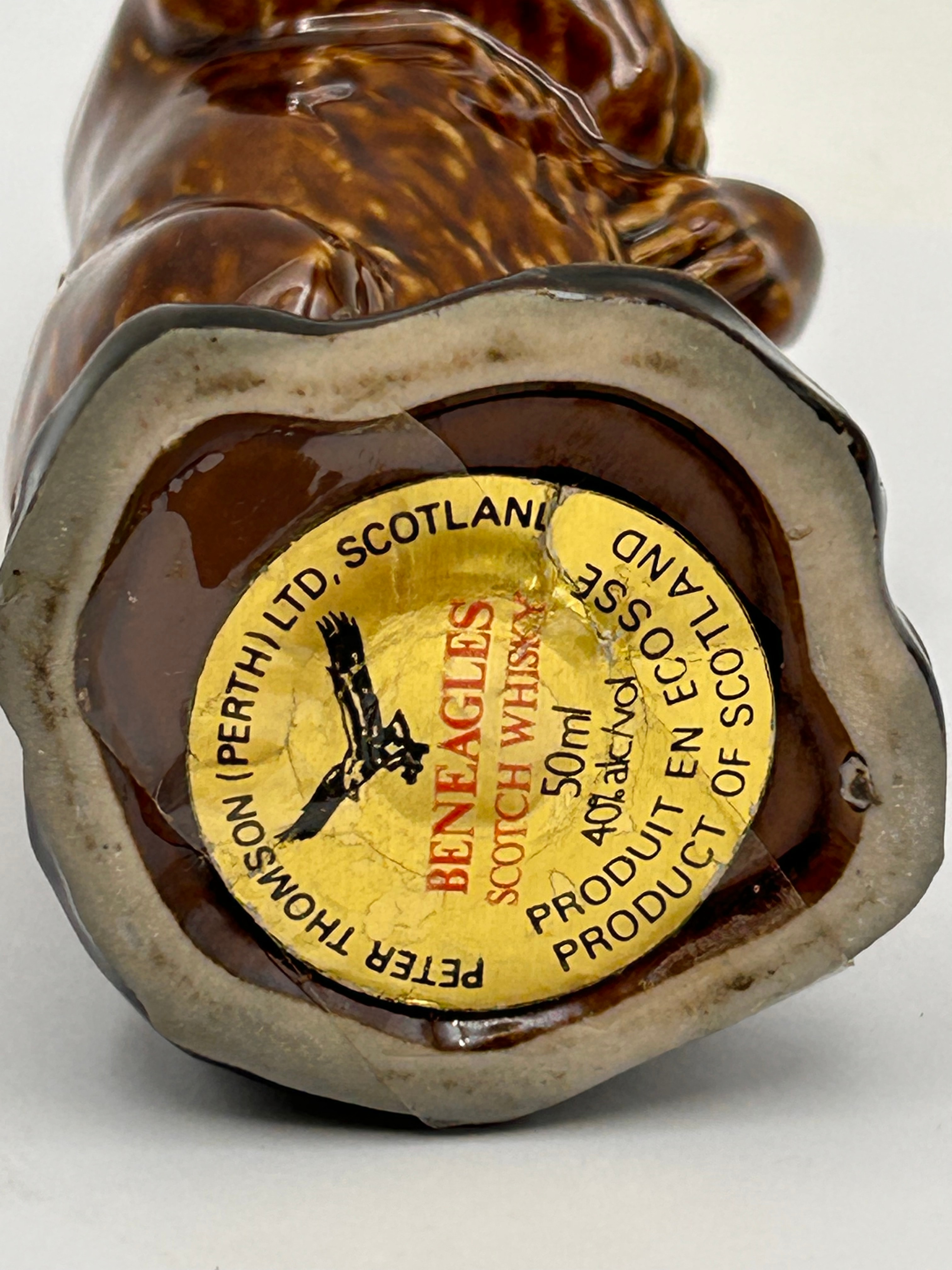 A miniature ceramic decanter, sculpted in the realistic style of a standing bear with textured fur, resting on a naturalistic base. This decanter was produced by Wade for Beneagles Scotch Whisky, specifically the ‘Grizzly Bear’ model, circa 1981-1985. The base features a partially torn yellow paper label which identifies the item as containing “BENEAGLES SCOTCH WHISKY,” 50ml at 40% vol, distributed by “PETER THOMSON (PERTH) LTD. SCOTLAND.” The label also specifies “PRODUCT OF SCOTLAND” and “PRODUIT EN ECOSSE.”