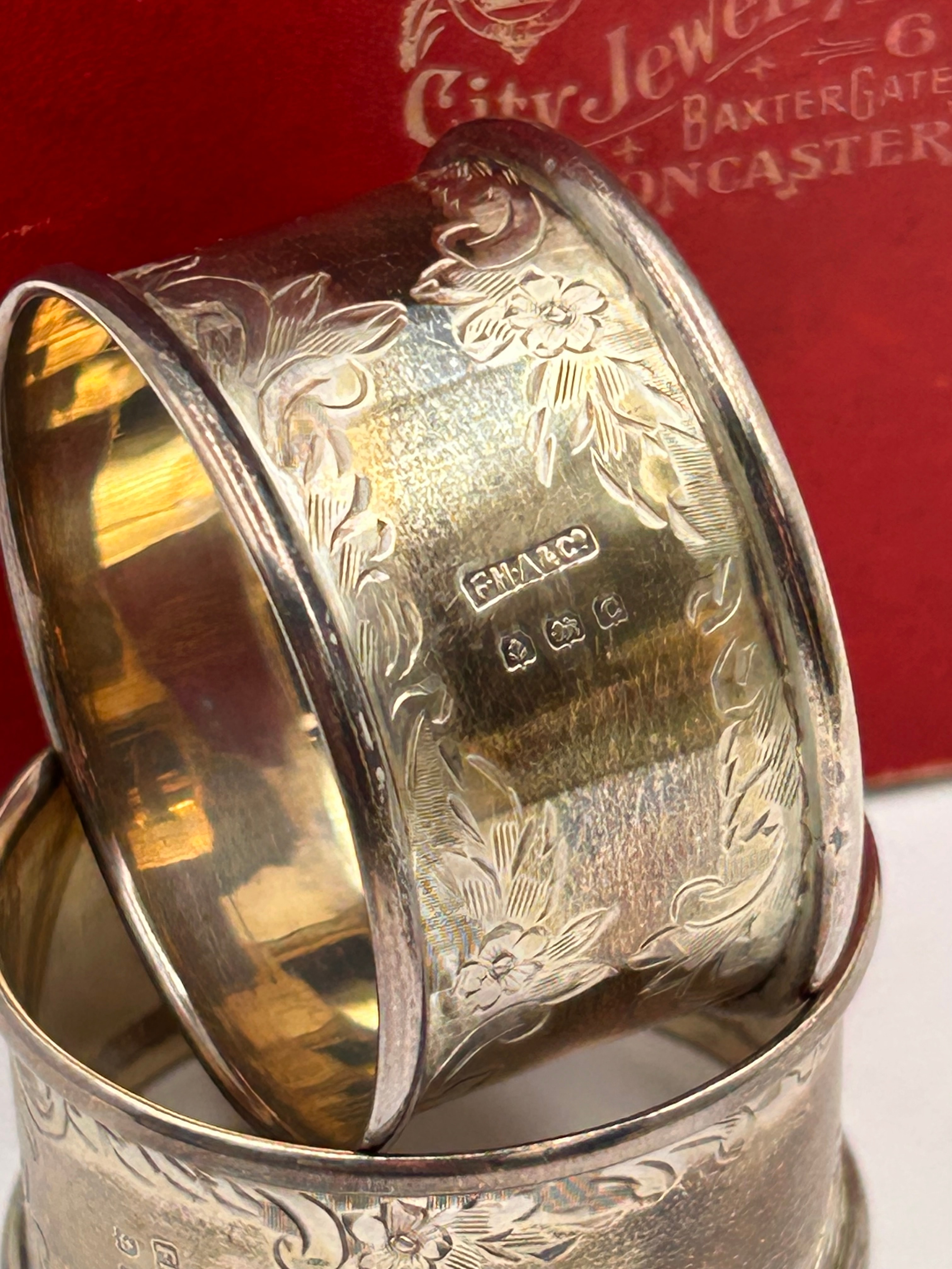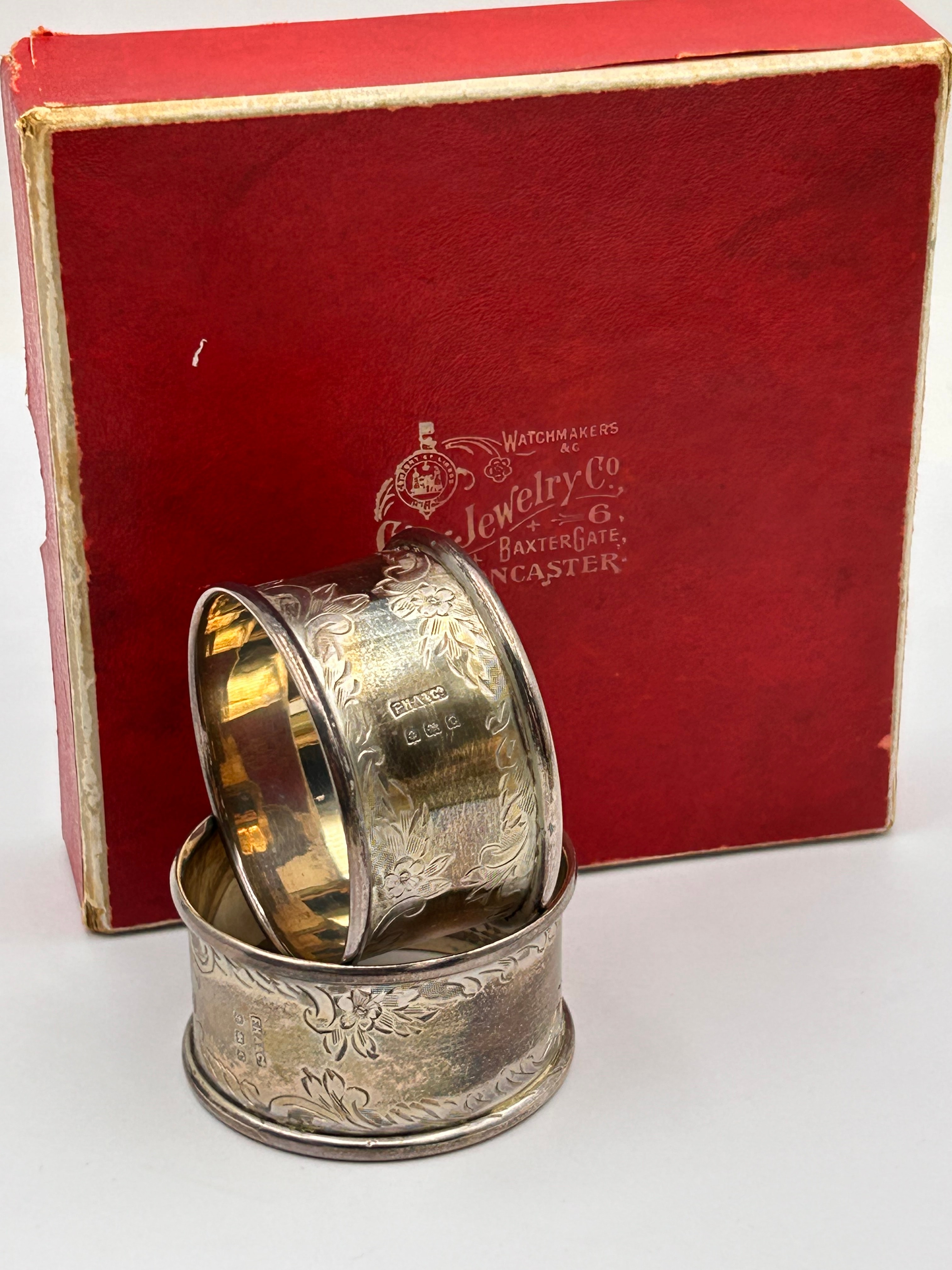 A cased pair of silver napkin rings by F.H & Co. Each cylindrical napkin ring is intricately engraved with floral and foliate motifs. They bear stamped markings including directly above “F.H & Co”, a lion passant, an anchor (Birmingham assay office mark), and the date letter ‘G’. The rings are presented in a rectangular, red, paper-covered box. The box lid features an embossed crest and text, identifying the retailer as “WATCHMAKERS & JEWELRY CO., 6, BAXTERGATE, LANCASTER.”