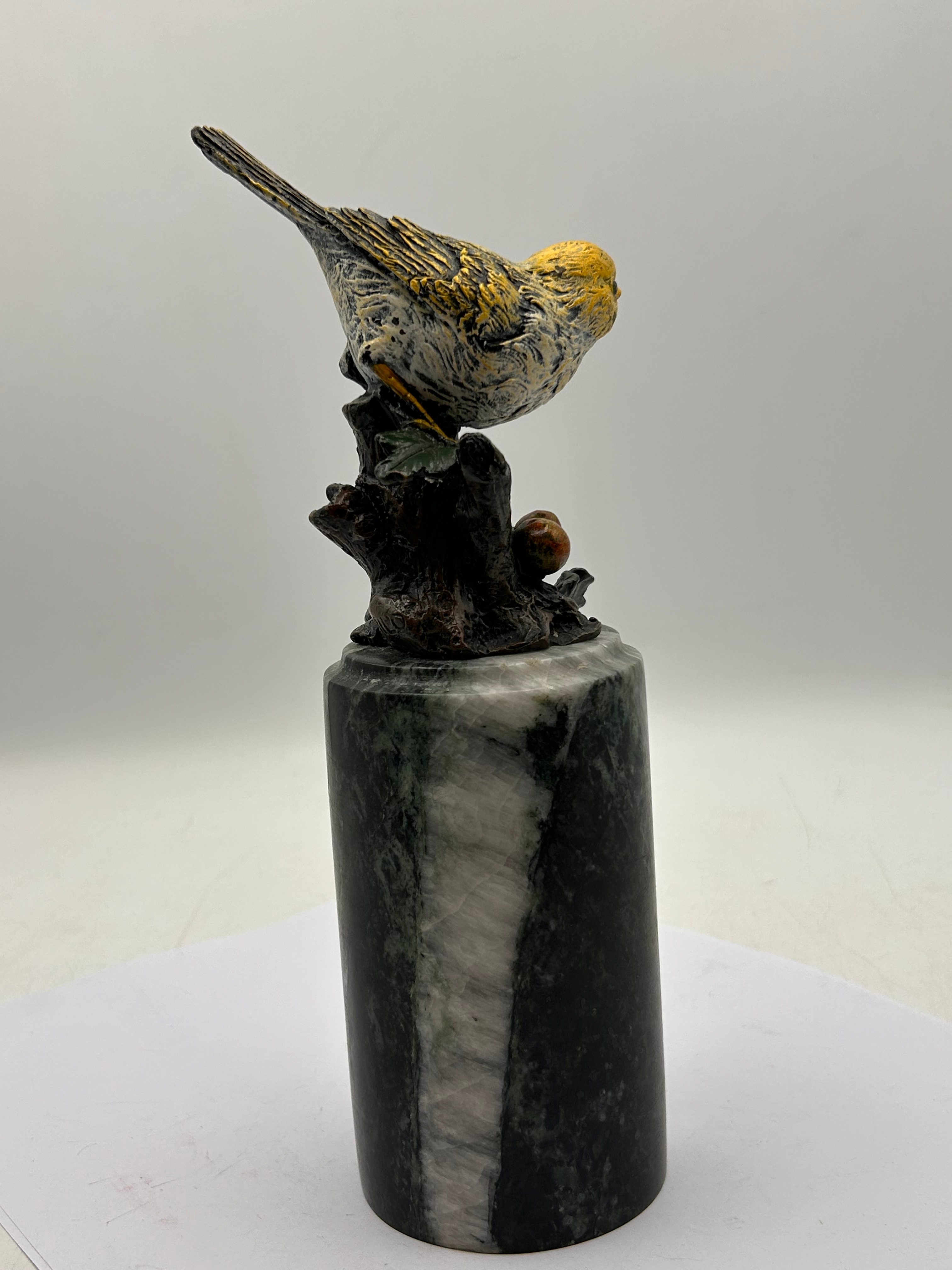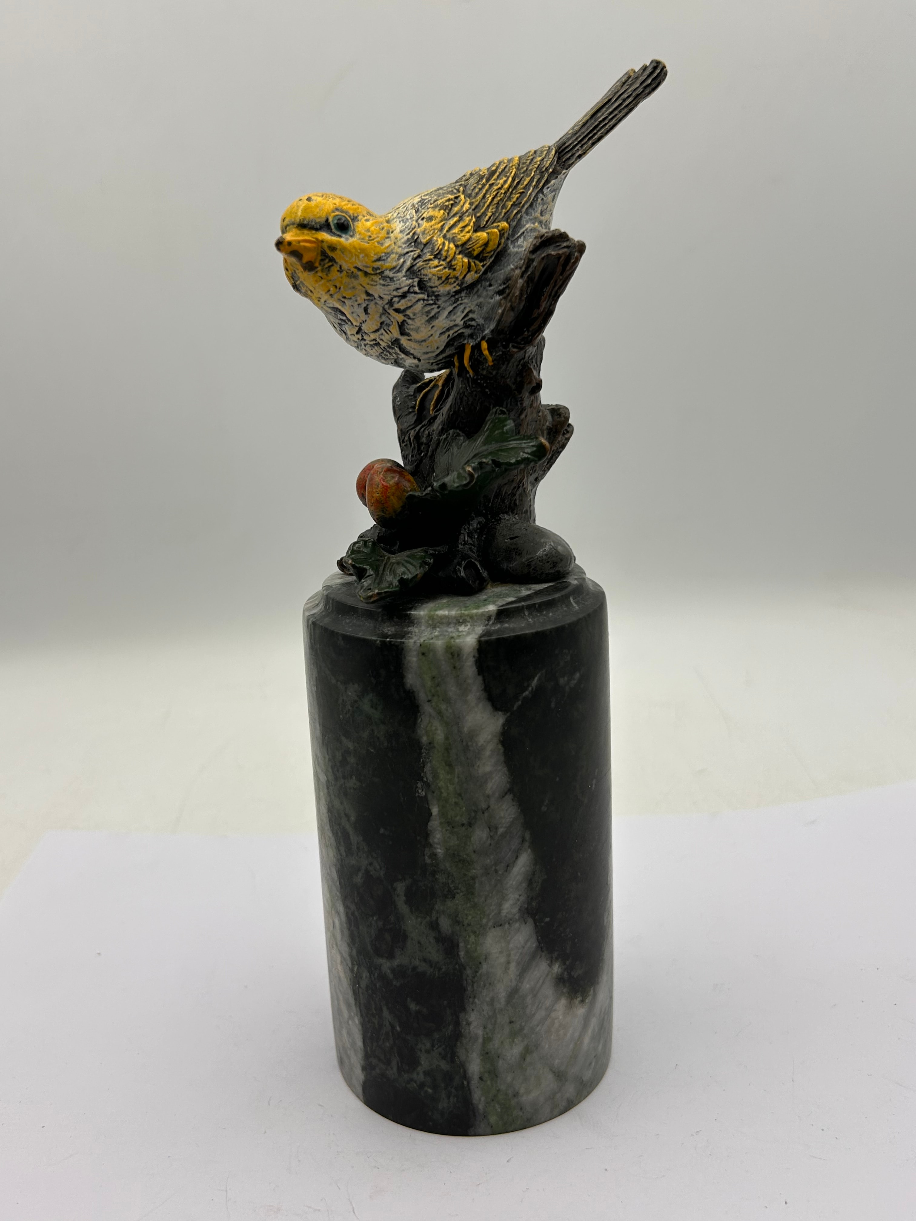 A decorative sculpture featuring a naturalistically rendered songbird perched on a small branch with foliage and a single red berry, affixed to a cylindrical polished stone base. The bird and branch element is cast metal, finished with patination and painted details primarily in shades of yellow, grey, and dark brown. The substantial base is crafted from variegated dark green marble or a similar polished stone, exhibiting prominent white and grey veining. No visible text, signatures, or maker’s marks are discernible.