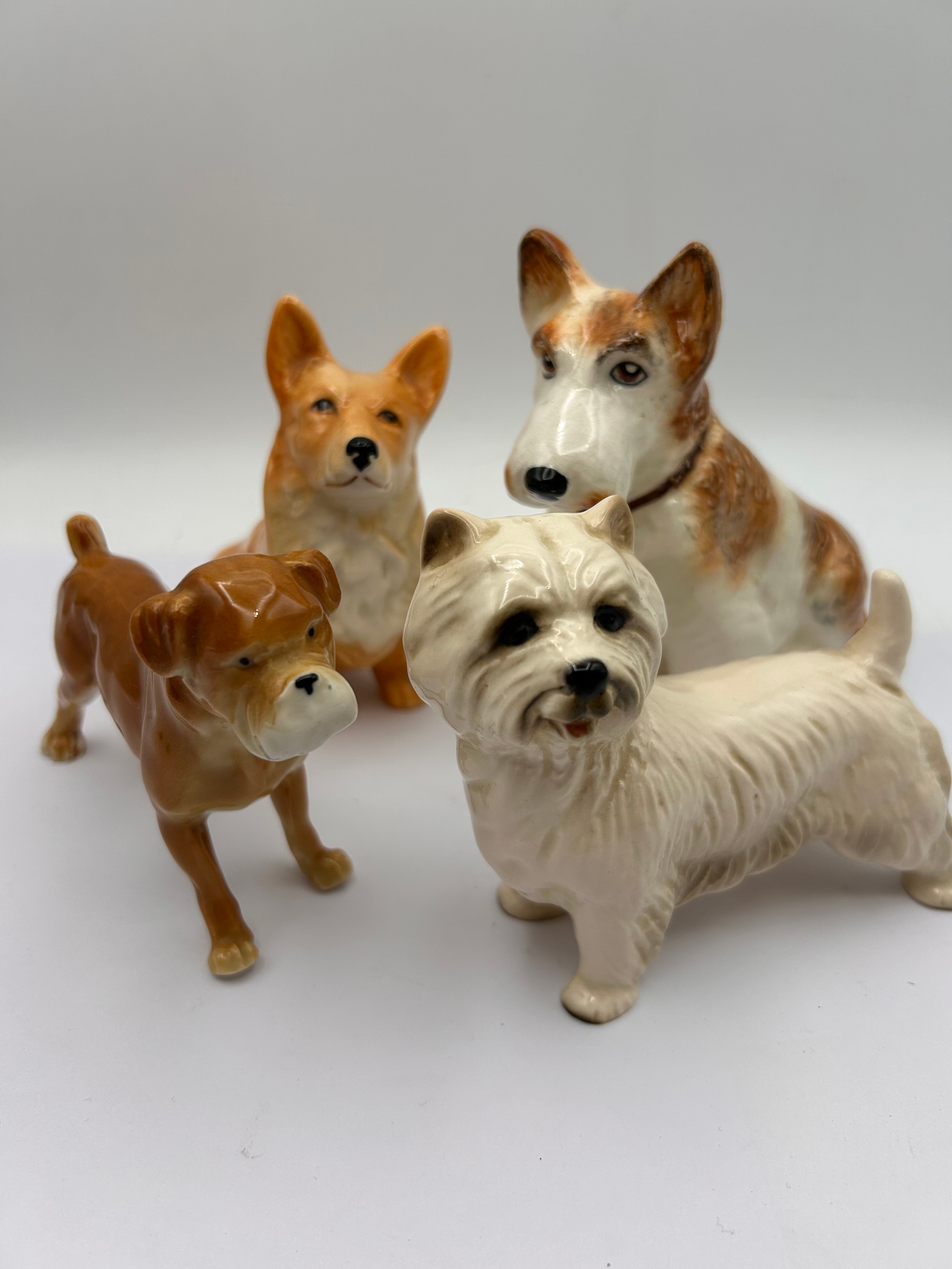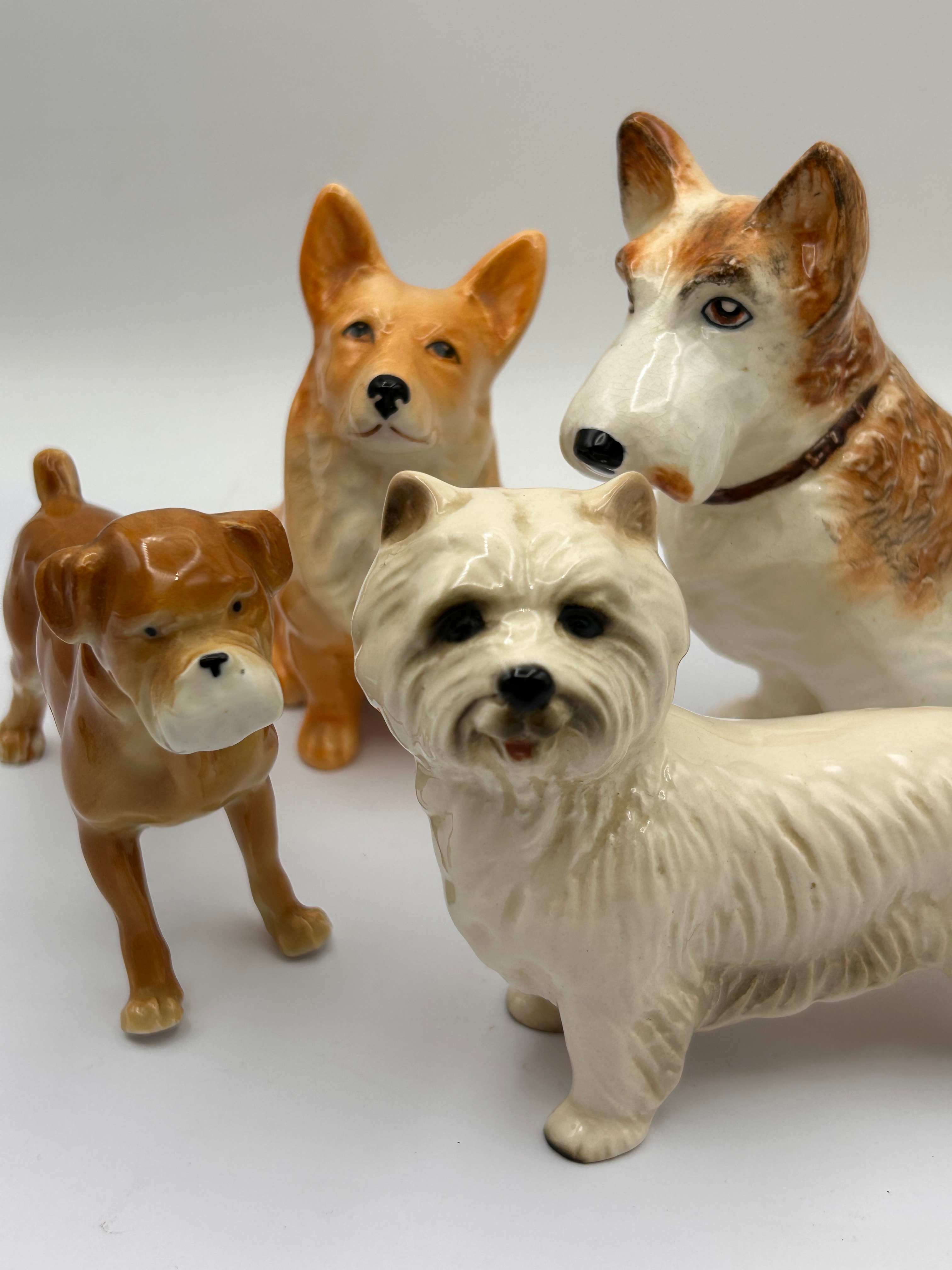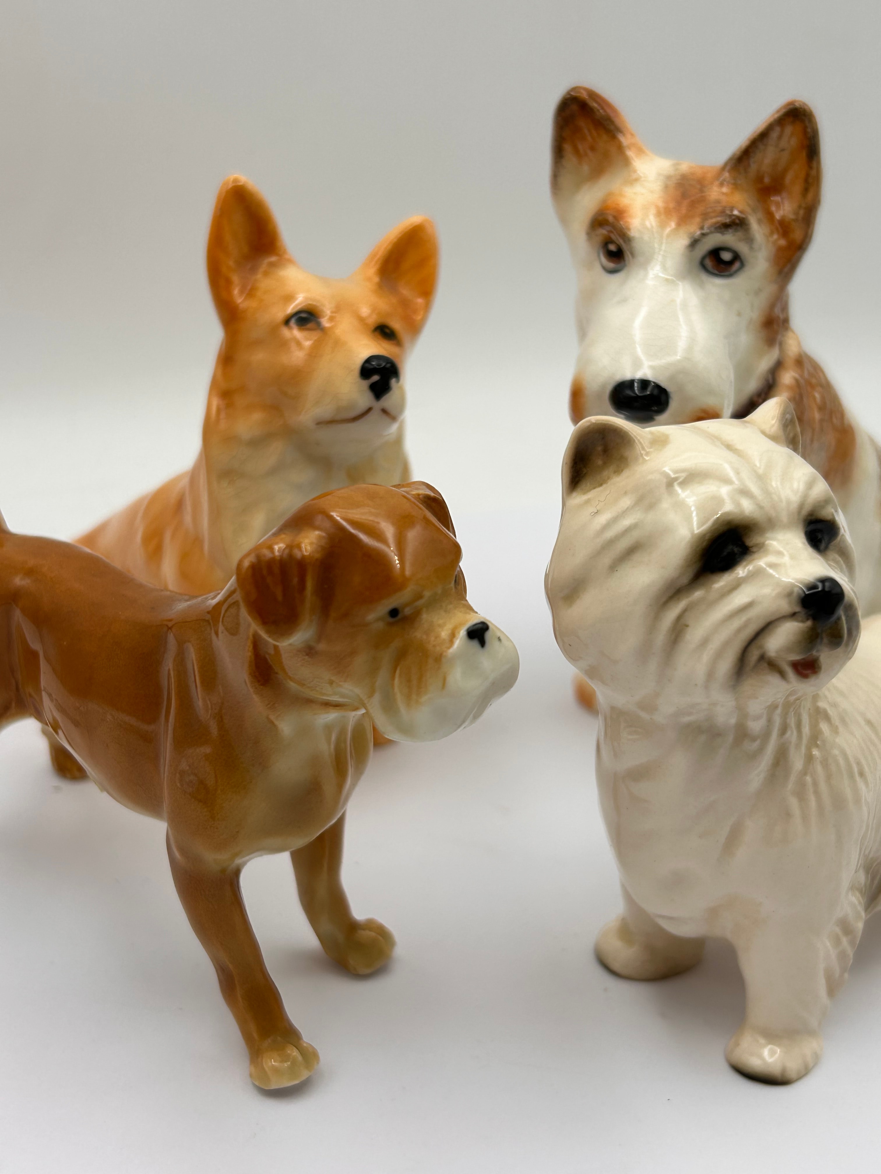 A group of four glazed ceramic or porcelain dog figurines, each depicting a different breed with naturalistic yet stylized features and a glossy finish. The collection includes a white, shaggy-haired terrier-type dog (likely a Westie), a brown Boxer-type dog, a tan-orange Corgi-type dog, and a brown and white terrier-type dog. No manufacturer marks, signatures, or specific period indicators are visible.