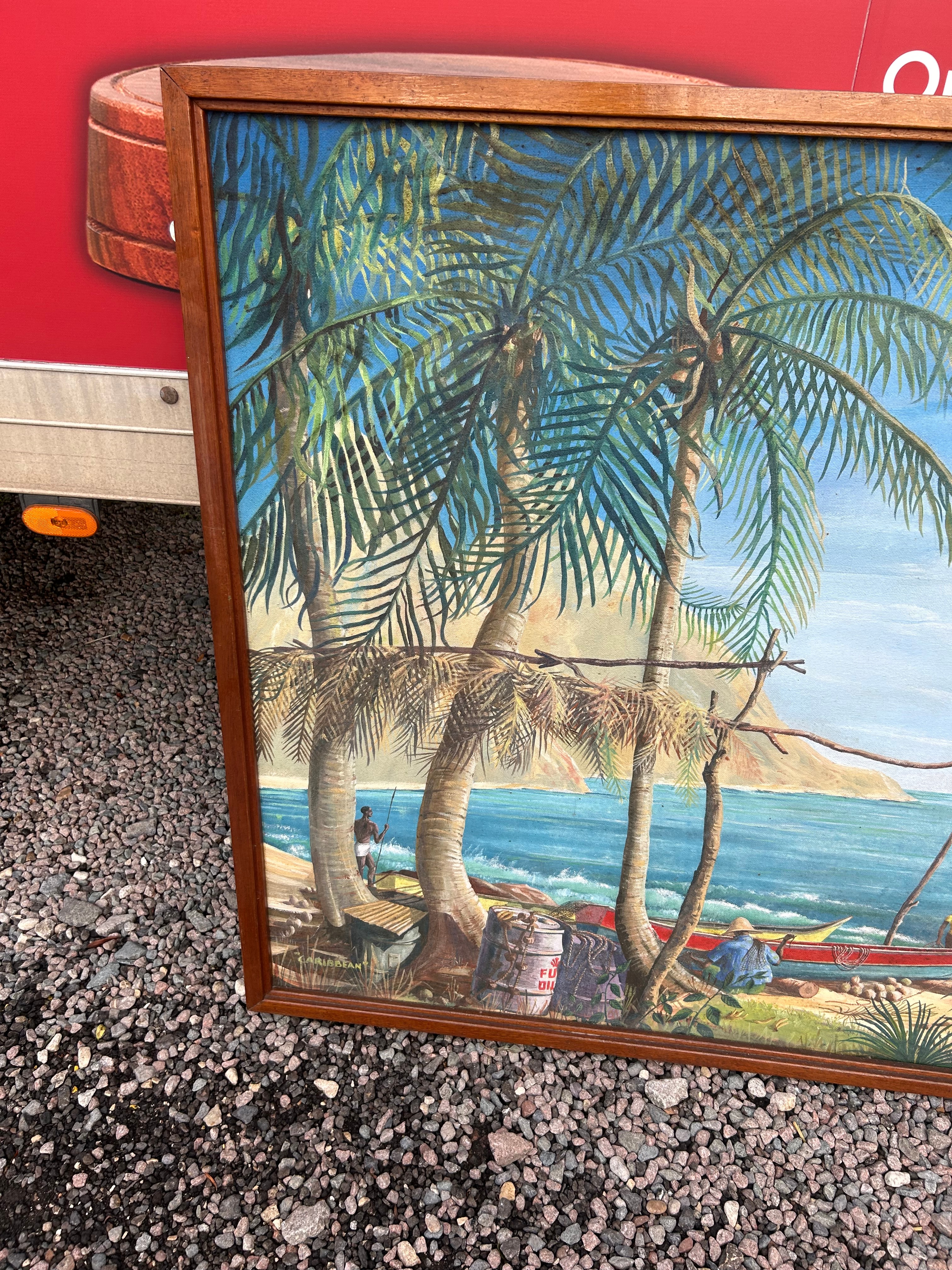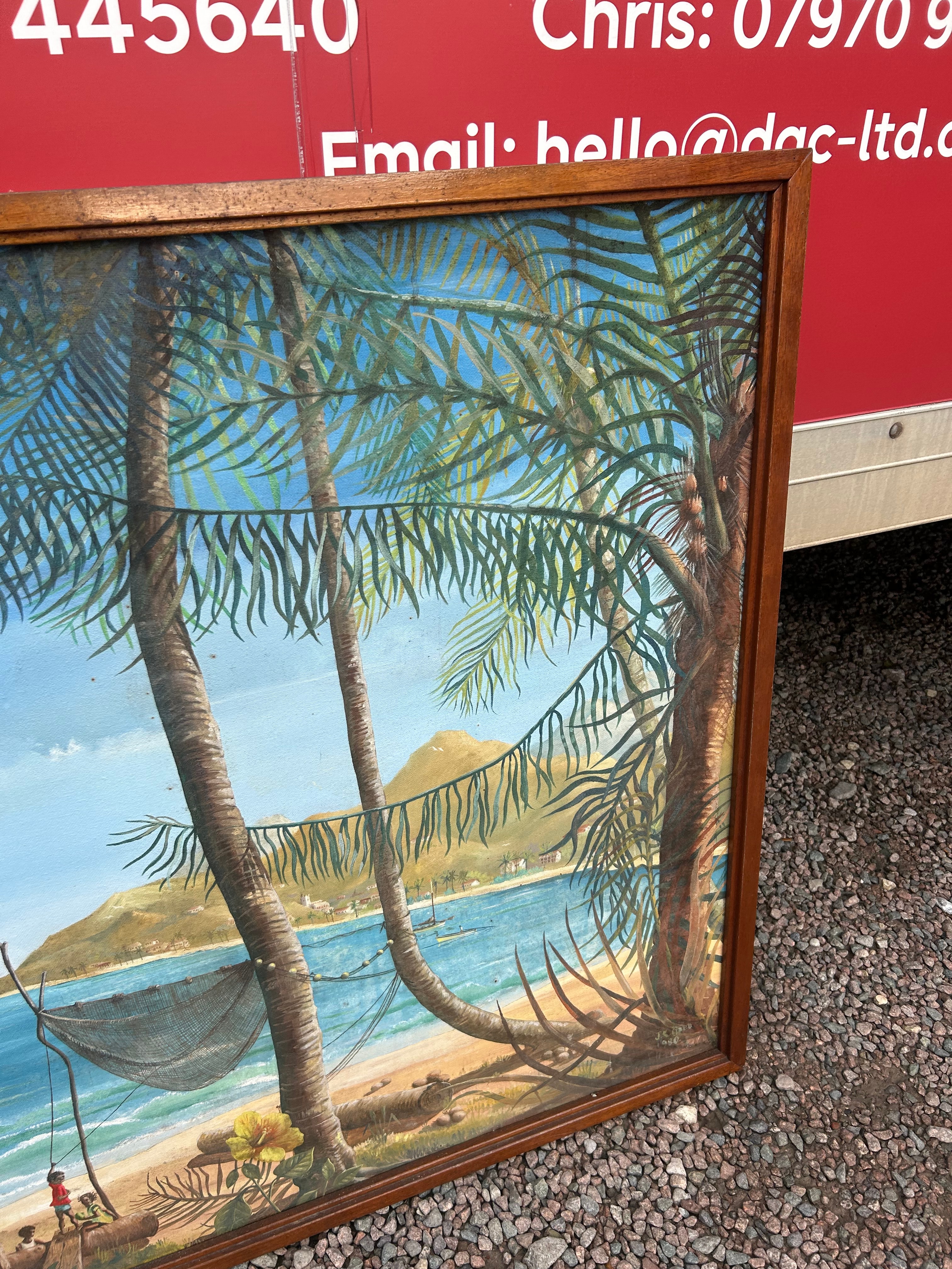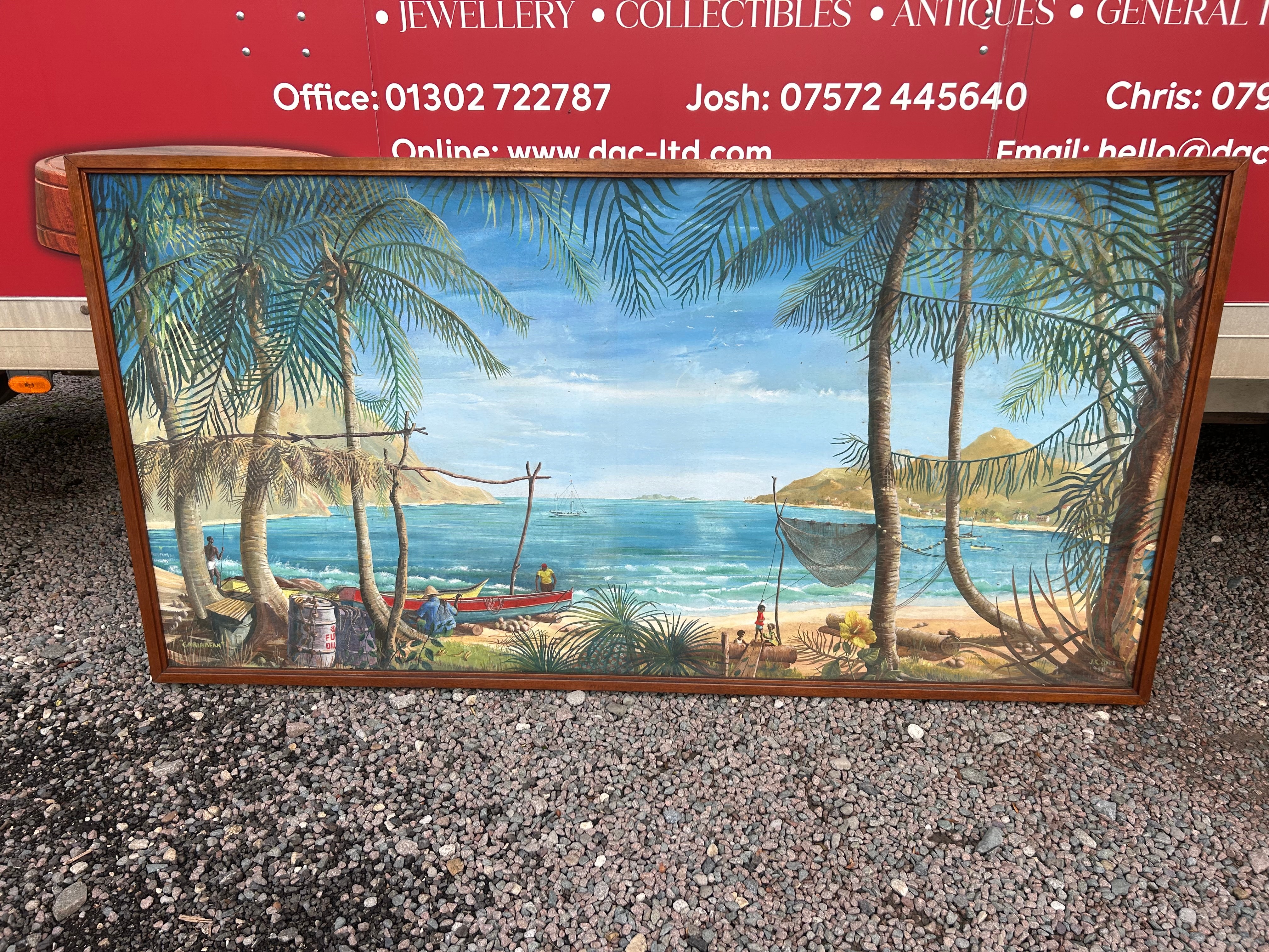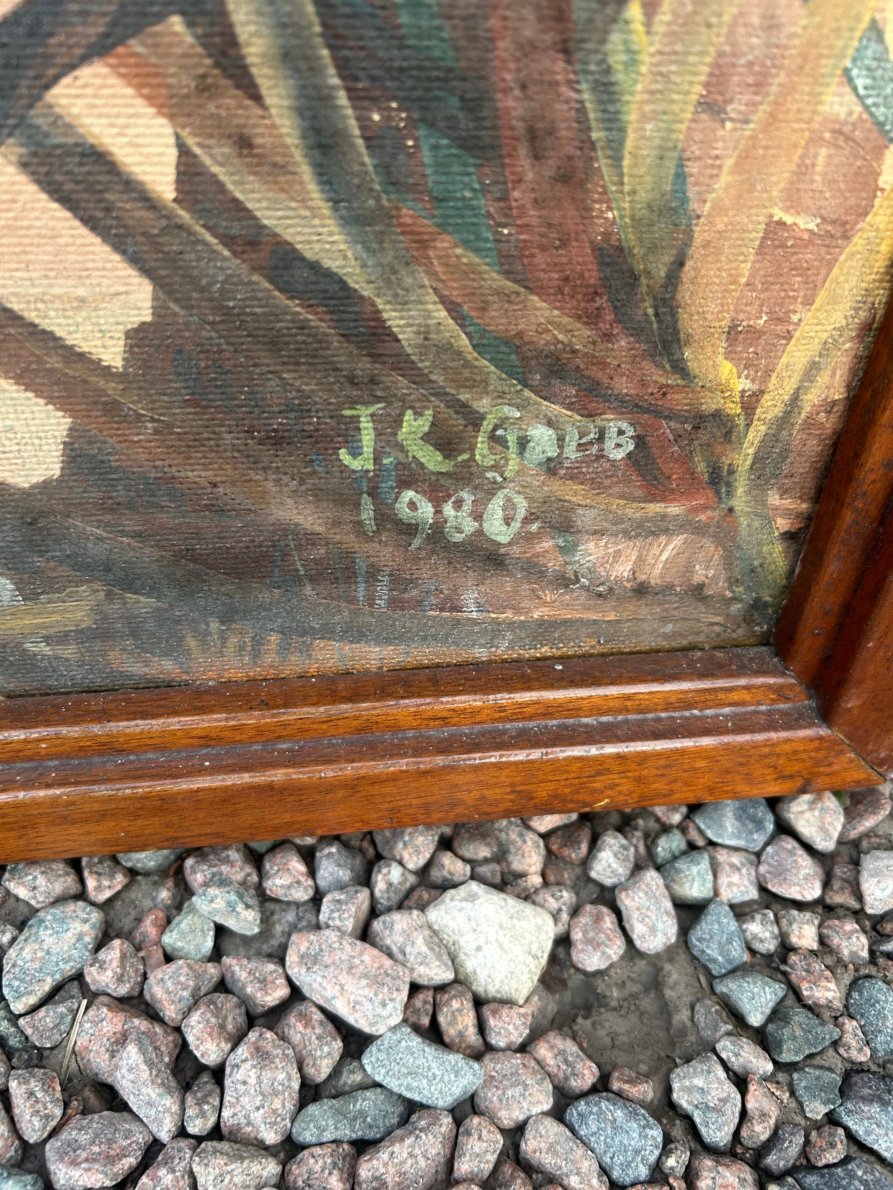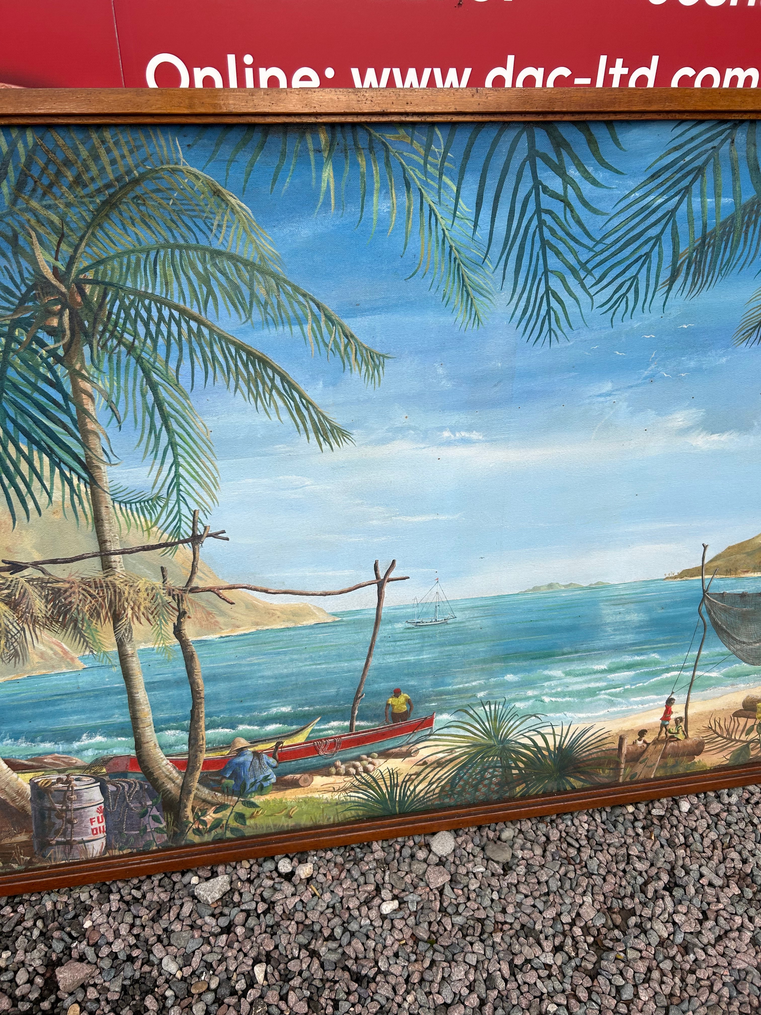 A painting by J.R. Gabb, dated 1980, executed in a representational style, depicting a vibrant tropical beach scene. The composition features prominent palm trees, a calm blue bay with small boats and distant islands, and various figures engaged in shore activities, including a barrel marked "FU OIL." The artwork, likely acrylic on canvas, is signed "J.R. Gabb" and dated "1980" in the lower left corner. It is presented within a simple wooden frame.