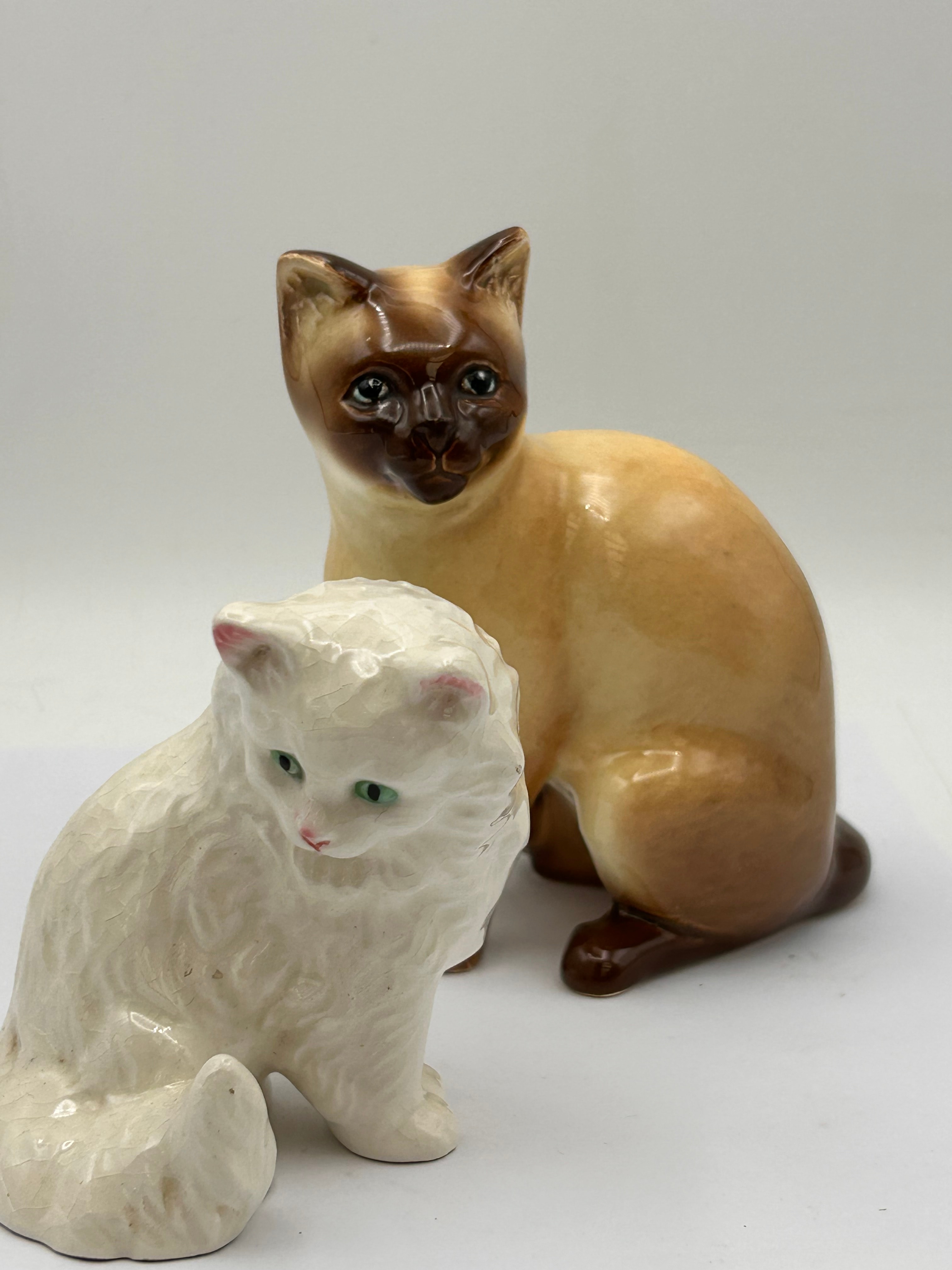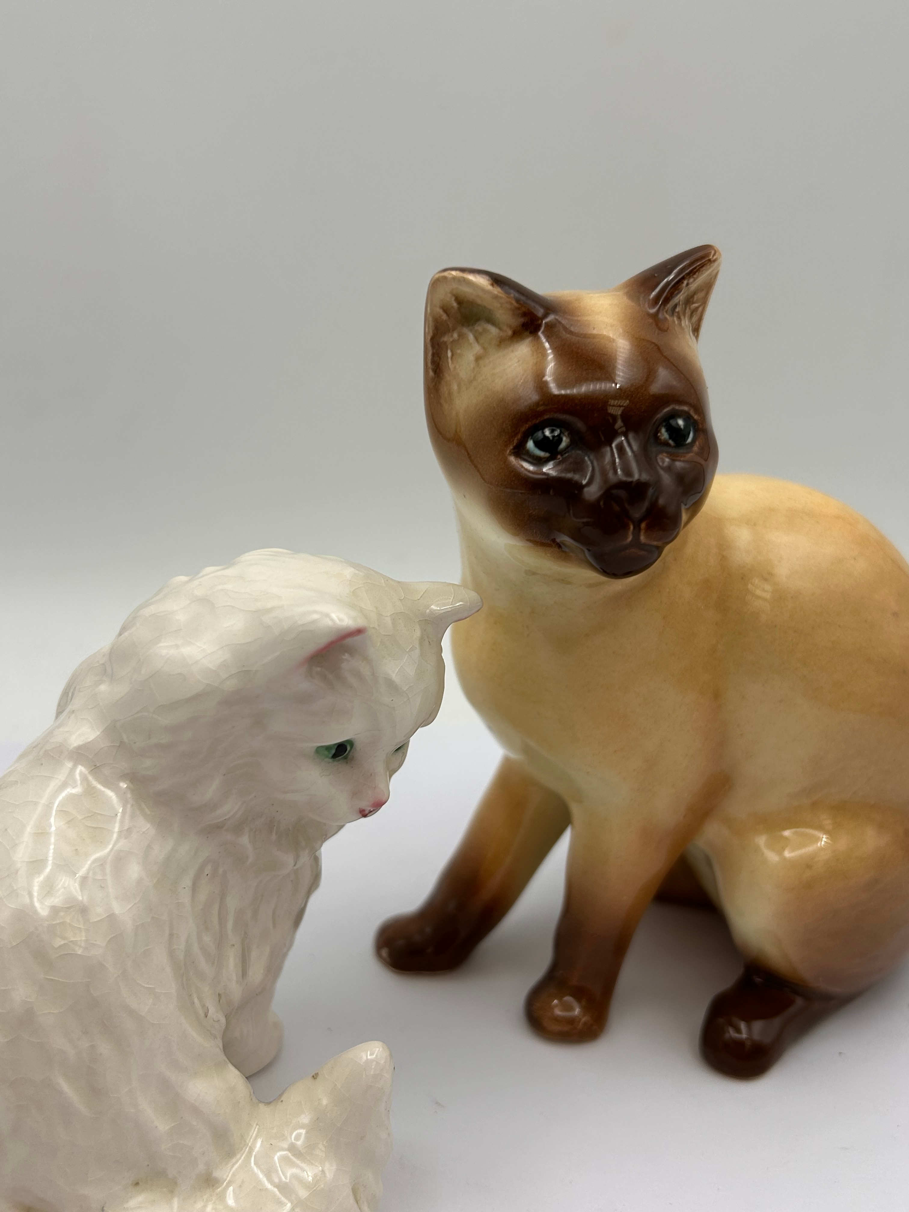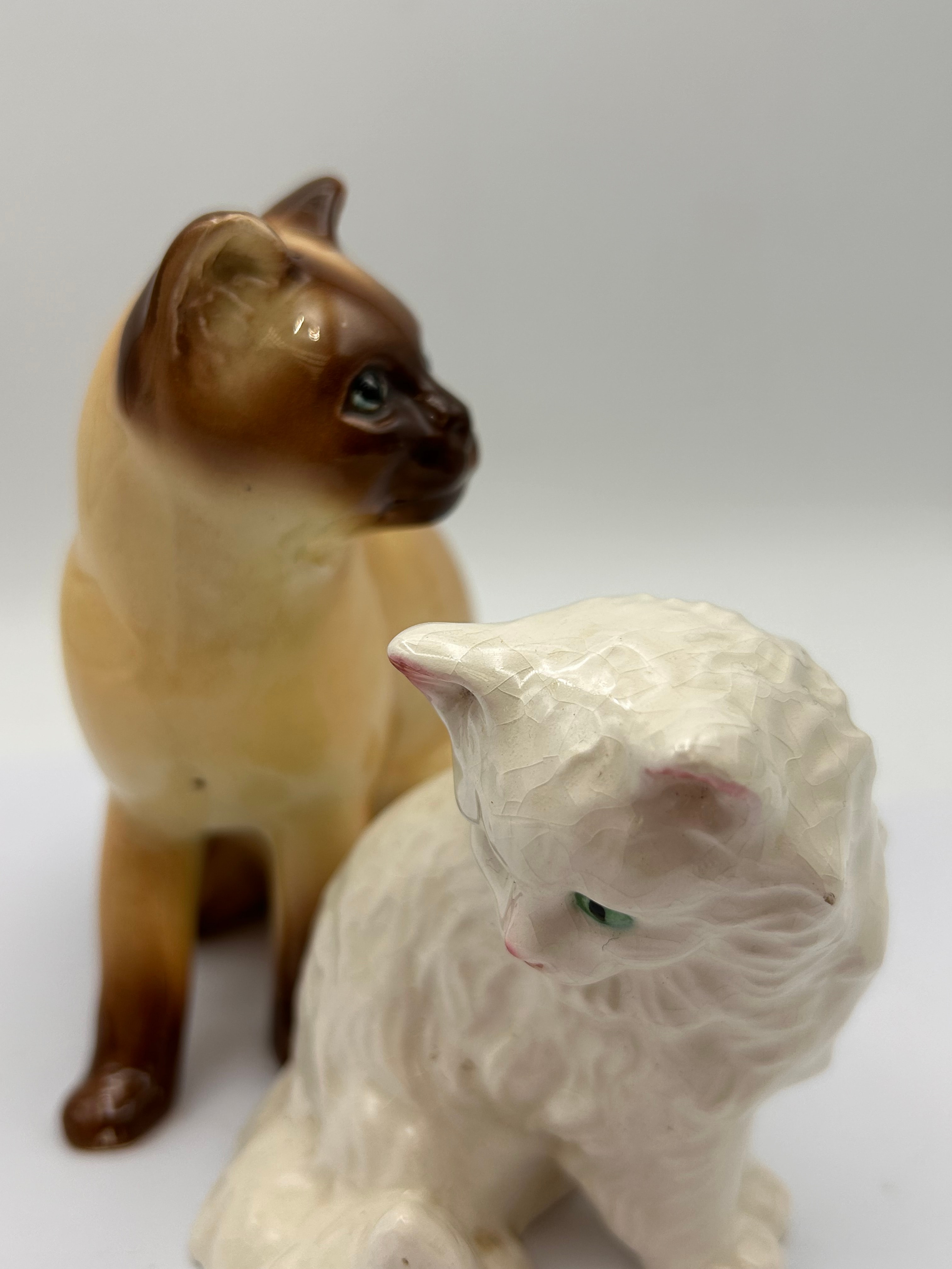 A pair of Sylvac ceramic cat figurines. The pair comprises a long-haired cat, possibly a Persian, in an off-white color with a distinct crackle glaze, accented with subtle pink ear tips and green eyes. Positioned behind it is a glossy, tan-bodied figurine with dark brown ‘point’ coloring on its face, ears, paws, and tail, characteristic of a Siamese cat, featuring blue eyes. Both figurines exhibit a domestic decor style. No manufacturer’s marks or textual inscriptions are visible.