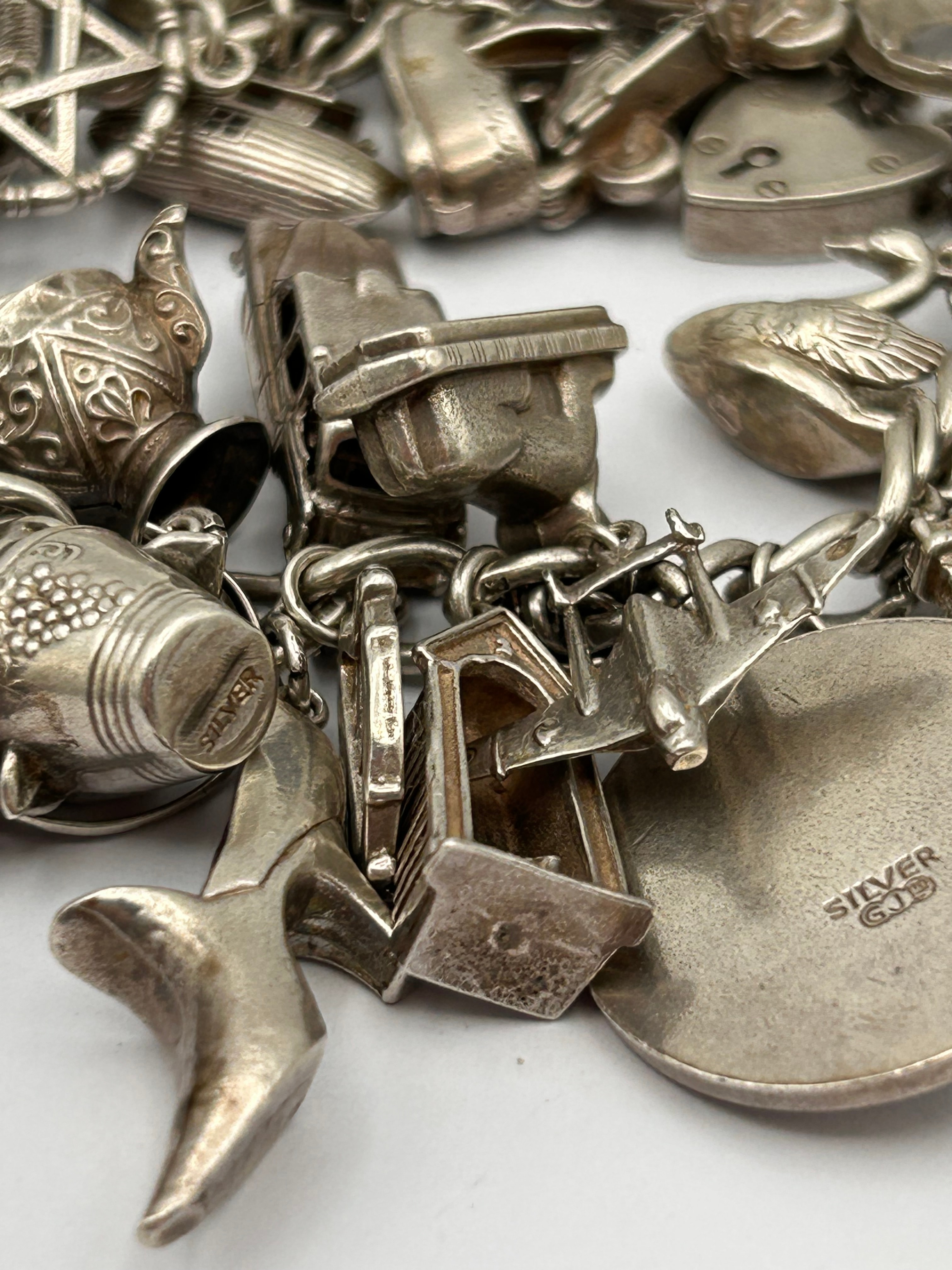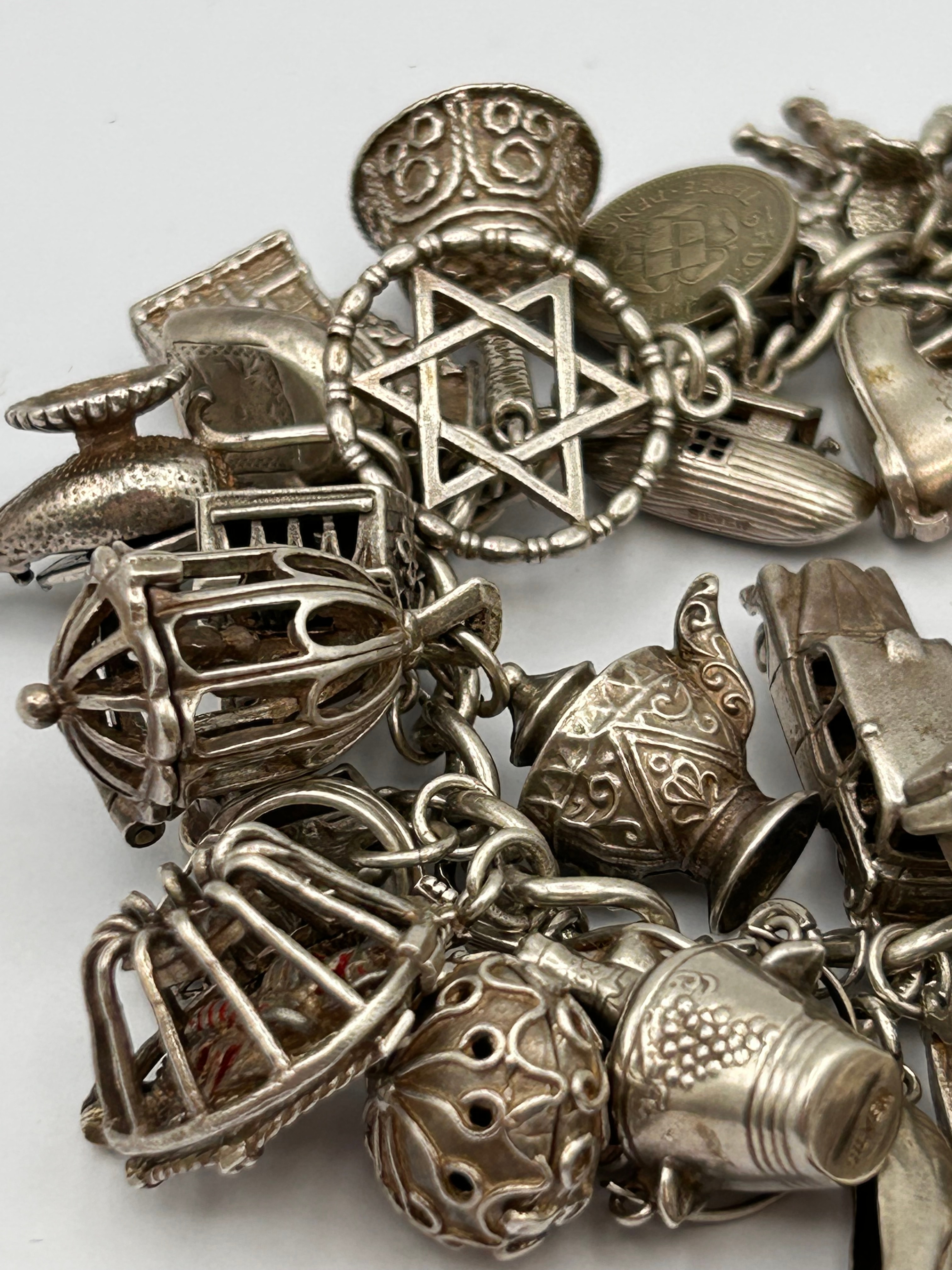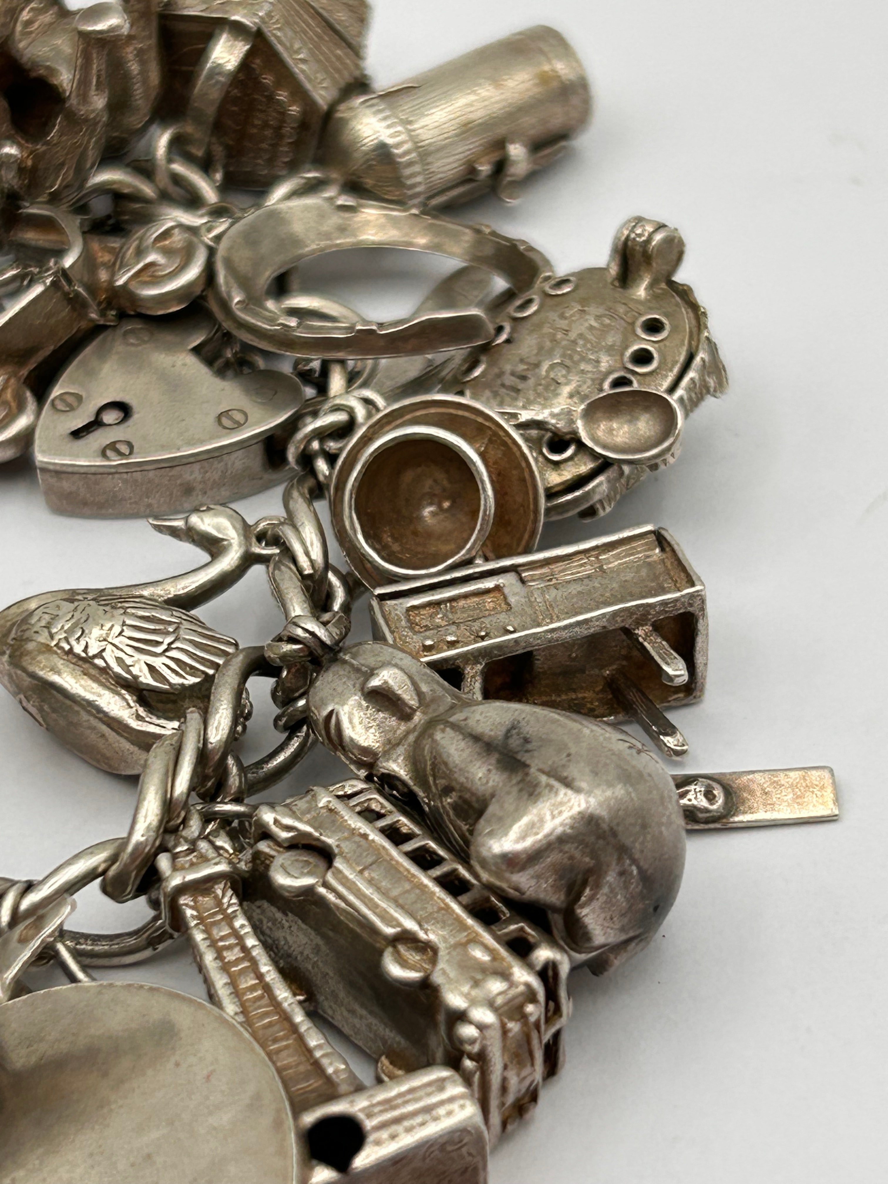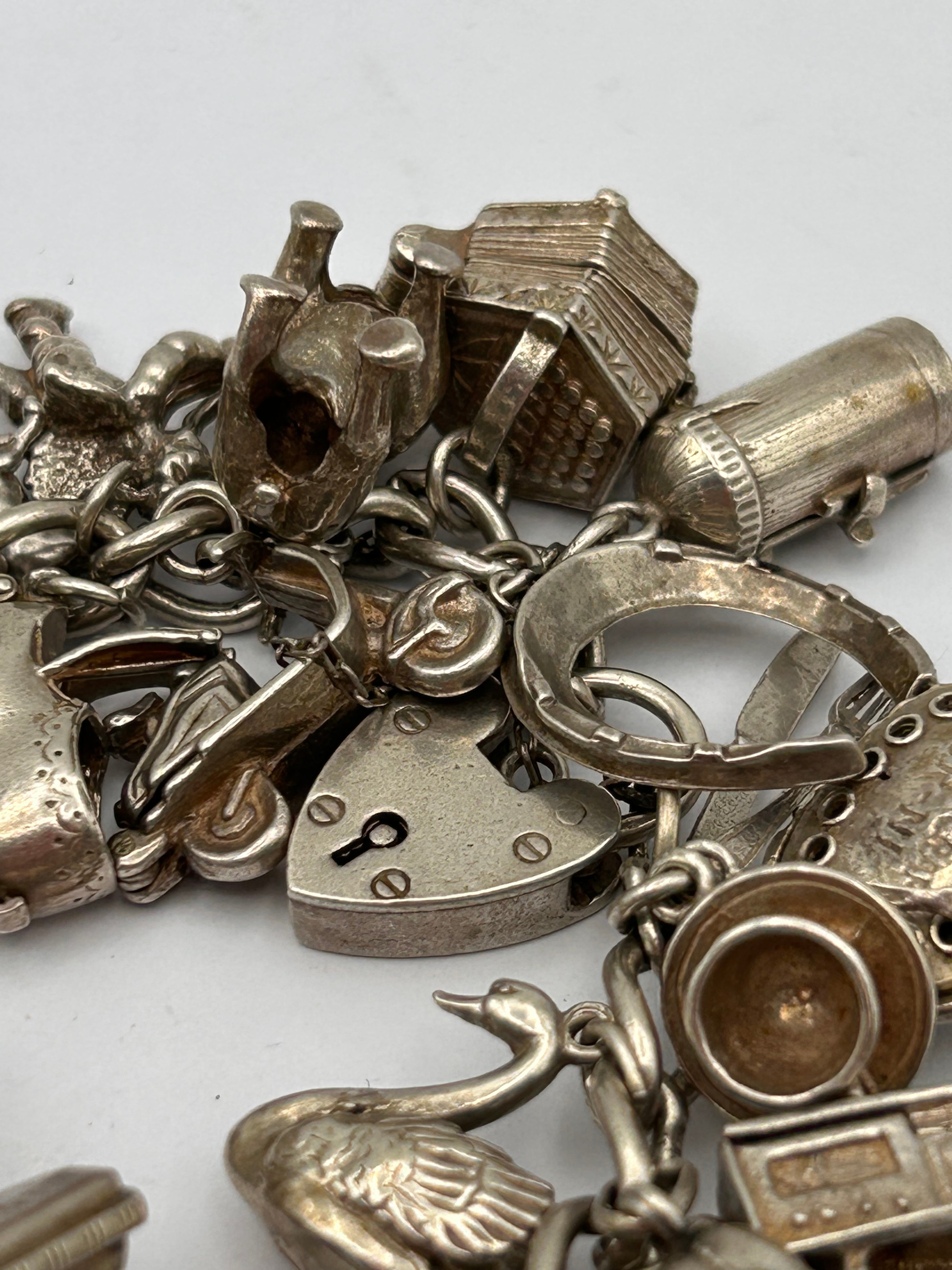 A vintage charm bracelet crafted from Silver, featuring a collection of numerous individual charms attached to a linked chain. The diverse array of miniature three-dimensional charms includes a Star of David, a gramophone, an old-fashioned telephone, various animals (e.g., a swan, pig), modes of transport (e.g., a car, boat, airplane), household items (e.g., a thimble, birdcage, iron), and a heart-shaped padlock. Several charms are explicitly marked "SILVER, " with one circular charm also displaying the maker’s mark "GJD." The style and variety of the charms are consistent with a mid-20th-century period.