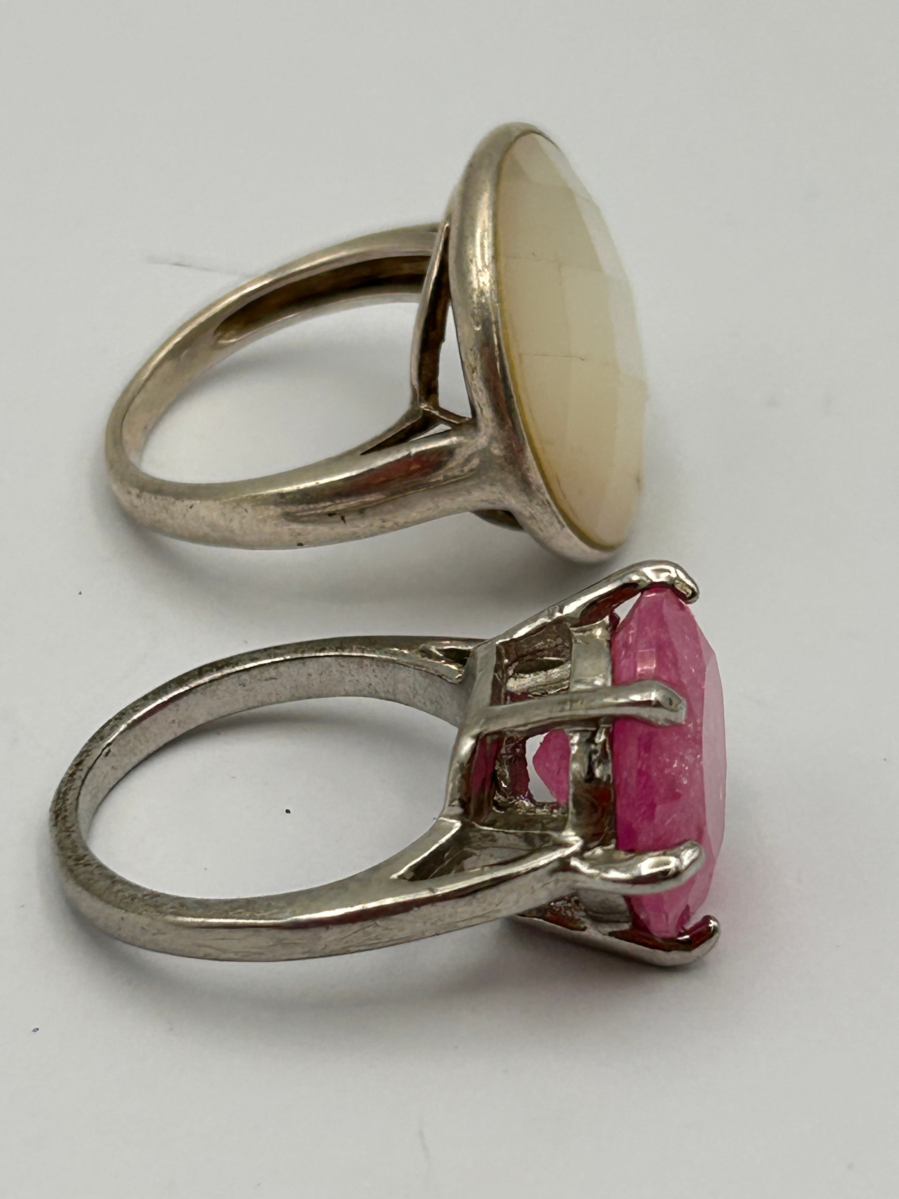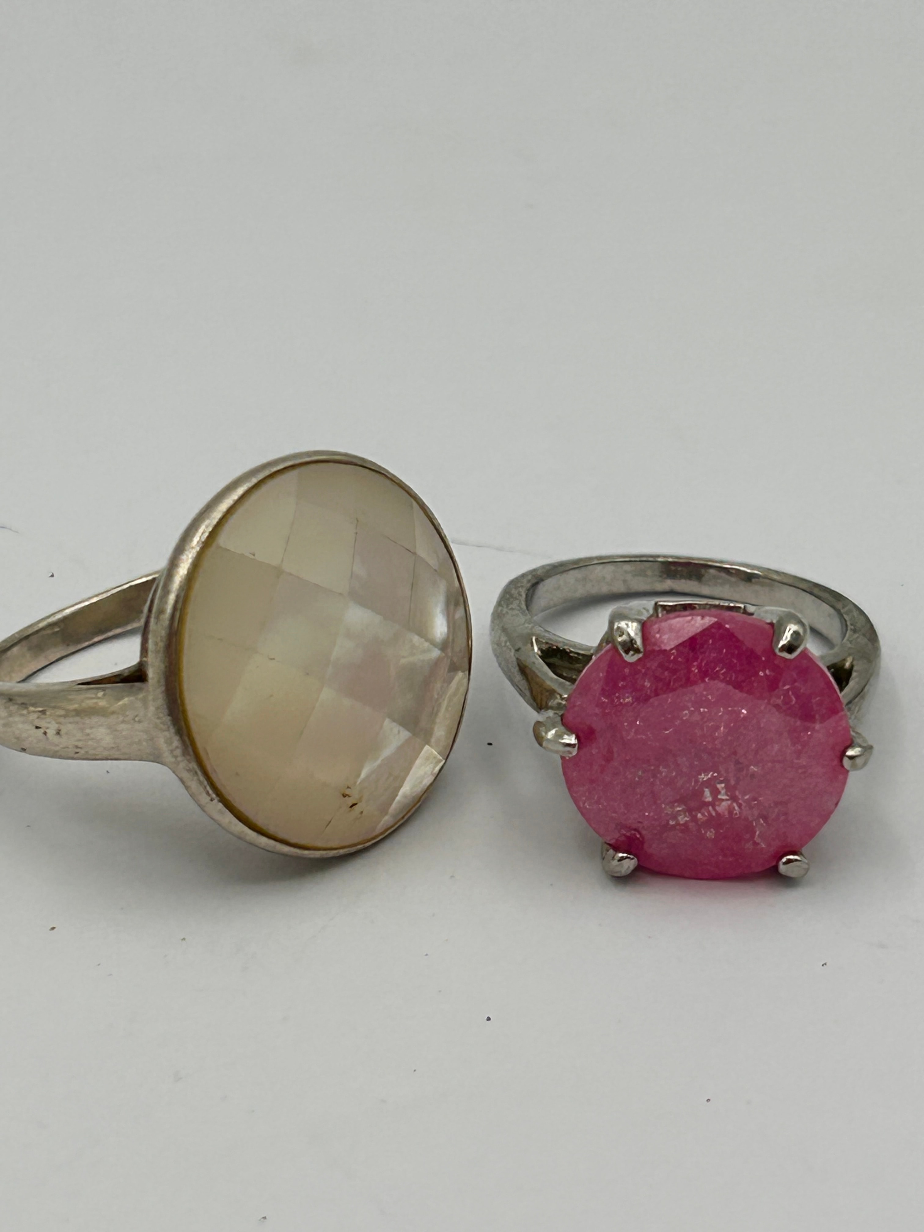 This lot comprises a pair of rings, both crafted from Silver. The first ring features a large, round, faceted, iridescent off-white cabochon, consistent with mother-of-pearl or a similar shell material, set within a simple bezel. The second ring showcases a large, round, faceted, vibrant pink to magenta Rose Quartz stone, secured by six prongs.