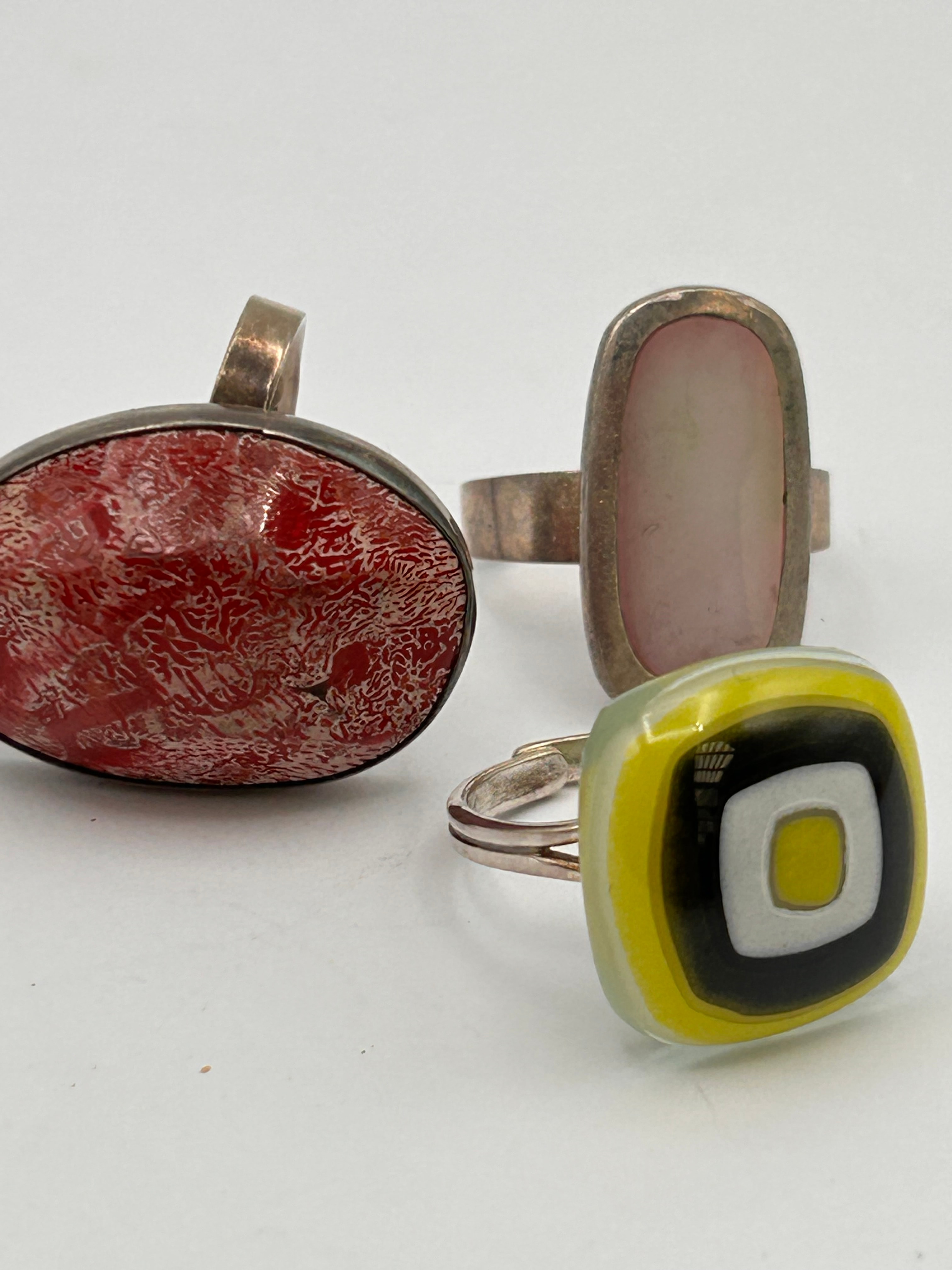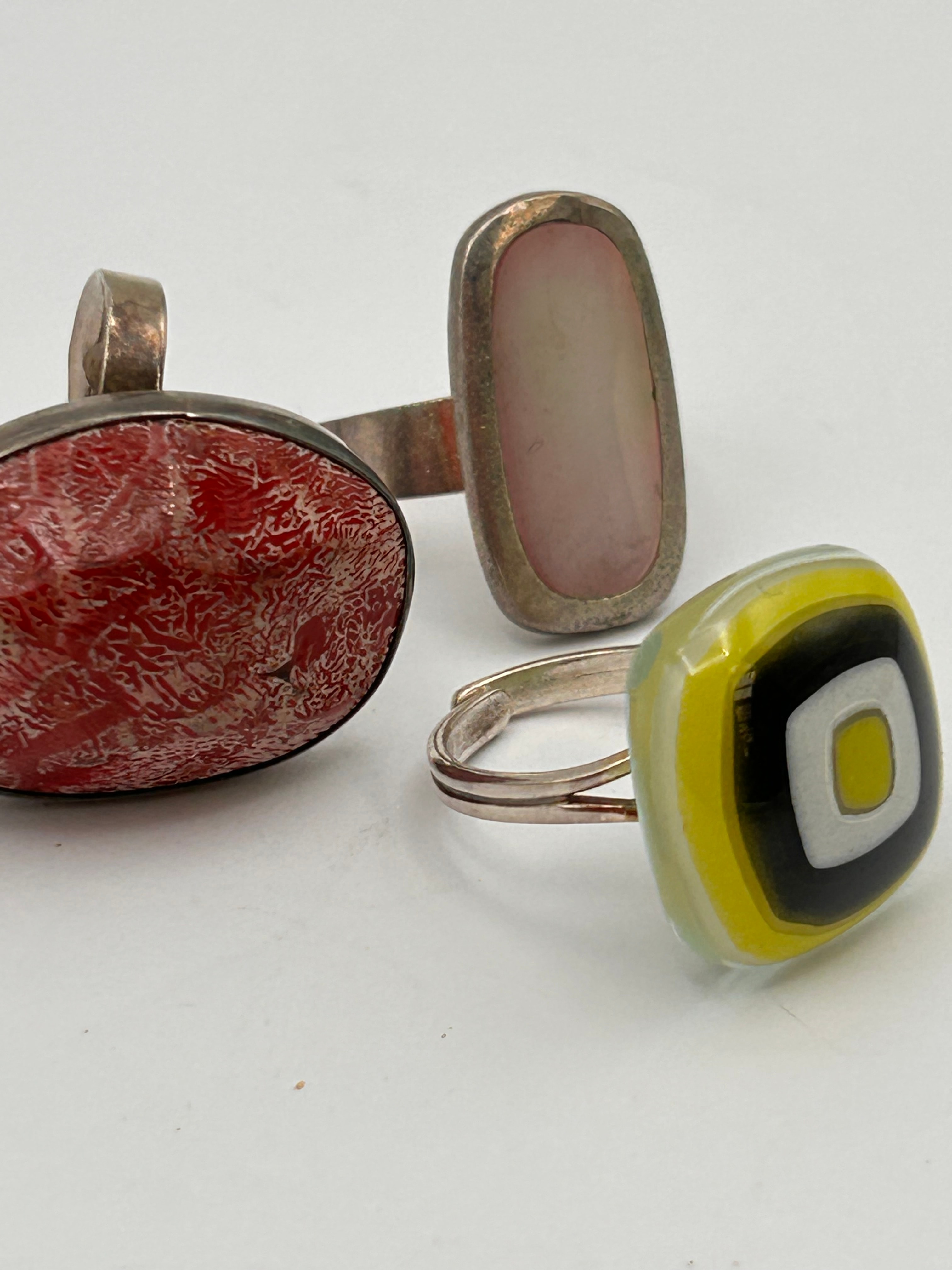A group of three silver rings. The first features an oval bezel-set cabochon of red Fordite displaying a fine white, web-like or dendritic pattern. The second ring presents a rectangular bezel-set cabochon of an opaque pale pink to cream-colored material, possibly mother-of-pearl. The third is a modern-style ring with an adjustable sterling silver band, visibly marked ‘925’, featuring a square fused glass top composed of concentric layers of pale yellow, black, white, and a central yellow square.