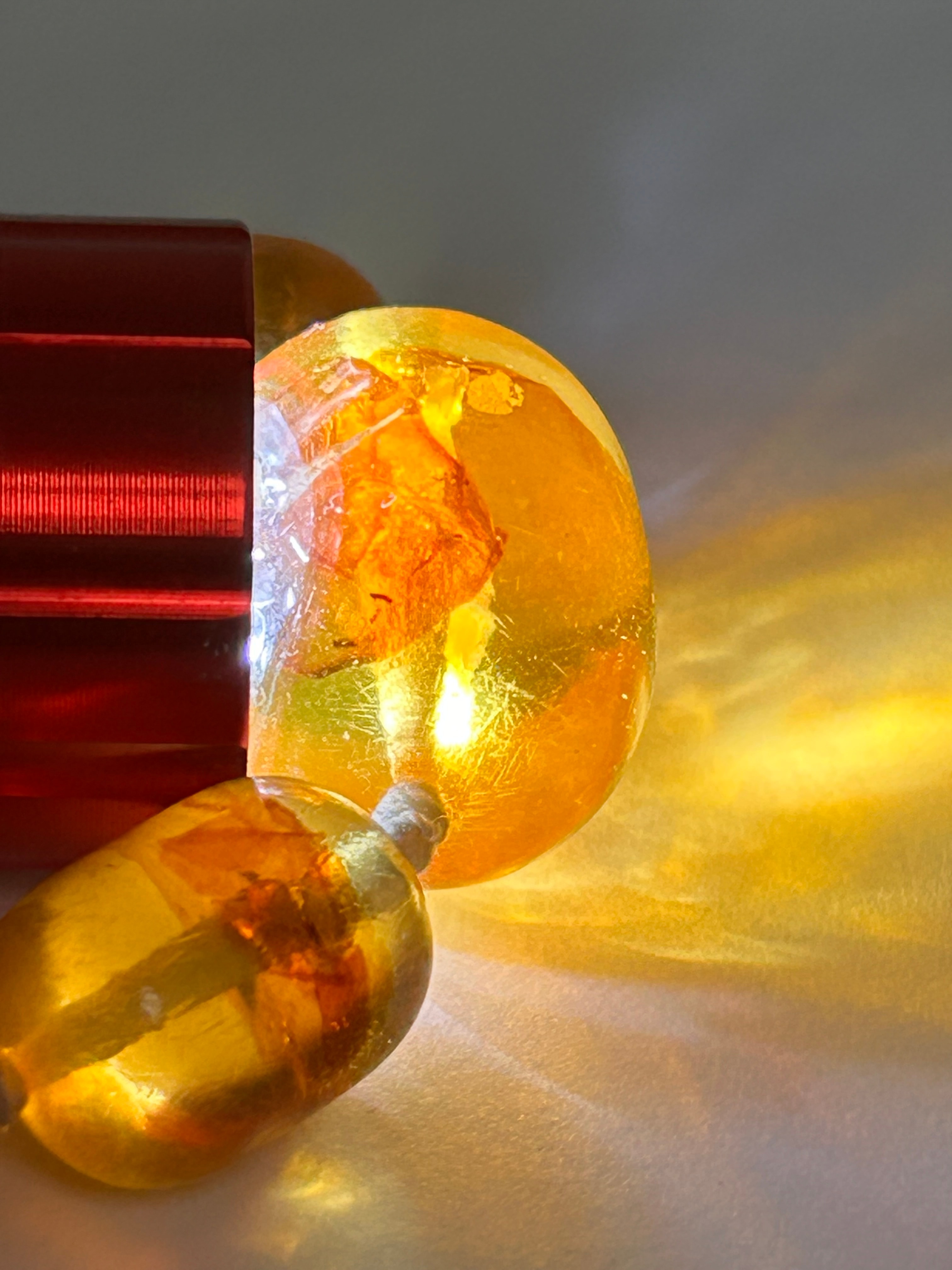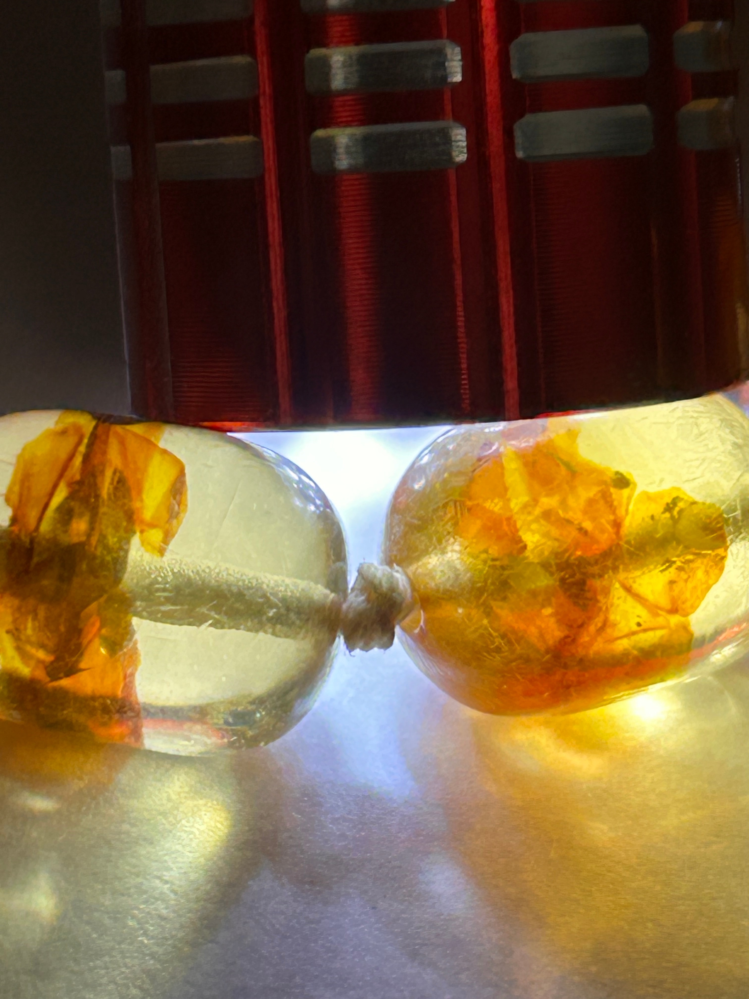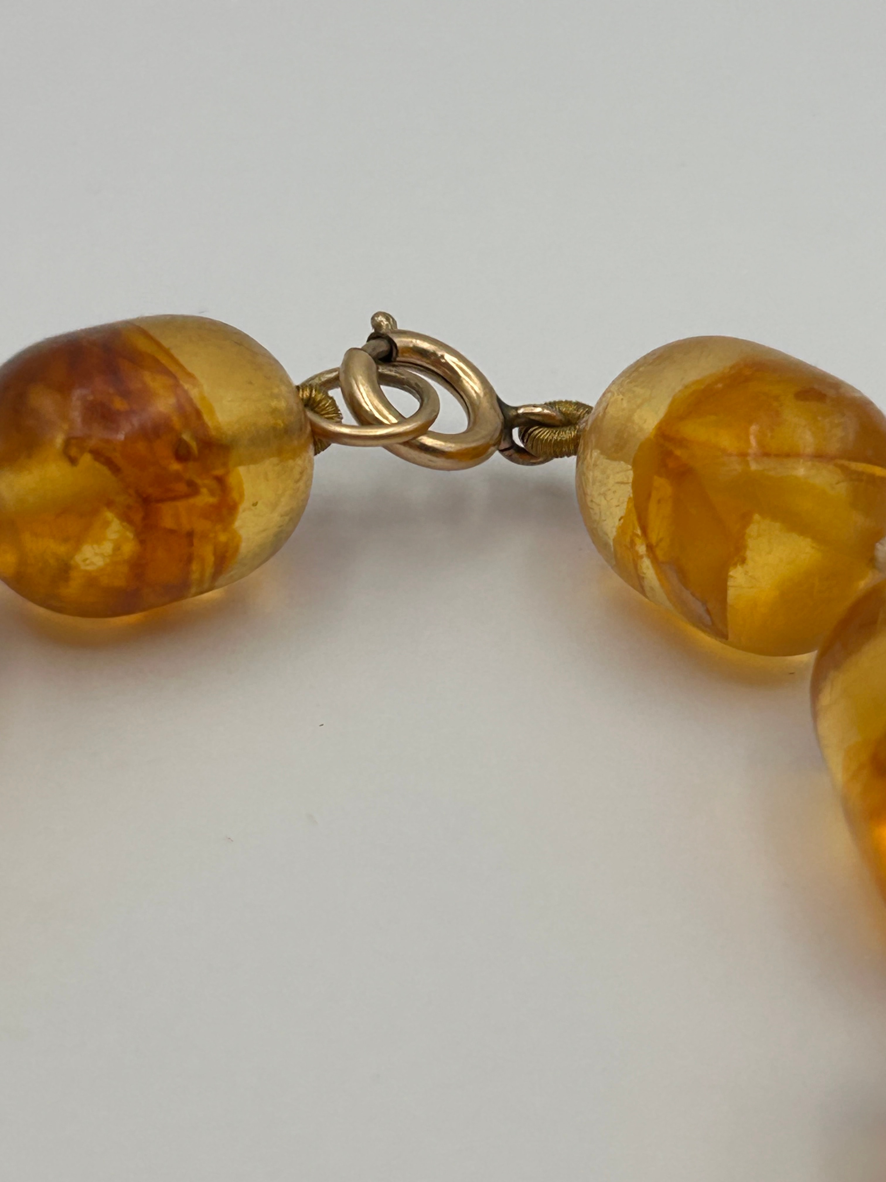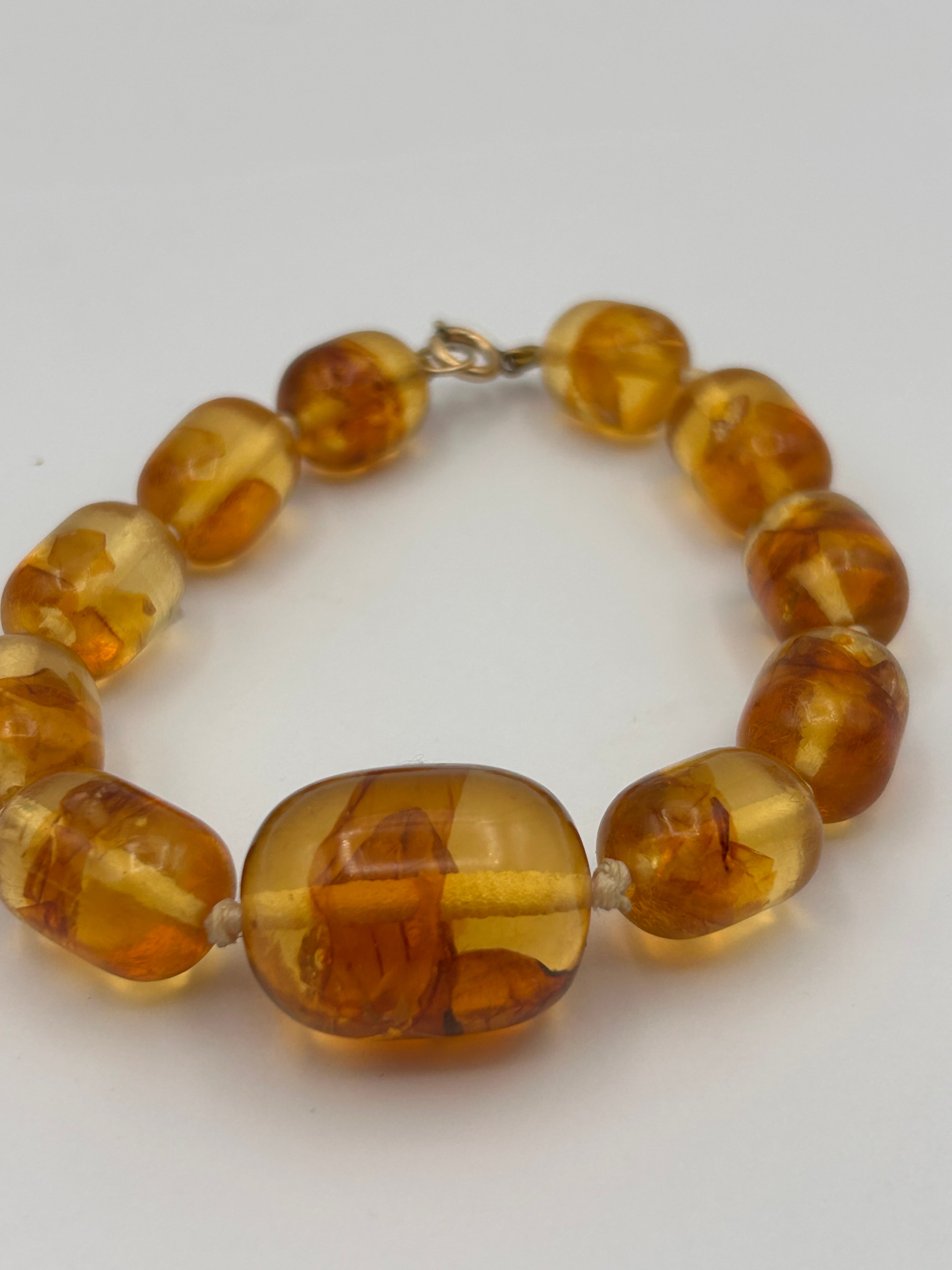 A Baltic amber? bracelet composed of a single strand of graduated, translucent barrel-shaped beads, ranging from golden-yellow to amber-brown, with a prominent larger central bead. The beads display numerous internal inclusions and ‘sun spangles,’ characteristics often associated with natural or heat-treated amber. They are individually knotted on a light-colored cord and secured by a gold-tone spring ring clasp. No visible text or hallmarks are discernible on the beads or clasp.