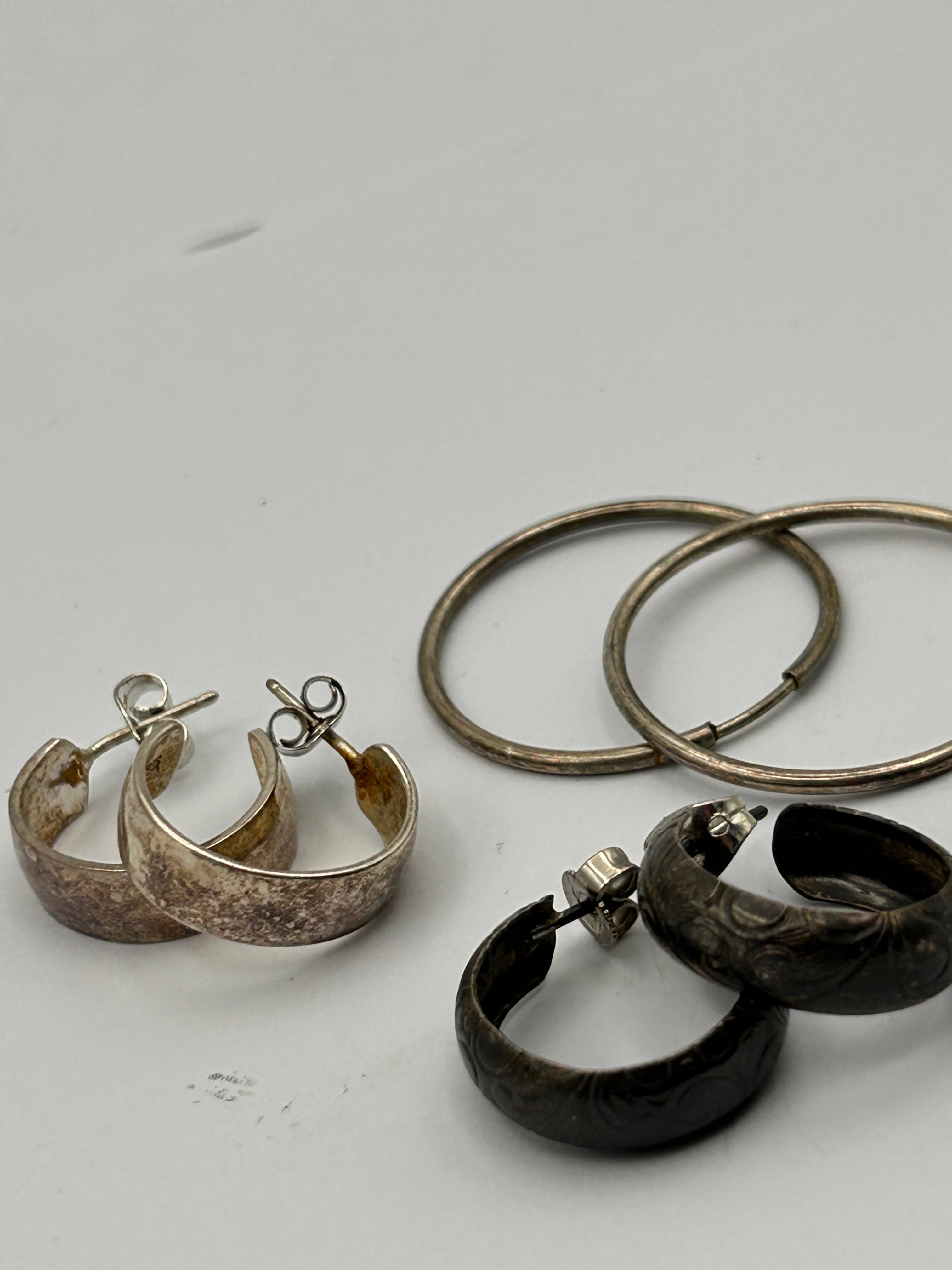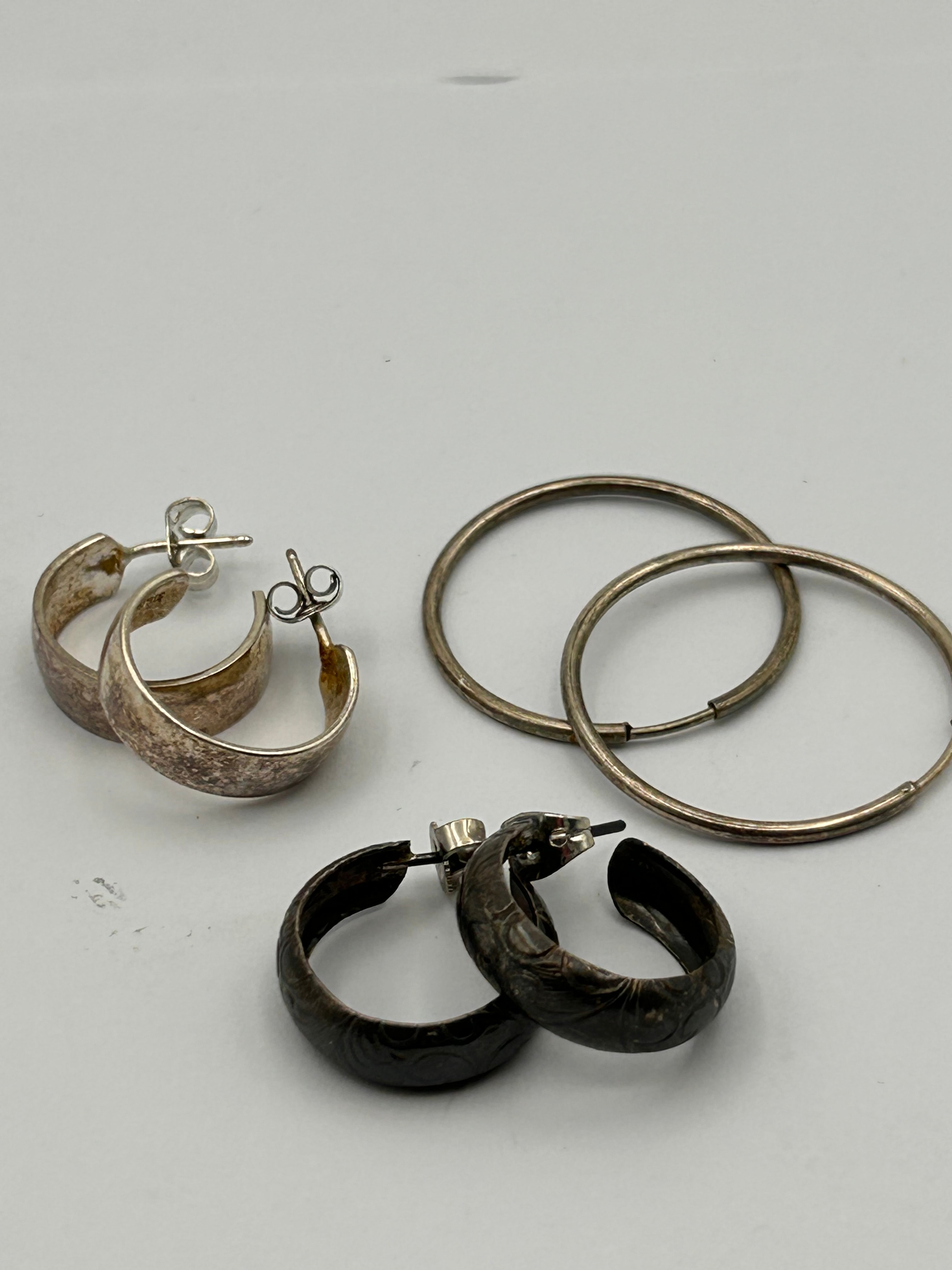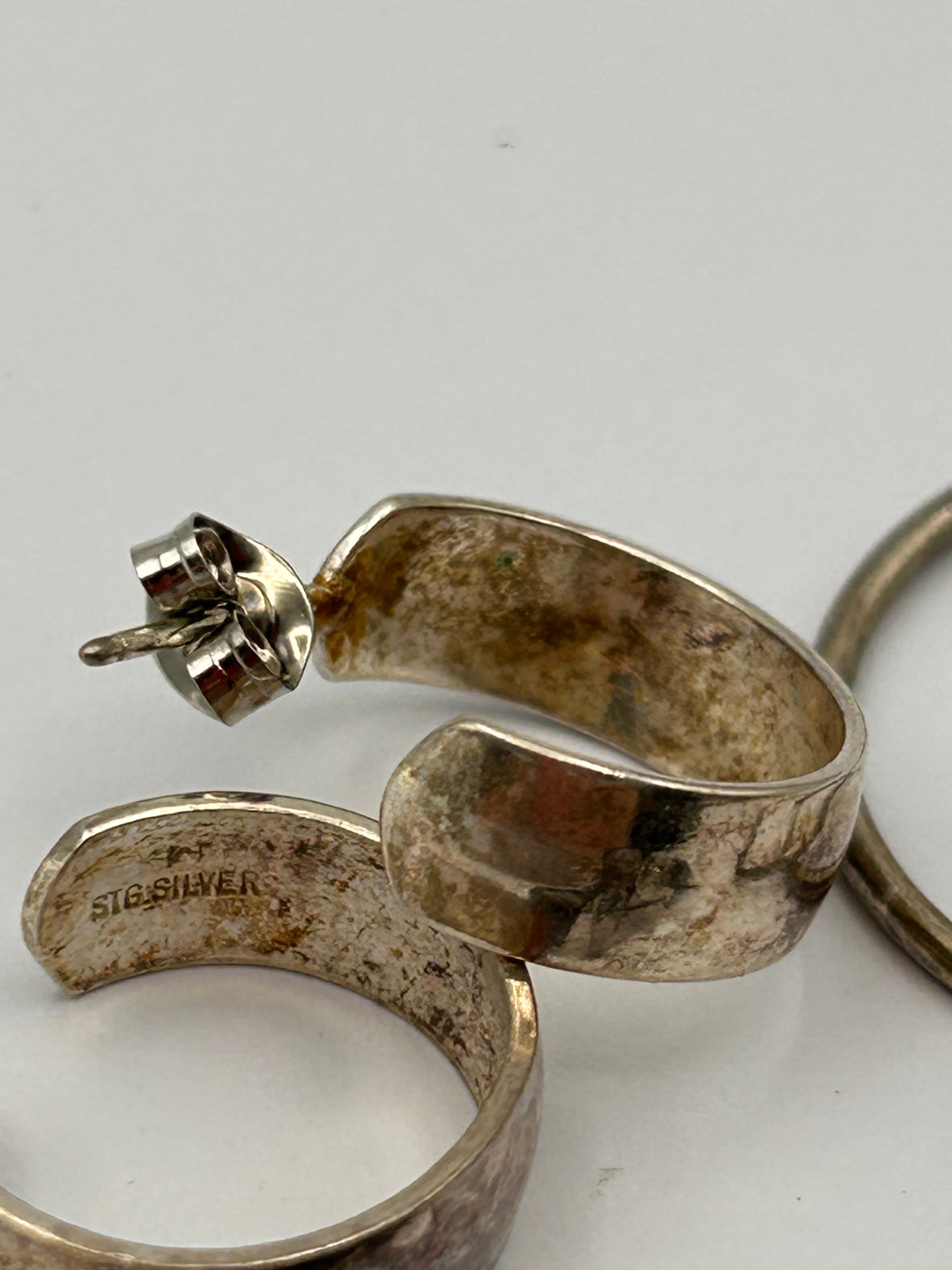 This lot comprises three pairs of earrings. The first pair consists of wide, C-shaped huggie-style hoop earrings crafted from a silver-toned metal, marked “STG. SILVER” on the inner surface, and secured with post-and-butterfly closures. The second pair features simple, thin circular hoop earrings in a silver-toned metal, utilizing a hinged latch mechanism. The third pair presents medium-width hoop earrings in a dark-toned metal, adorned with an etched or embossed floral/foliate pattern, and also equipped with post-and-butterfly closures.