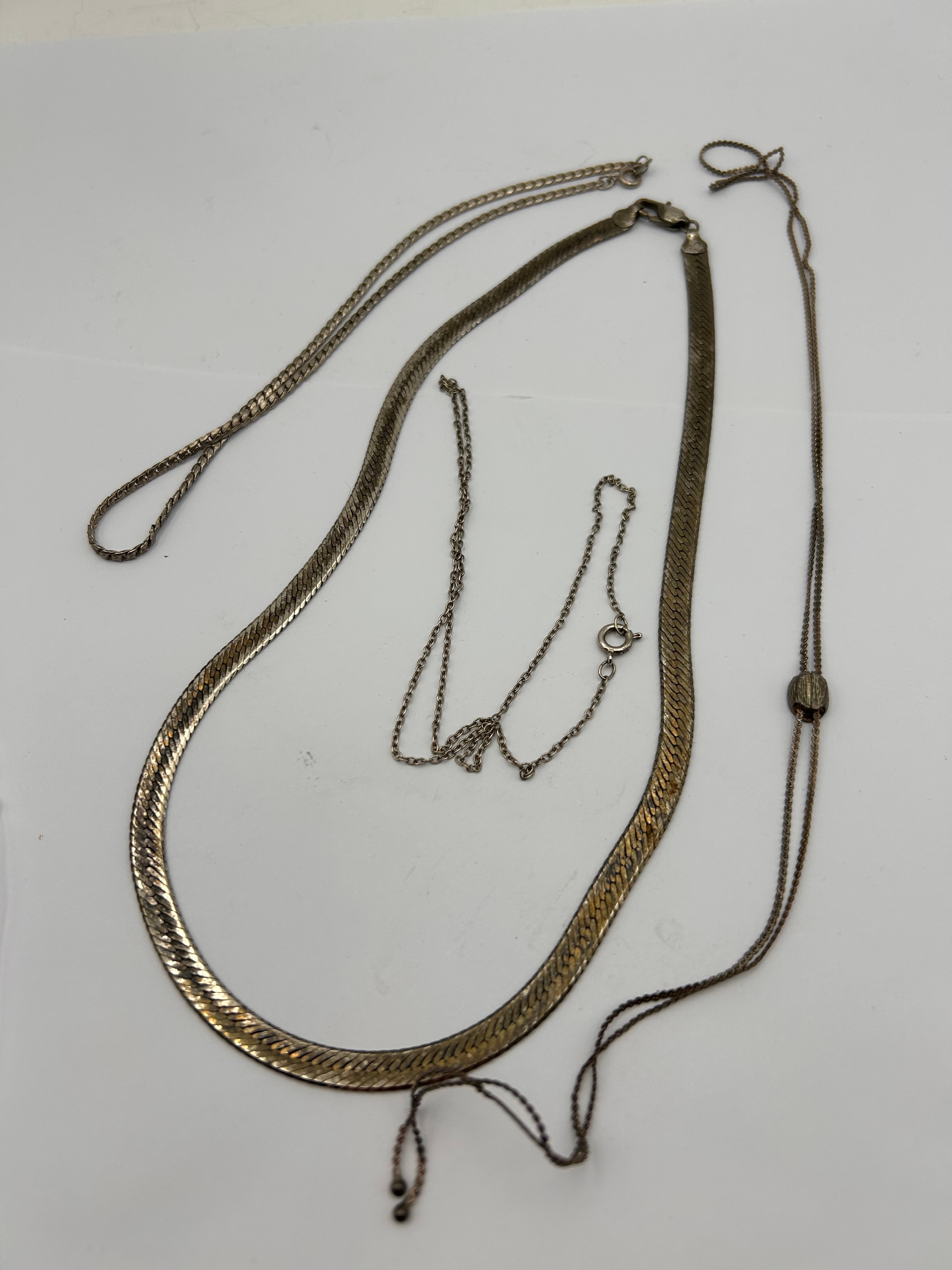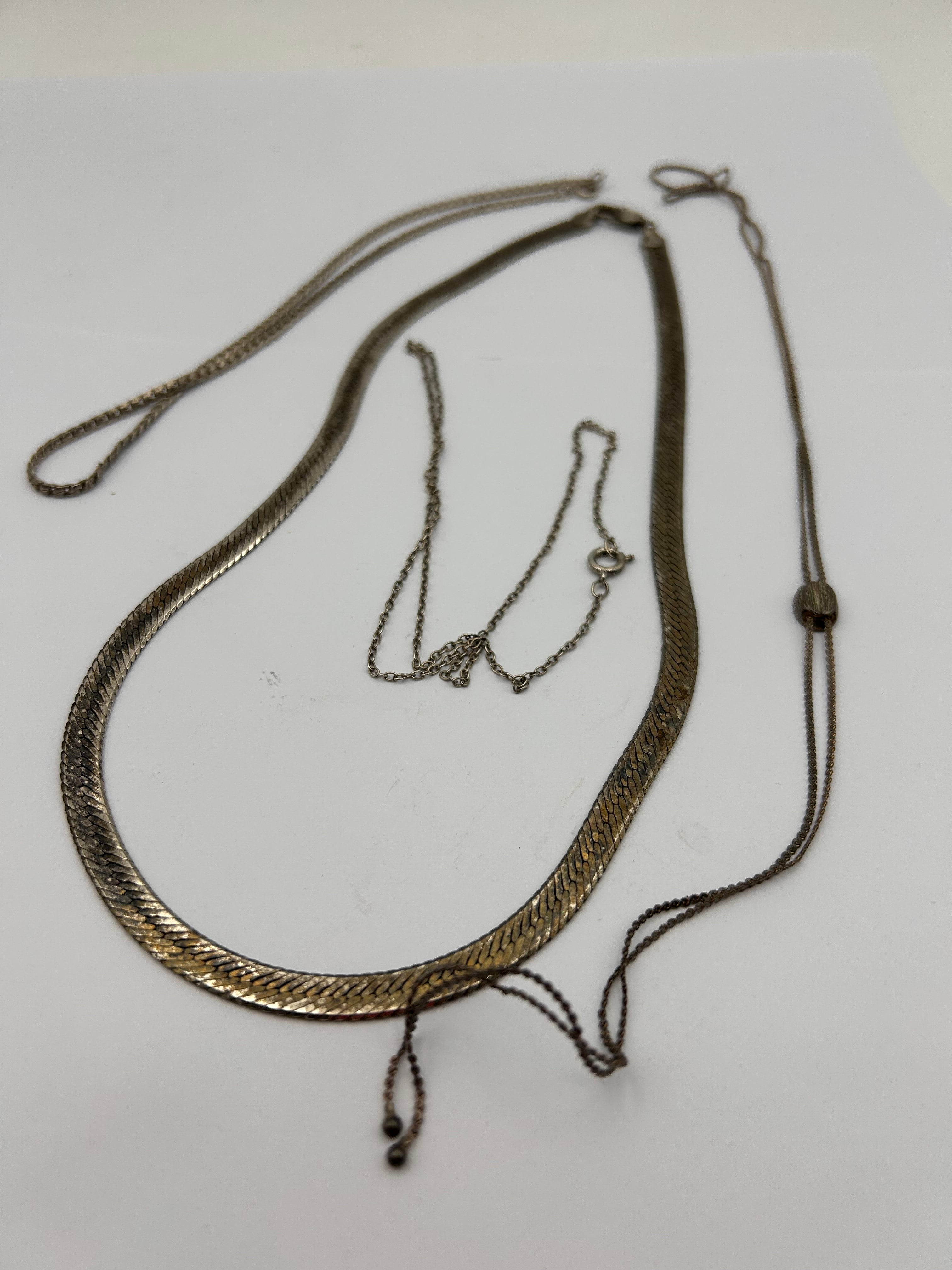A group of four silver-toned metal necklaces. The collection includes a wide, flat herringbone-style chain with a lobster clasp, a thinner classic link chain with a spring-ring clasp, a fine-link chain also with a lobster clasp, and a delicate, long fine-link chain featuring a central sliding cylindrical bead and dual end drops, which appears to lack a traditional clasp. No discernible text, hallmarks, or manufacturer’s markings are immediately visible on any item. Web intelligence suggests the possibility of sterling silver for similar items.
