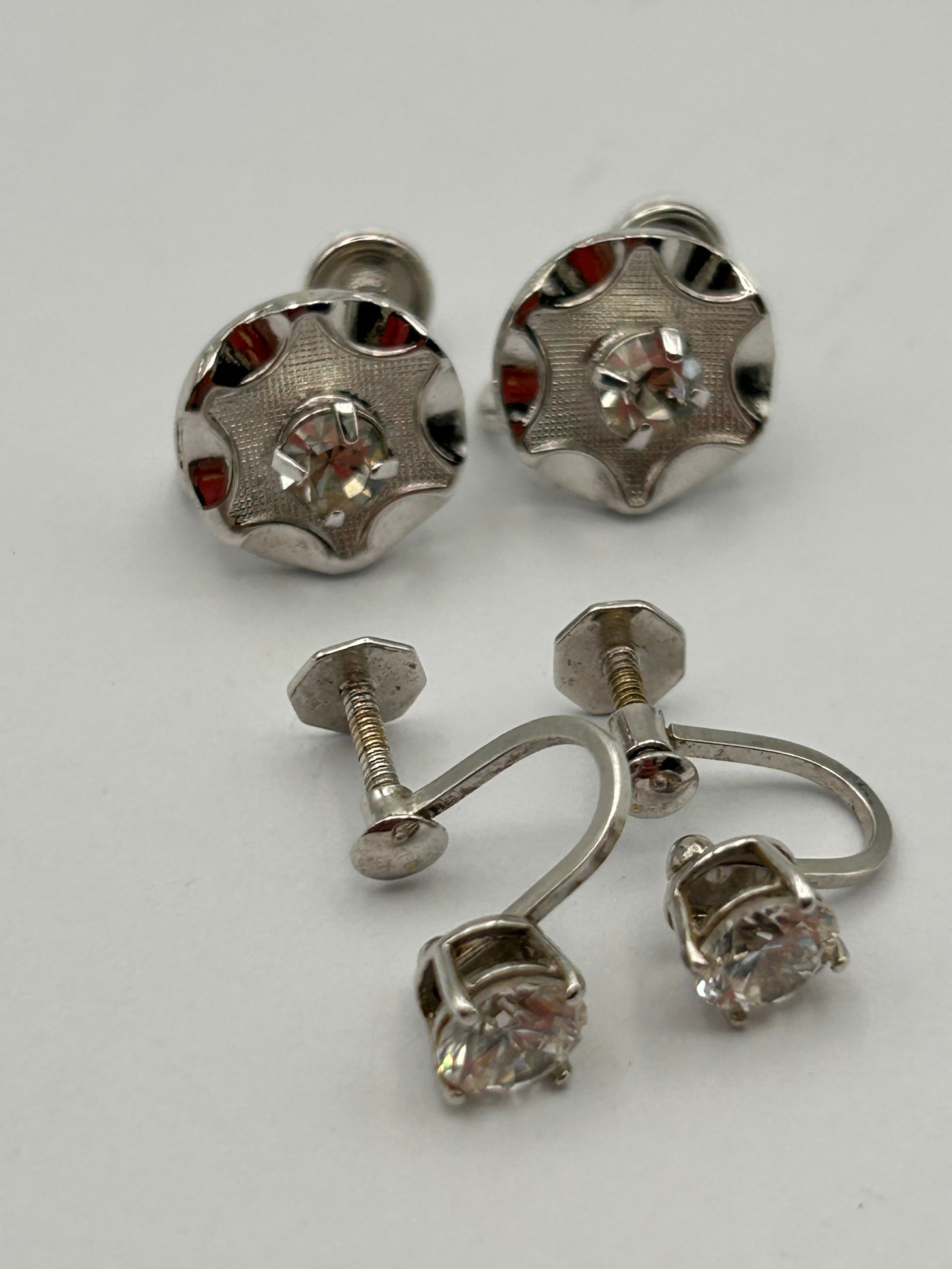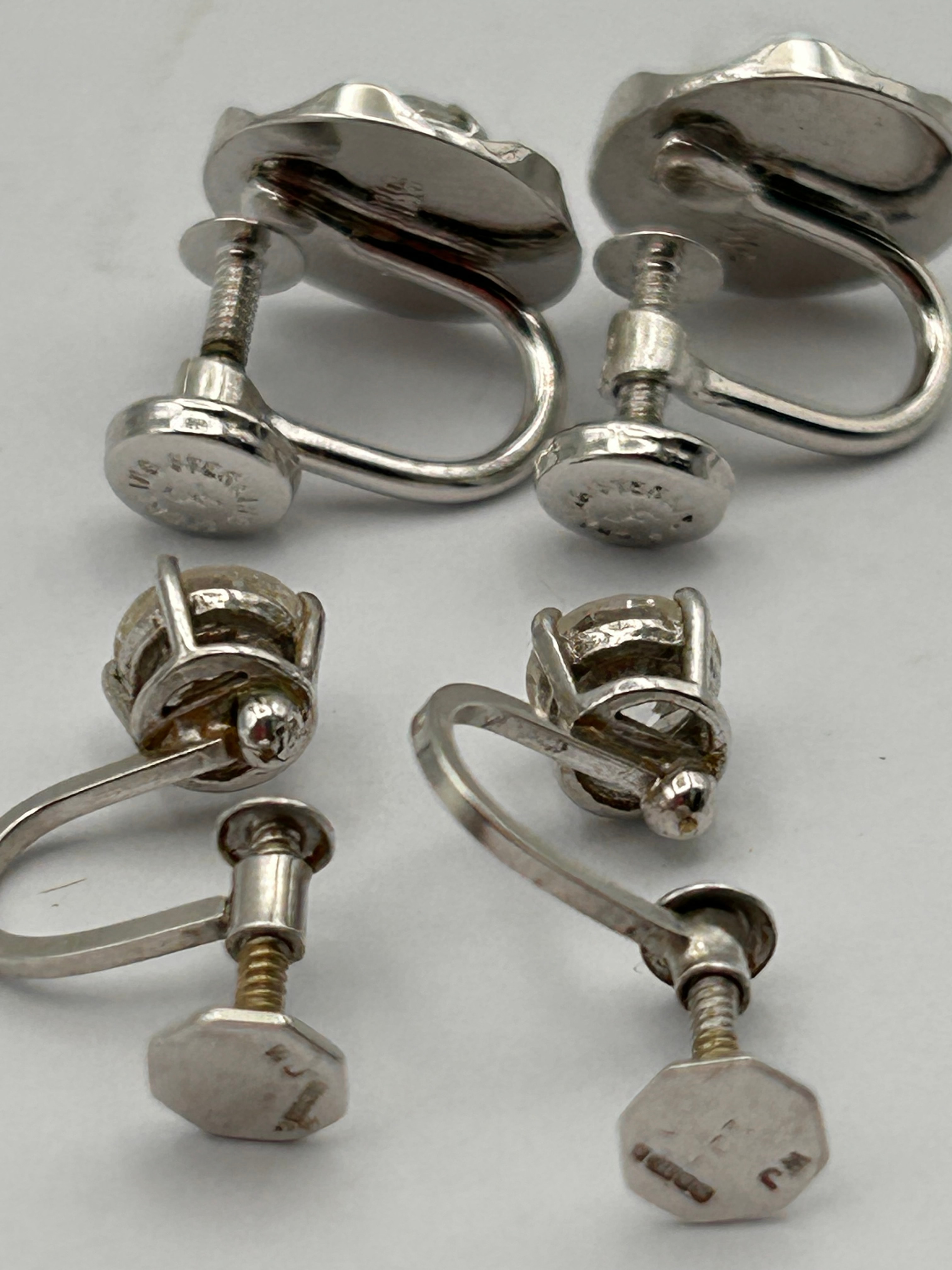 A collection of two pairs of vintage screw-back earrings, The first pair features a stud design, each with a central clear, faceted stone encircled by a textured, starburst-like bezel. The second pair consists of dangle earrings, each showcasing a single round, clear, faceted stone in a four-prong setting. Both pairs are marked “STERLING” on their screw-back mechanisms, confirming their silver composition. Faint initials, possibly “S.J.” or “J.S.” and “C.M.” or “M.C.”, are visible on one of the lower pair’s findings.