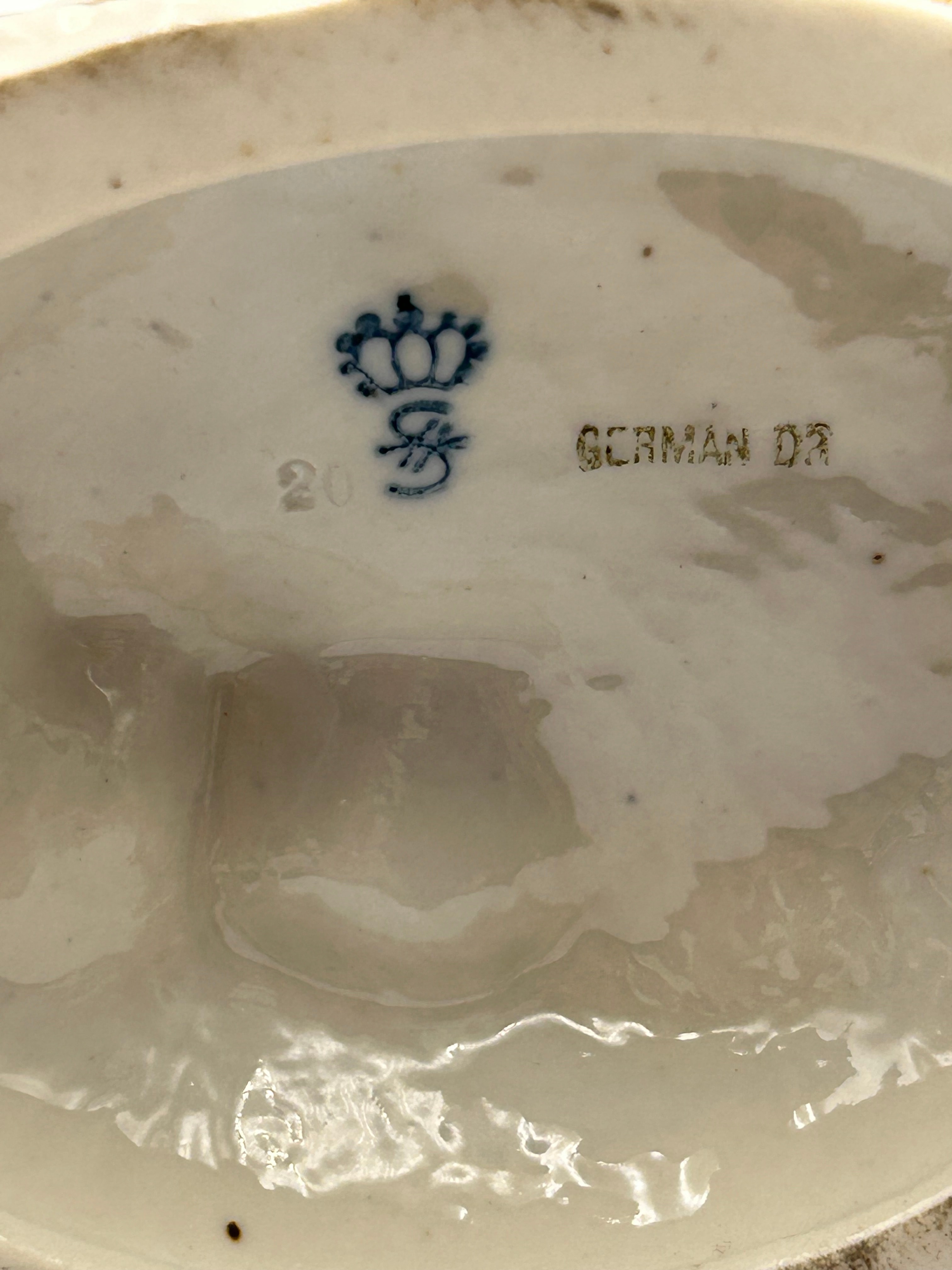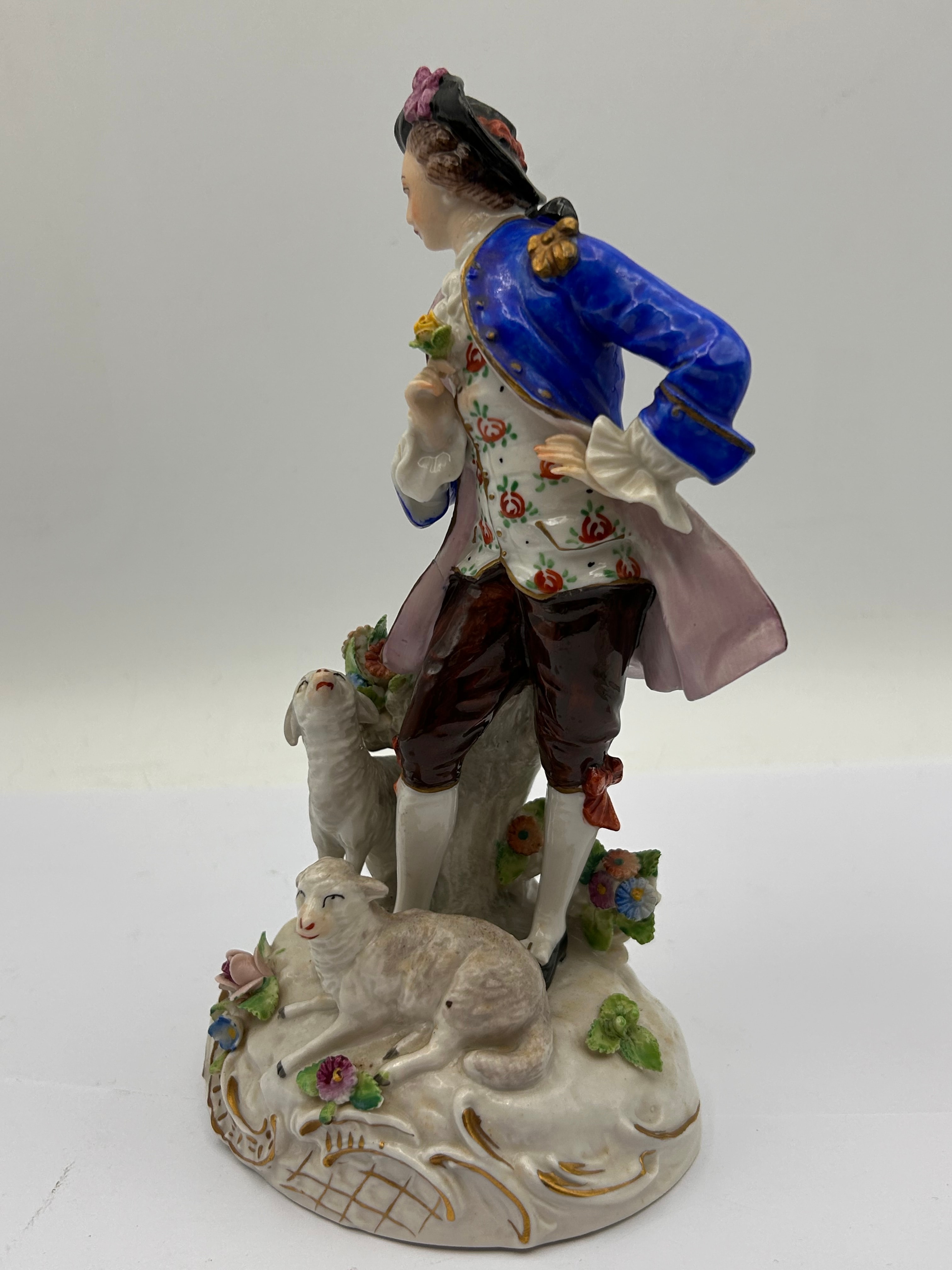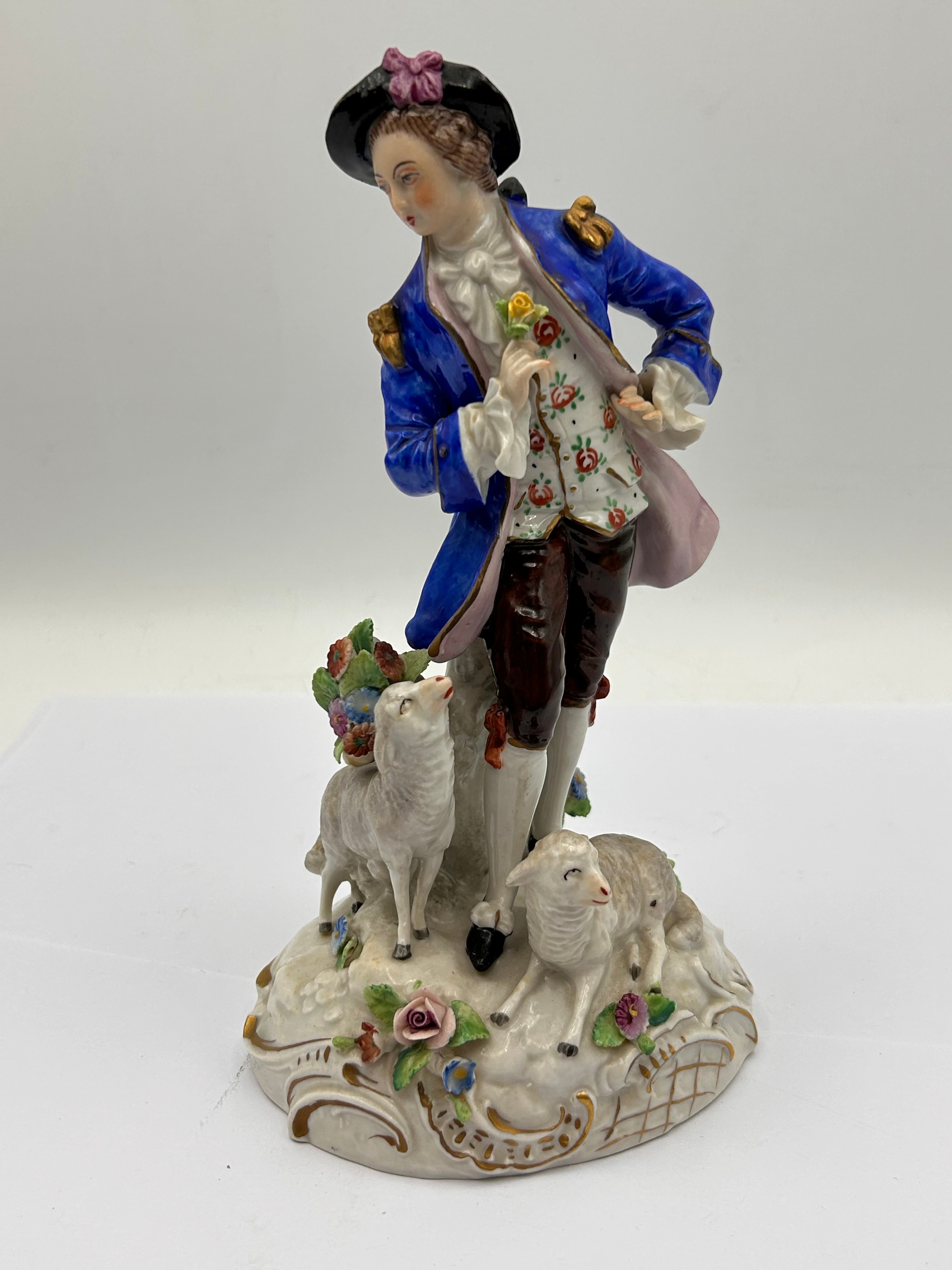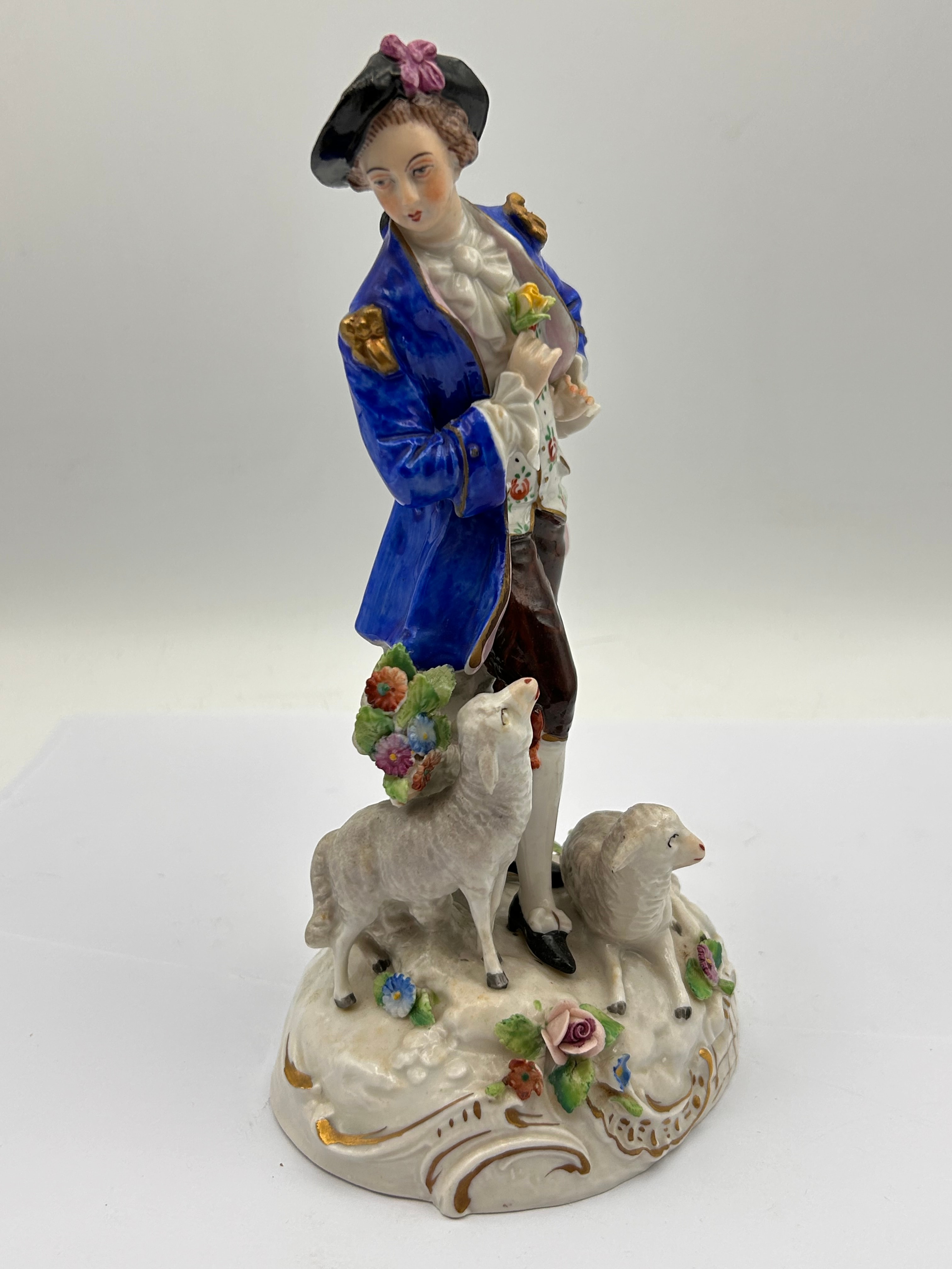 A Sitzendorf Porcelain Nobleman With Lambs Figurine. This polychrome hand-painted porcelain figurine depicts a male figure in 18th-century Rococo or late Baroque-style dress, featuring a blue coat, breeches, and tricorne hat, holding flowers. He stands on a naturalistic base adorned with applied flowers and gilded details, accompanied by two white sheep. The underside of the base bears a blue underglaze mark of a crown above a stylized letter, alongside the impressed or painted text ‘GERMAN DR’ (German Democratic Republic, suggesting a post-1949 origin) and the number ’20’.