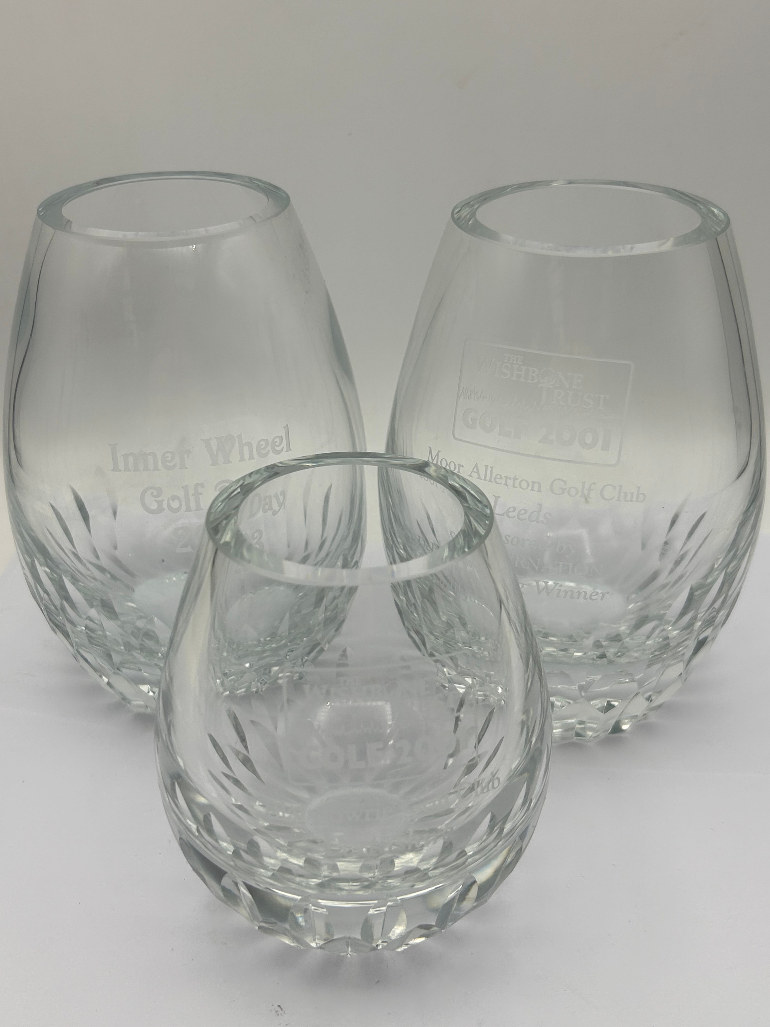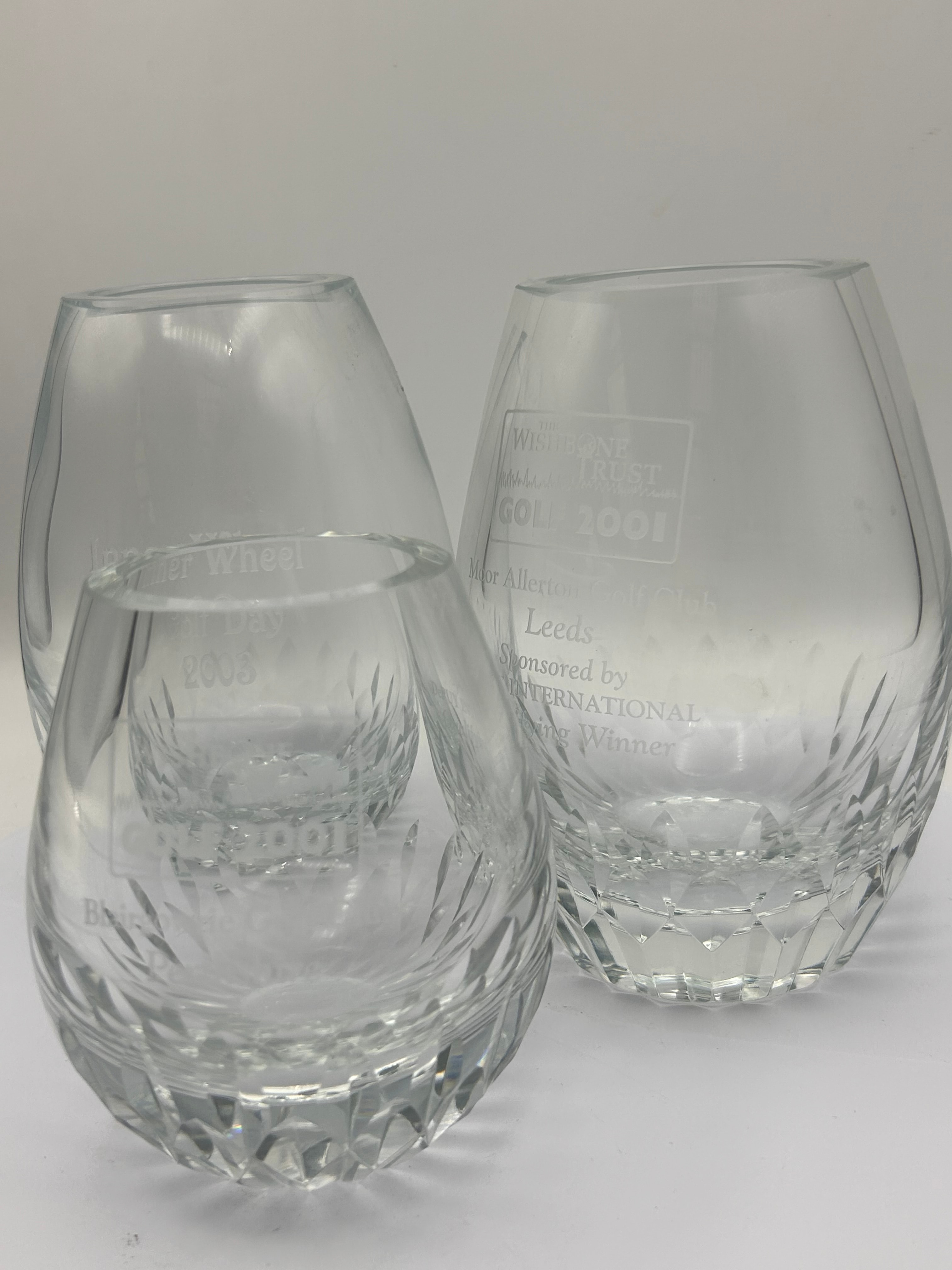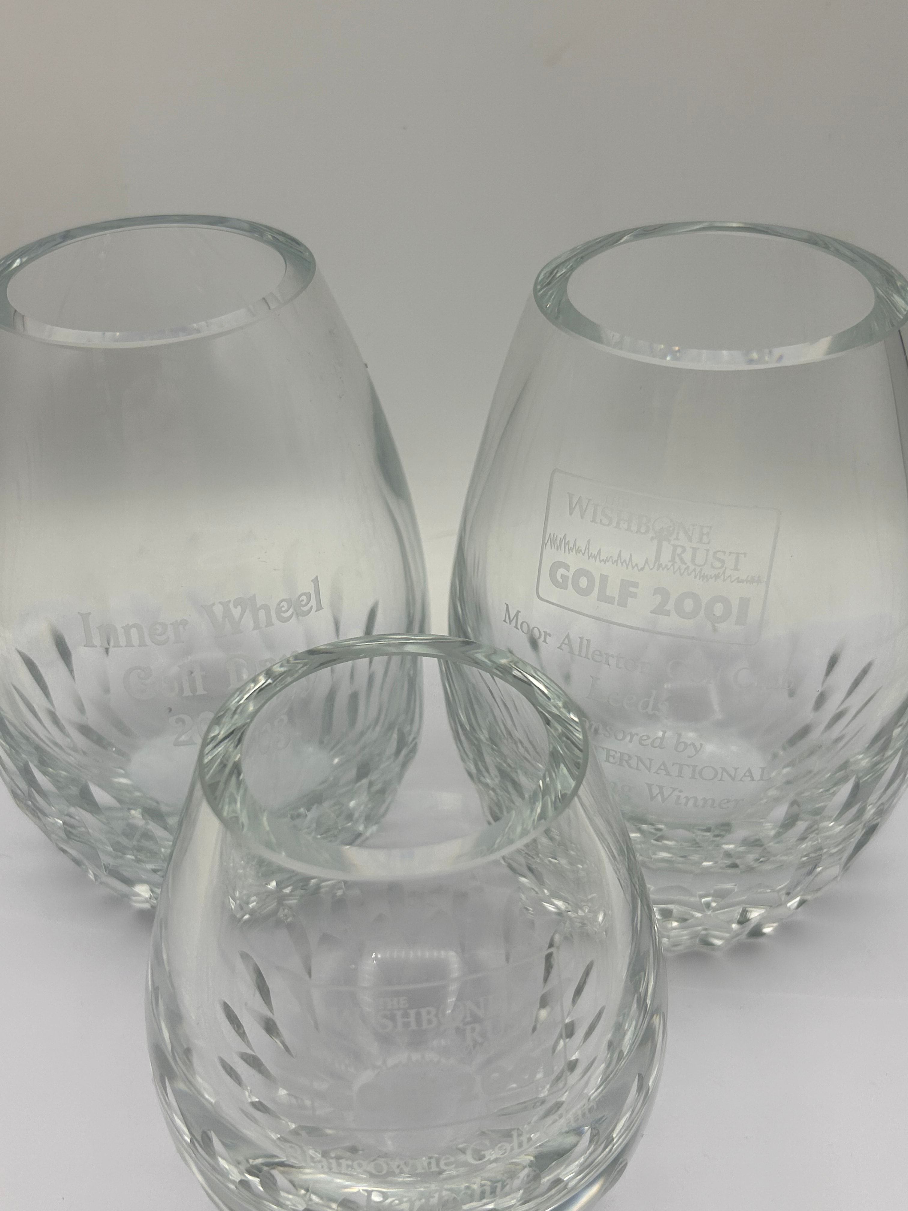 A group of three clear lead crystal vessels, likely award trophies, dating to the early 21st century. Each features an ovoid or barrel-shaped body with a heavily faceted base displaying a diamond-cut pattern, reminiscent of the Waterford Lismore design. The vessels are of varying sizes (one large, one medium, one small). The largest vessel on the left is engraved “Inner Wheel Golf Day 2003.” The largest vessel on the right is engraved “THE WISHBONE TRUST GOLF 2001,” “Moor Allerton Golf Club Leeds,” “Sponsored by INTERNATIONAL,” and “Winner.” The smallest vessel is engraved “THE SHEBON” and “GOLF 2001” (partially obscured).