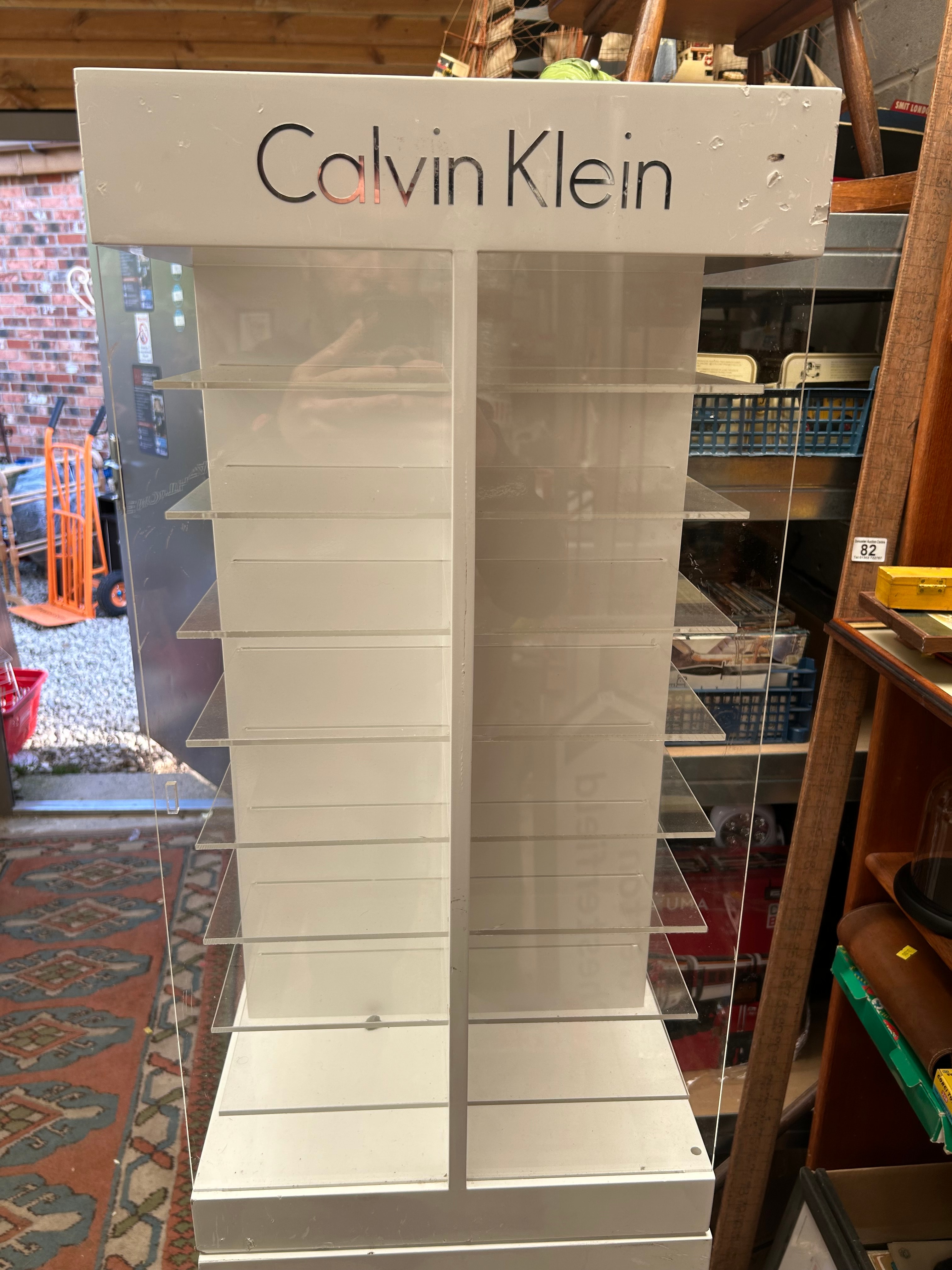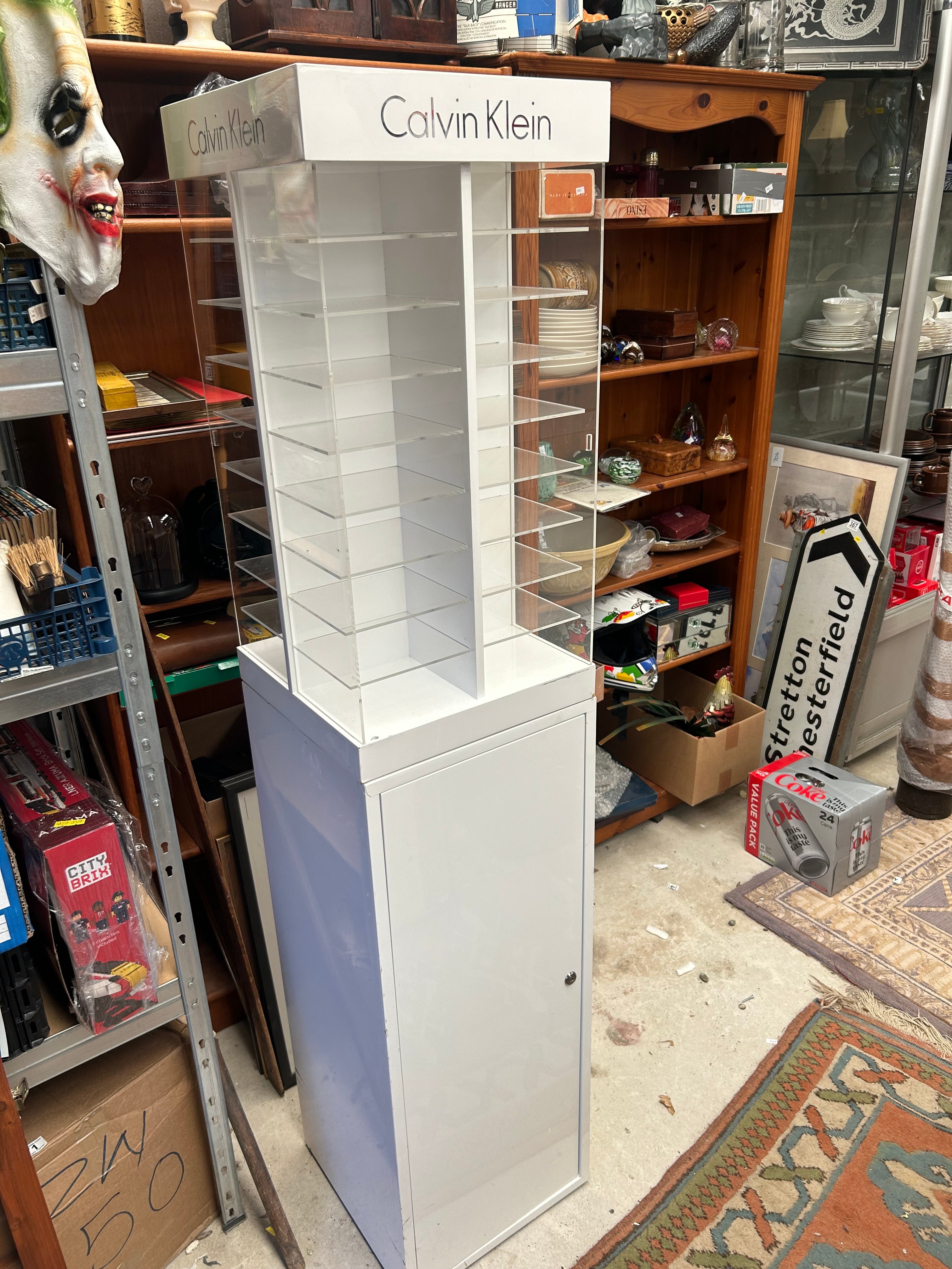A Calvin Klein Branded Retail Display Case. This modern, freestanding retail display unit features a white metal or composite cabinet base with a lockable door, topped by a four-sided clear acrylic shelving unit. The display is branded with ‘Calvin Klein’ in black text on a prominent white header panel.