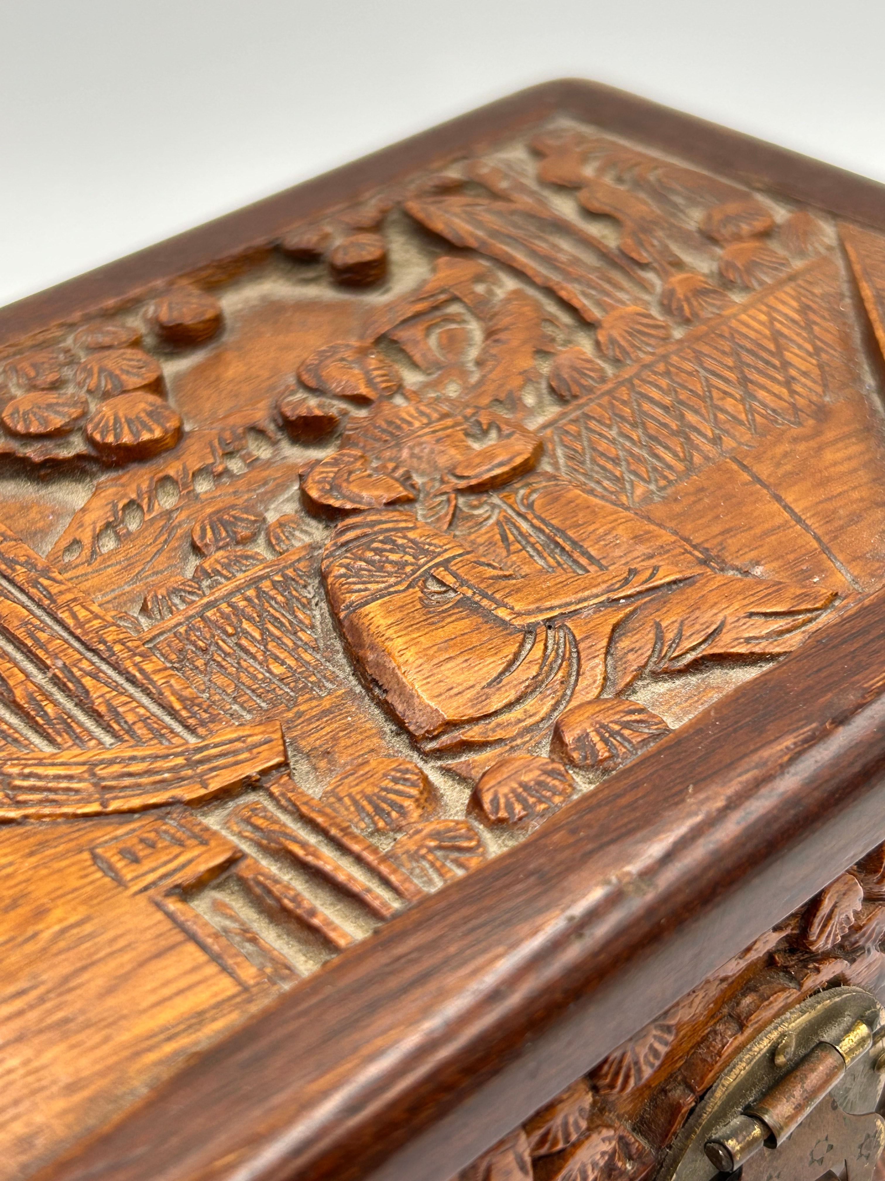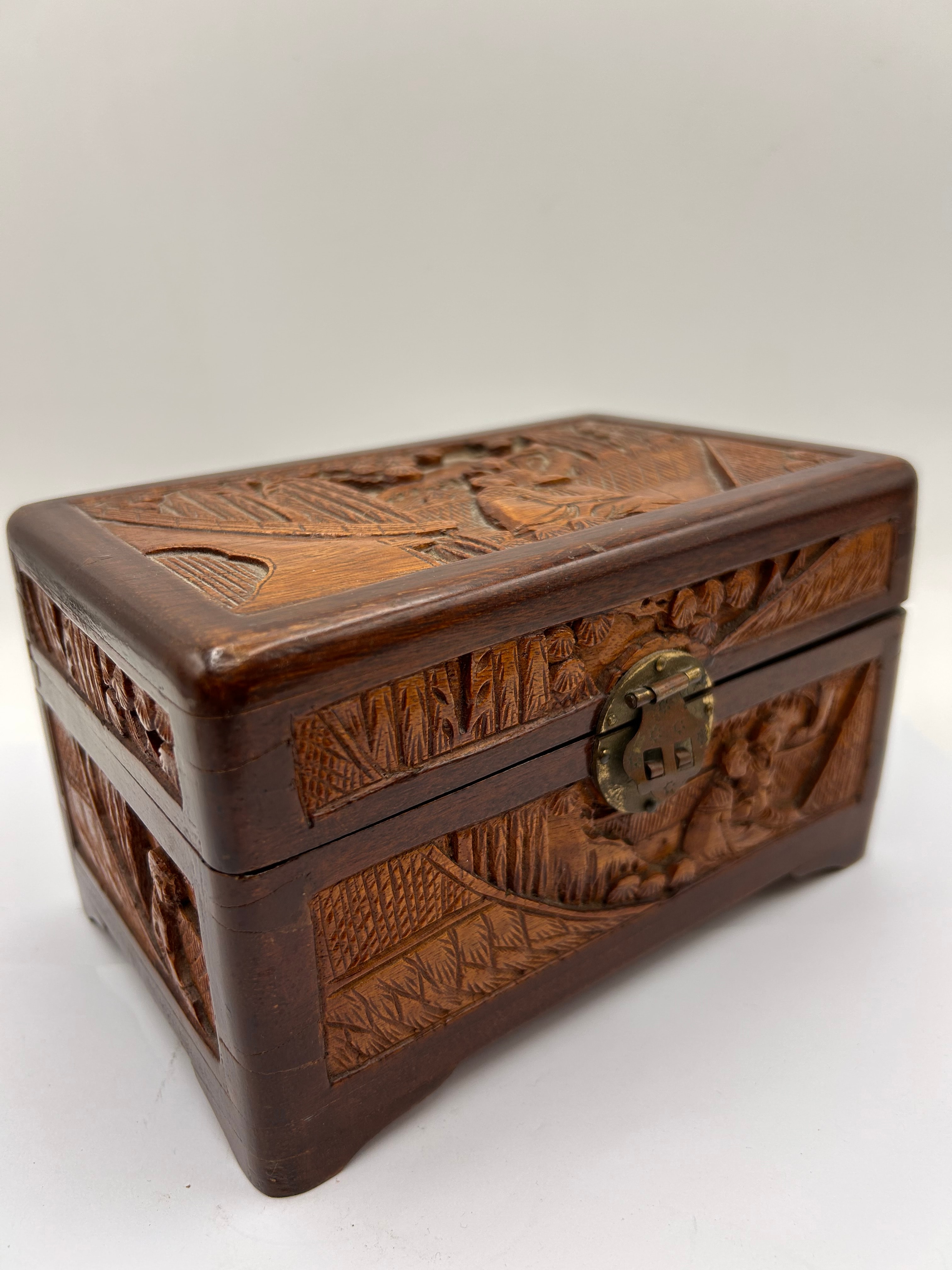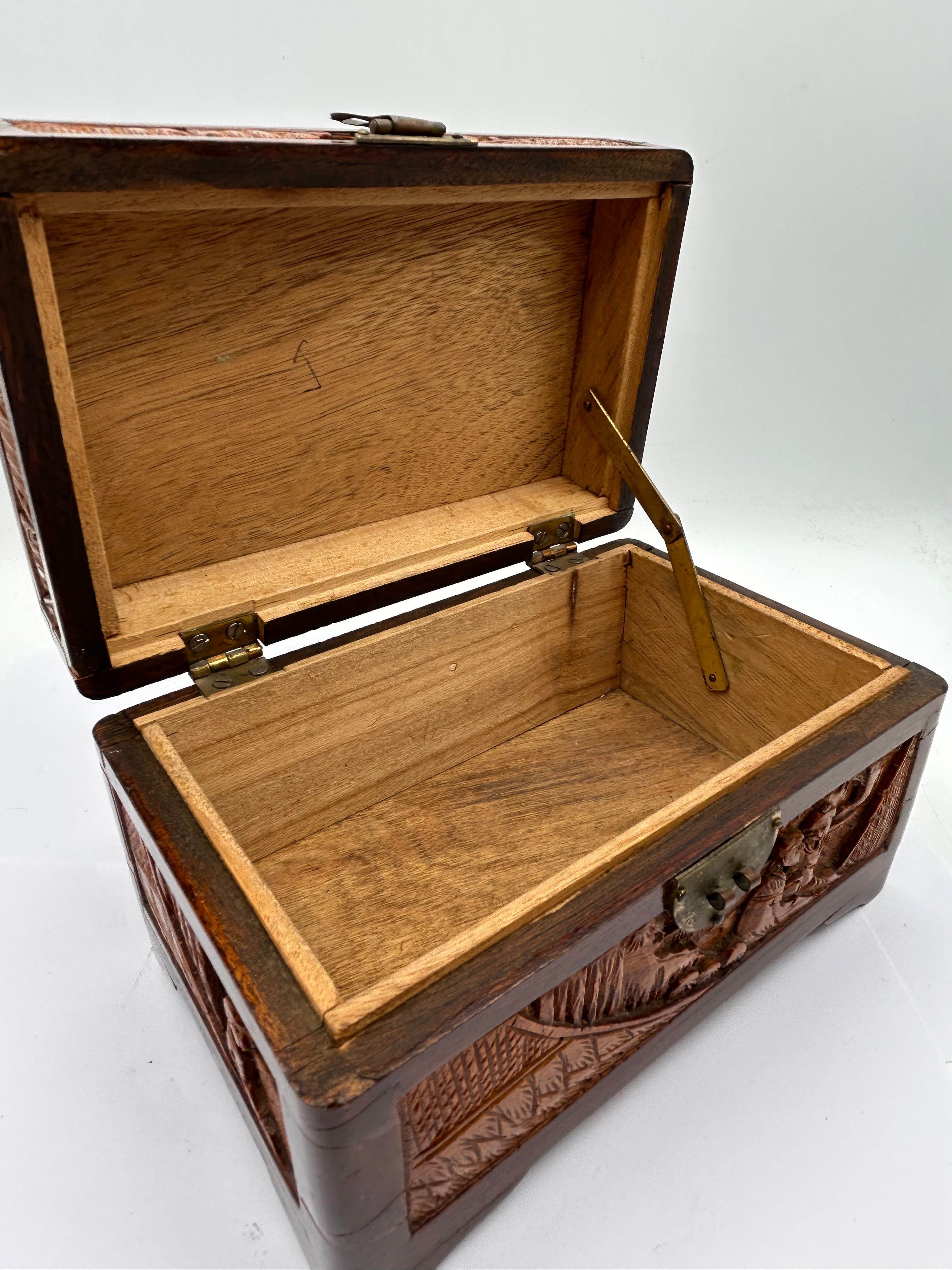 An Ajuny hand carved wooden decorative keepsake box, measuring approximately 7×5 inches. Crafted in a traditional East Asian style, its exterior is extensively carved in low relief, depicting scenes with figures in traditional attire, architectural elements, and natural landscapes featuring trees. The wood has a dark brown finish, and the box is fitted with brass-toned metal hardware, including a front latch, rear hinges, and an internal lid support. The interior of the box is unfinished, raw wood. No visible text or maker’s marks are present.