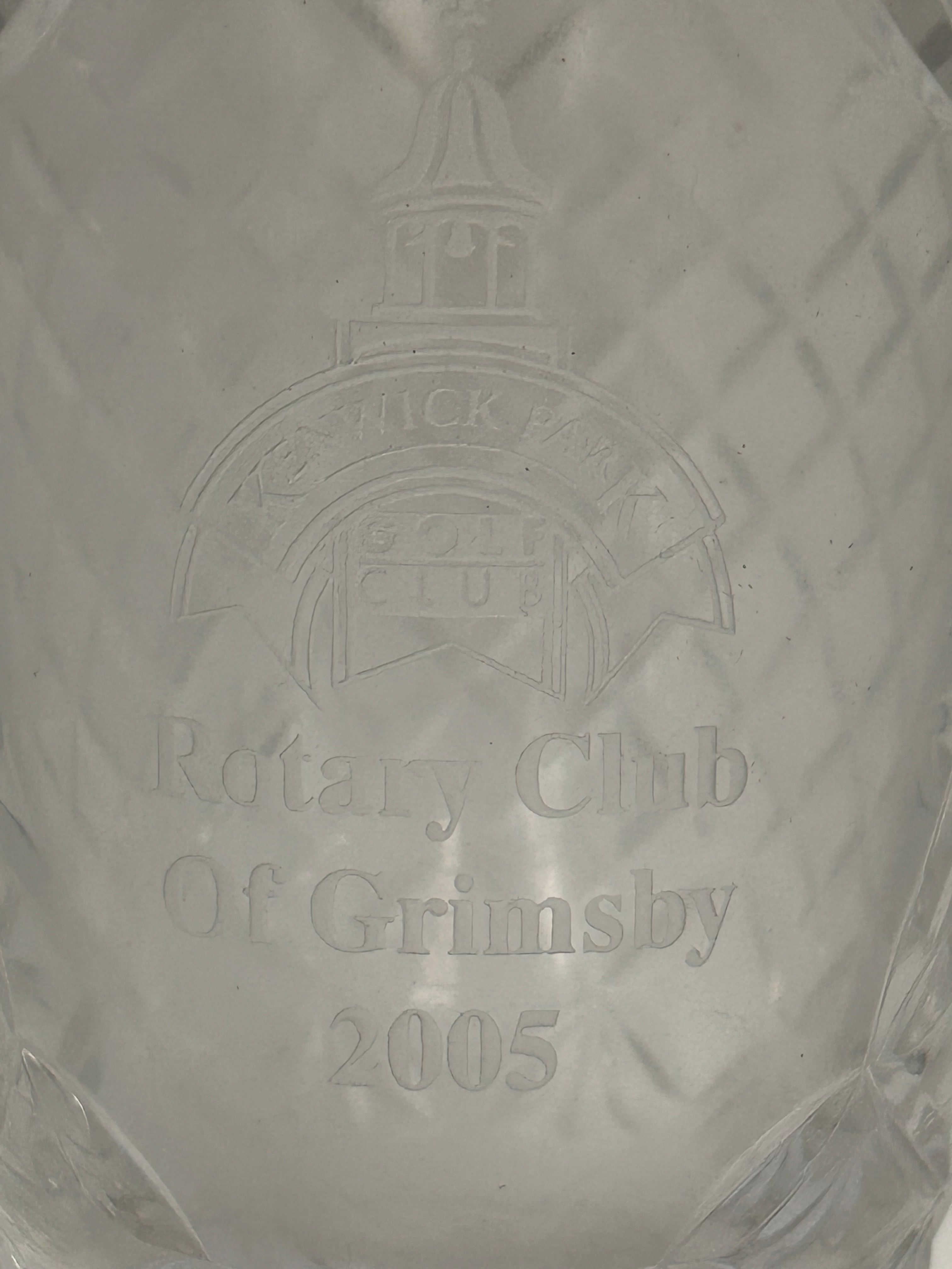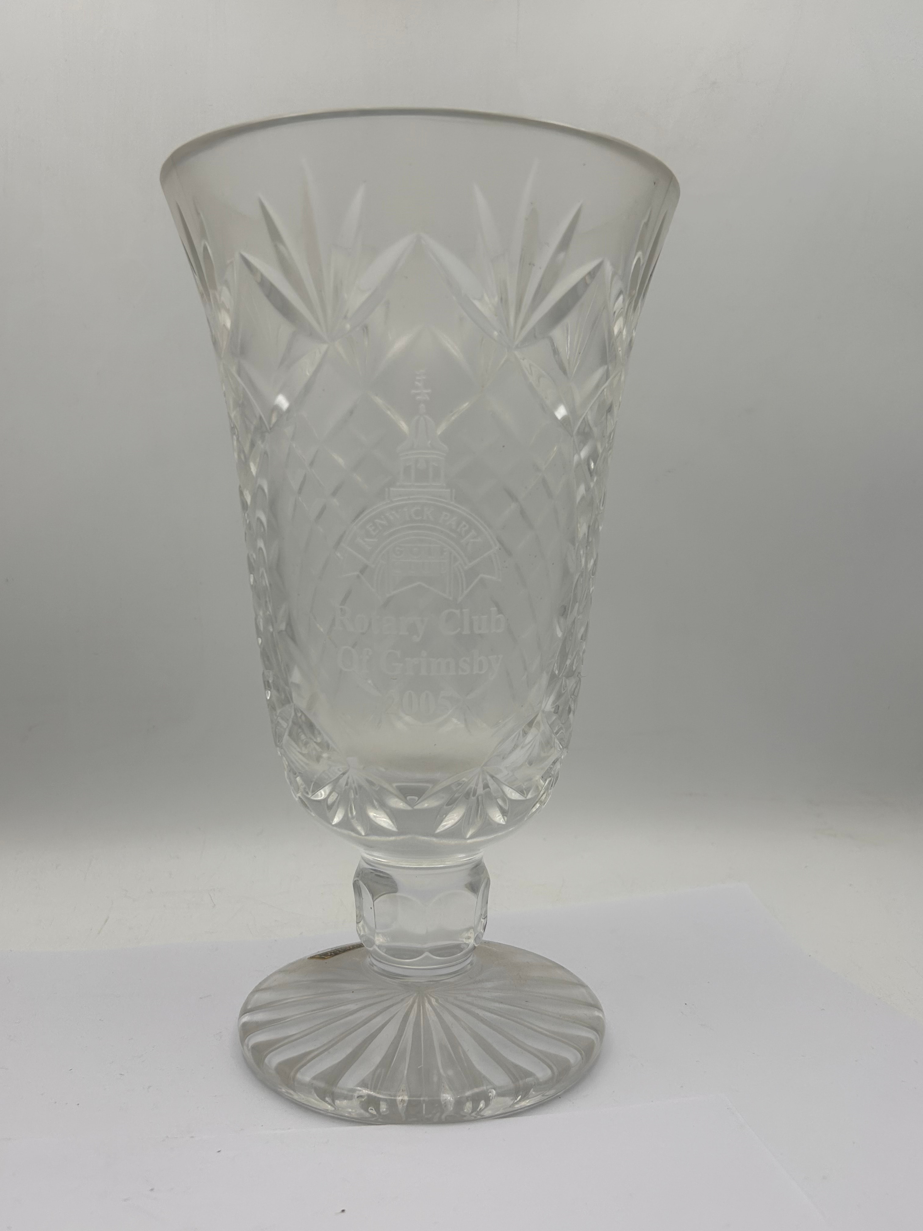 A Waterford Crystal footed pedestal vase, featuring a flared rim, a tapering body with an all-over diamond-cut pattern, a short stem, and a round foot with radial fluting. The material is lead crystal. Engraved on the body is a crest-like emblem featuring a building with the surrounding text "KENWICK PARK GOLF CLUB, " followed by "Rotary Club Of Grimsby" and the date "2005."