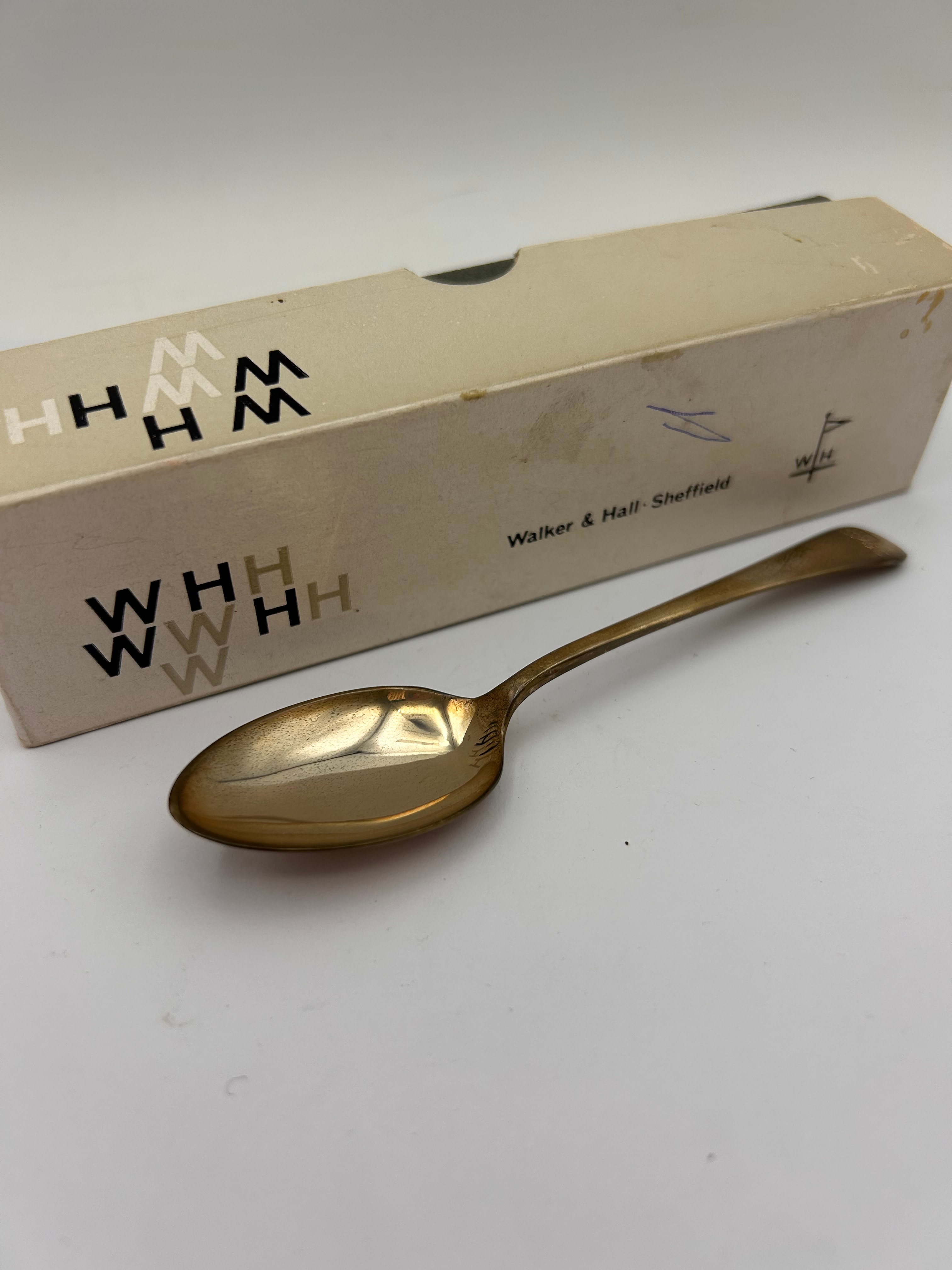 A Walker & Hall gilt metal teaspoon, presented with its original cardboard box. The spoon features a traditional design and exhibits a yellowish-golden metallic luster, currently obscured by significant overall tarnish and patina. Visible hallmarks on the spoon’s handle include a crowned symbol, a floral motif, a capital letter ‘B’, and the initials ‘JD&S’, each enclosed within a rectangular cartouche. The accompanying cardboard box displays creasing, discoloration, and general wear consistent with age, and is prominently marked with ‘WHH’, ‘WM’, ‘WWW’, a ‘WH’ flag logo, and the manufacturer’s name and location: ‘Walker & Hall – Sheffield’.