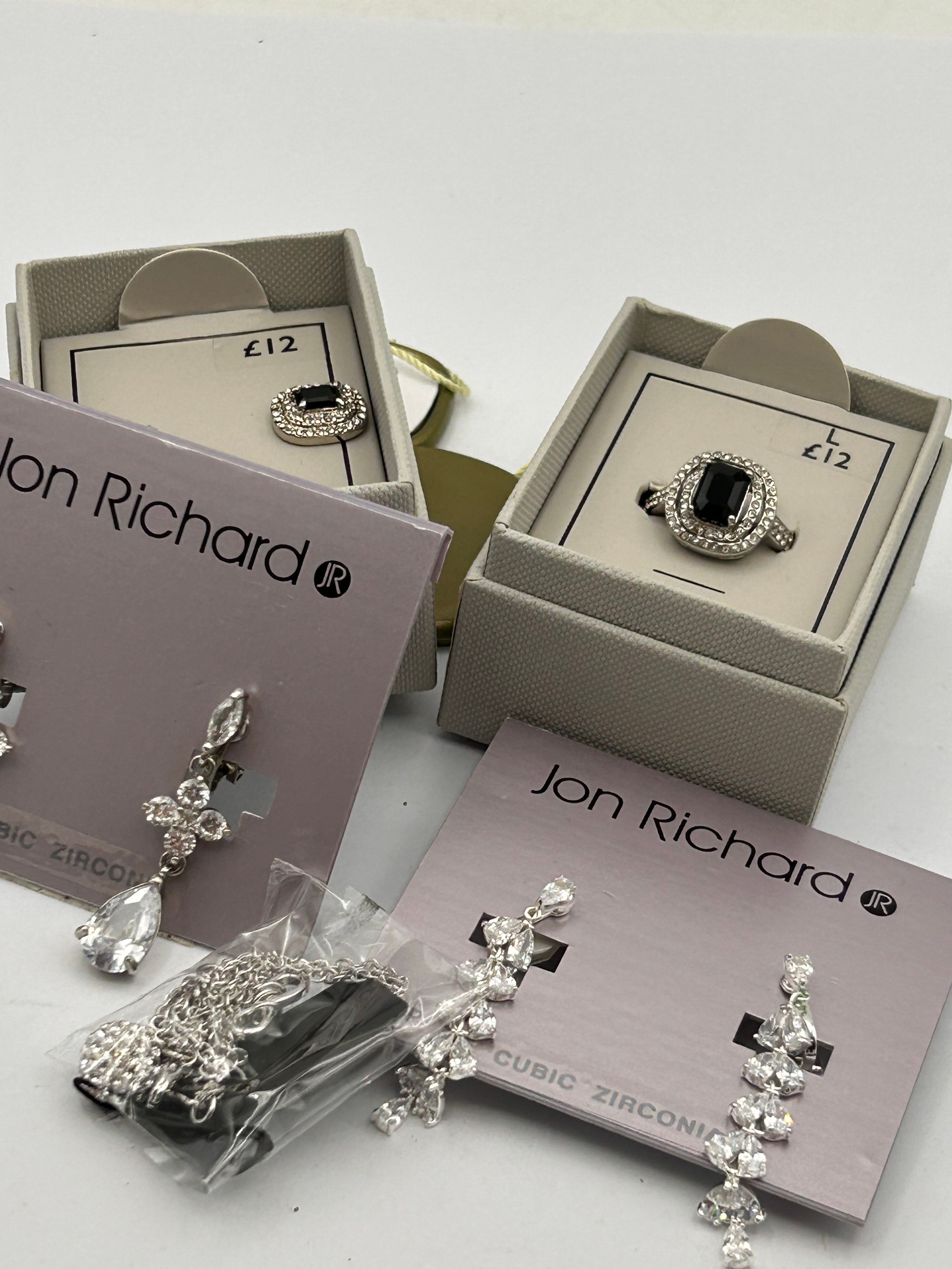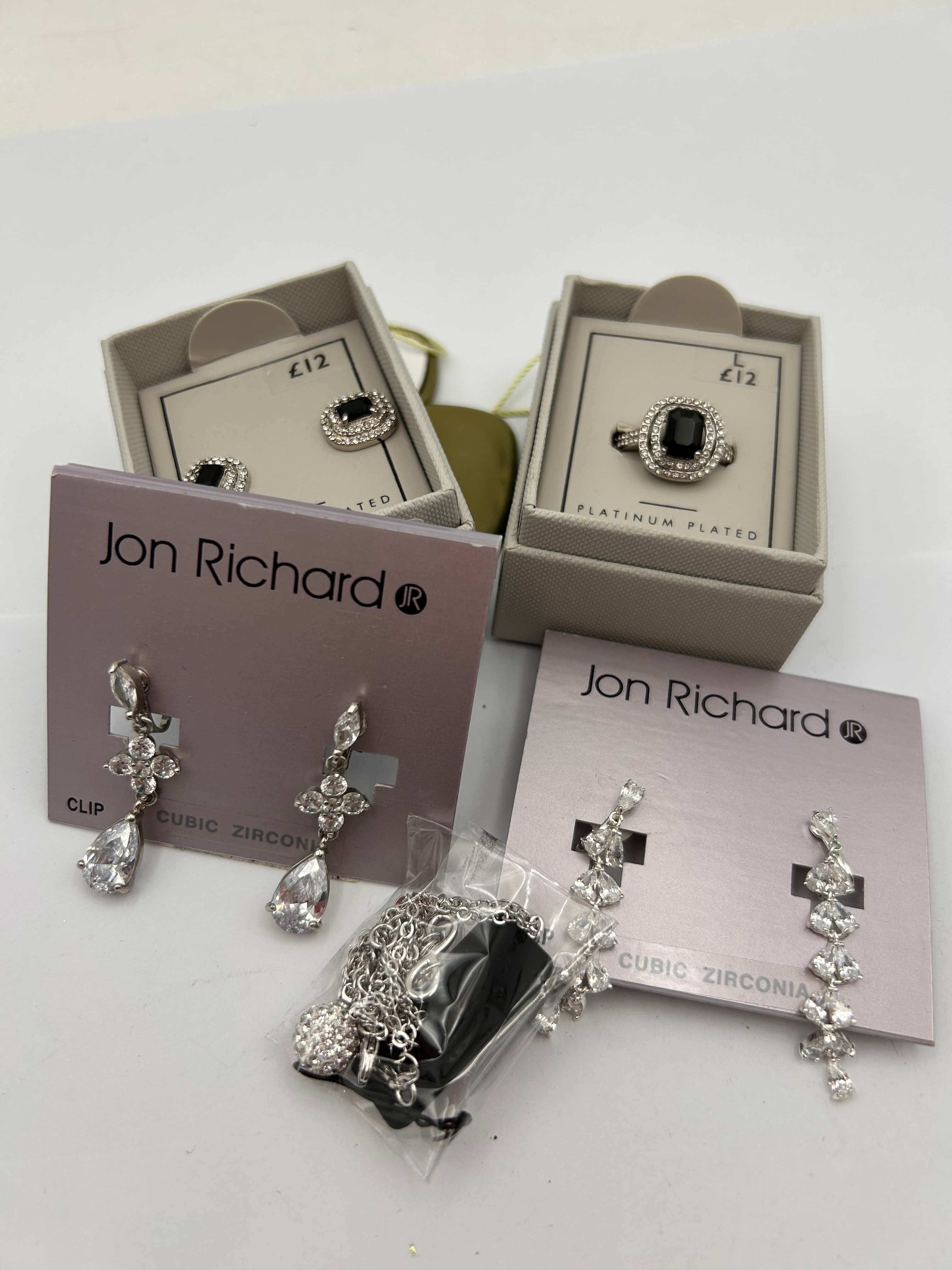 A collection of Jon Richard platinum plated cubic zirconia fashion jewellery, comprising two rings, two pairs of earrings (one clip-style), and one necklace. Two items, a ring and a pair of stud earrings, feature a central black stone surrounded by clear stones. The remaining ring, a pair of dangle earrings, and the necklace are entirely set with clear stones. All items are presented in their original retail packaging, which indicates “PLATINUM PLATED” and “CUBIC ZIRCONIA” materials. Individual items are marked for sale at £12. One ring is marked with size L.
