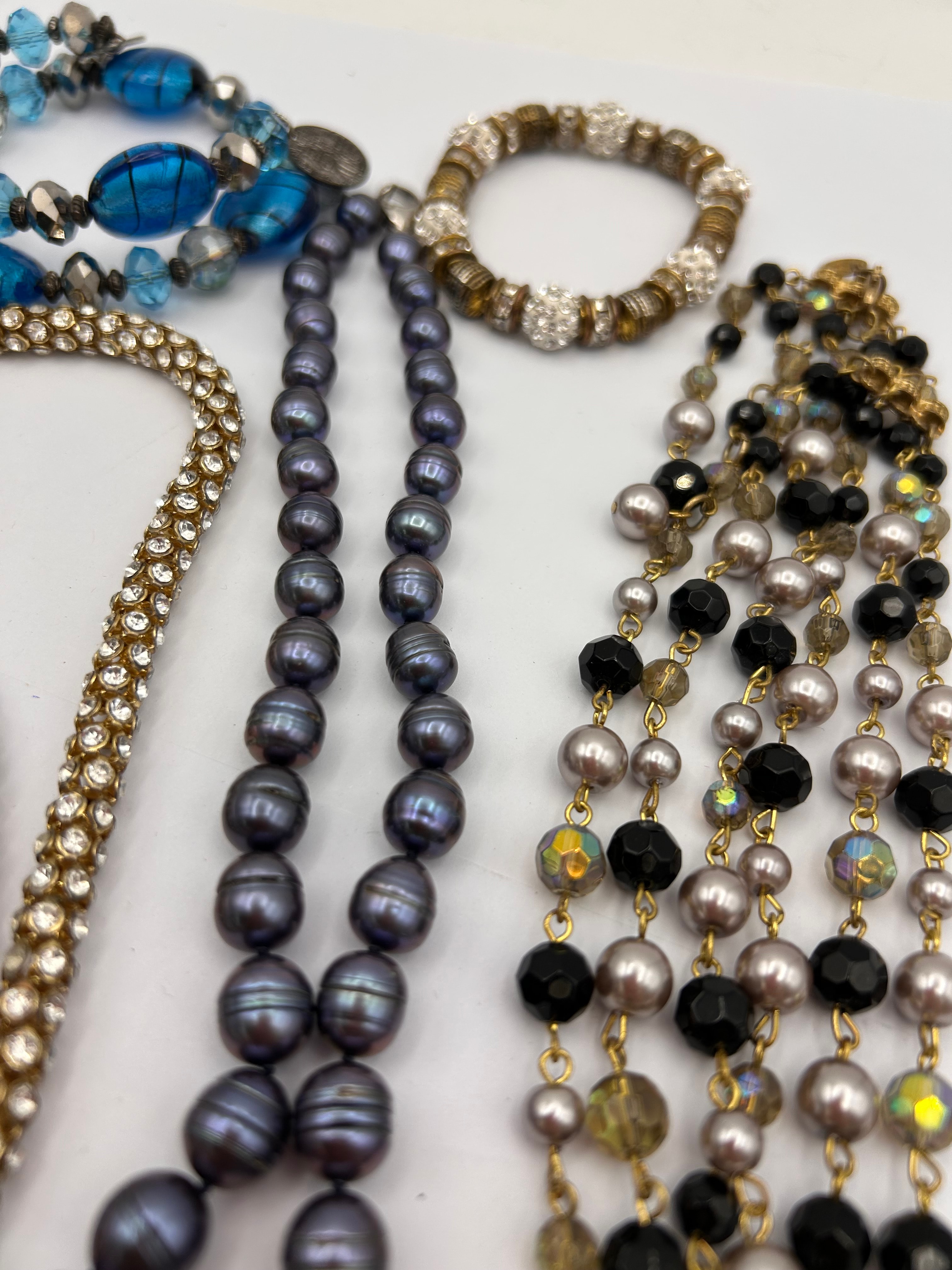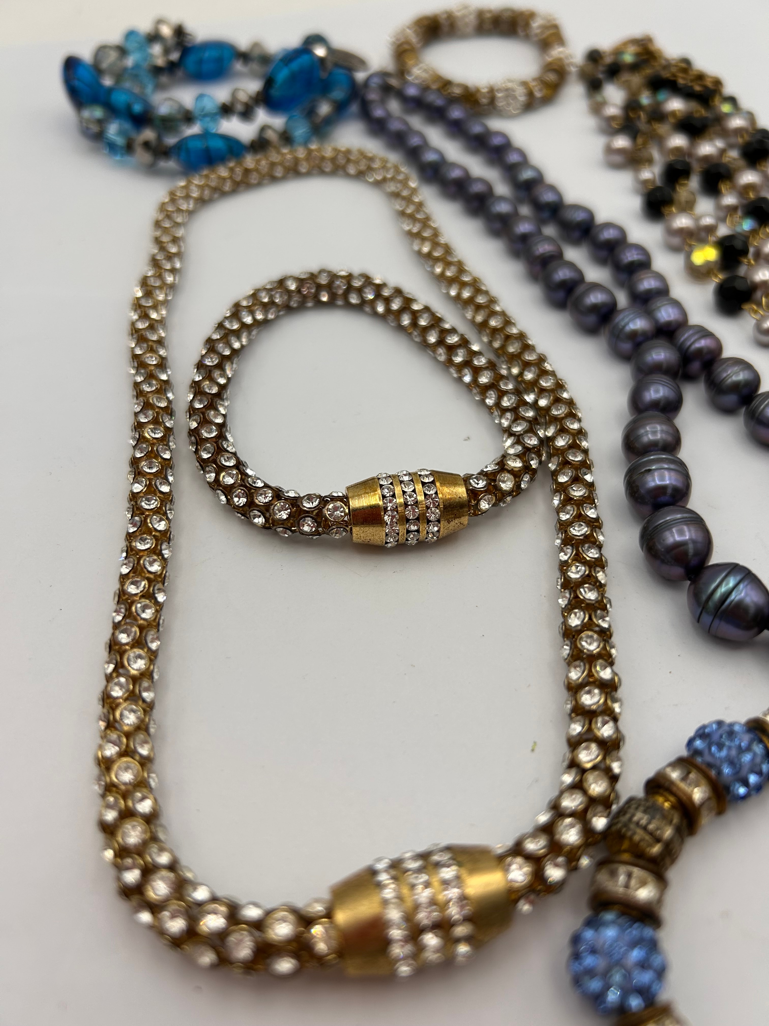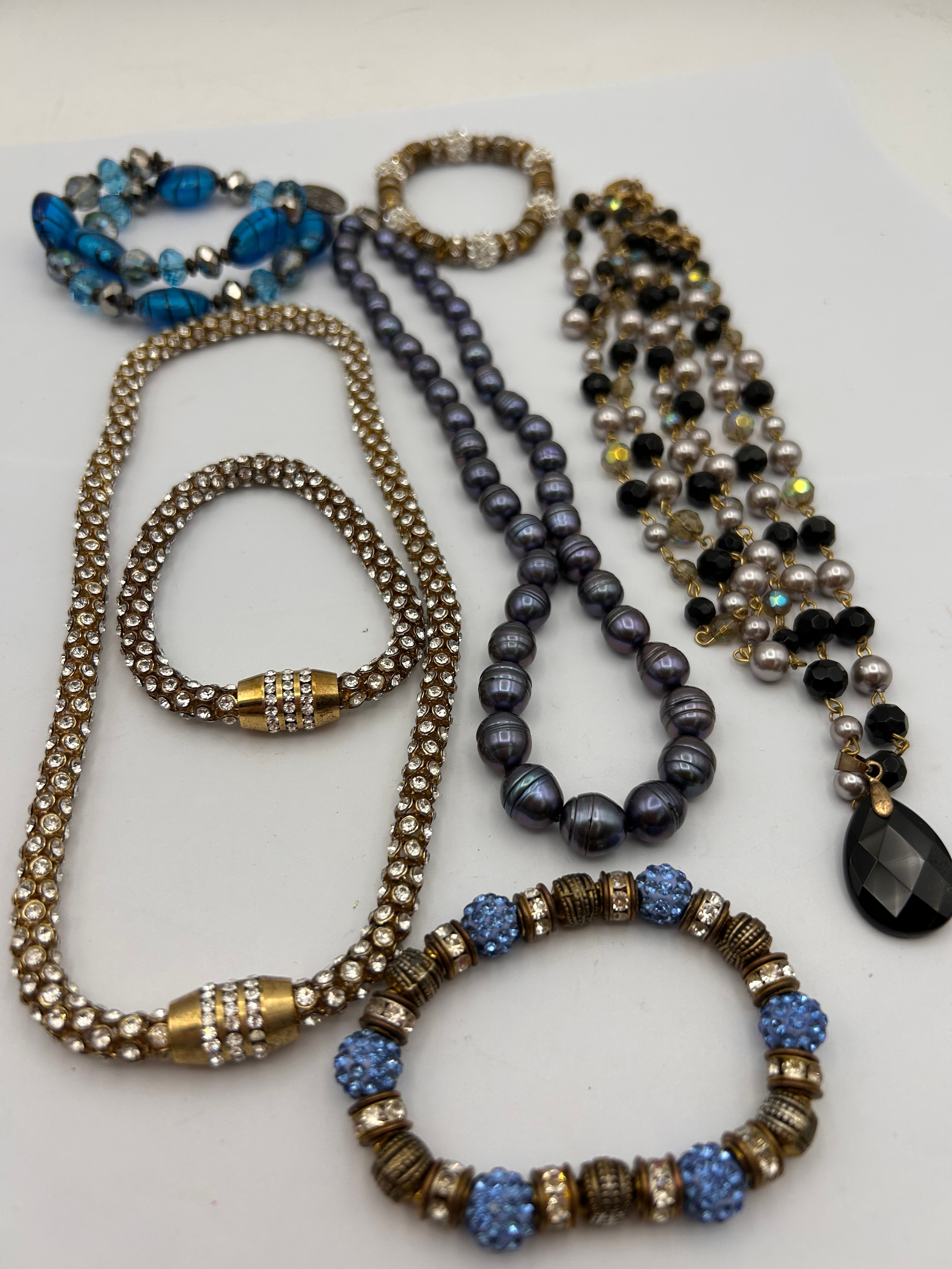 This lot comprises a collection of fashion jewelry, including several necklaces and bracelets. The items feature a mix of materials such as yellow-toned and silver-toned base metals, clear pavé-set rhinestones, dark iridescent oval beads (possibly freshwater pearls or glass), light gray/champagne faux pearls, black and iridescent faceted beads, and various blue glass or resin beads. One multi-strand necklace terminates in a large black teardrop pendant. A prominent set includes a wide necklace and a coordinating bracelet, both densely covered with clear rhinestones in a yellow-toned setting, featuring decorative magnetic or barrel clasps. No visible text or markings are discernible.