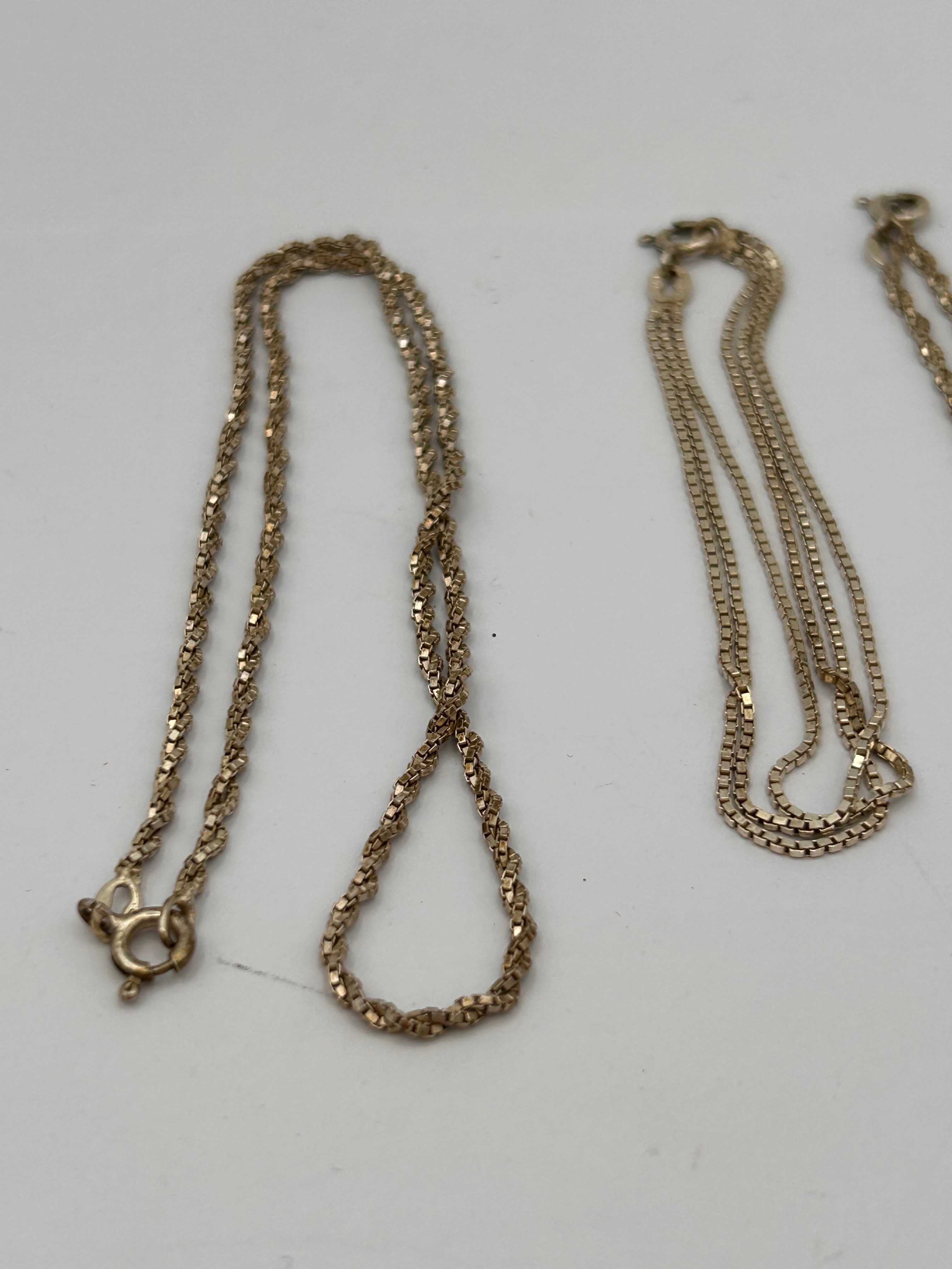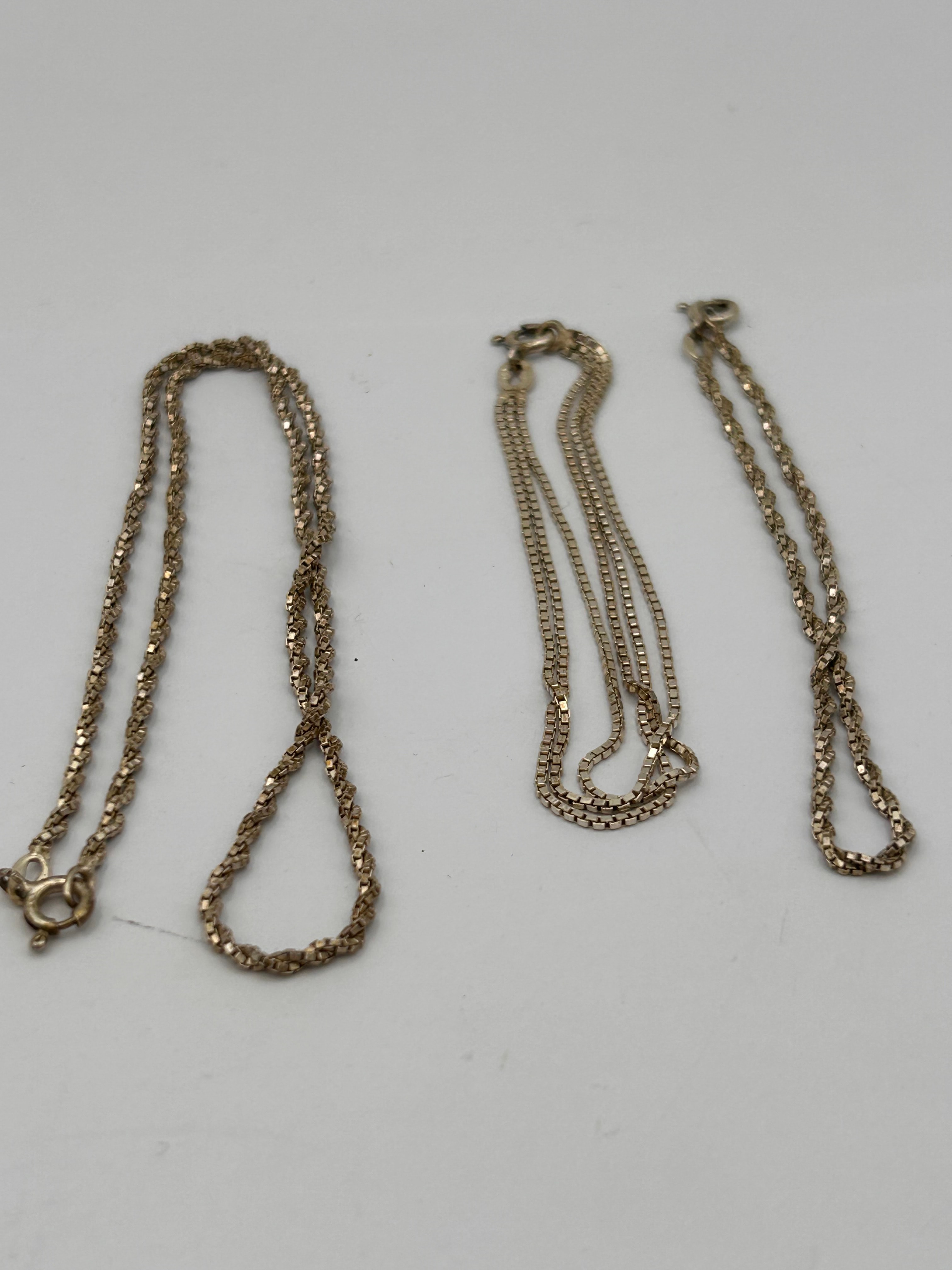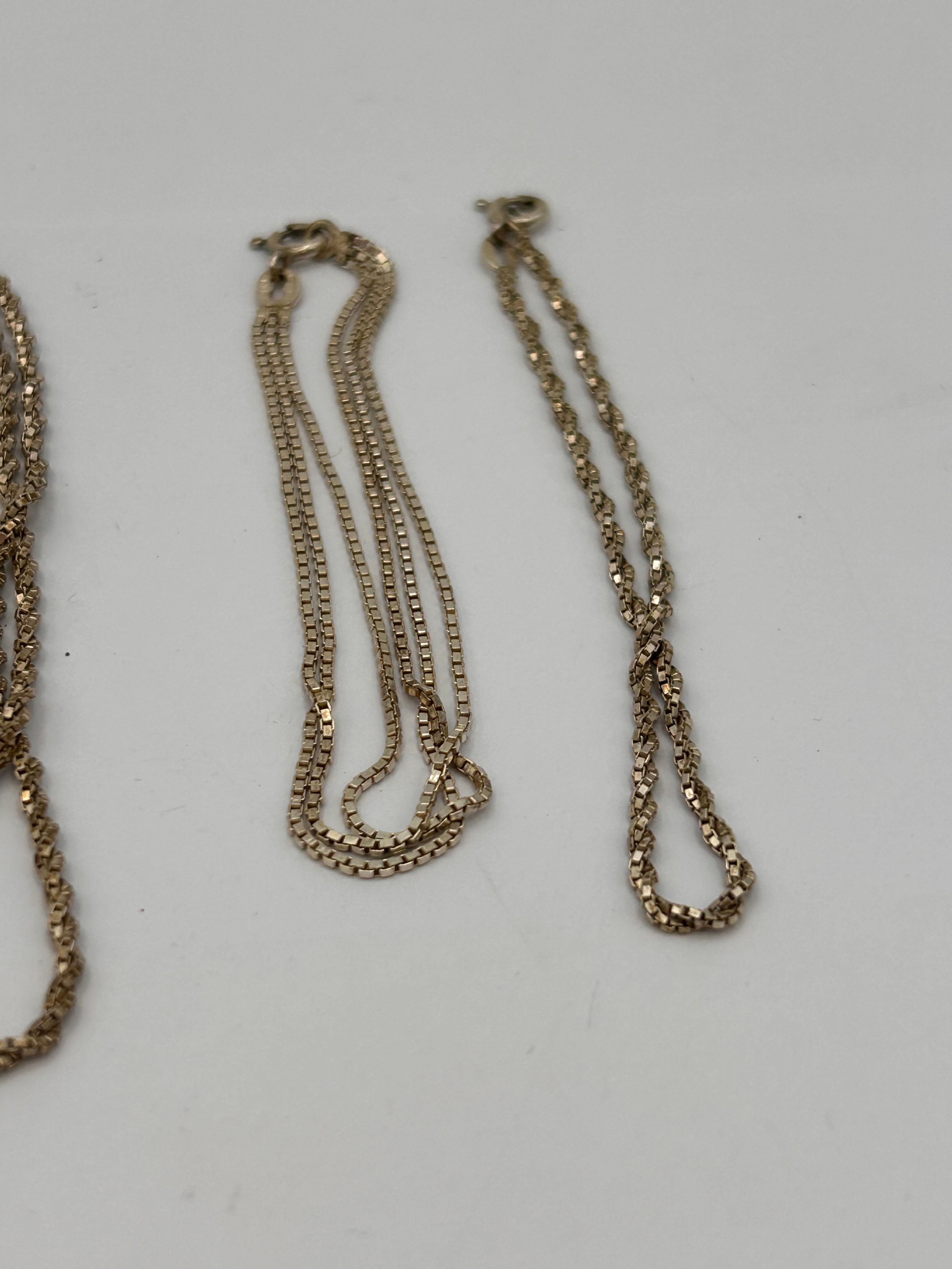A group of three yellow-toned silver chains. The lot comprises a fine twisted link chain, possibly a Singapore twist, with a spring ring clasp; a multi-strand necklace composed of several fine box chains (Venetian link), secured by a lobster-style clasp; and a single, finer twisted link chain, also equipped with a spring ring clasp. No visible hallmarks or inscriptions are apparent on any of the pieces.
