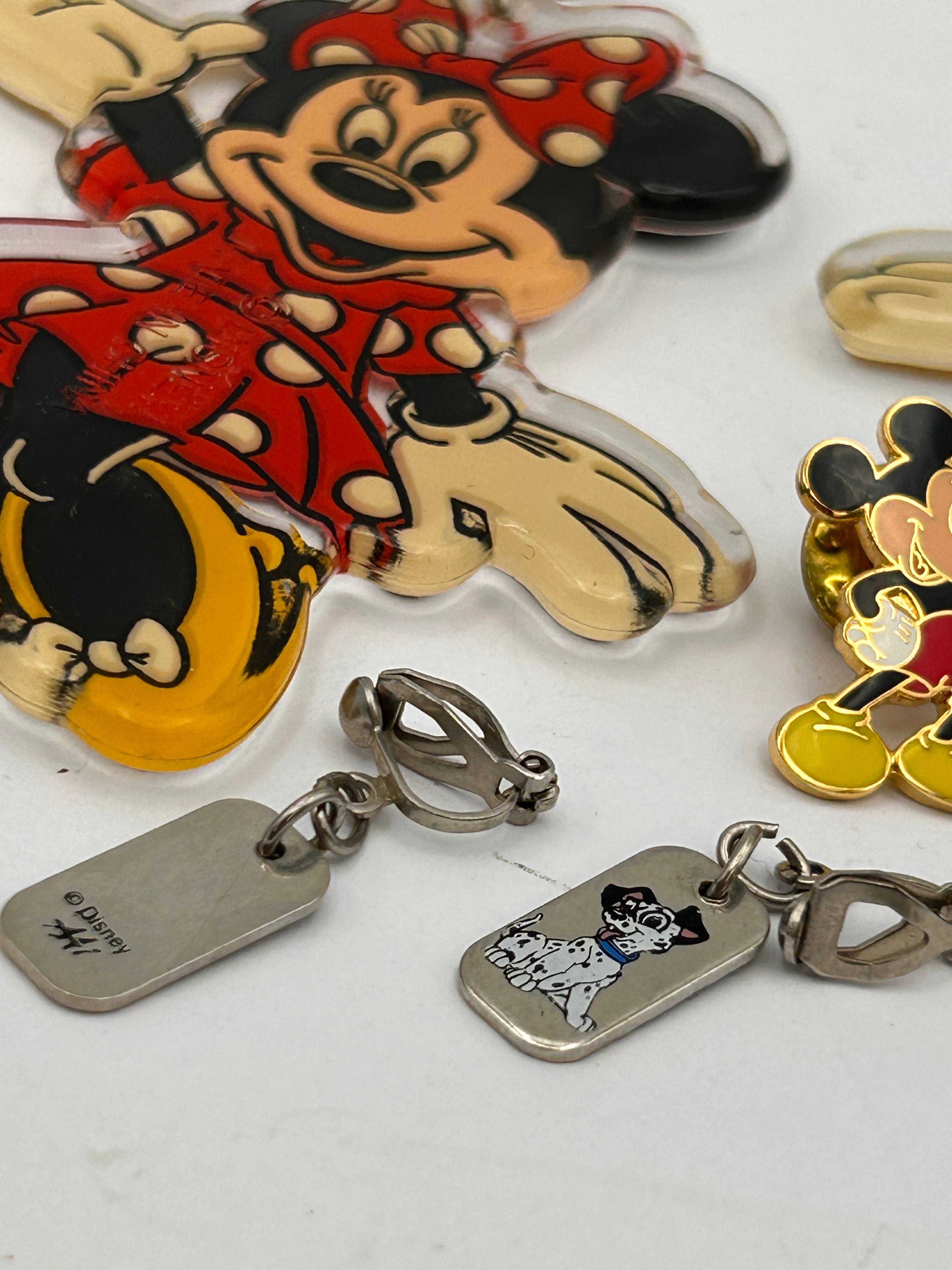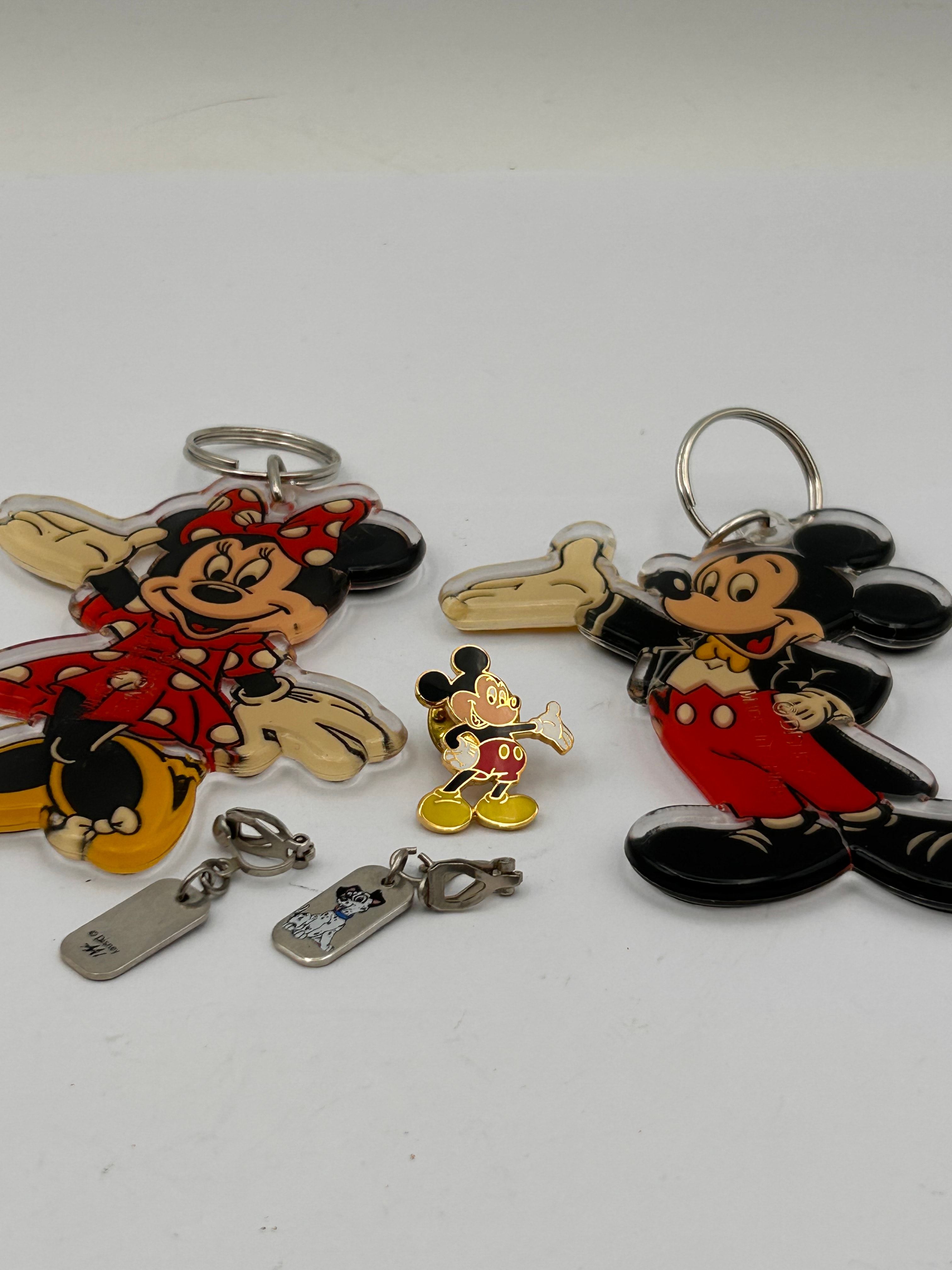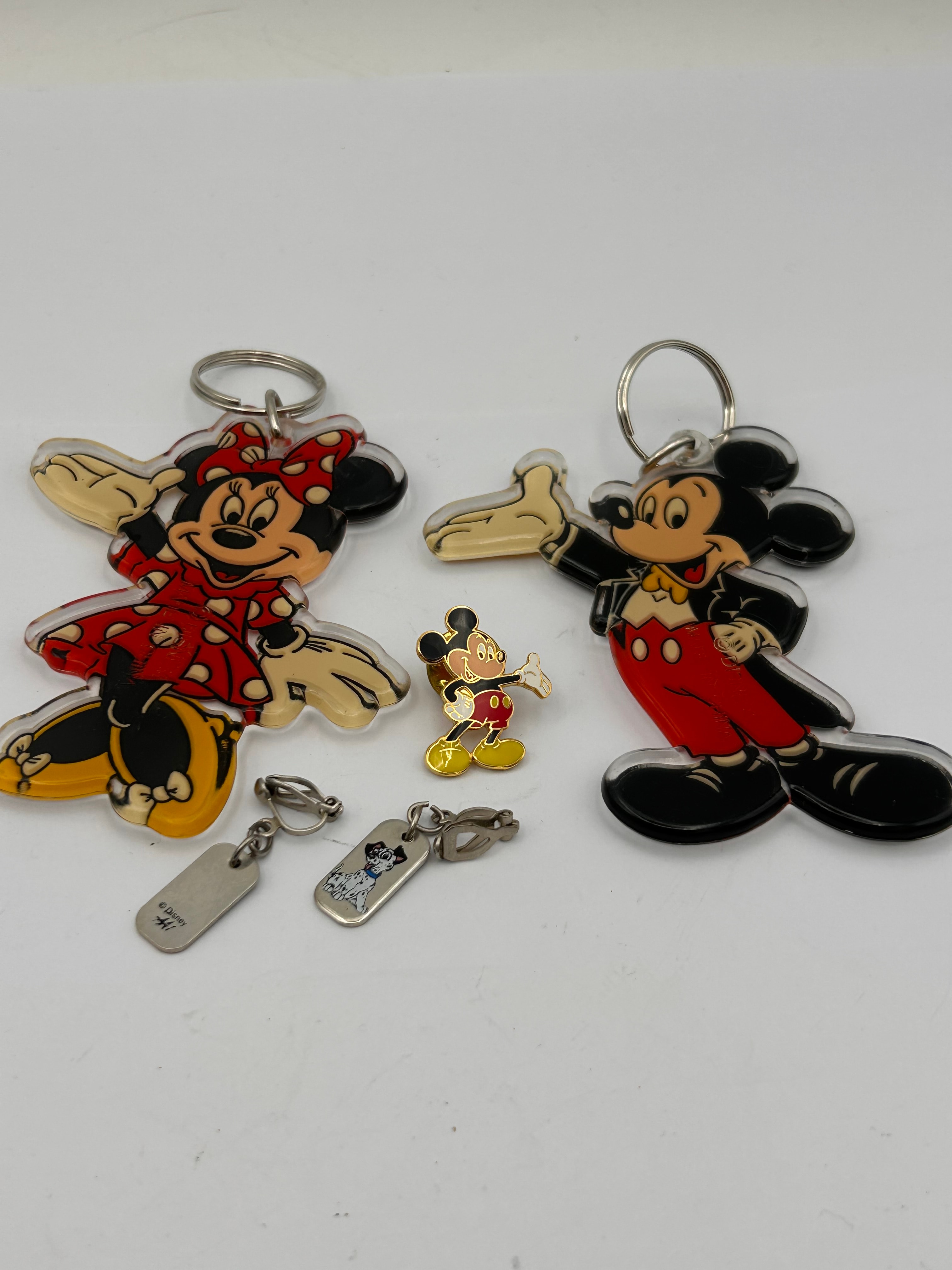 A collection of vintage Disney merchandise, primarily comprising two large, flat, clear acrylic keychains depicting full-body figures of Minnie Mouse in a red polka-dot dress and Mickey Mouse in a red and black suit, each with a metal split ring. These keychains are consistent with ‘Vintage Disney Mickey and Minnie Acrylic Keychain’ items found in online marketplaces, likely dating to the 1990s and sold as Walt Disney World or Disneyland Resort souvenirs. Also included is a smaller metal lapel pin of classic Mickey Mouse with enamel accents, two small silver-toned metal clip-on charms (one featuring a 101 Dalmatians puppy and the other a rectangular tag stamped ‘© Disney’), and a small, stylized gold-toned plastic charm.