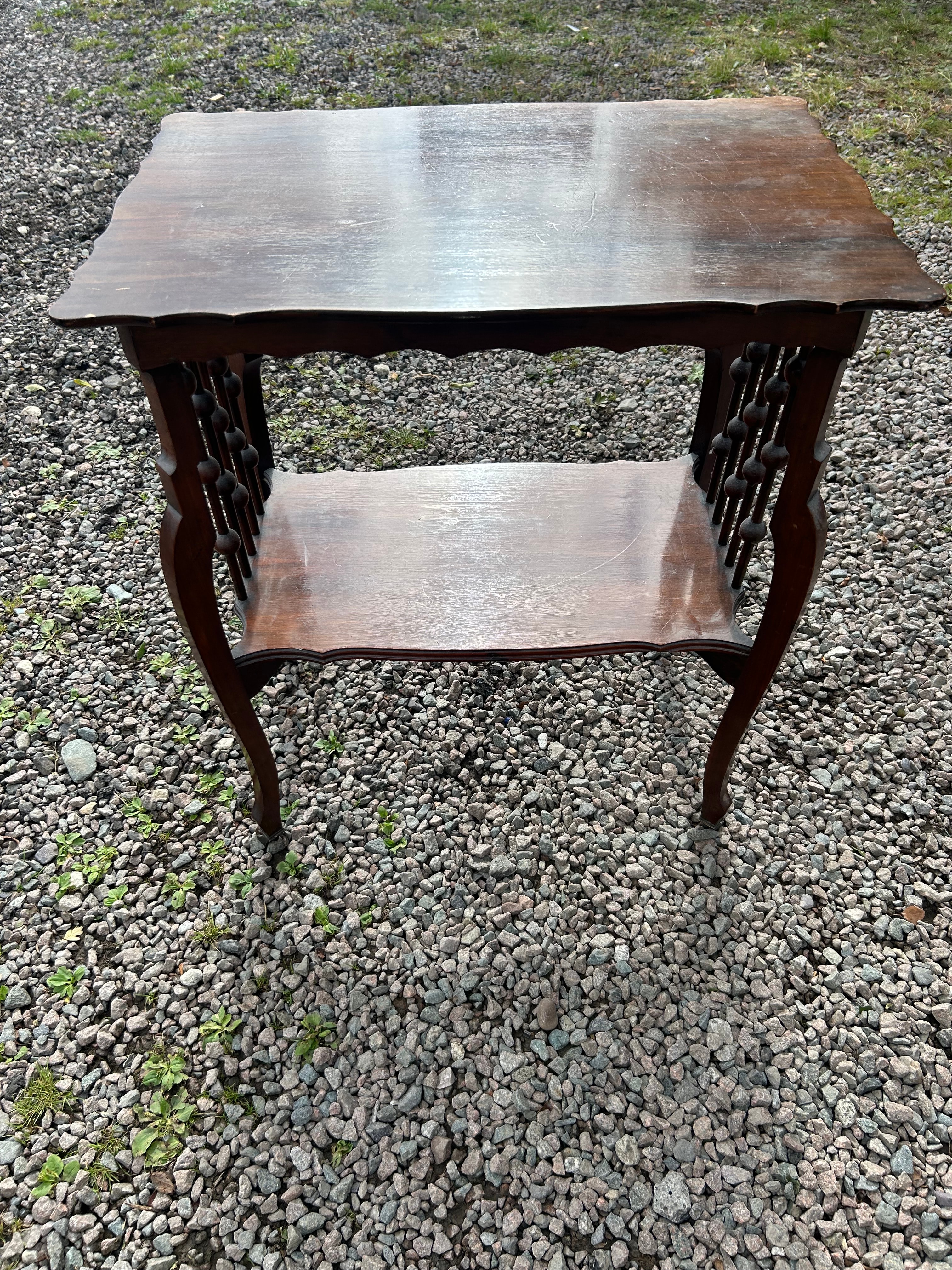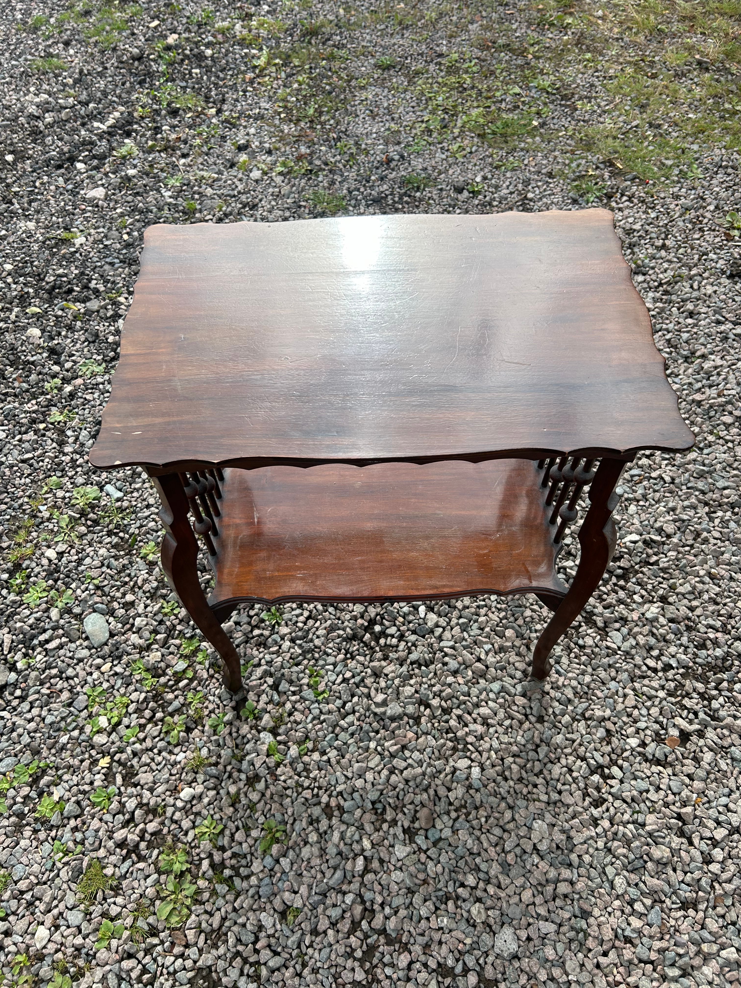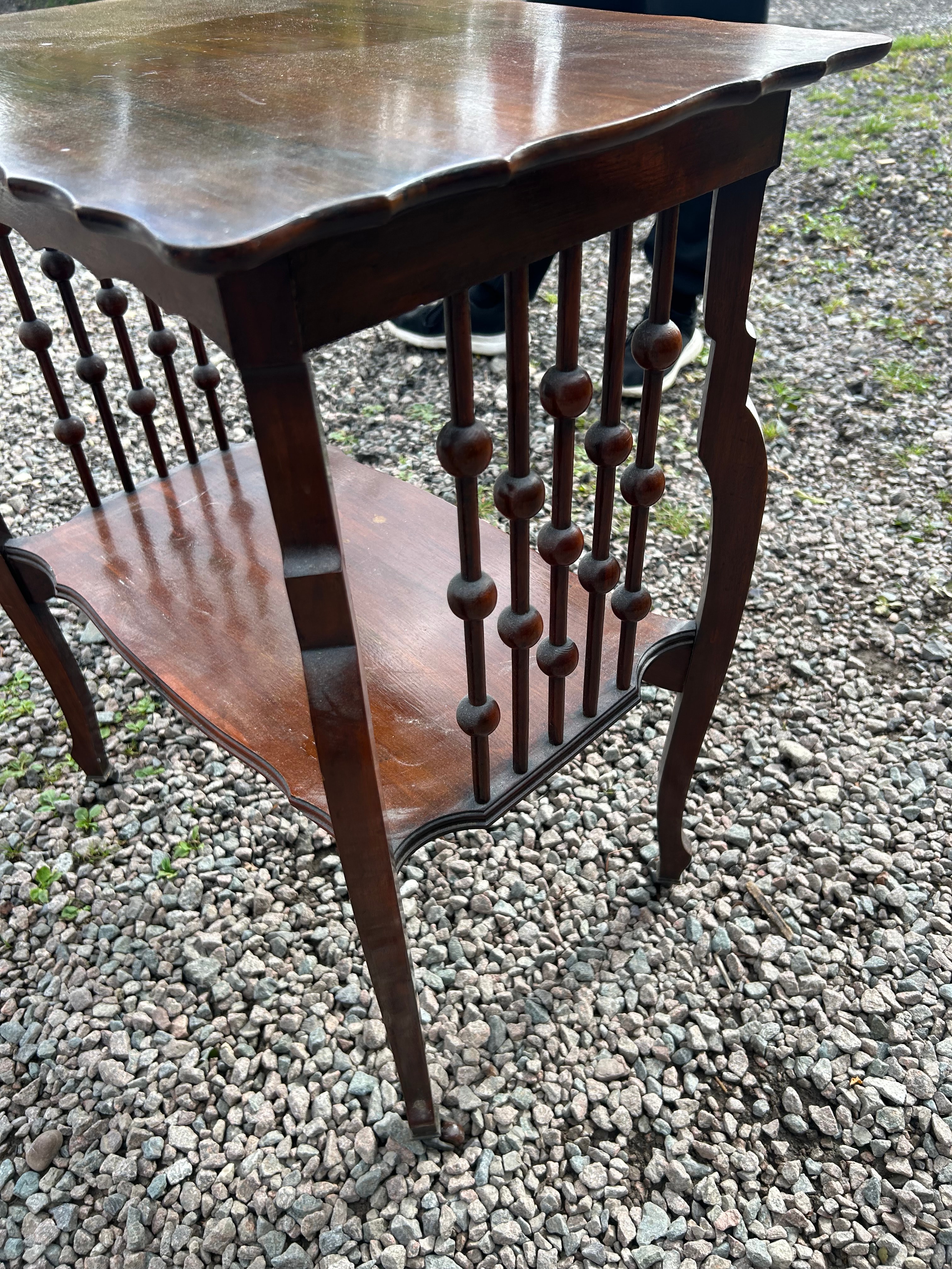 An Edwardian two-tiered occasional table, crafted from a dark reddish-brown hardwood, likely mahogany. The table features a rectangular top and a lower shelf, both exhibiting subtly scalloped or serpentine edges. The open sides between the two tiers are adorned with decorative turned spindles, some incorporating distinctive ball-form elements. The four slender legs are gently curved.