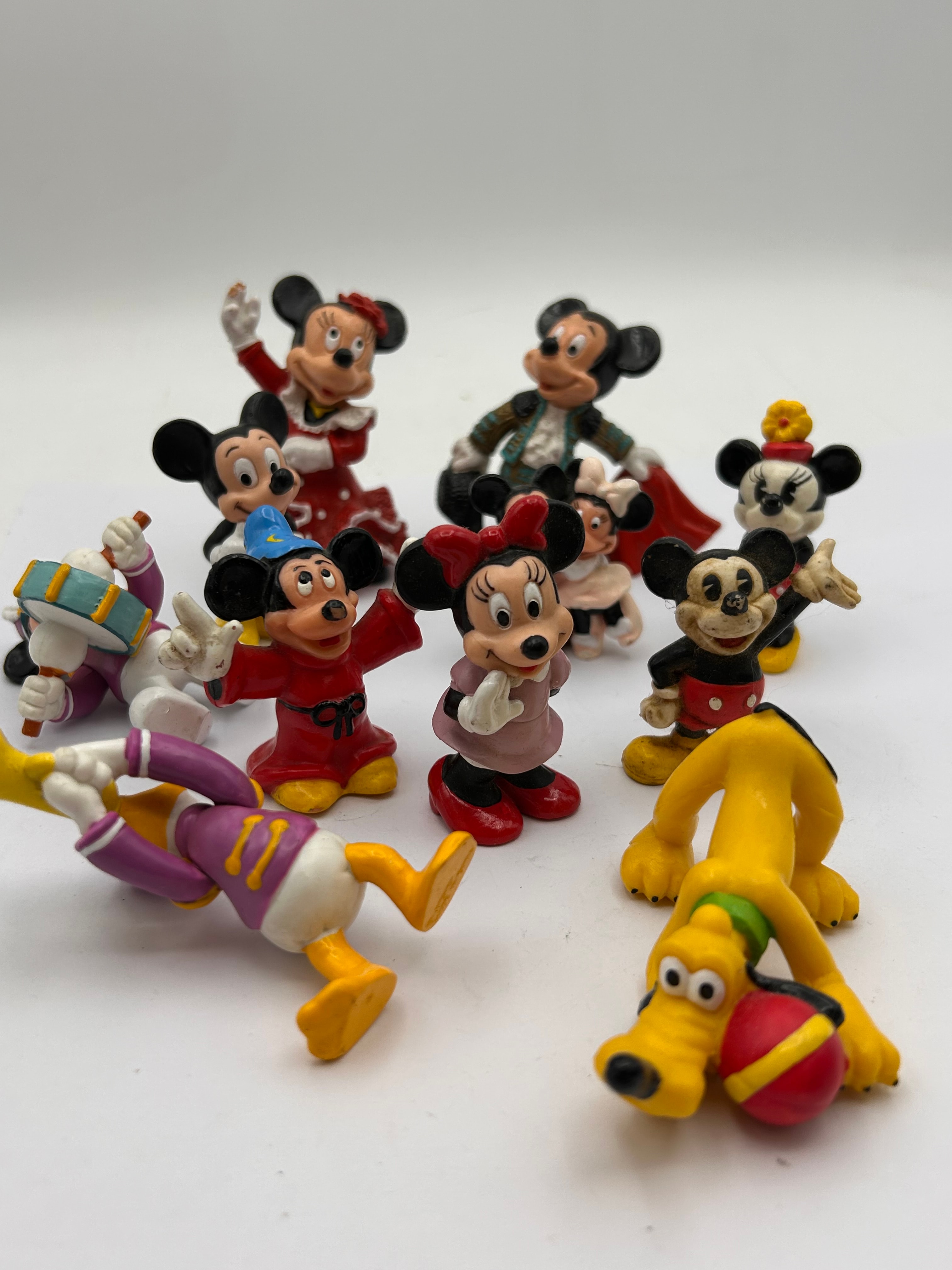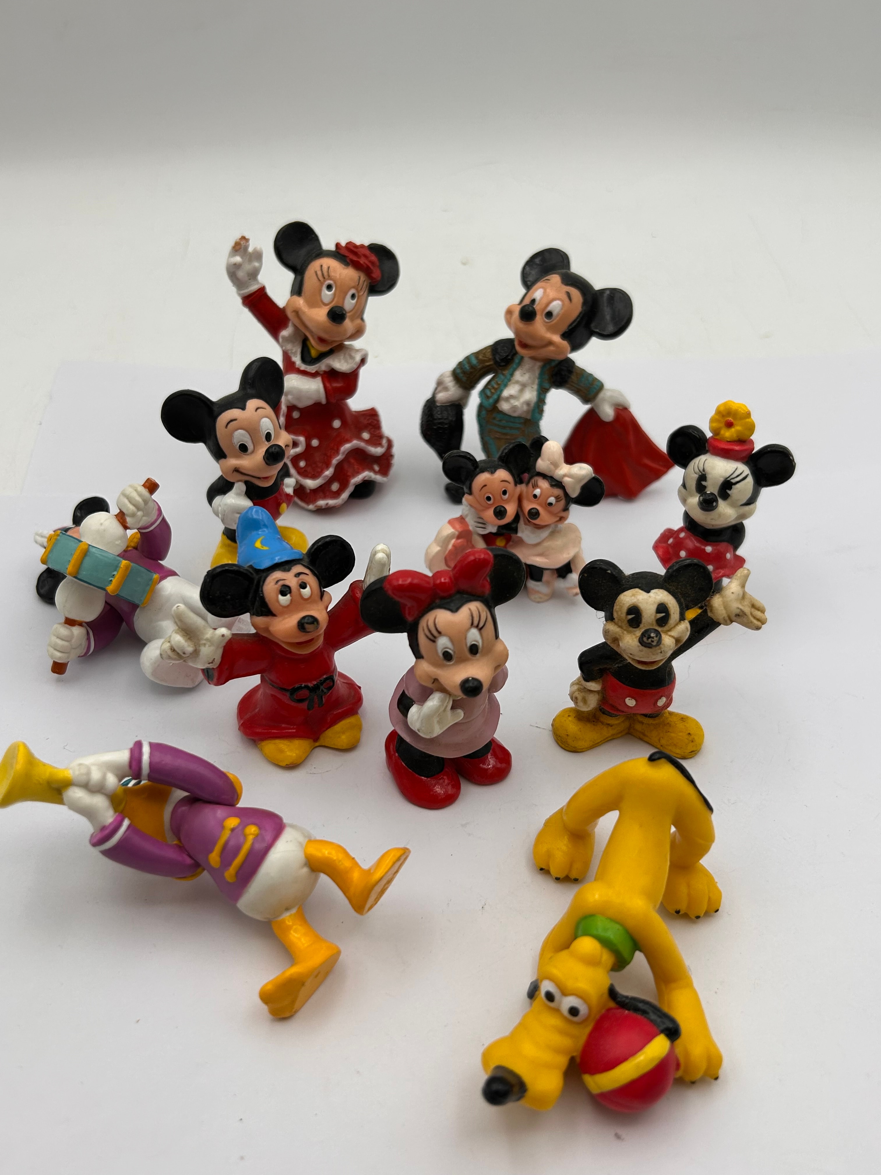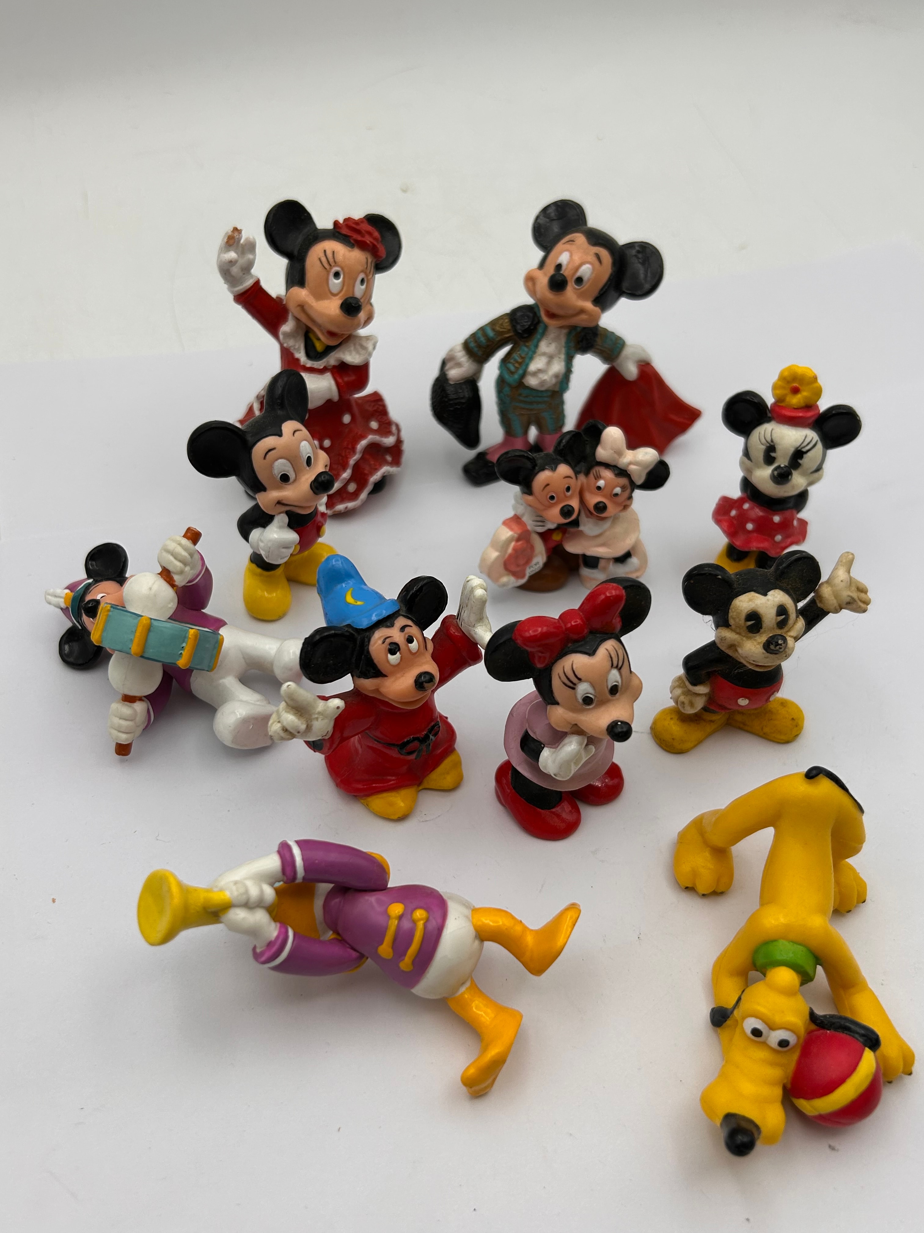 A lot of 12 Disney Mickey Mouse & Friends figures. This collection comprises brightly colored character figurines, predominantly depicting Disney characters, molded from what appears to be plastic or resin and hand-painted in various hues. The collection includes multiple variations of Mickey Mouse (one as a matador with a red cape, another as a sorcerer in a blue hat and red robe, and one in classic red shorts), Minnie Mouse (one in a red polka-dot dress, another in a pink dress, and a smaller one in a yellow hat), Donald Duck playing a horn, and Pluto with a red and yellow ball. Also present is a white-bodied character with Mickey-like ears playing a blue drum, and a single figurine depicting a smaller Mickey and Minnie embracing. The figurines exhibit a consistent style, likely produced as a set or series. No visible text or manufacturer markings are discernible.