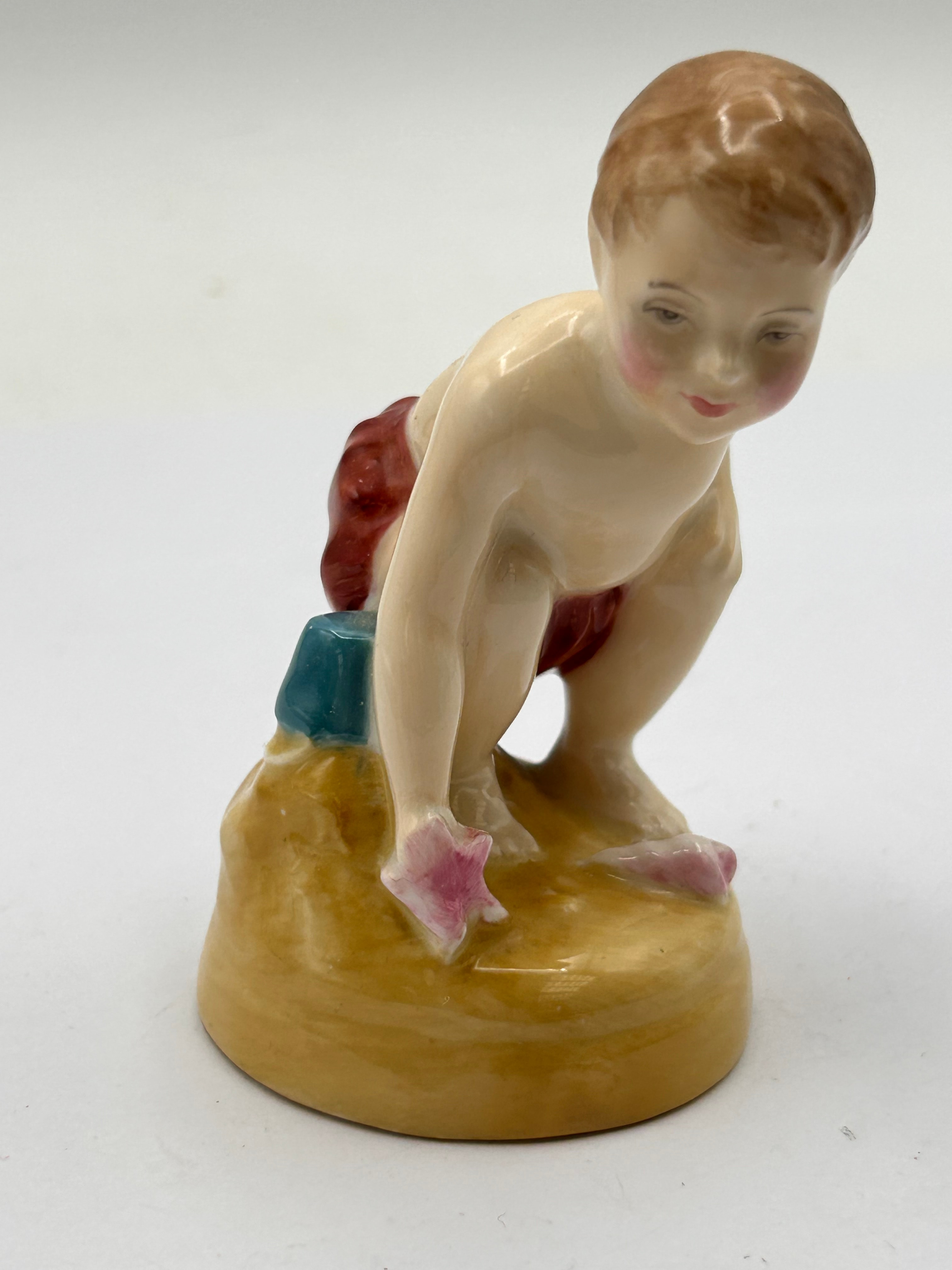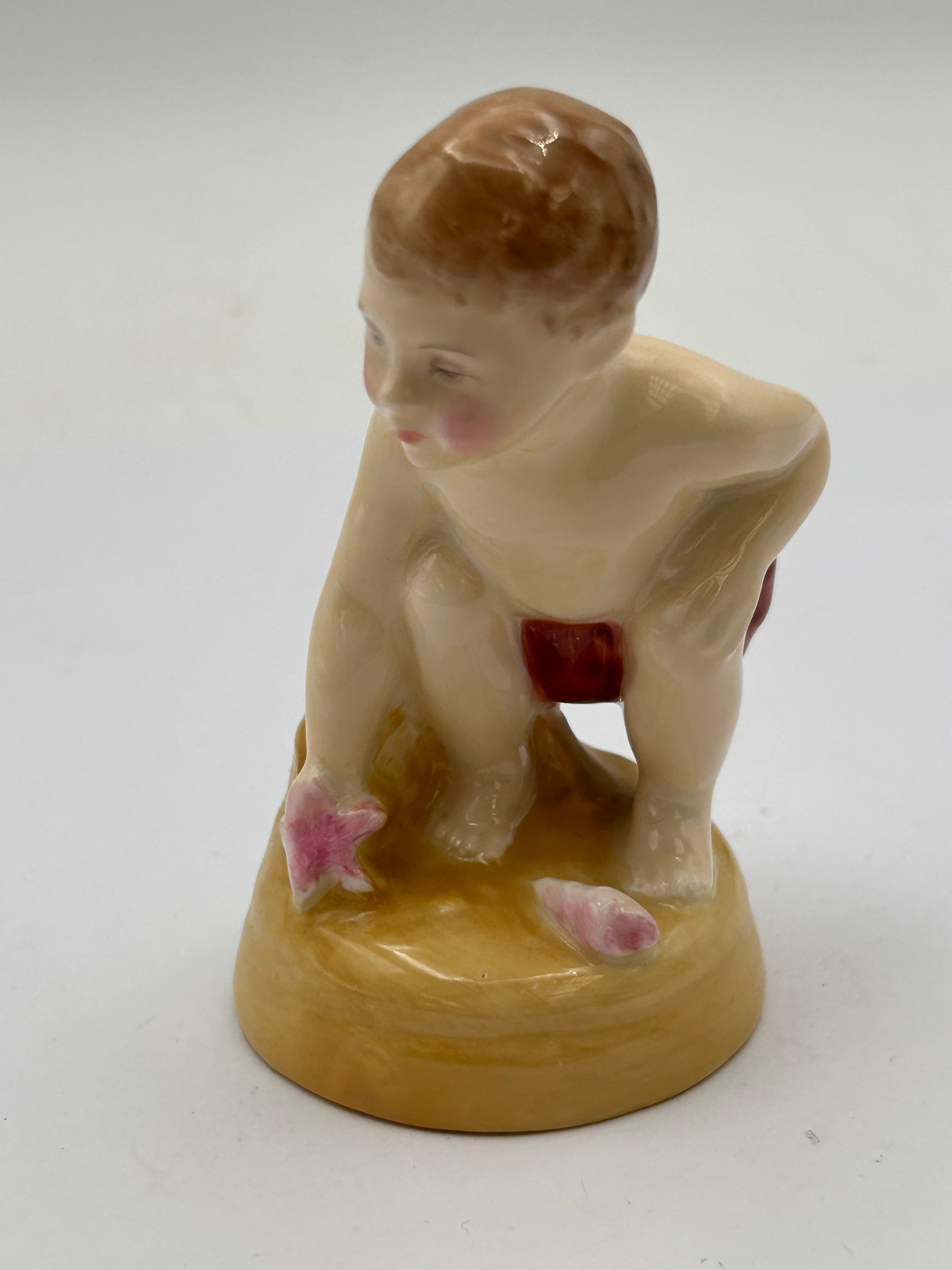 A Royal Doulton ‘Sea Shore’ figurine, model number HN 2663, copyrighted 1960. Crafted from fine bone china in England, this figurine depicts a young boy with reddish-brown hair and rosy cheeks, wearing red swimming trunks. He is shown crouching on a sandy-colored base, holding a pink starfish, with a blue bucket and another pink shell nearby, creating a beach scene. The base features the green Royal Doulton England maker’s mark, ‘Fine Bone China,’ ‘Made in England,’ ‘Doulton & Co. Limited,’ the model number HN 2663, the copyright year 1960, multiple ‘Rd No’ registration numbers, a handwritten ’33,’ and a small blue dot.