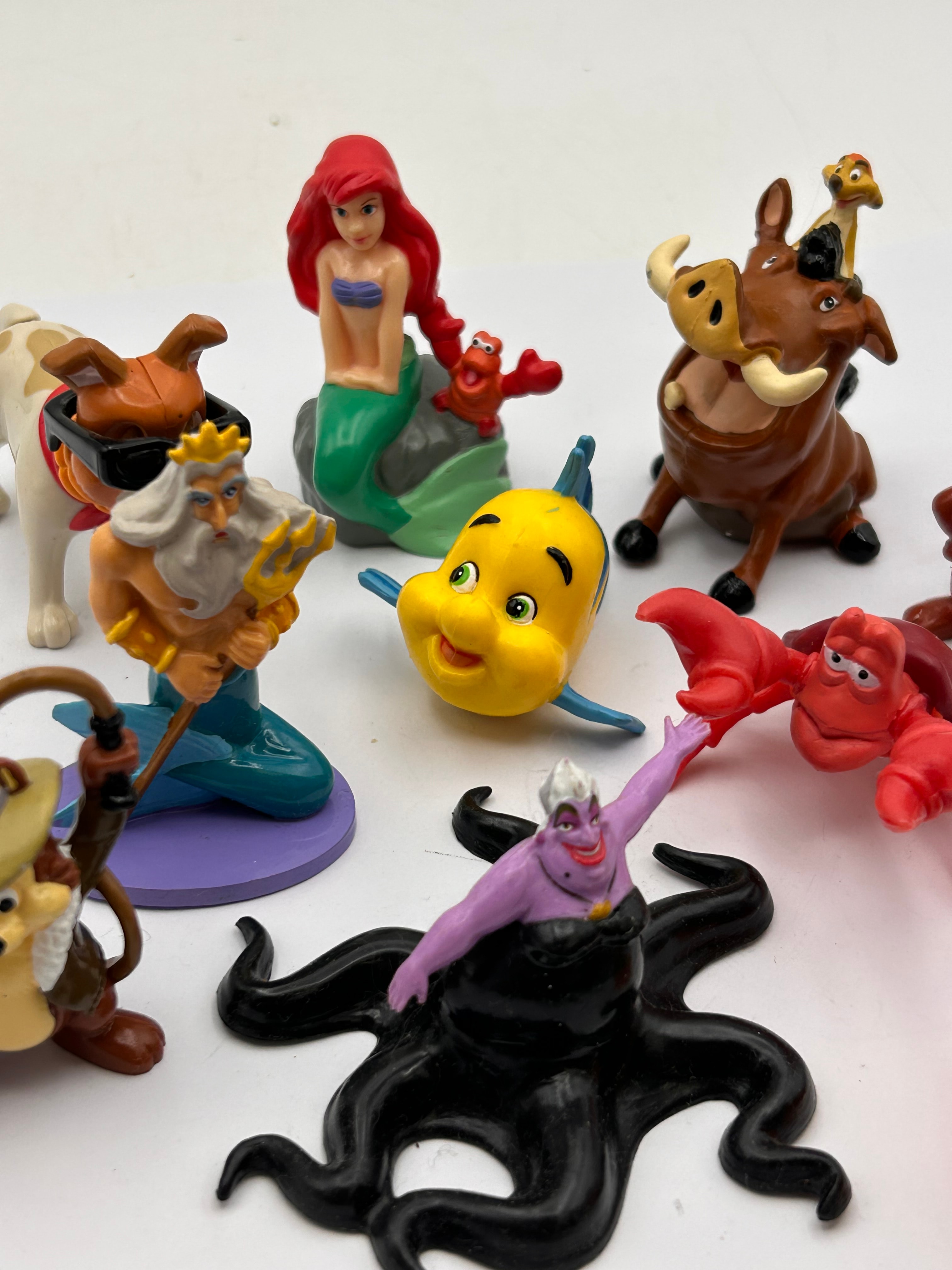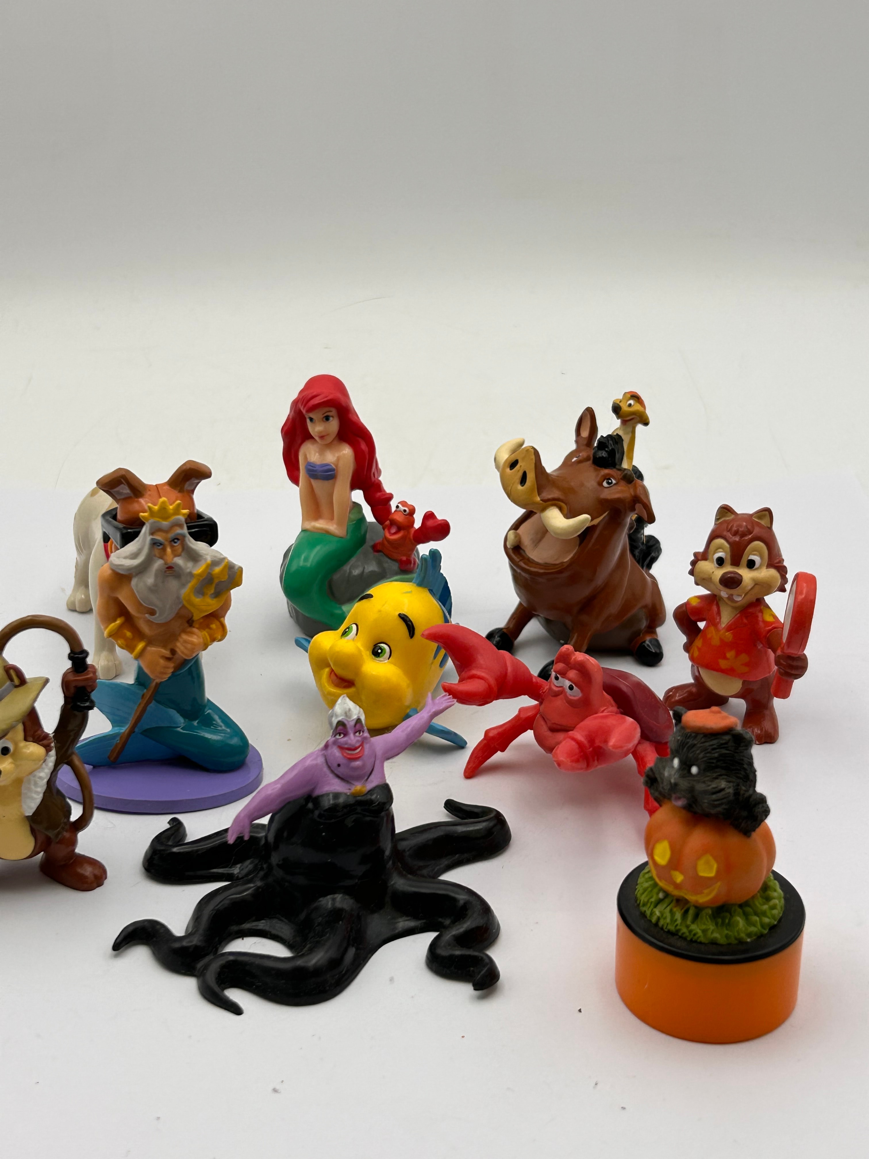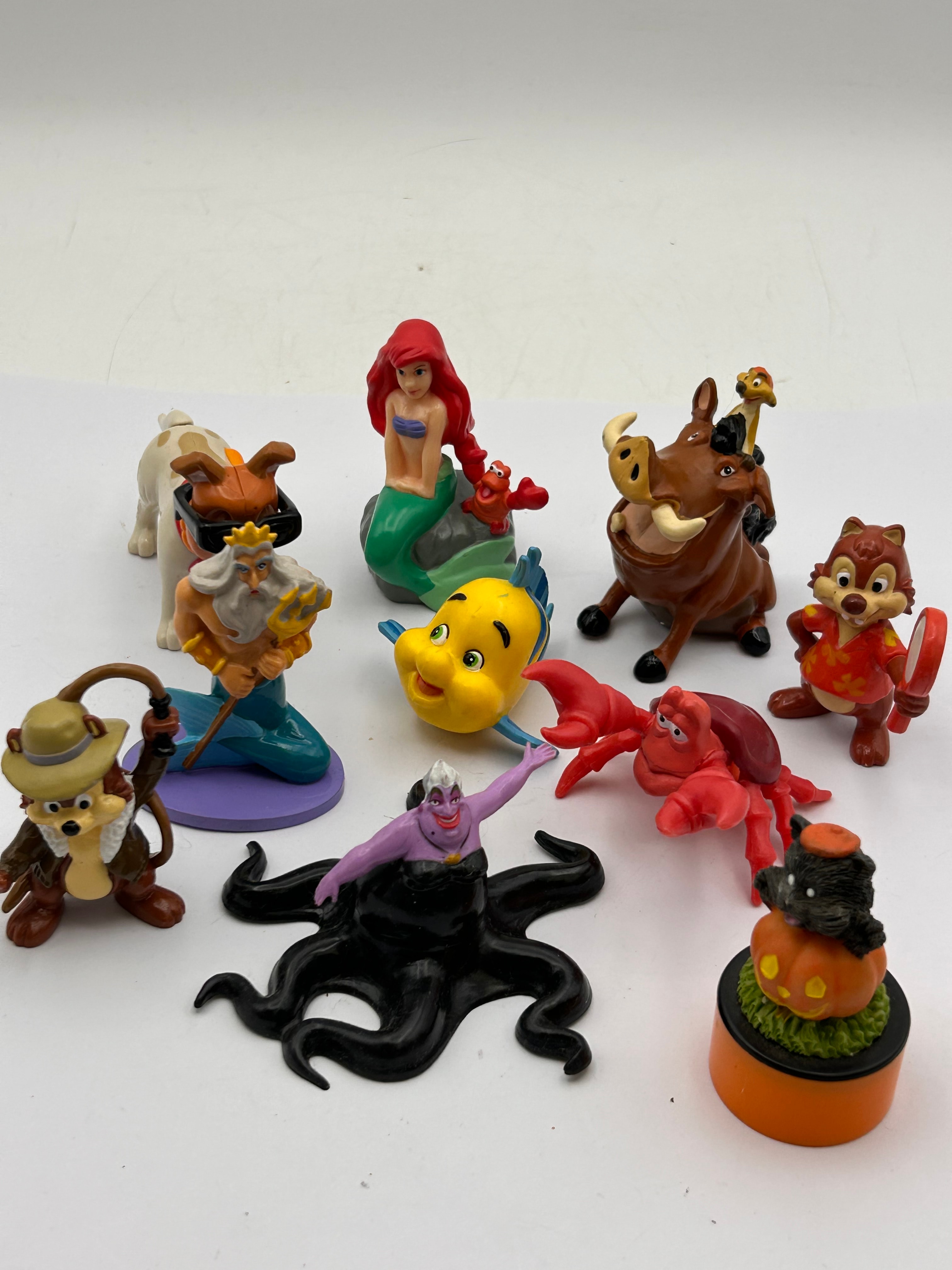 A collection of Disney PVC figures, predominantly depicting characters from various Disney animated films including Ariel, King Triton, Ursula, Flounder, and Sebastian from ‘The Little Mermaid’; Pumbaa with Timon from ‘The Lion King’; and Chip from ‘Chip ‘n Dale’. The group also includes a dog wearing sunglasses, a squirrel-like figure with a fishing rod, and a black cat atop a Halloween-themed pumpkin base. These modern-style figurines, likely produced in the late 20th or early 21st century, are made of molded plastic. No discernible text or manufacturer markings are visible.