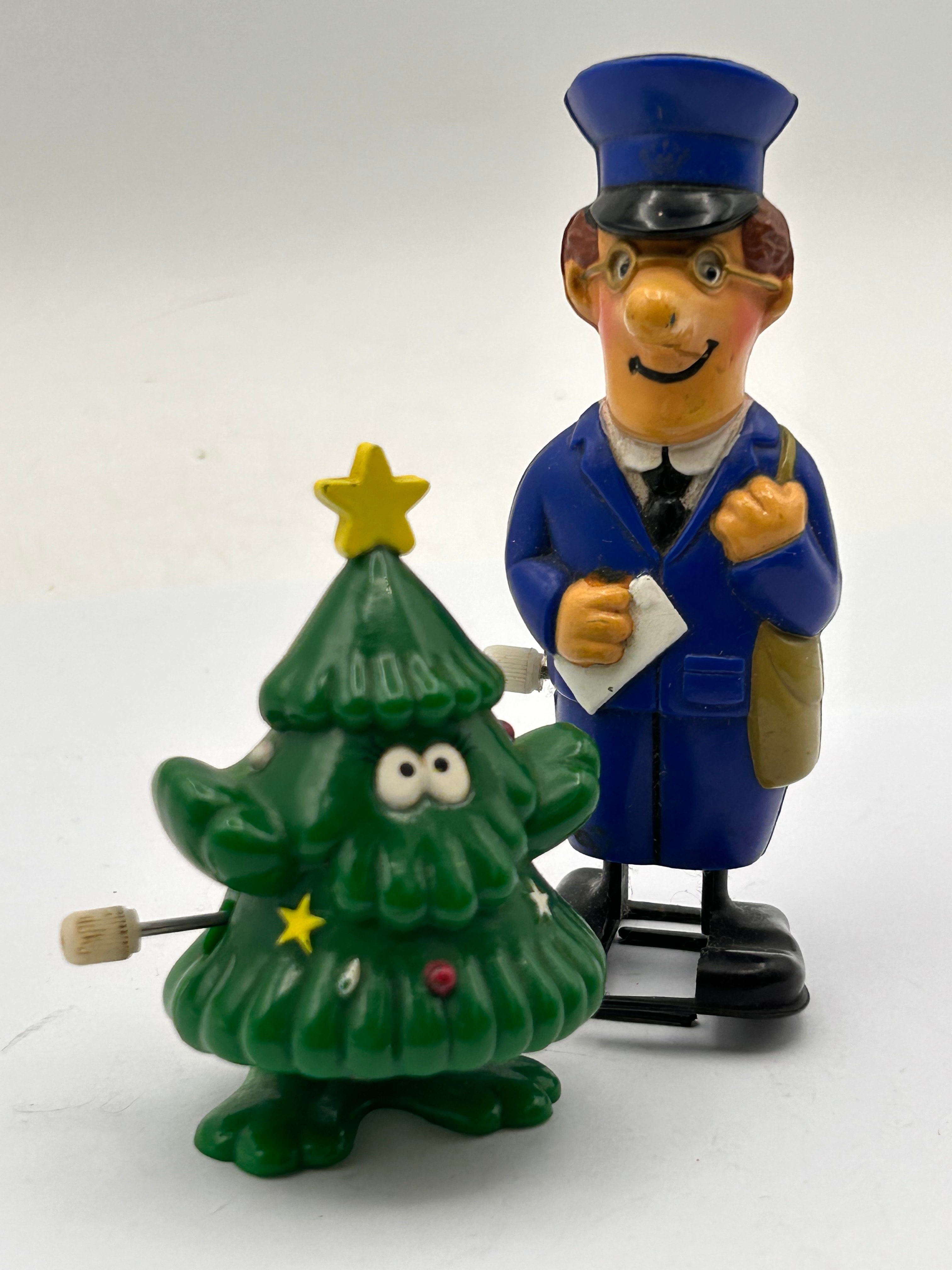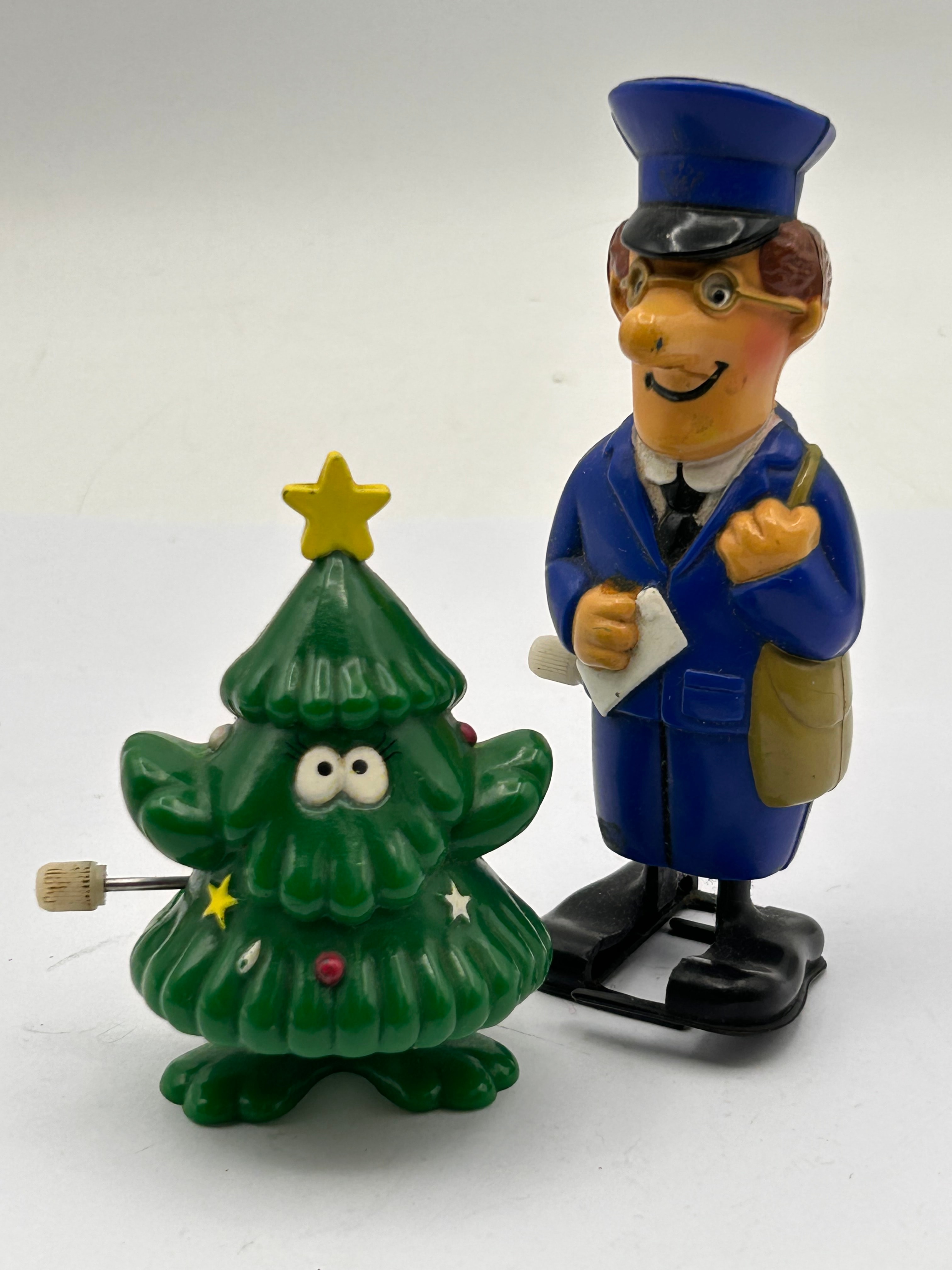 A group of two vintage plastic wind-up novelty toys, including a Russ Berrie Hopping Christmas Tree Wind-Up Toy and a Walking Postal Figure Wind-Up Toy. The green molded plastic Christmas tree figure is adorned with yellow stars and small red and white spherical ‘ornaments,’ featuring cartoon eyes and a mouth, with a visible wind-up key protruding from its left side. The male figure is dressed in a blue postal uniform with a matching hat, glasses, and a brown satchel, holding a white letter; this figure is also constructed from molded plastic and features visible black ‘feet’ suggesting a walking mechanism.