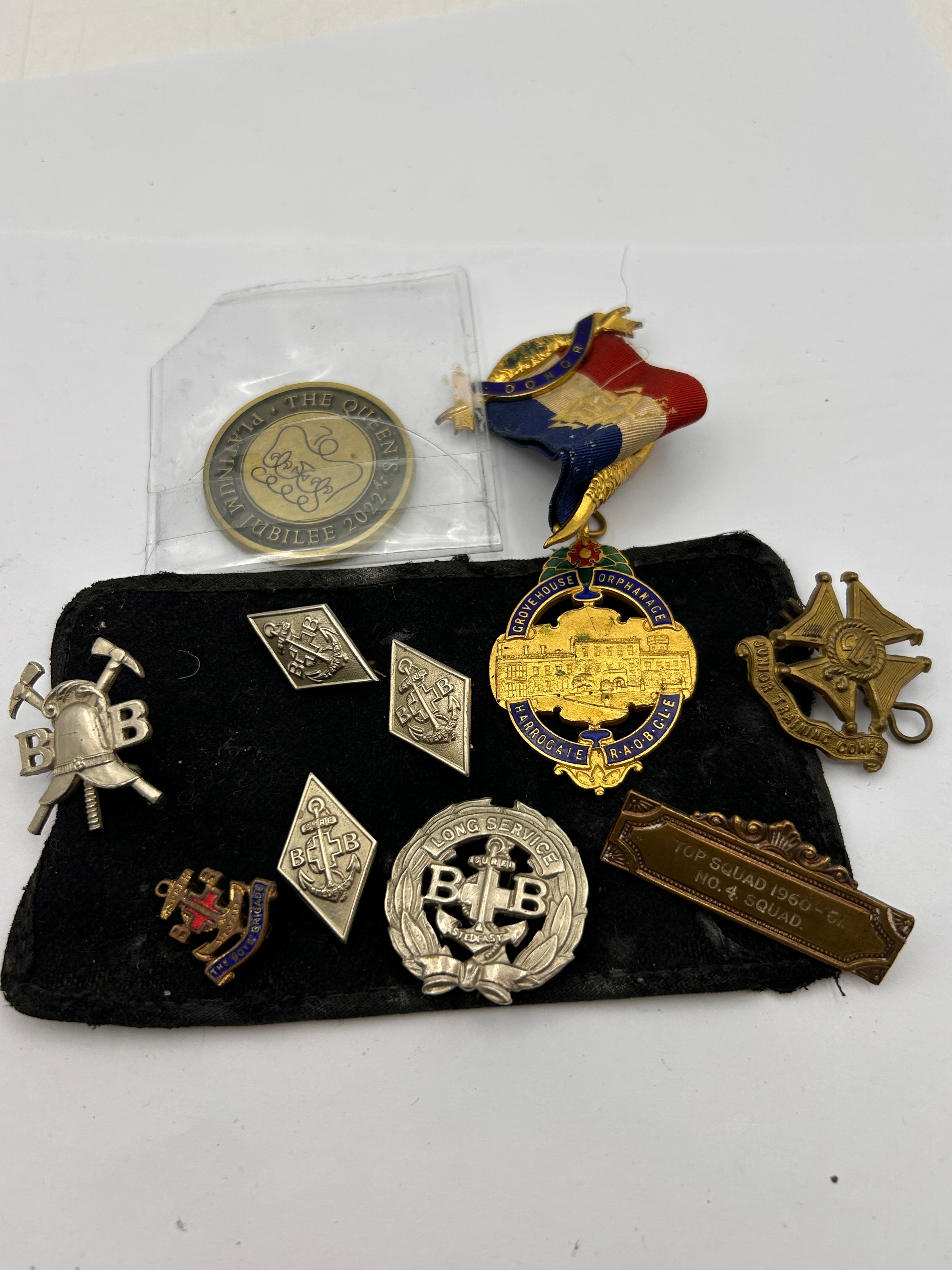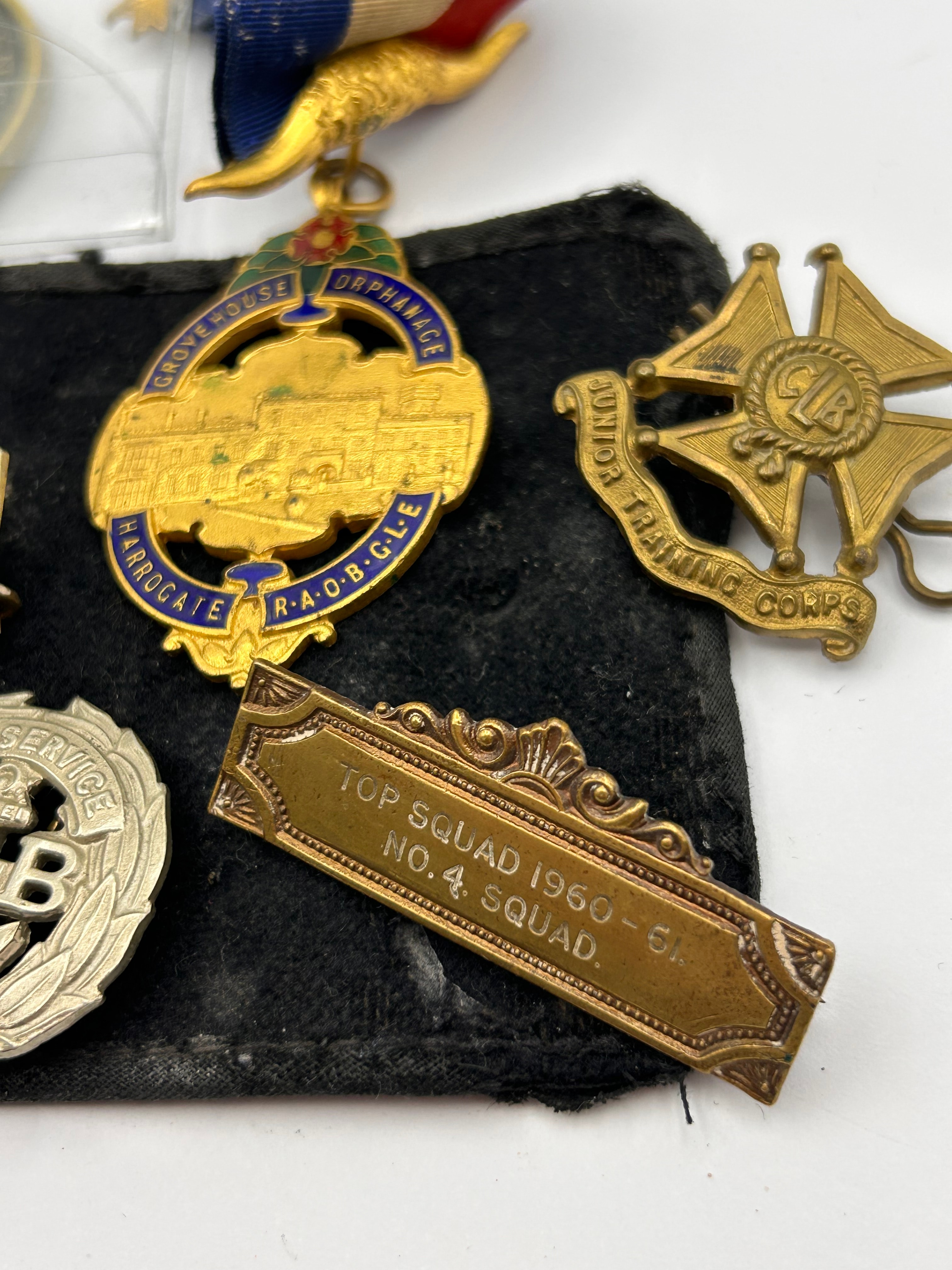 A collection of approximately ten badges, medals, and a commemorative coin, predominantly relating to the Boys’ Brigade and other fraternal and service organizations, displayed on a black velvet-like surface. Noteworthy pieces include various silver-tone badges, some diamond-shaped with “B+B” and anchor motifs, a “LONG SERVICE” badge, a star-shaped “CHURCH LADS BRIGADE TRAINING CORPS” badge, and a rectangular brass bar engraved “TOP SQUAD 1960-61 NO. 4 SQUAD”. A gold-toned medal with a red, white, and blue ribbon features “GROVE HOUSE ORPHANAGE HARROGATE R.A.O.B. G.L.E.” (Royal Antediluvian Order of Buffaloes, Grand Lodge of England). A modern “THE QUEEN’S PLATINUM JUBILEE 2022” commemorative medallion, in excellent condition within a plastic sleeve, is also present. Materials consist primarily of brass, bronze, and silver-tone base metals, with some enamel detailing.