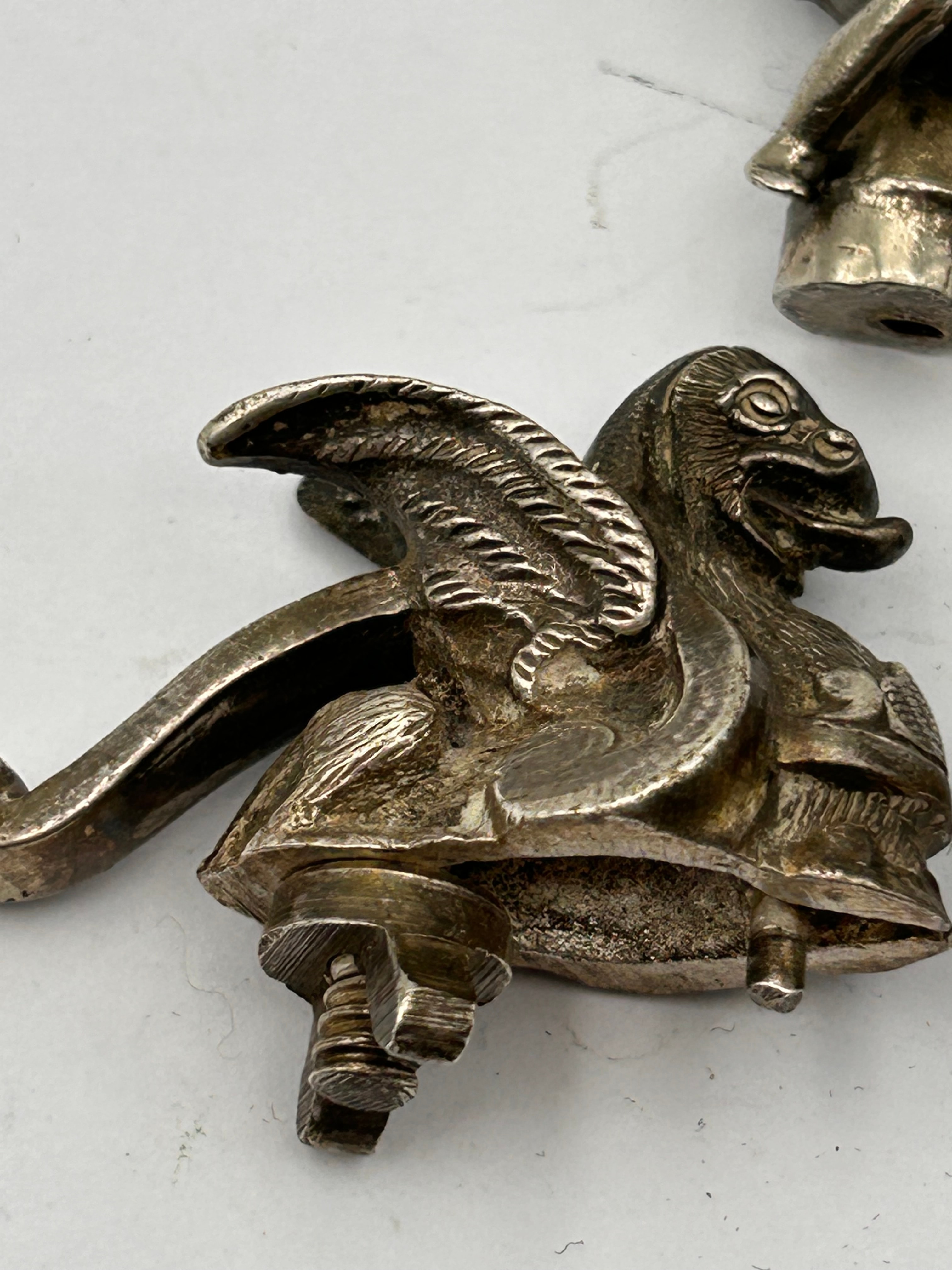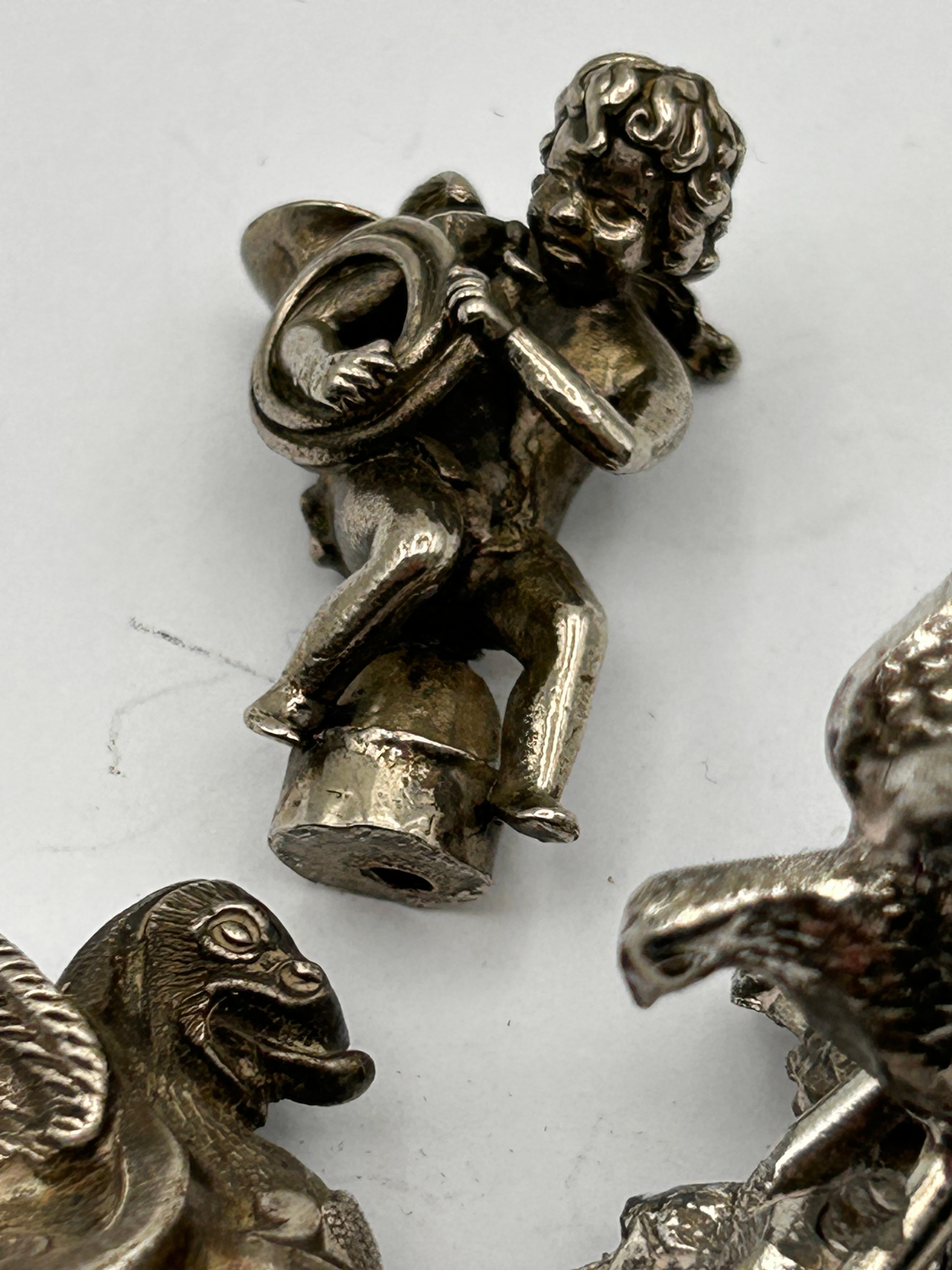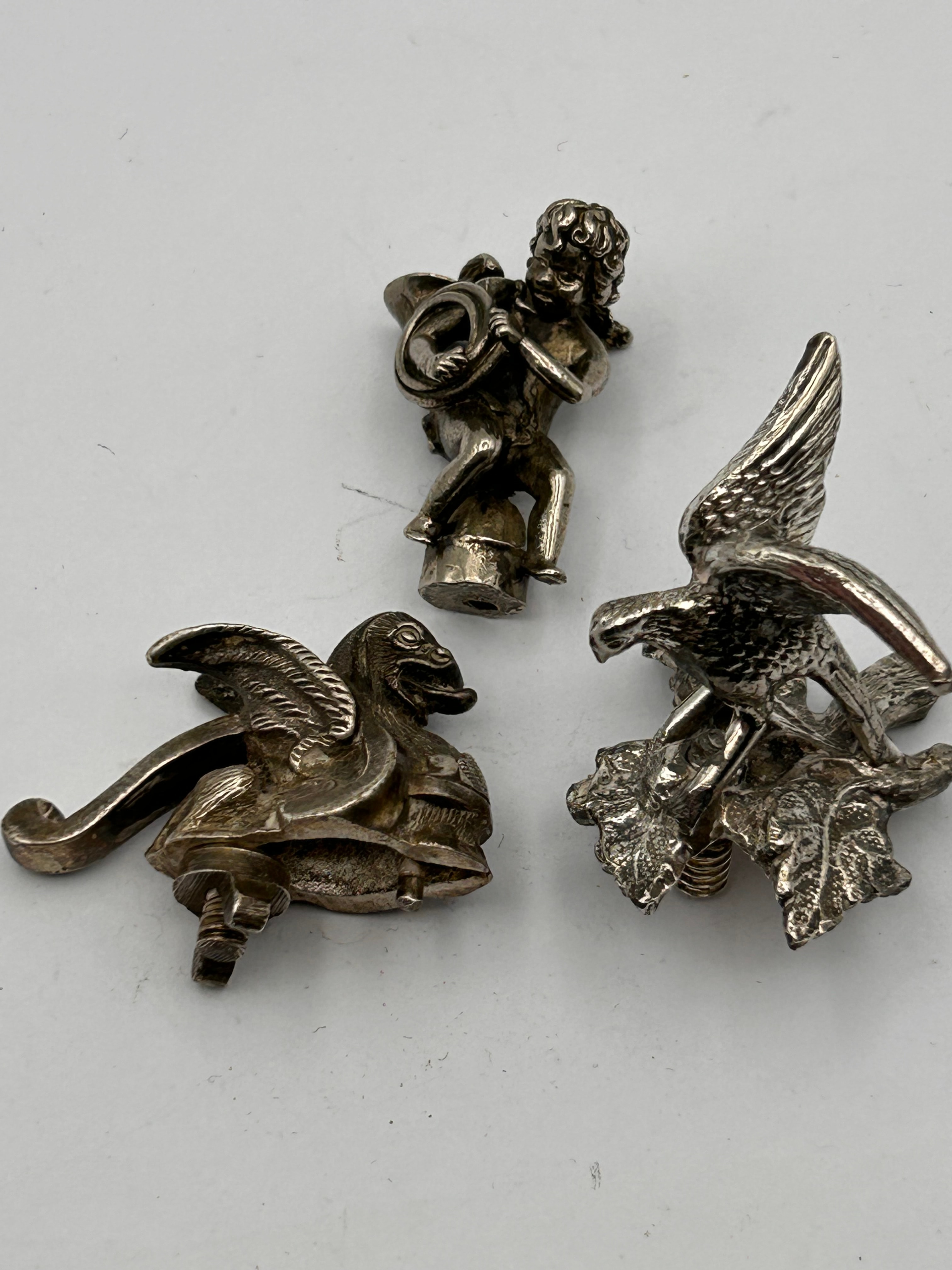 A group of three antique silver-toned metal decorative objects, likely finials or small functional items, dating to circa 1920s. The leftmost object depicts a winged, avian-headed creature, consistent with a griffin or gargoyle, featuring an integrated screw mechanism and a lever, suggesting a clamping or crushing function, similar to known hood ornaments of the period. The central item portrays a putto or cherub playing a horn, standing on a circular, threaded base, indicative of an attachment point, possibly a lamp finial. The rightmost object features an eagle or bird of prey with spread wings, perched on a base adorned with detailed foliage. All items display intricate detailing.