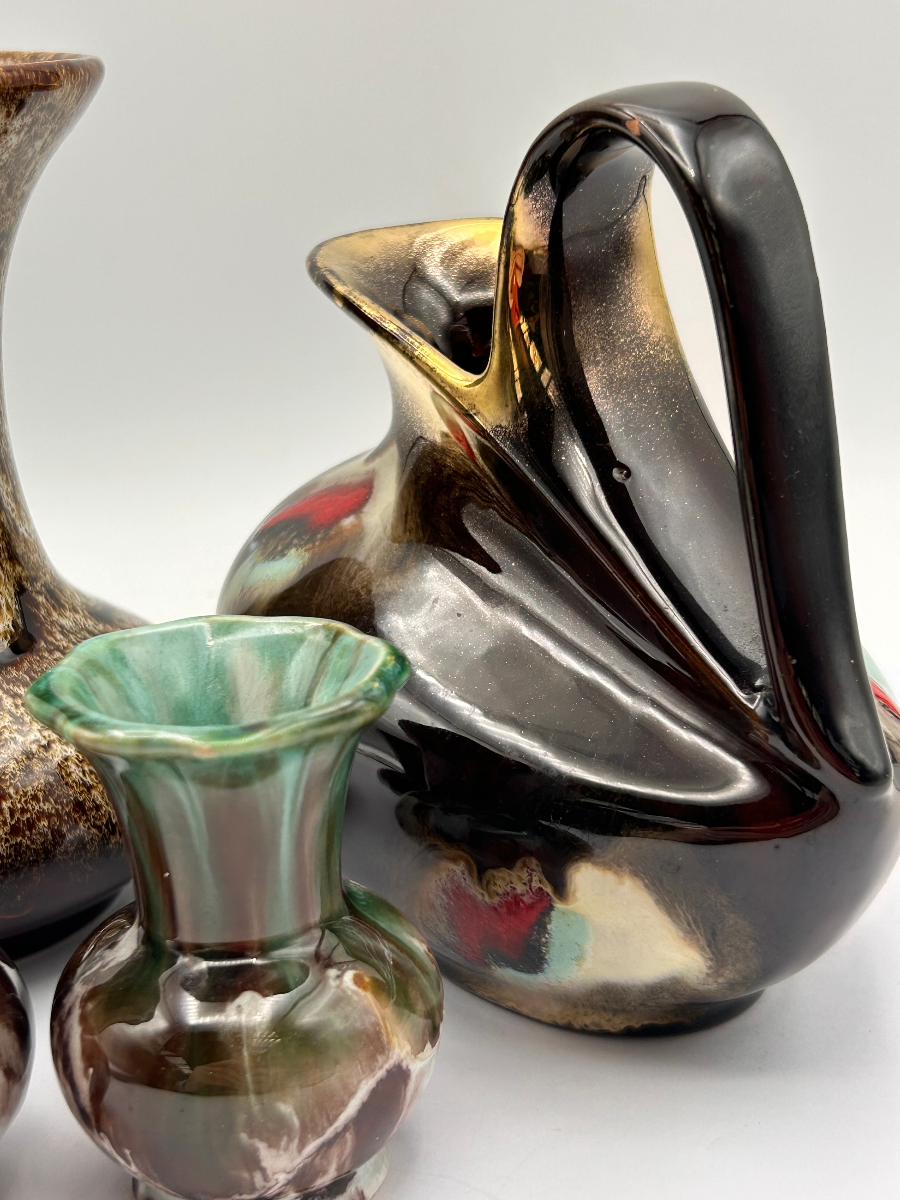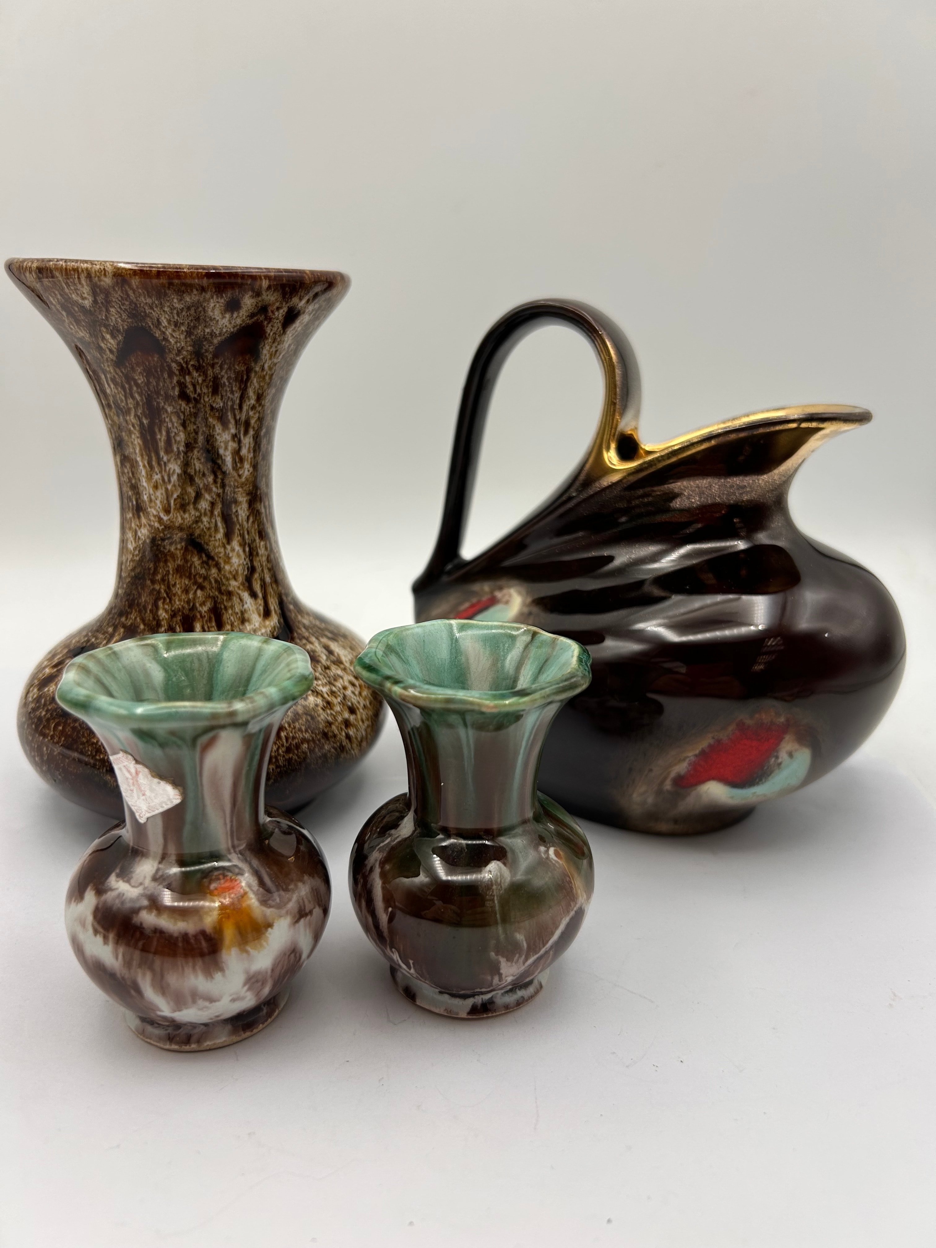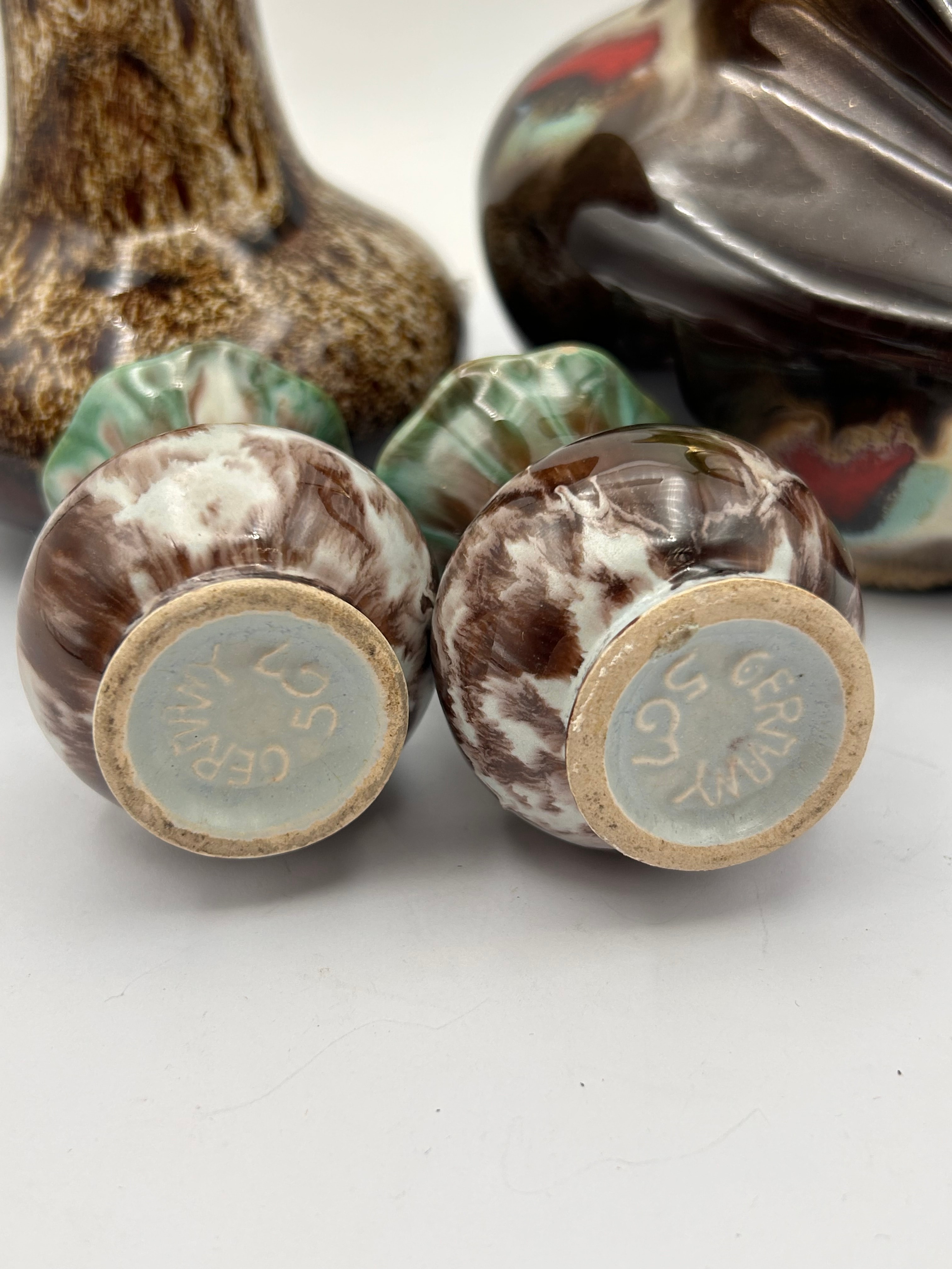 A collection of four ceramic items, comprising a tall vase with a mottled brown and black drip glaze, a dark brown glossy pitcher with a gold-accented rim, an integrated handle, and abstract red and turquoise glaze accents, and a matching pair of small, squat vases, each with a fluted green rim over a mottled brown and white body. The bases of the small vases are impressed “GERMANY” and with the model number “567”.