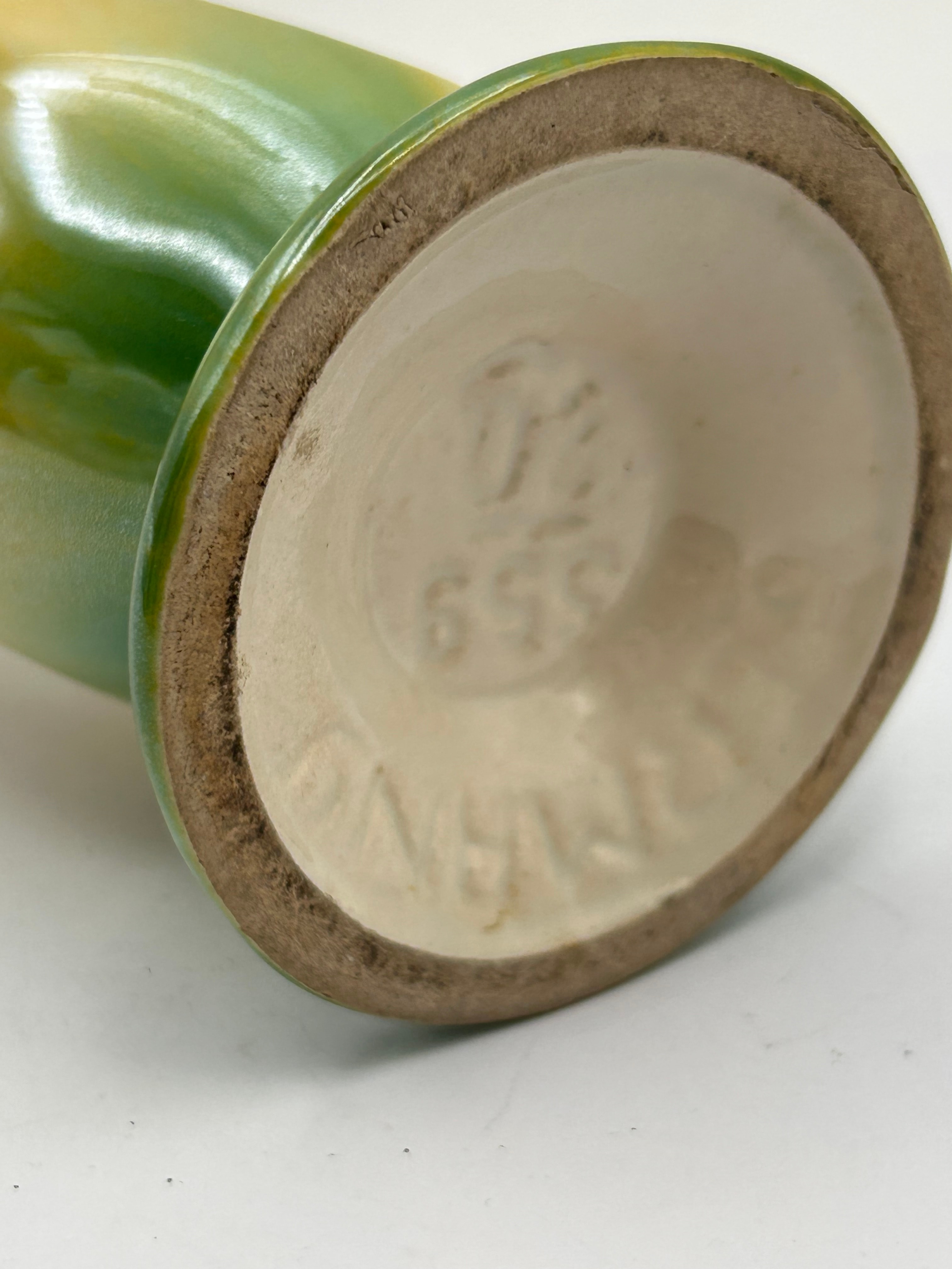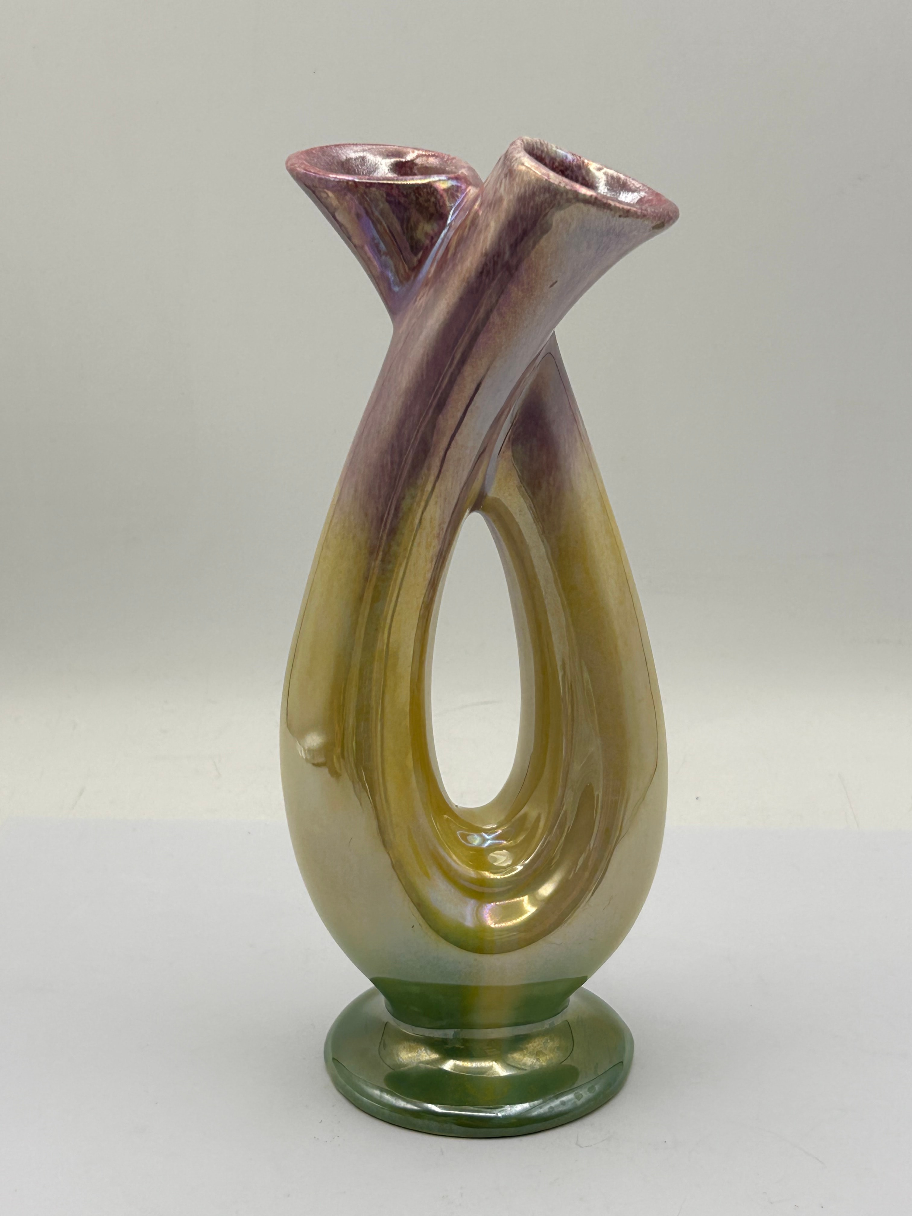 A ceramic double-spouted vase featuring an interconnected, sculptural form. The highly iridescent glaze graduates from pinkish-purple at the flared mouths, through golden-yellow across the body, and down to green at the circular foot. The base bears impressed markings including “FRANCE”, a partial manufacturer’s mark (appearing as a stylized ‘P’ or ‘F’ above a ‘D’ or ‘L’), and the model number “659”.