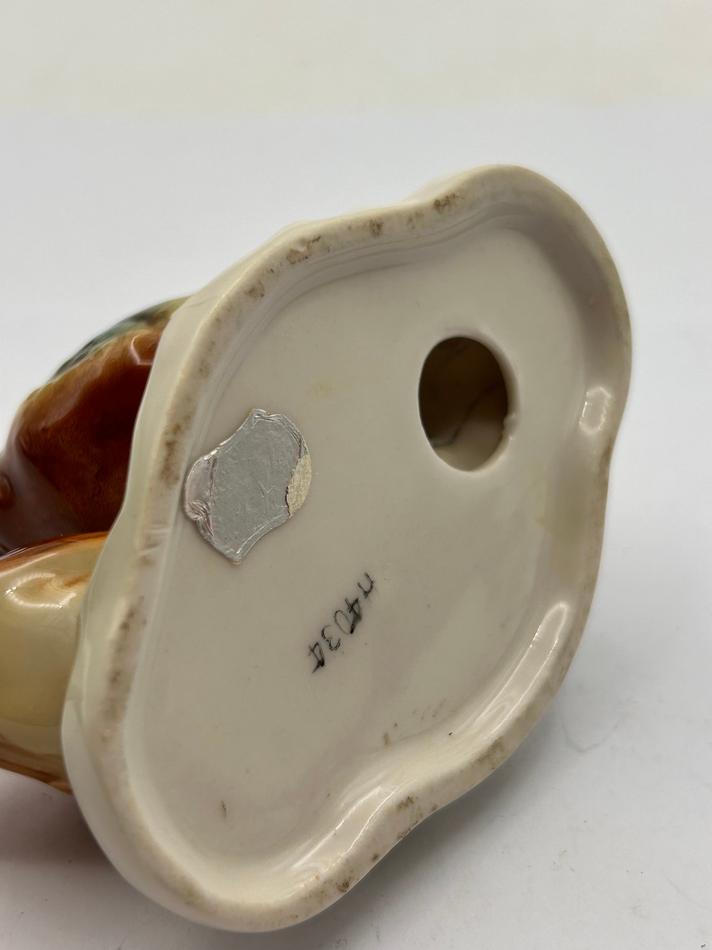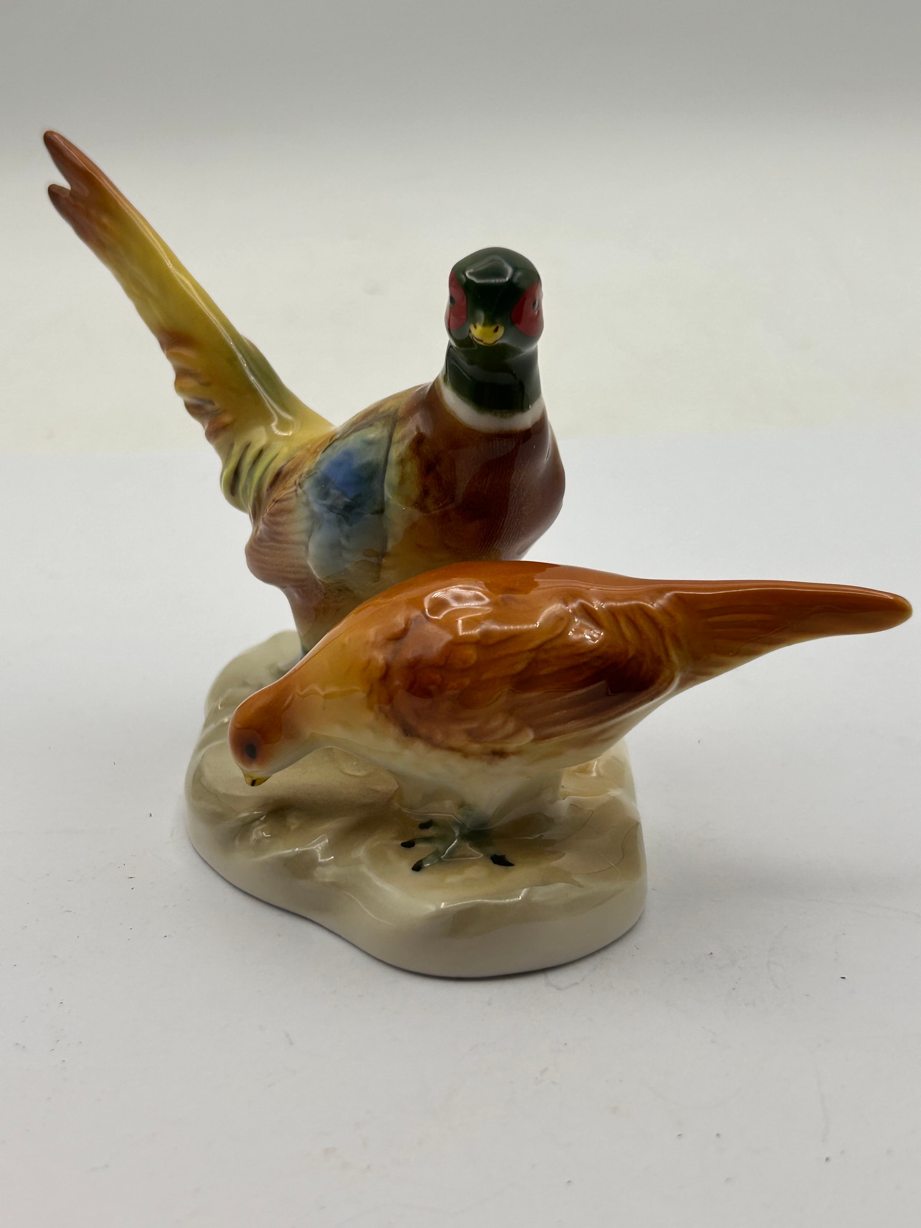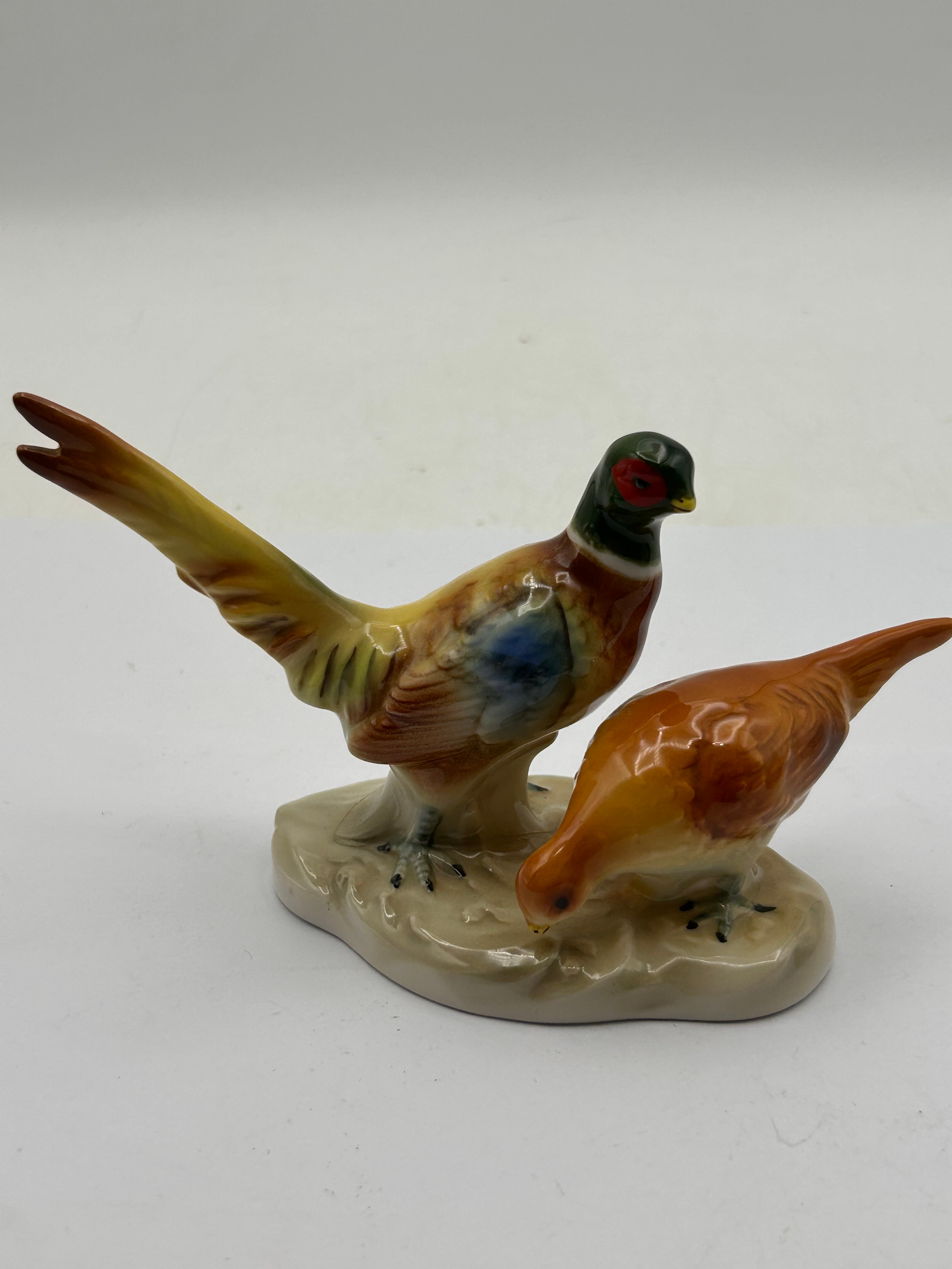 A Royal Dux porcelain figurine group depicting a pair of pheasants. The standing male pheasant is highly colored with a dark green head, red eye accents, and a body featuring brown, orange, blue, and yellow hues on its plumage and long tail. The other pheasant, with its head lowered as if pecking, is predominantly brown and orange. The piece is constructed from glazed porcelain in a naturalistic style, suggesting a mid-20th century or later vintage. The underside reveals a central unglazed hole, a partial, illegible silver sticker remnant, and handwritten or stamped numbering “H4034”.