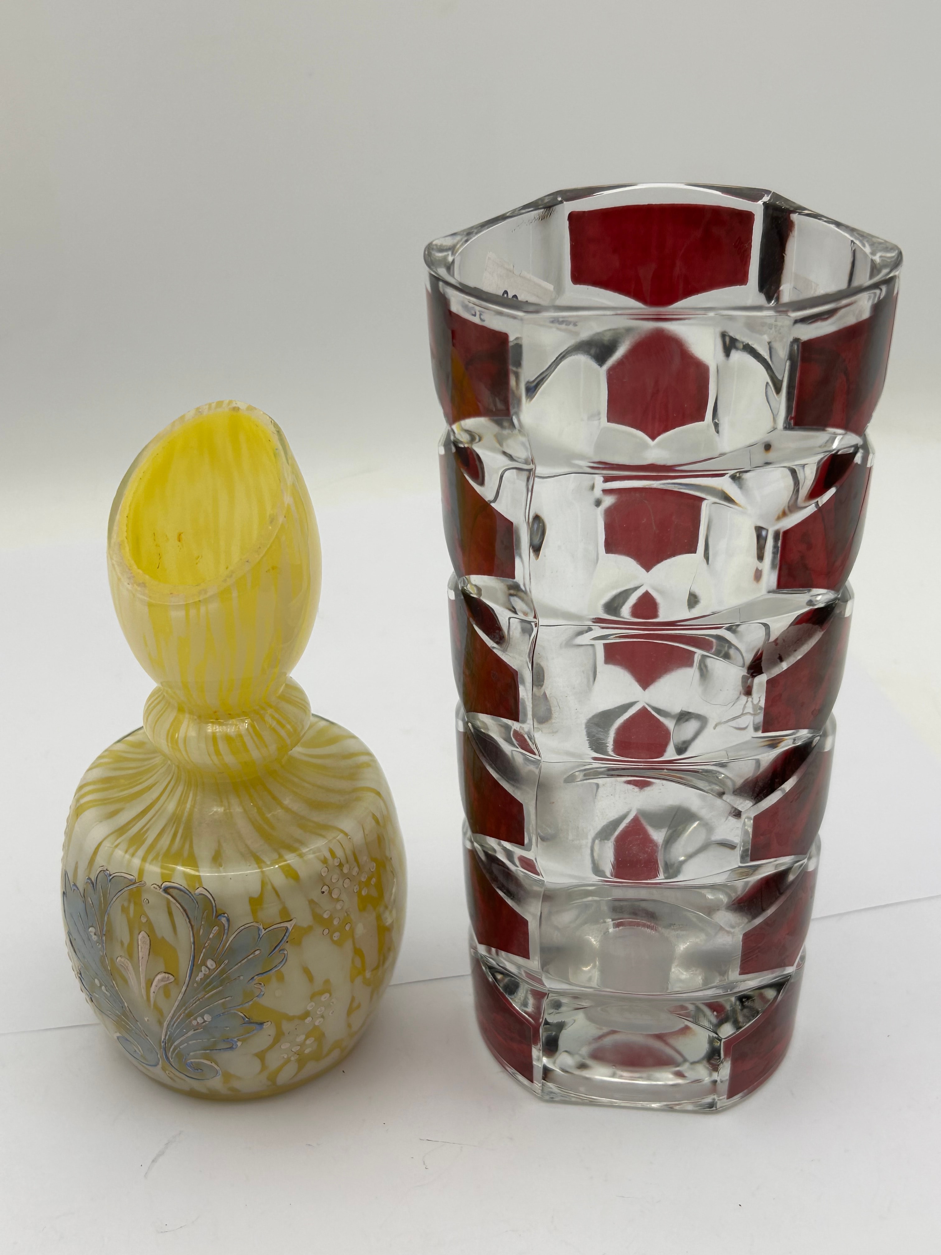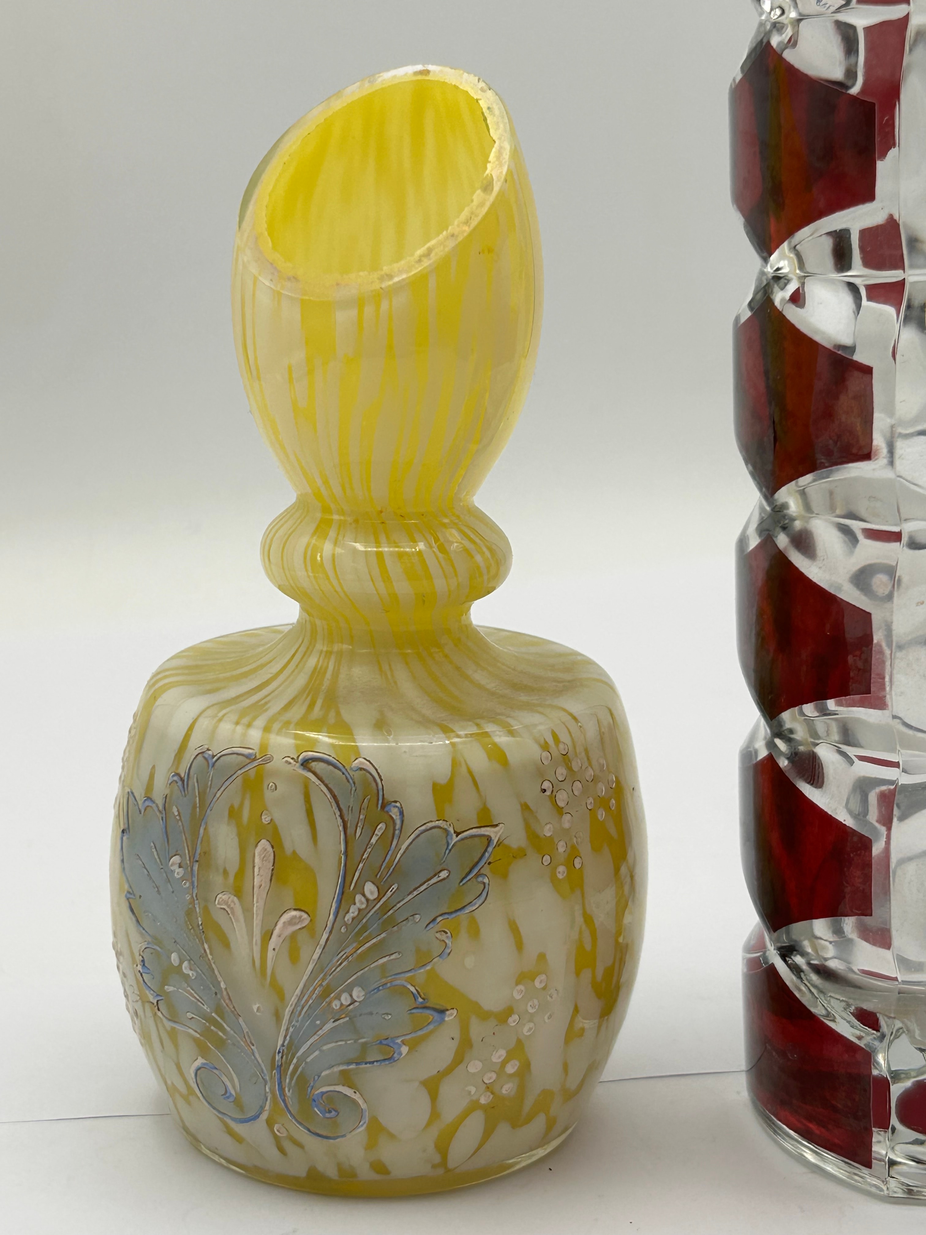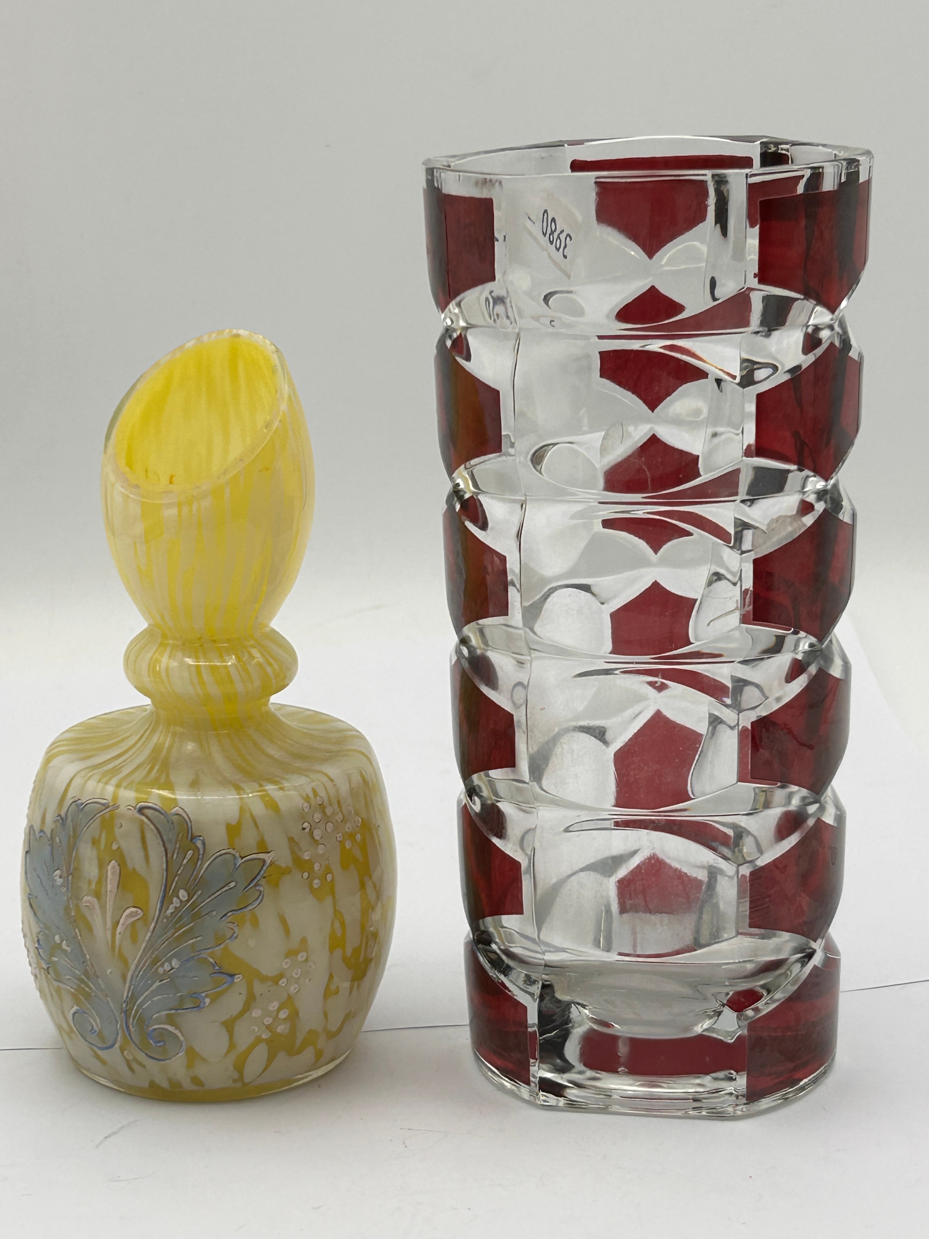 A J G Durand France Windsor Rubis vase of clear and deep red glass, constructed from a stacked series of segmented, possibly hexagonal or octagonal, forms with alternating clear and opaque red panels. A handwritten numerical marking “3980” is visible on the interior rim of the vase. Accompanying this is a decorative bottle or decanter crafted from marbled yellow and white art glass, featuring an applied or enameled blue-grey foliate design on its body with gold accents, and a ribbed neck topped by an integrated, angled yellow stopper.