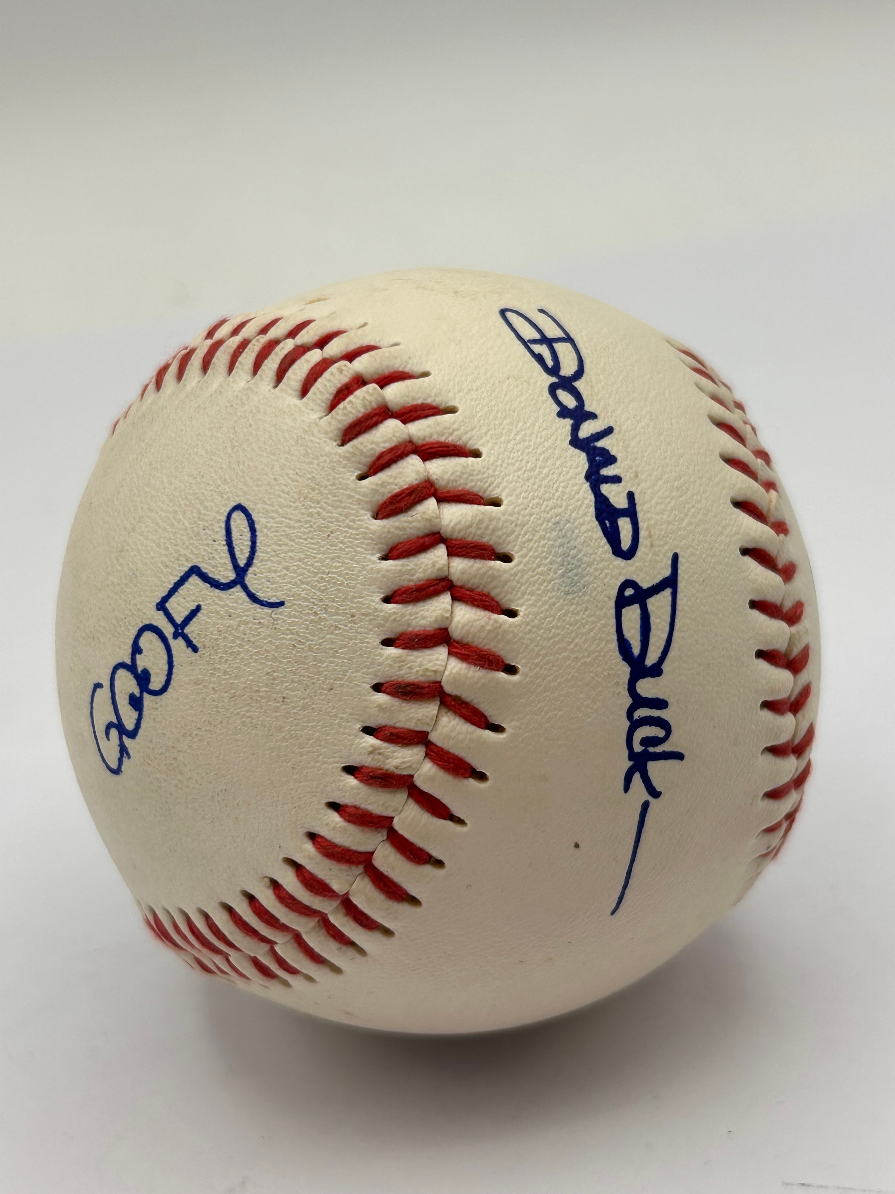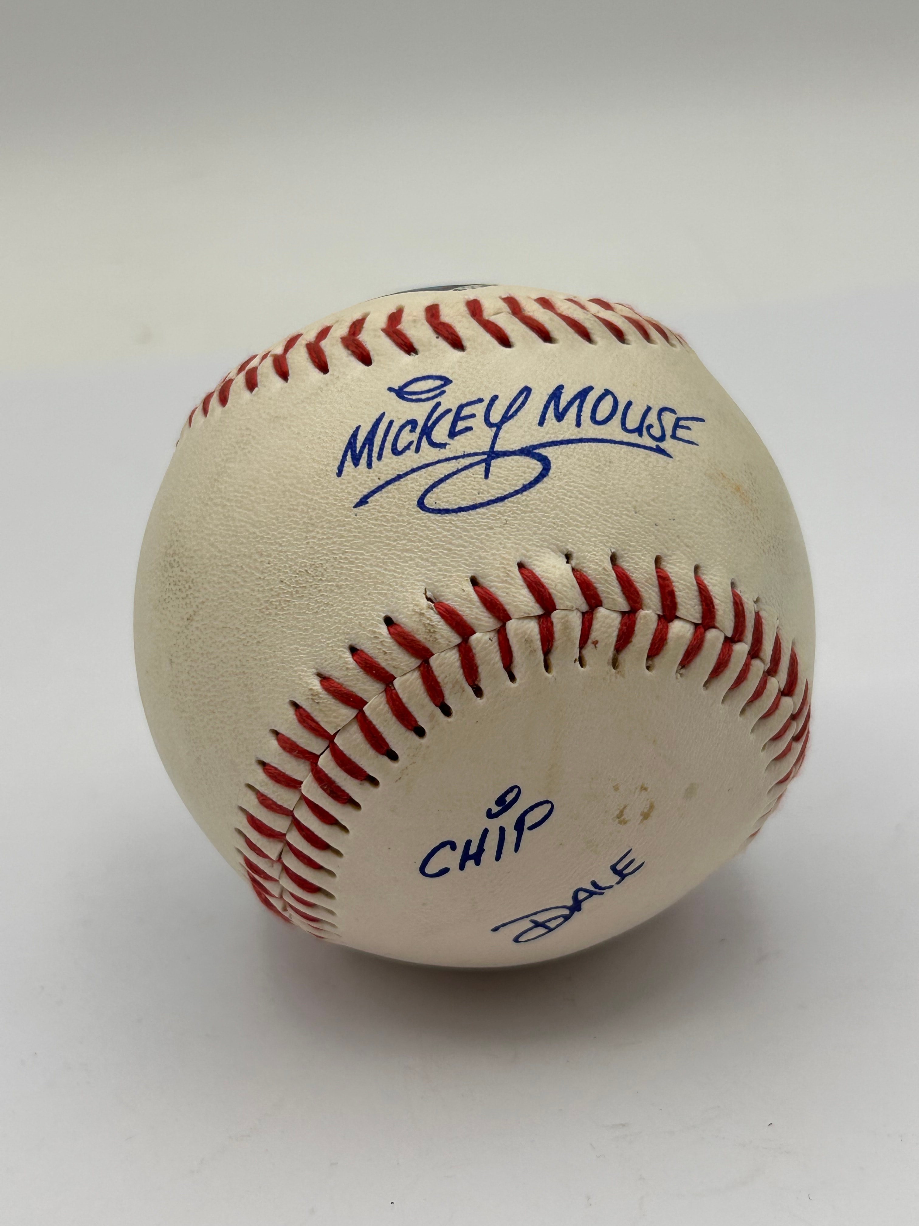 A Disney Mickey Mouse and Friends Autographed Baseball. The white baseball features red stitching and a prominent, colorful graphic of Mickey Mouse in a baseball uniform holding a bat, enclosed within a blue and red diamond on one panel. The copyright marking “© DISNEY” is visible below the graphic. The baseball is further adorned with multiple blue, autograph-style inscriptions, including “MICKEY MOUSE”, “CHIP”, “DALE” (accompanied by a small Disney-style signature), “GOOFY”, and “Donald Duck”.