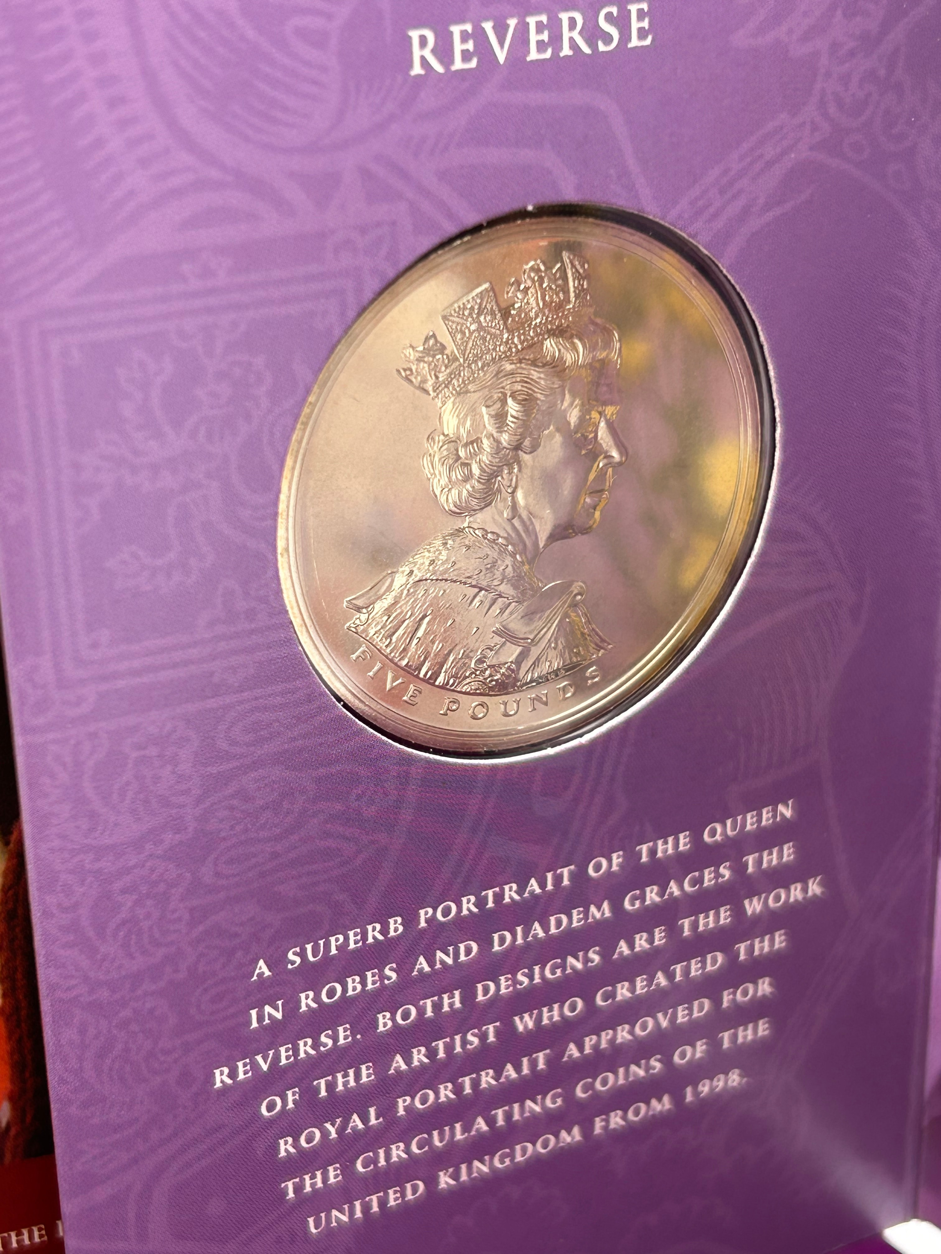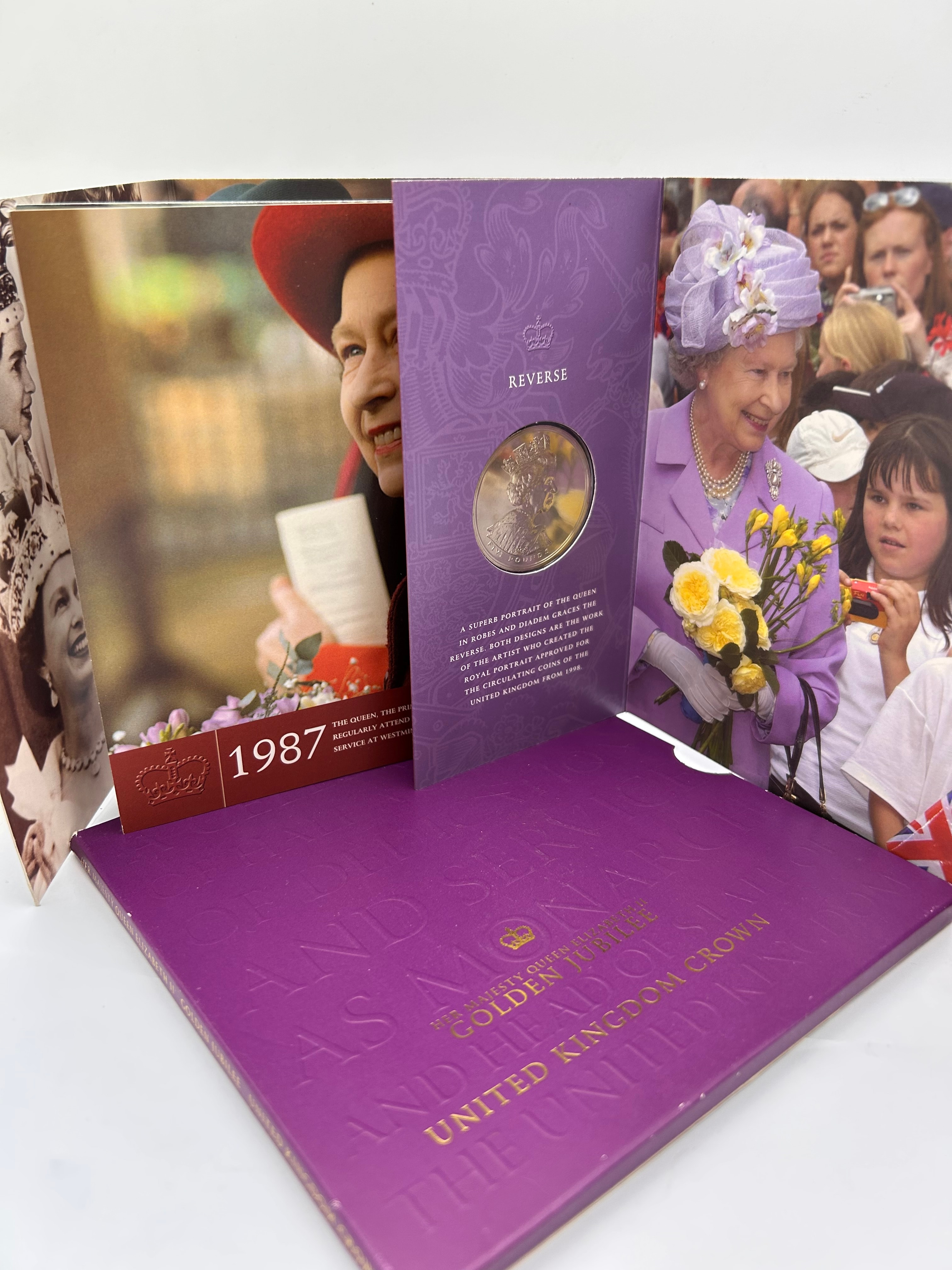 A 2002 Great Britain Queen Elizabeth II Golden Jubilee Five Pound Crown, presented in its original purple paper/cardboard folio. The main silver-toned coin features a crowned profile portrait of Queen Elizabeth II and the inscription “FIVE POUNDS.” The insert describes the portrait as “A SUPERB PORTRAIT OF THE QUEEN IN ROBES AND DIADEM… THE WORK OF THE ARTIST WHO CREATED THE ROYAL PORTRAIT APPROVED FOR THE CIRCULATING COINS OF THE UNITED KINGDOM FROM 1998.” The outer folio is prominently marked “HER MAJESTY THE QUEEN’S GOLDEN JUBILEE UNITED KINGDOM CROWN.” An accompanying pictorial booklet displays “1987” alongside other photographs of the Queen, likely referring to the date of a depicted event rather than the coin’s issue year.