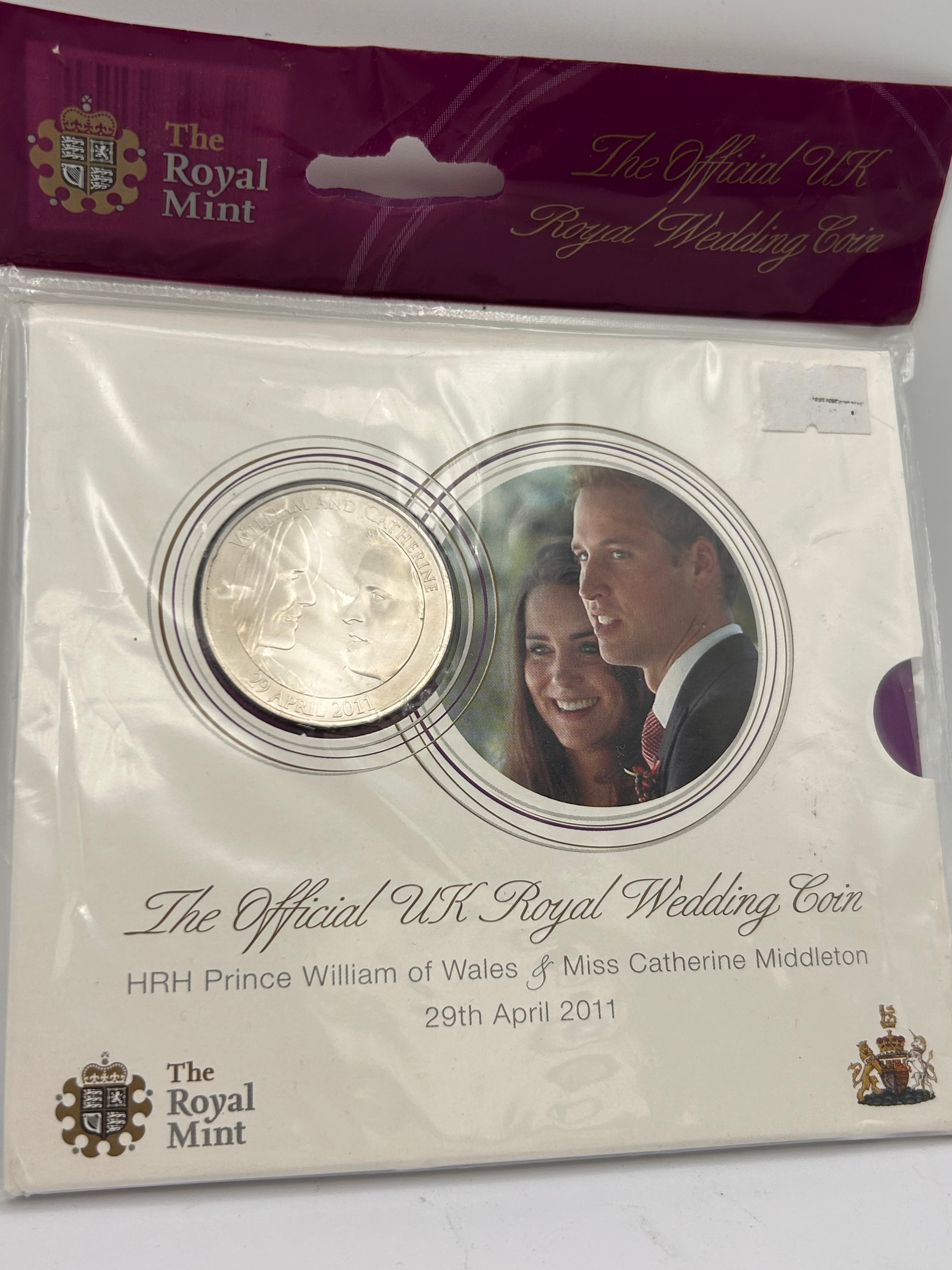 This item is an Official UK Royal Wedding Five Pound Coin, issued by The Royal Mint in 2011 to commemorate the marriage of HRH Prince William of Wales and Miss Catherine Middleton. The silver-toned metal coin features two profile portraits with the text “WILLIAM AND CATHERINE” above and “29 APRIL 2011” below. It is presented in its original sealed plastic and cardboard display packaging, which prominently displays “The Royal Mint” logo, the title “The Official UK Royal Wedding Coin,” a photograph of the depicted couple, and reiterates the date “29th April 2011.”