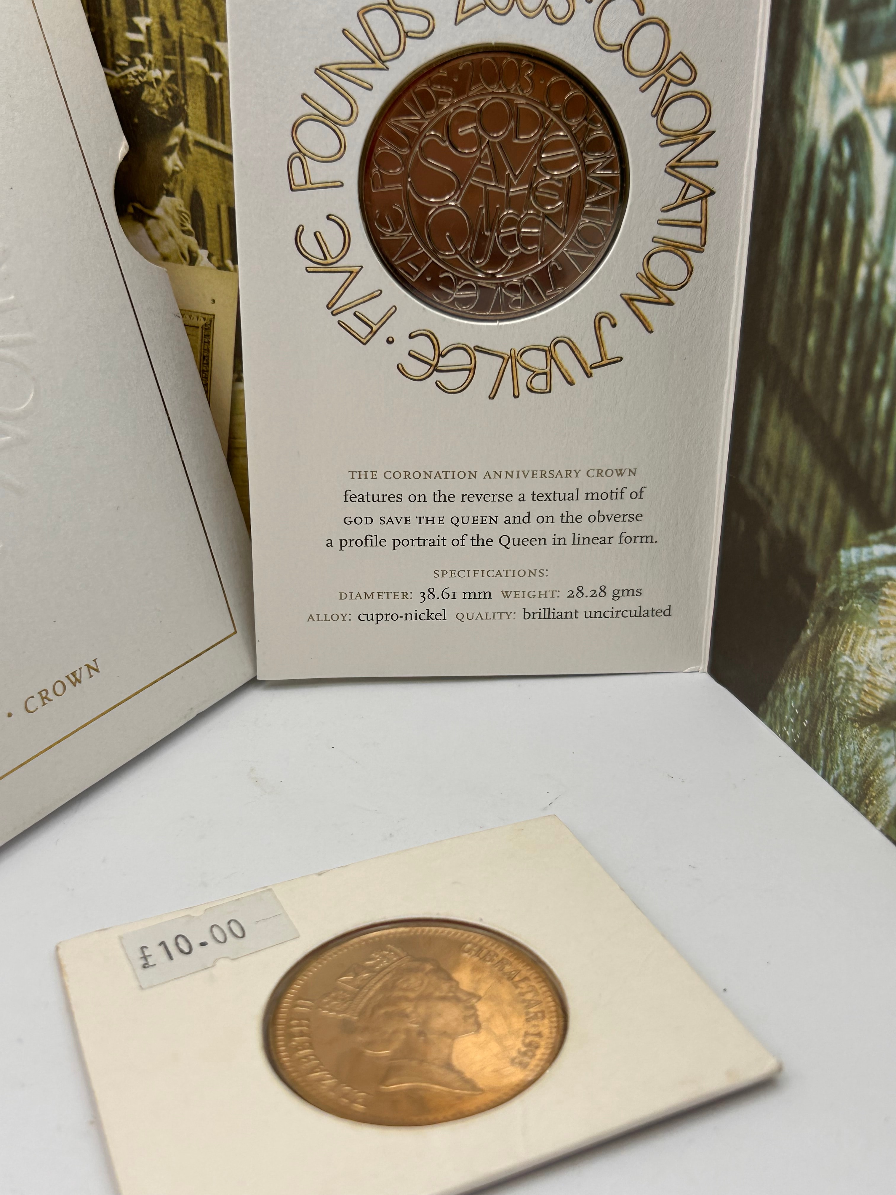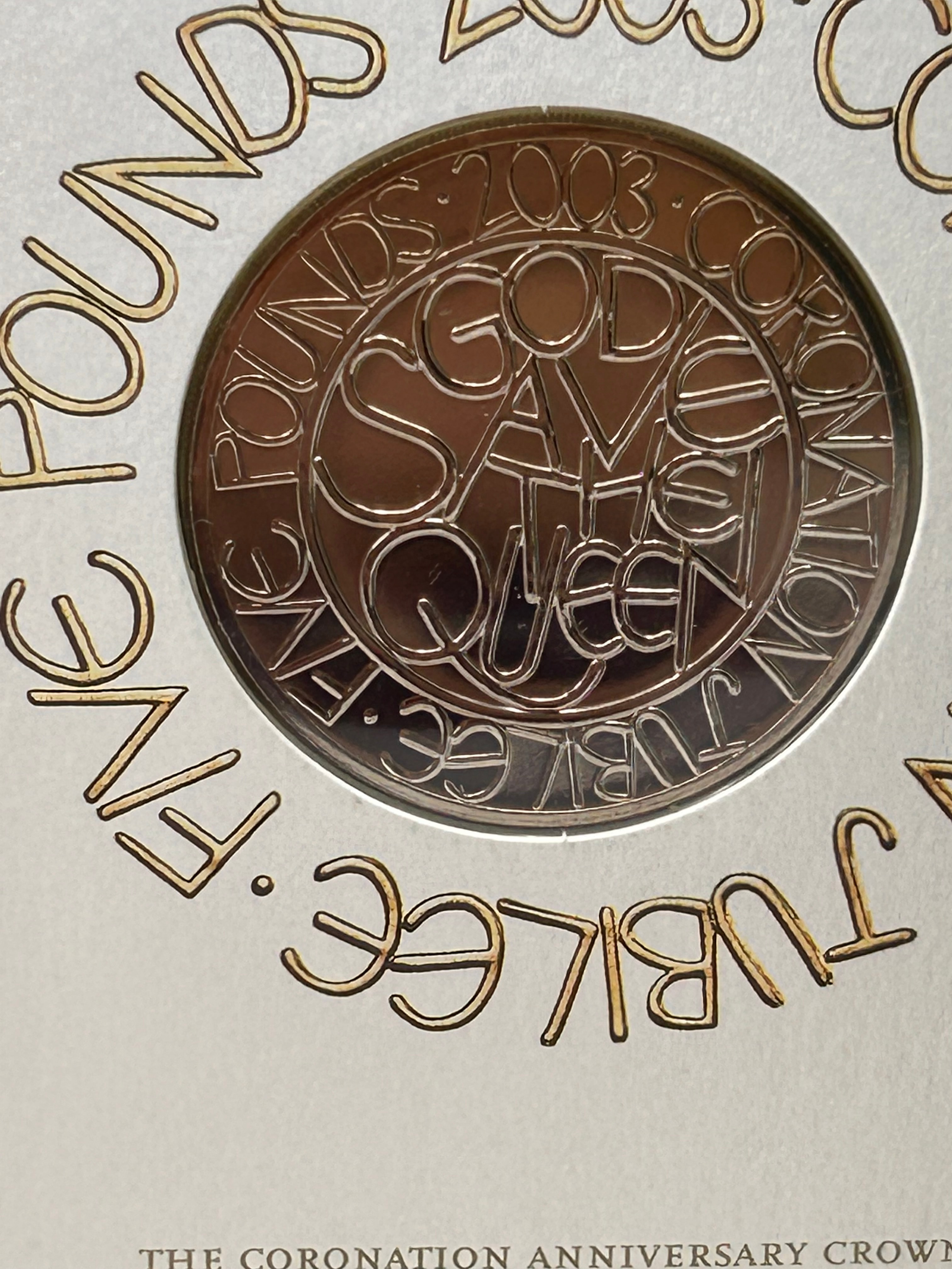 A 2003 Coronation Jubilee Five Pounds Anniversary Crown, cupro-nickel, presented in its original card packaging. The packaging describes the coin as ‘brilliant uncirculated’ quality and features ‘FIVE POUNDS 2003 CORONATION JUBILEE’ text, with the visible reverse displaying a textual motif of ‘GOD SAVE THE QUEEN’.