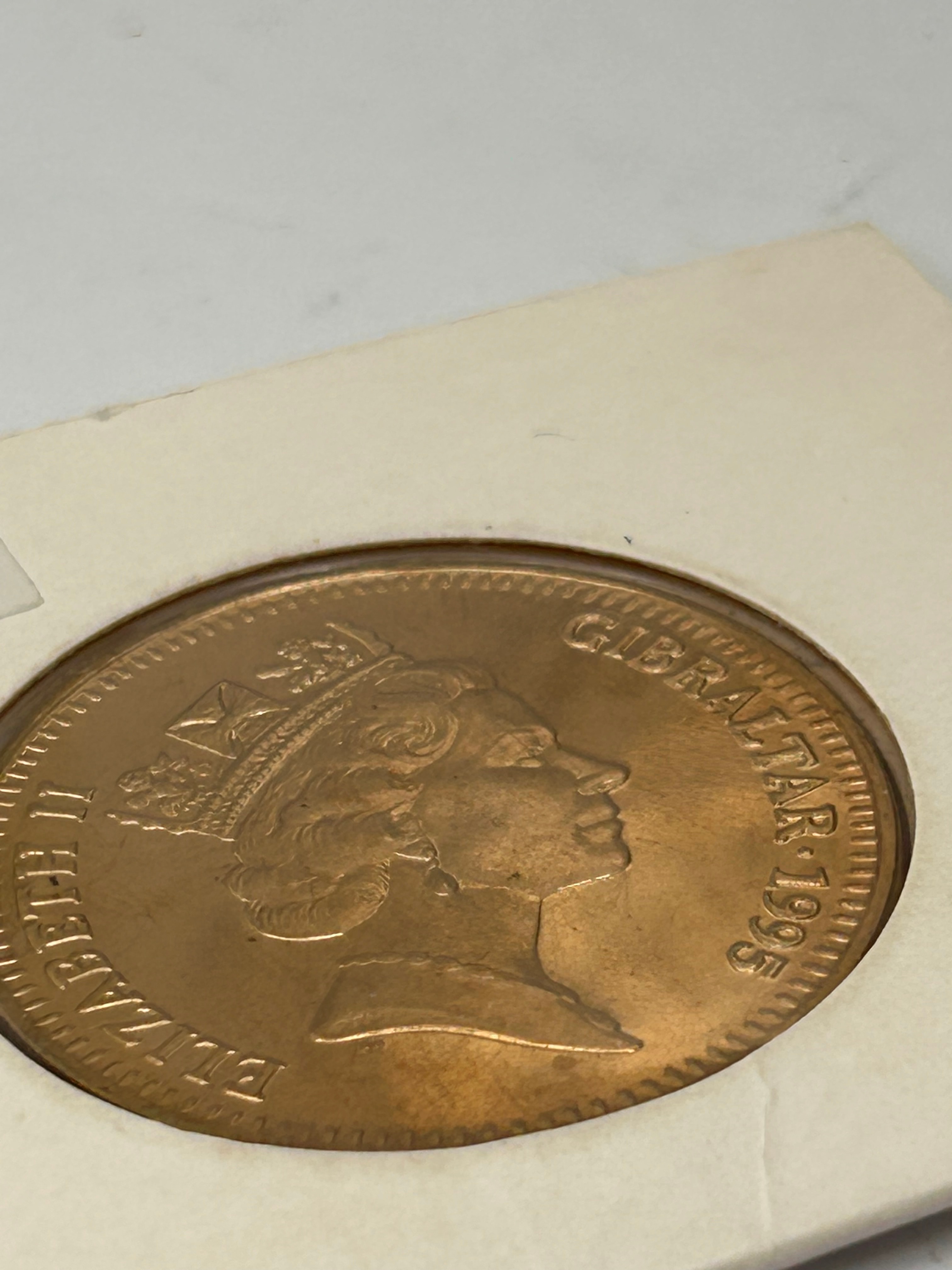 The second item is a 1995 Gibraltar coin, copper-toned, held in a plain cardboard flip marked ‘£10.00’. Its obverse features a crowned profile of Queen Elizabeth II, encircled by the inscriptions ‘ELIZABETH II’ and ‘GIBRALTAR 1995’.
