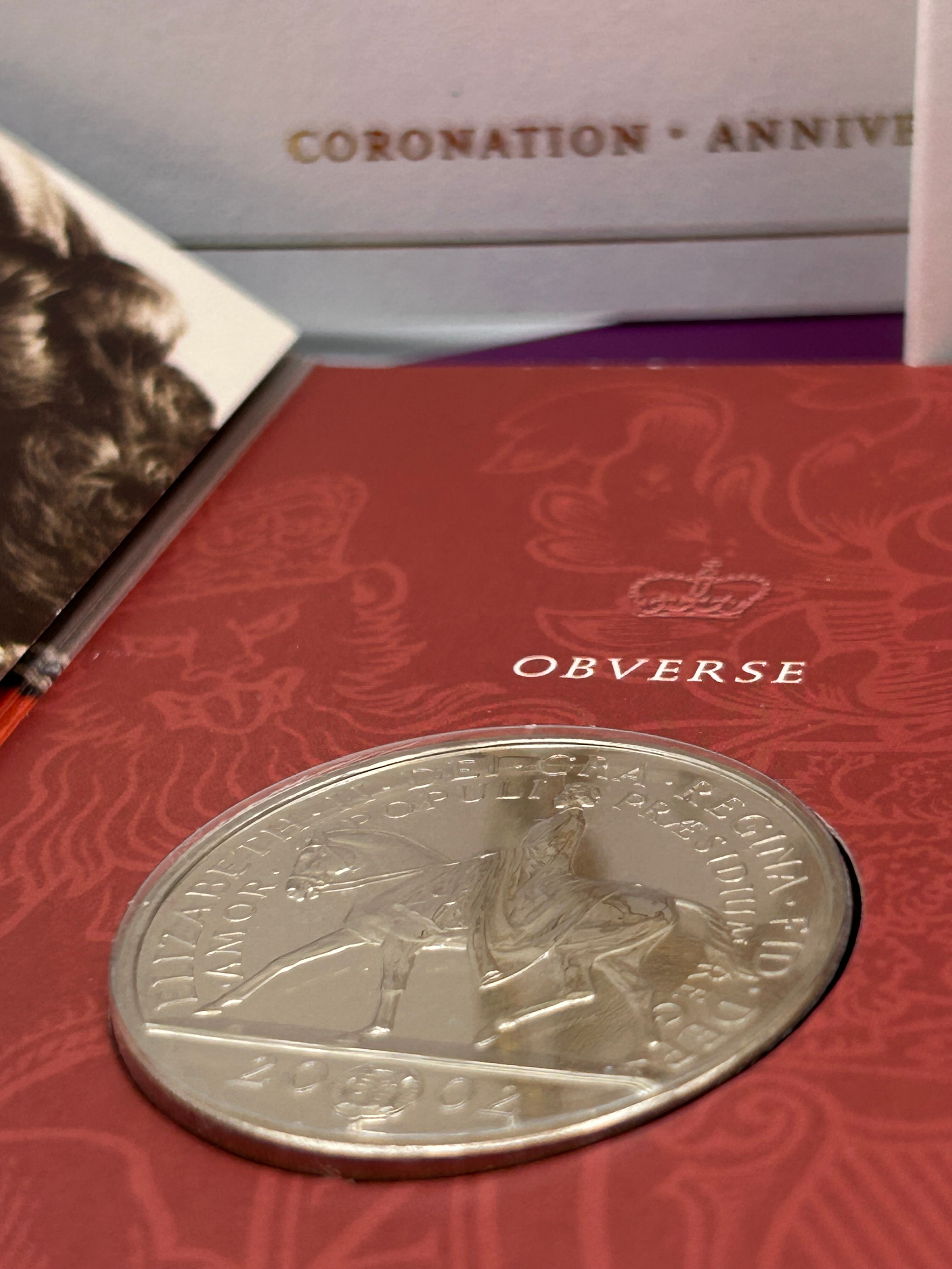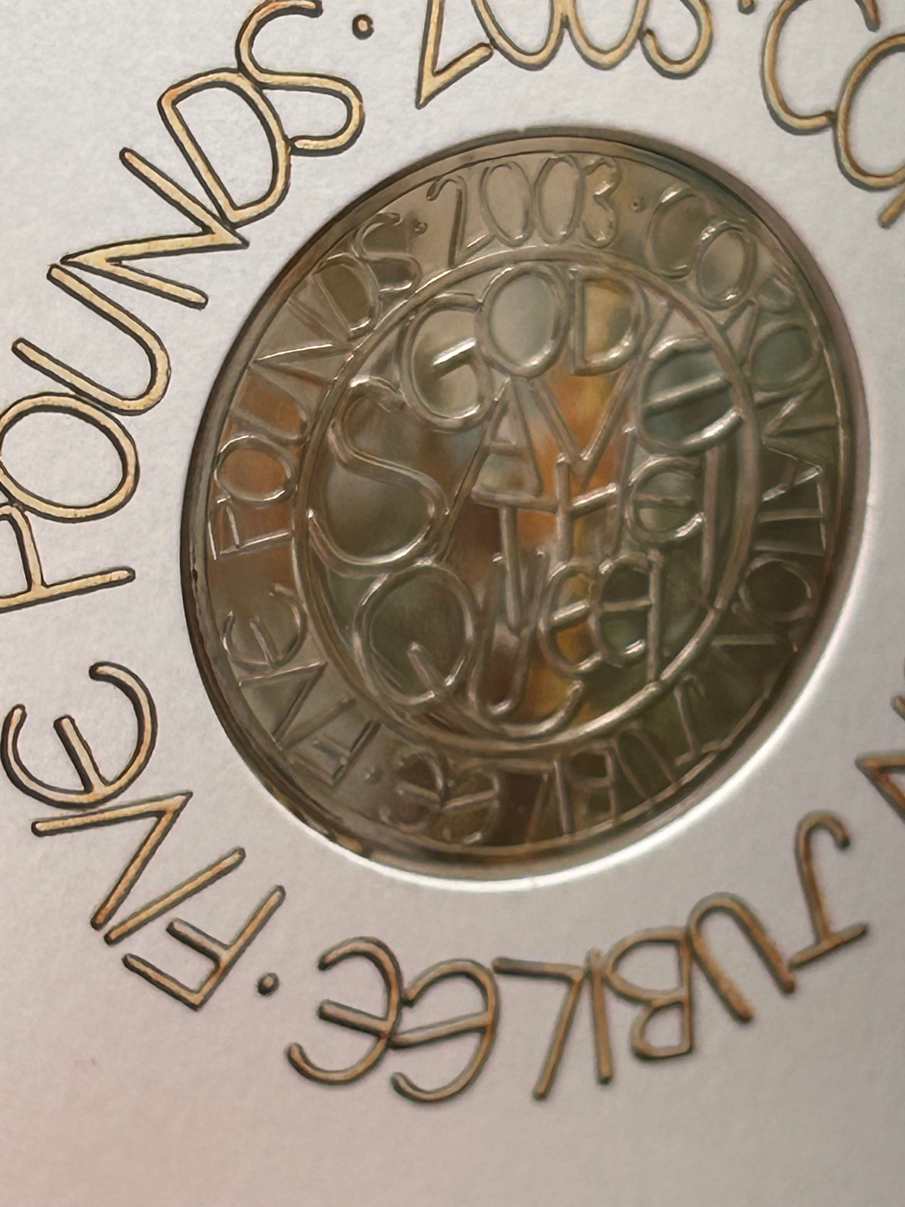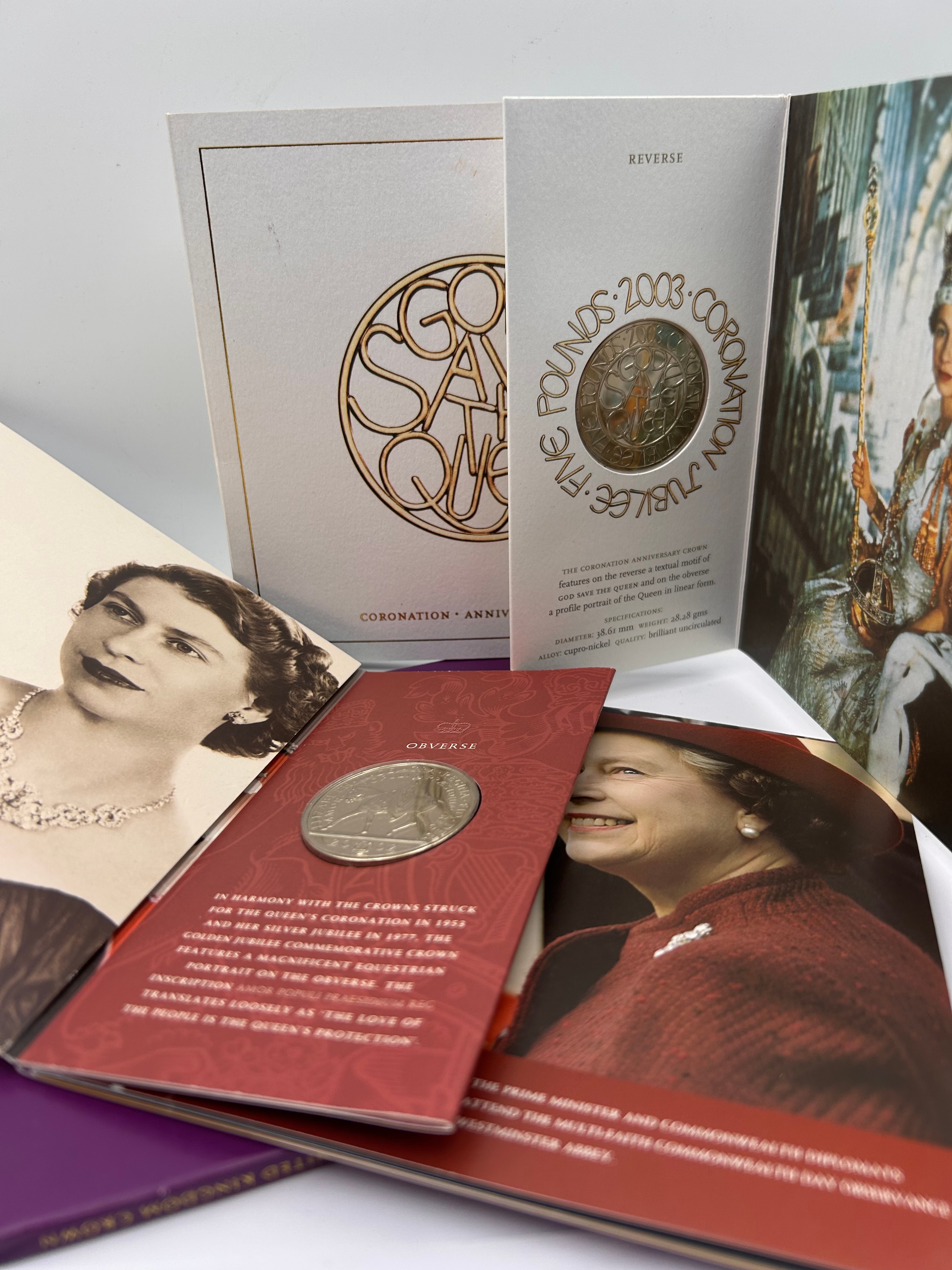 A British 2003 Queen Elizabeth II Coronation Jubilee Five Pound Brilliant Uncirculated cupro-nickel coin set. The coin features an equestrian portrait of Queen Elizabeth II on the obverse, encircled by the inscription ‘ELIZABETH II D G REG F D 2003’. The reverse displays ‘GOD SAVE THE QUEEN’ centrally, with ‘FIVE POUNDS’, ‘2003’, and ‘CORONATION JUBILEE’ indicated on the surrounding packaging. The coin is housed within its original presentation packaging, which identifies its quality as ‘Brilliant Uncirculated’.